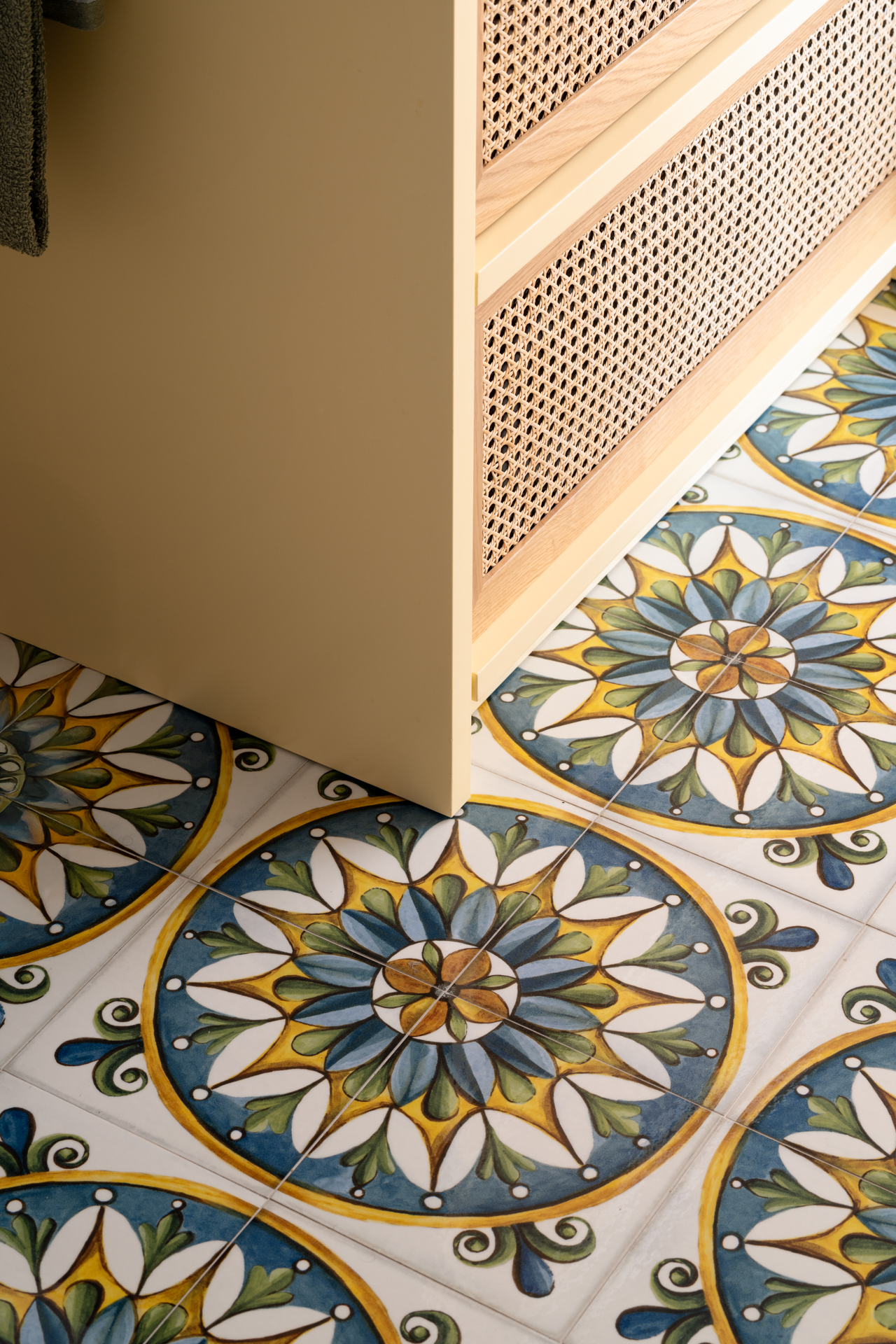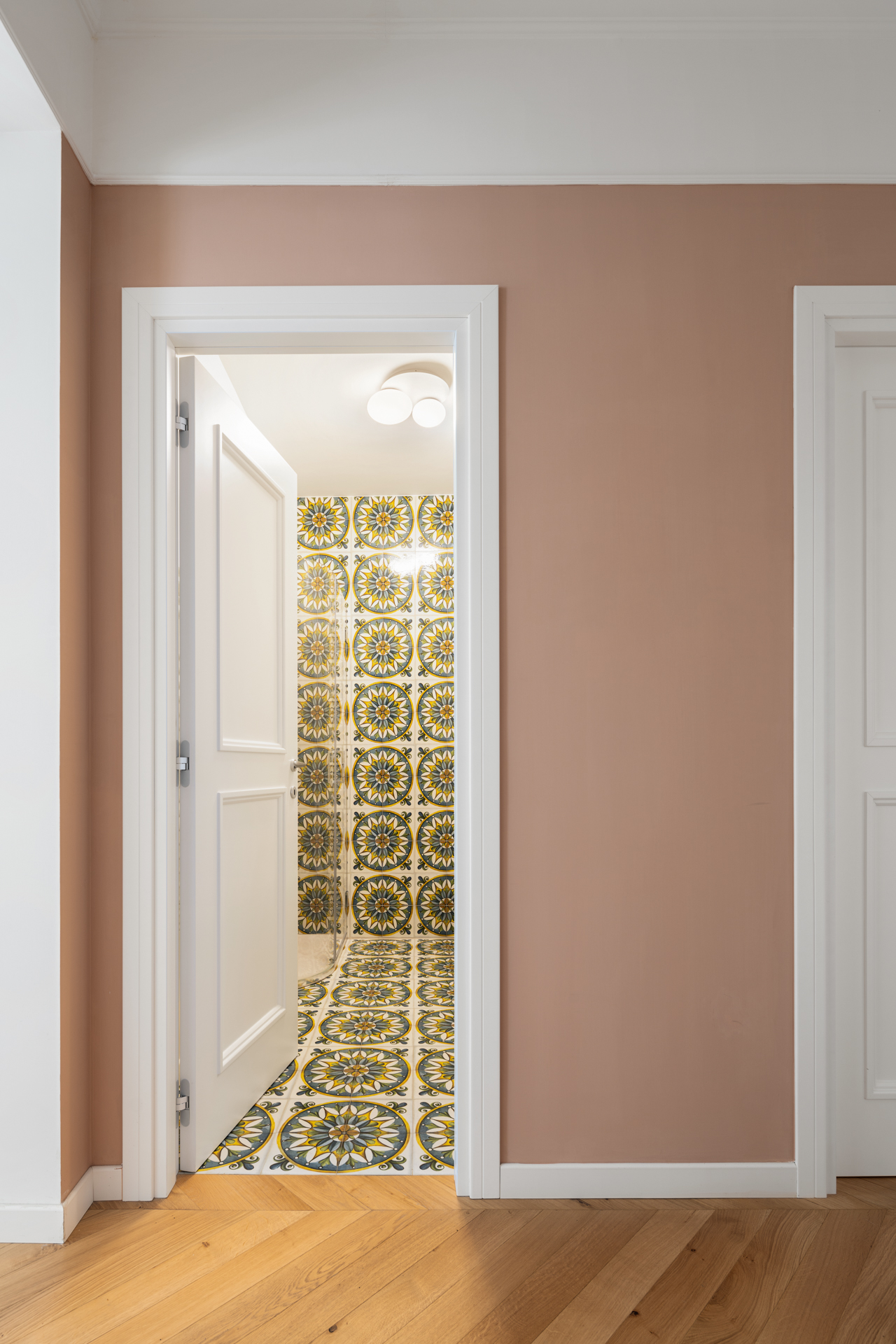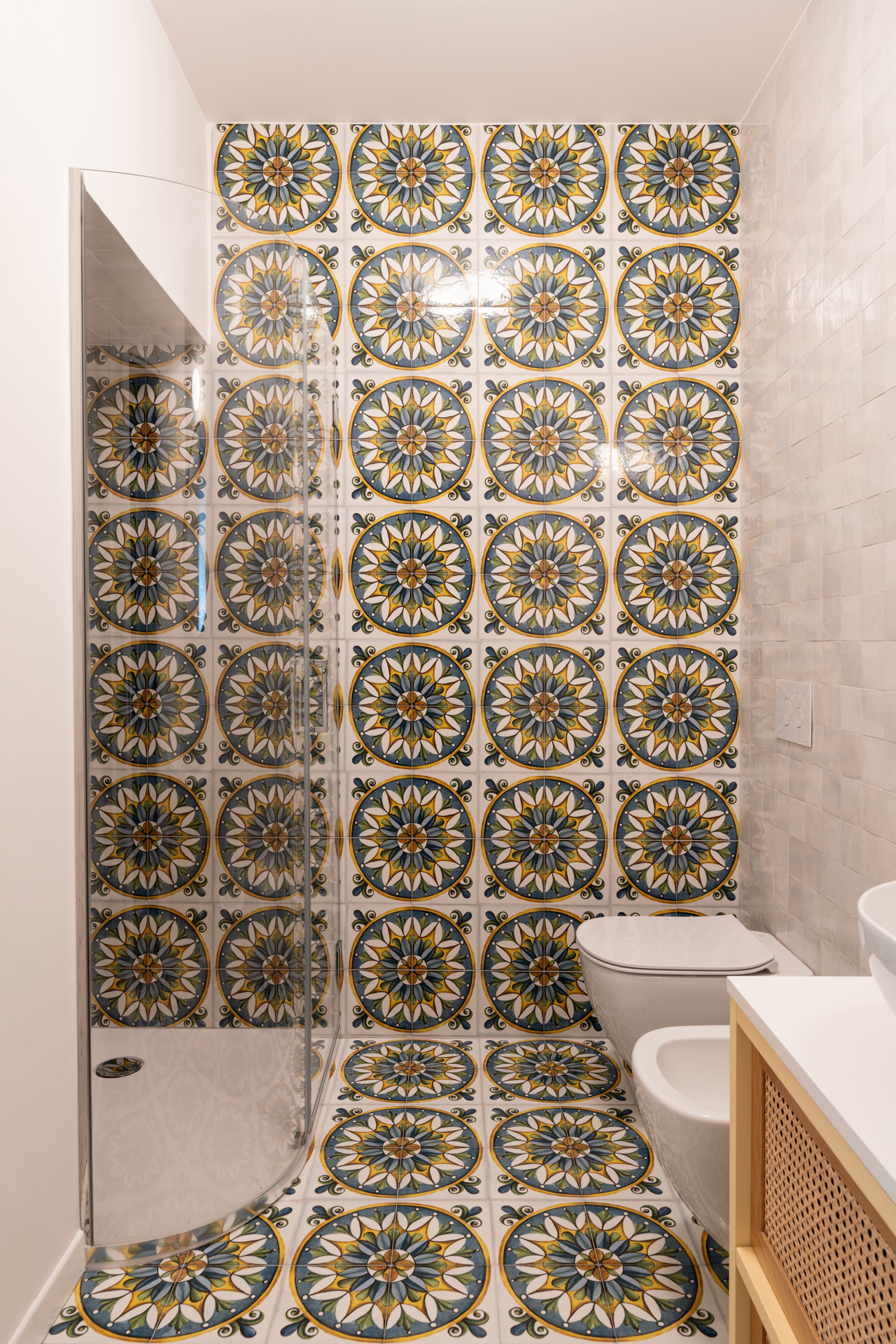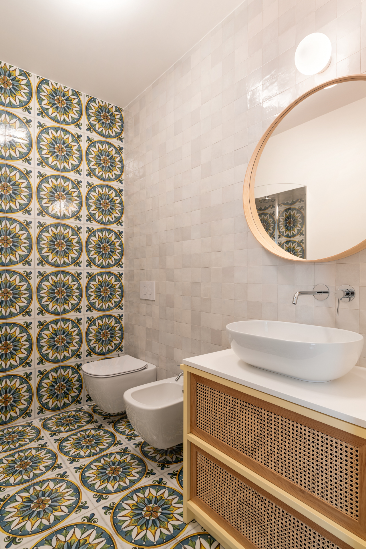 Le piastrelle del bagno ospiti evocano la tradizione, con il loro richiamo all’antico, mentre nel bagno della camera matrimoniale sono state riutilizzate le piastrelle del vecchio salone, stabilendo una connessione visiva tra il passato e il presente. Questo riuso consapevole dei materiali è un chiaro segno del rispetto per la memoria storica dell’edificio, che non rinuncia però alla funzionalità e al linguaggio contemporaneo.