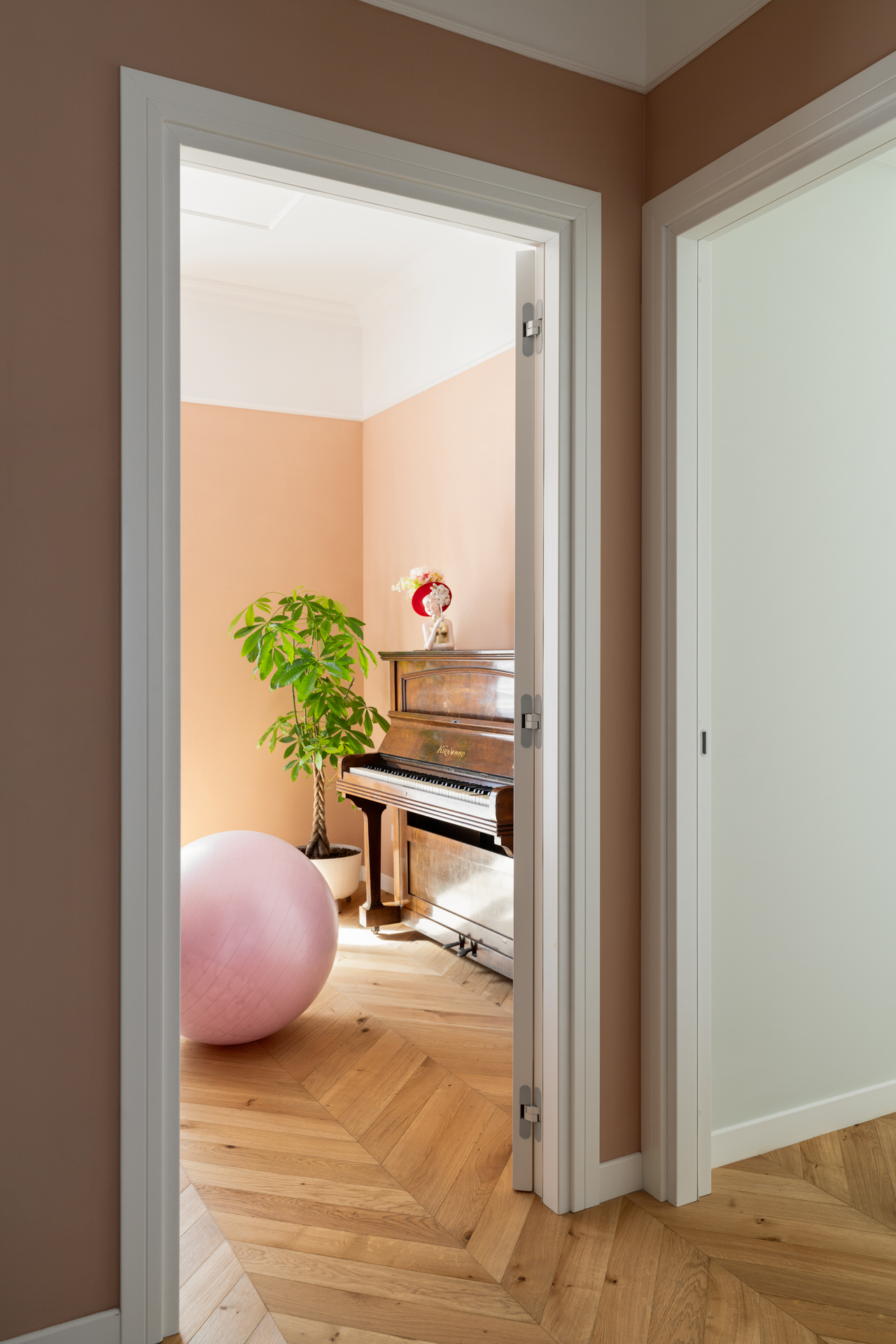 Questa scelta non solo esalta la verticalità degli ambienti, ma dona alla casa un’atmosfera di leggerezza e armonia. La separazione tra la parte alta e bassa delle pareti, evidenziata da una bacchetta in linea con le porte e gli infissi, aggiunge un tocco di eleganza discreta che caratterizza ogni stanza.