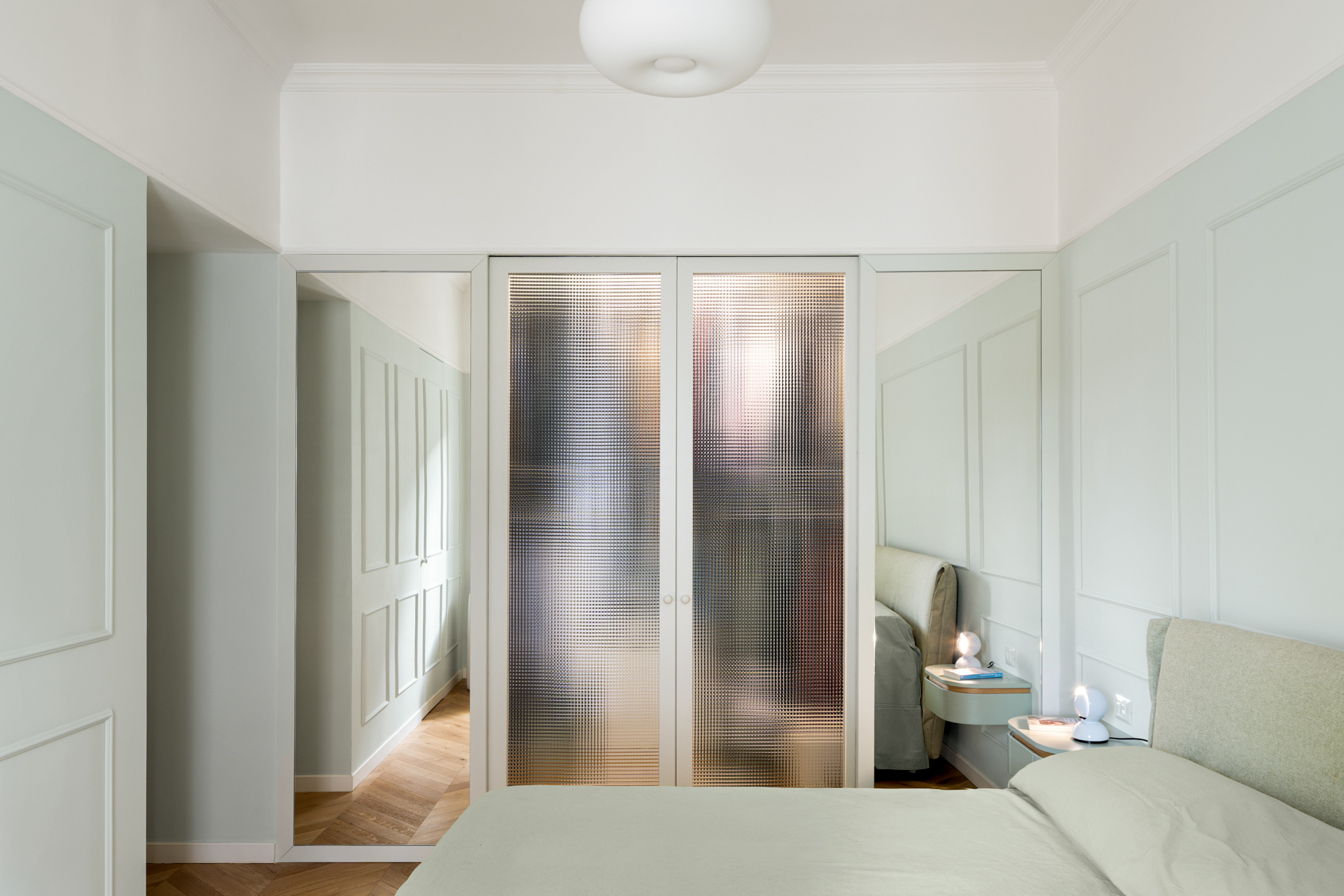 La camera matrimoniale, dotata di un bagno en suite e di una cabina armadio, è un autentico “rifugio”. Illuminata dalla luce naturale che filtra attraverso le porte vetrate, la cabina armadio è un piccolo angolo di serenità che arricchisce la camera senza disturbarne l’equilibrio.