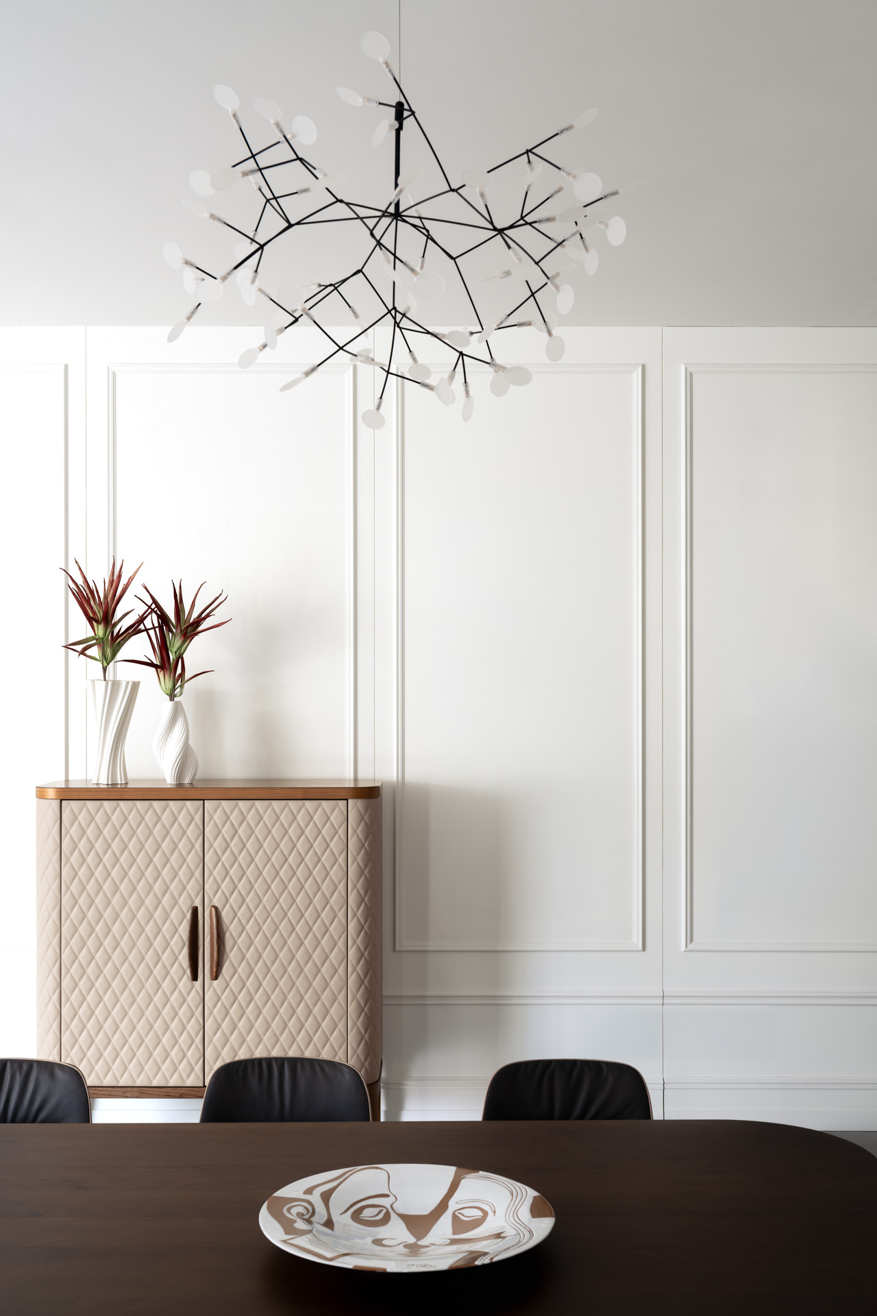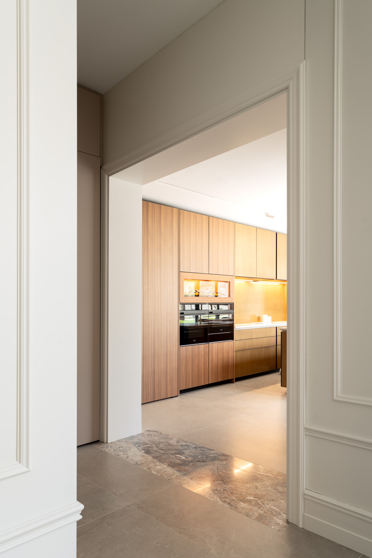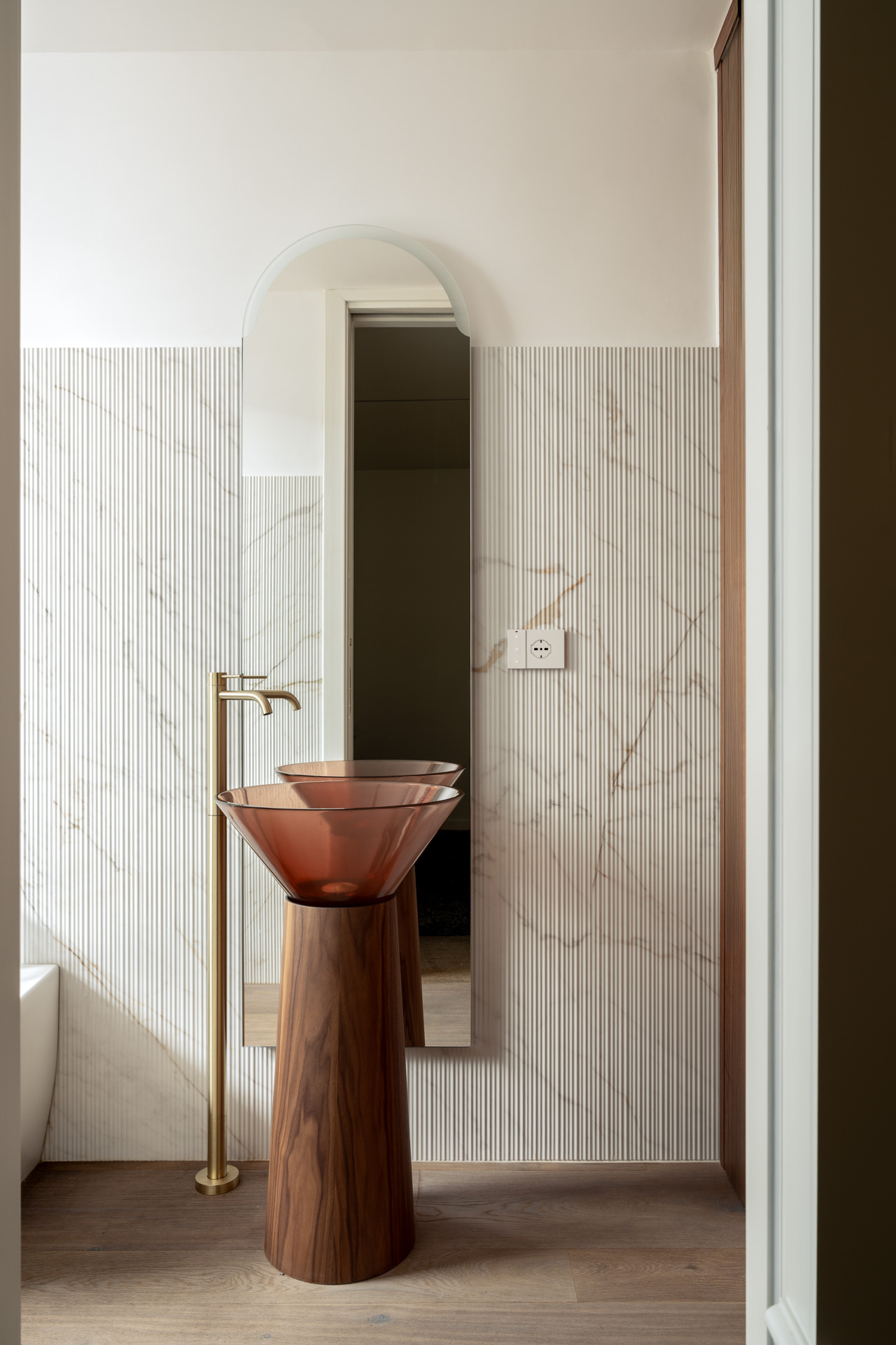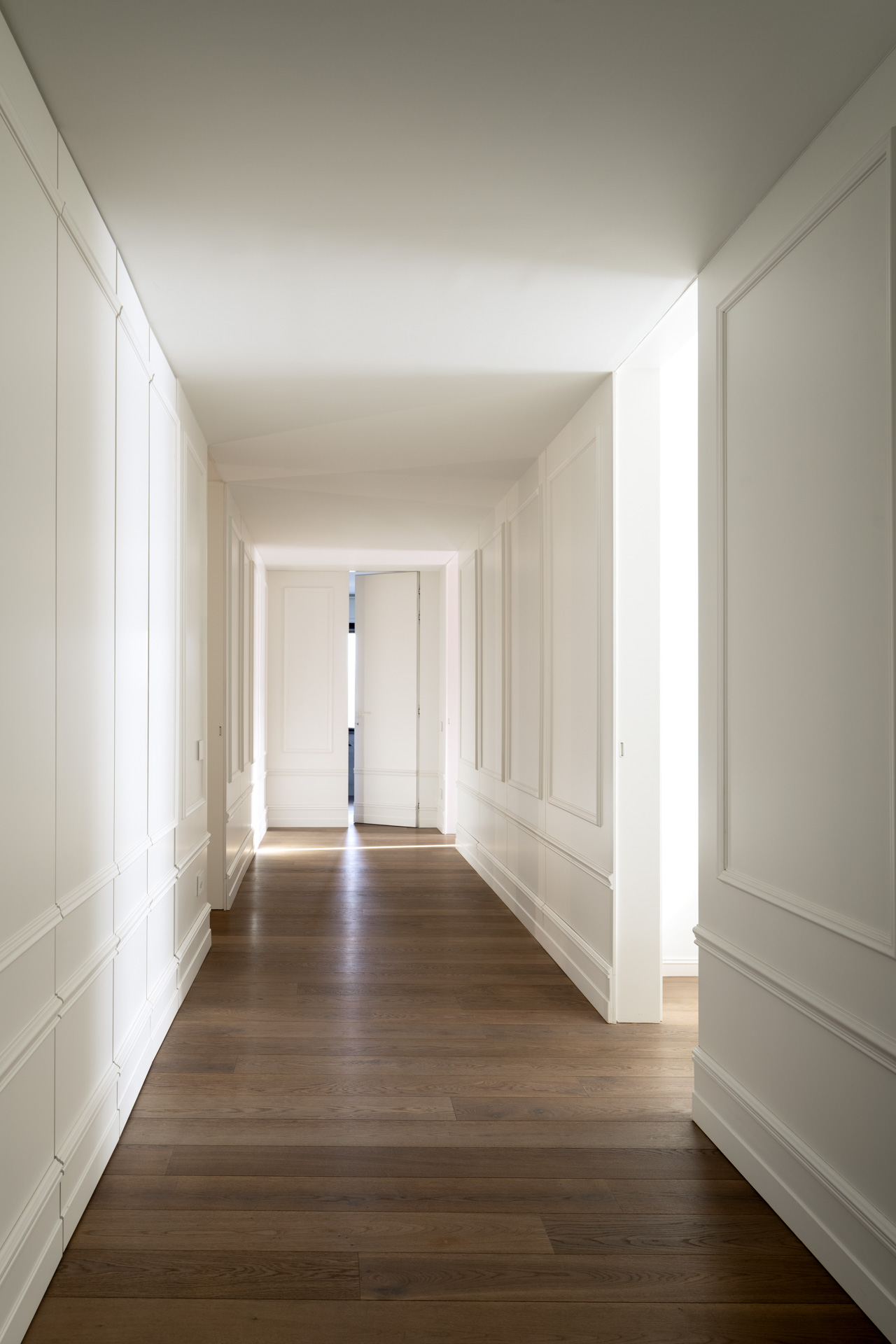 Tutti gli ambienti si dispongono attorno all’ampio living, cuore pulsante della casa, spazio di convivialità e rappresentanza; la sua imponenza si misura in profondità, ma la monotonia si spezza con le trame trasversali dei listoni del parquet pregiato e delle super lastre in gres porcellanato.