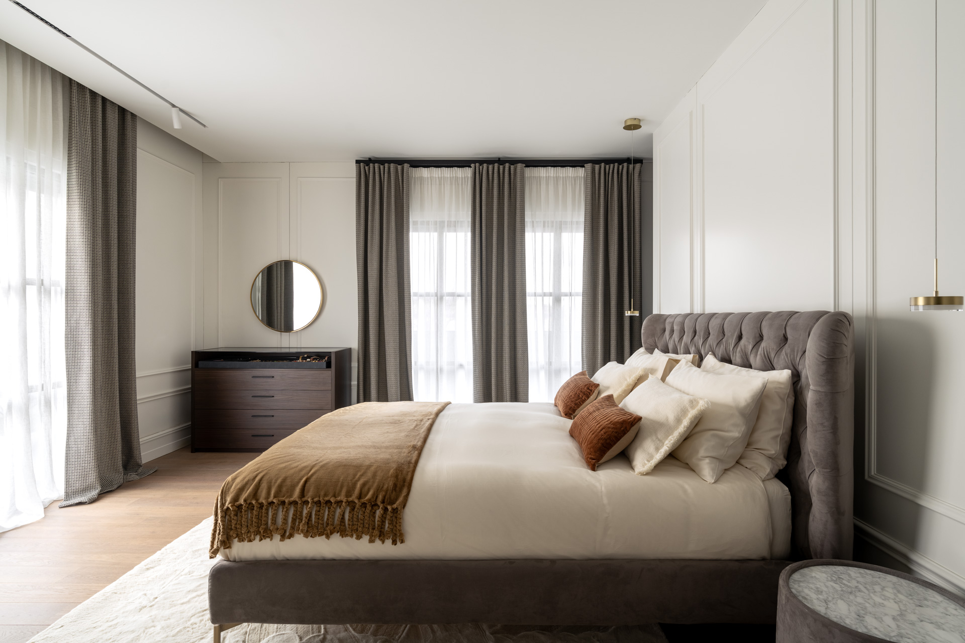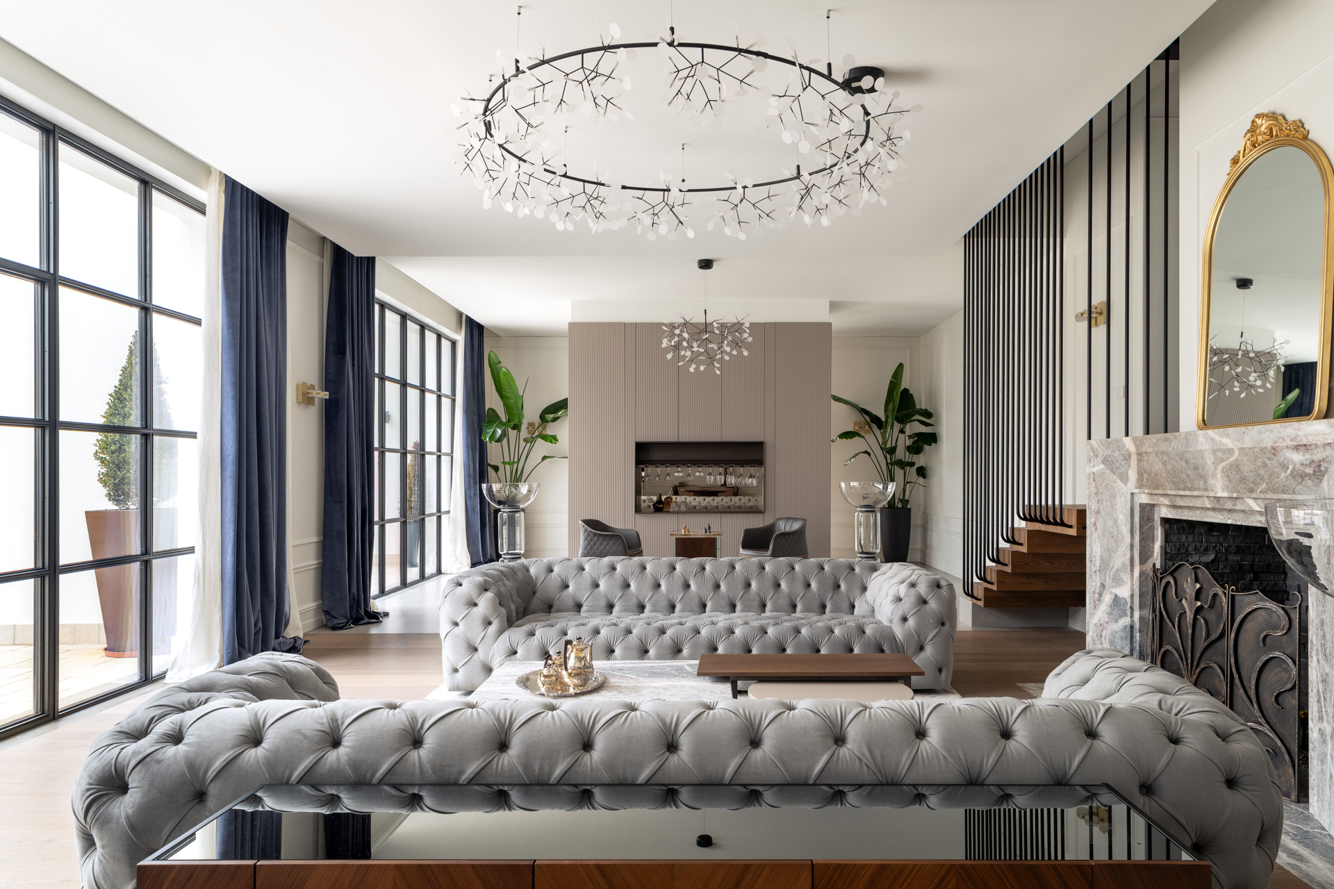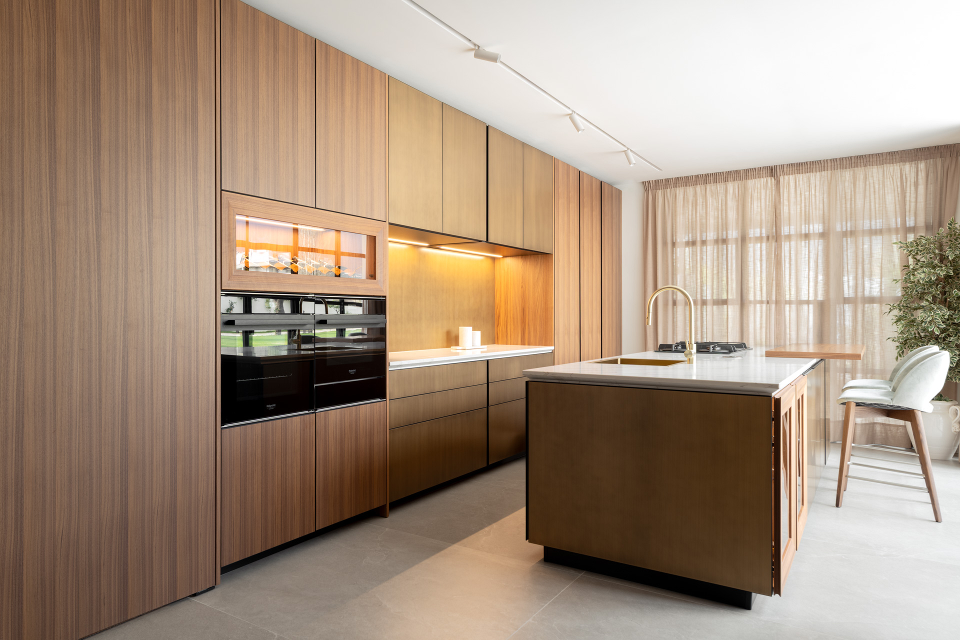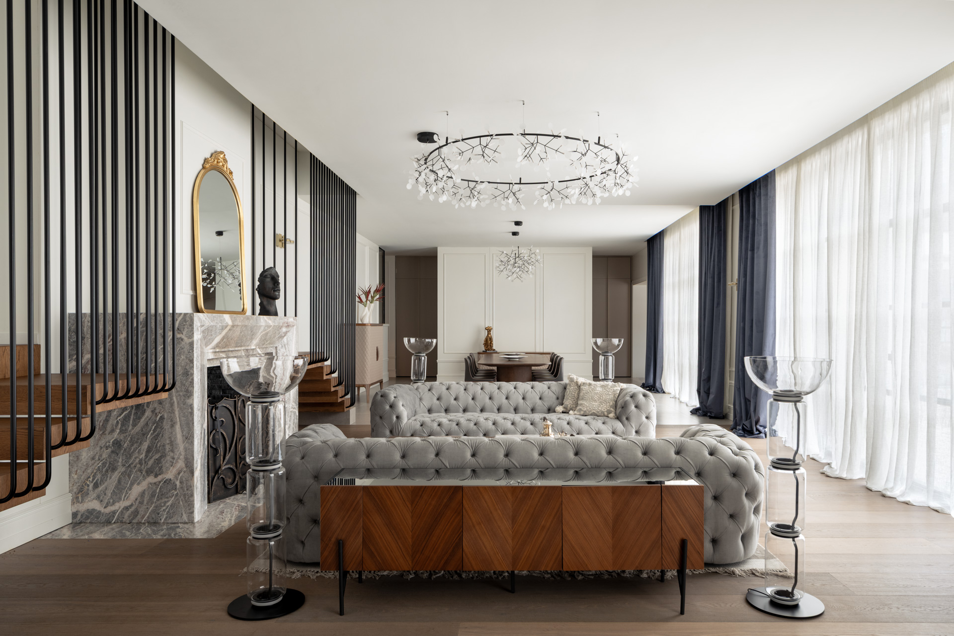 Tutti gli ambienti si dispongono attorno all’ampio living, cuore pulsante della casa, spazio di convivialità e rappresentanza; la sua imponenza si misura in profondità, ma la monotonia si spezza con le trame trasversali dei listoni del parquet pregiato e delle super lastre in gres porcellanato.