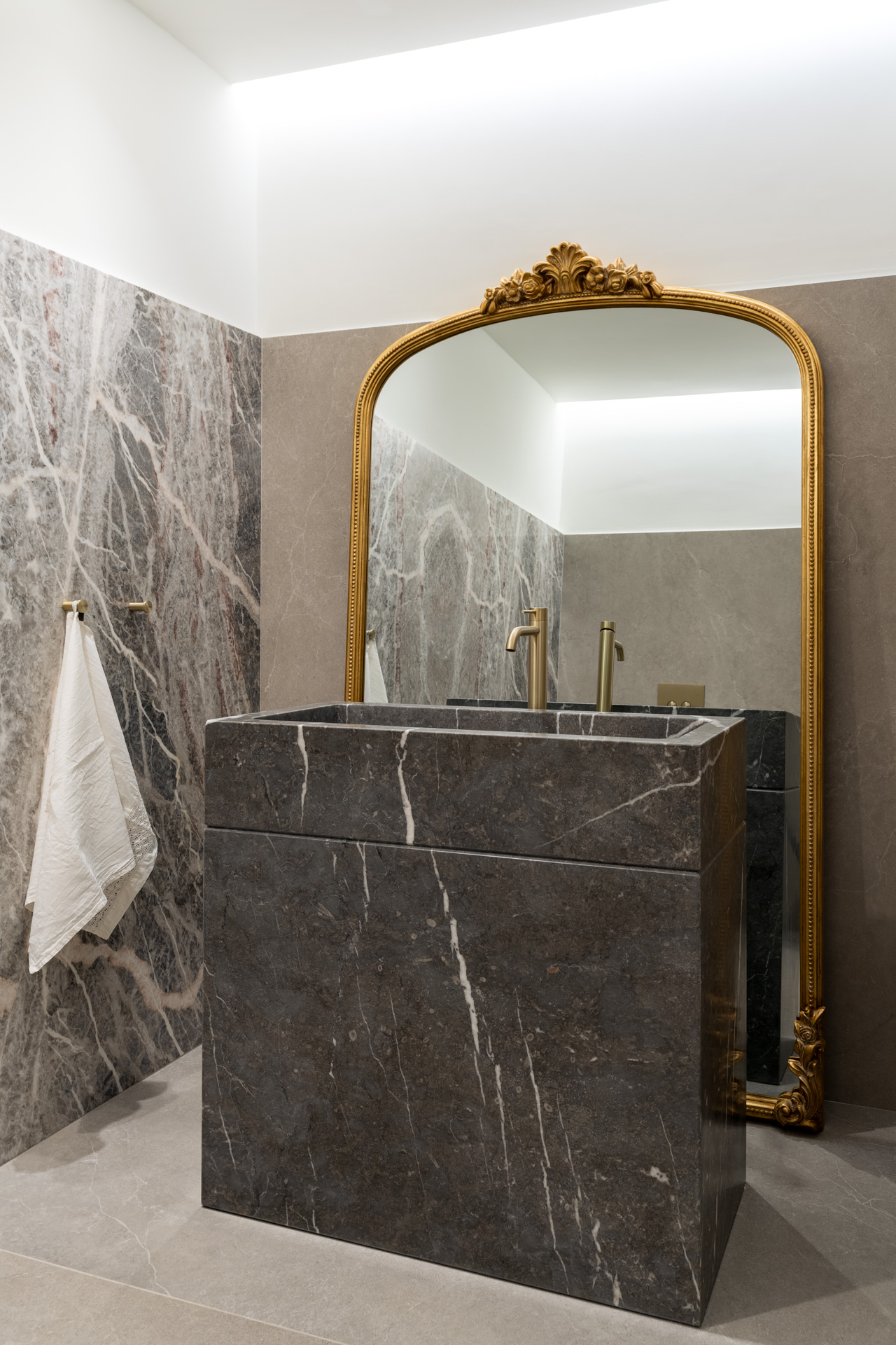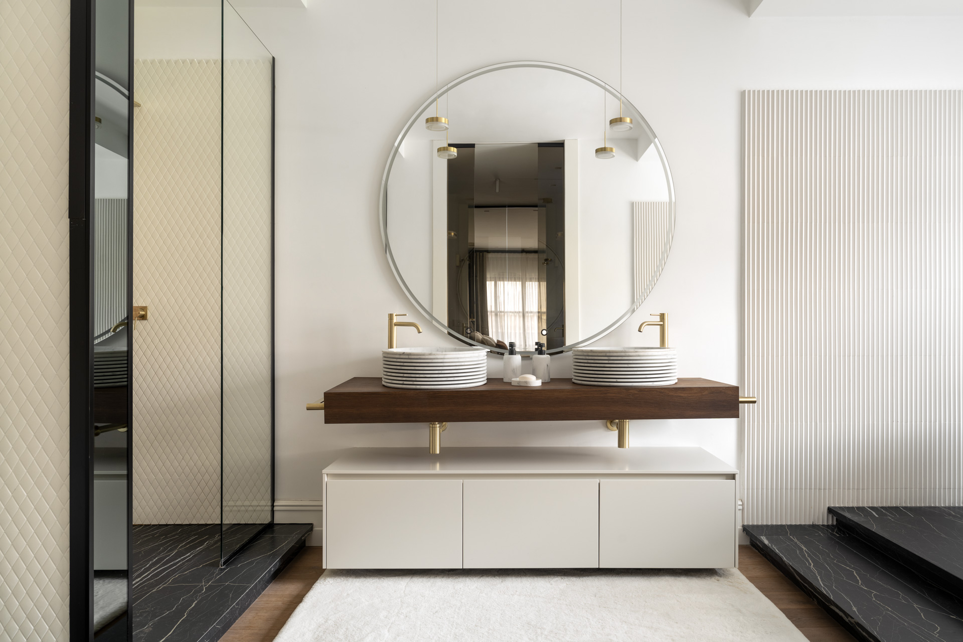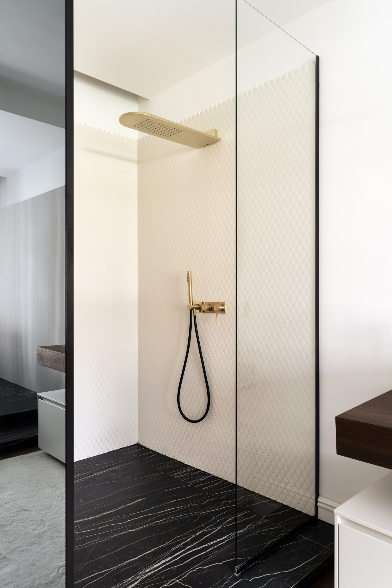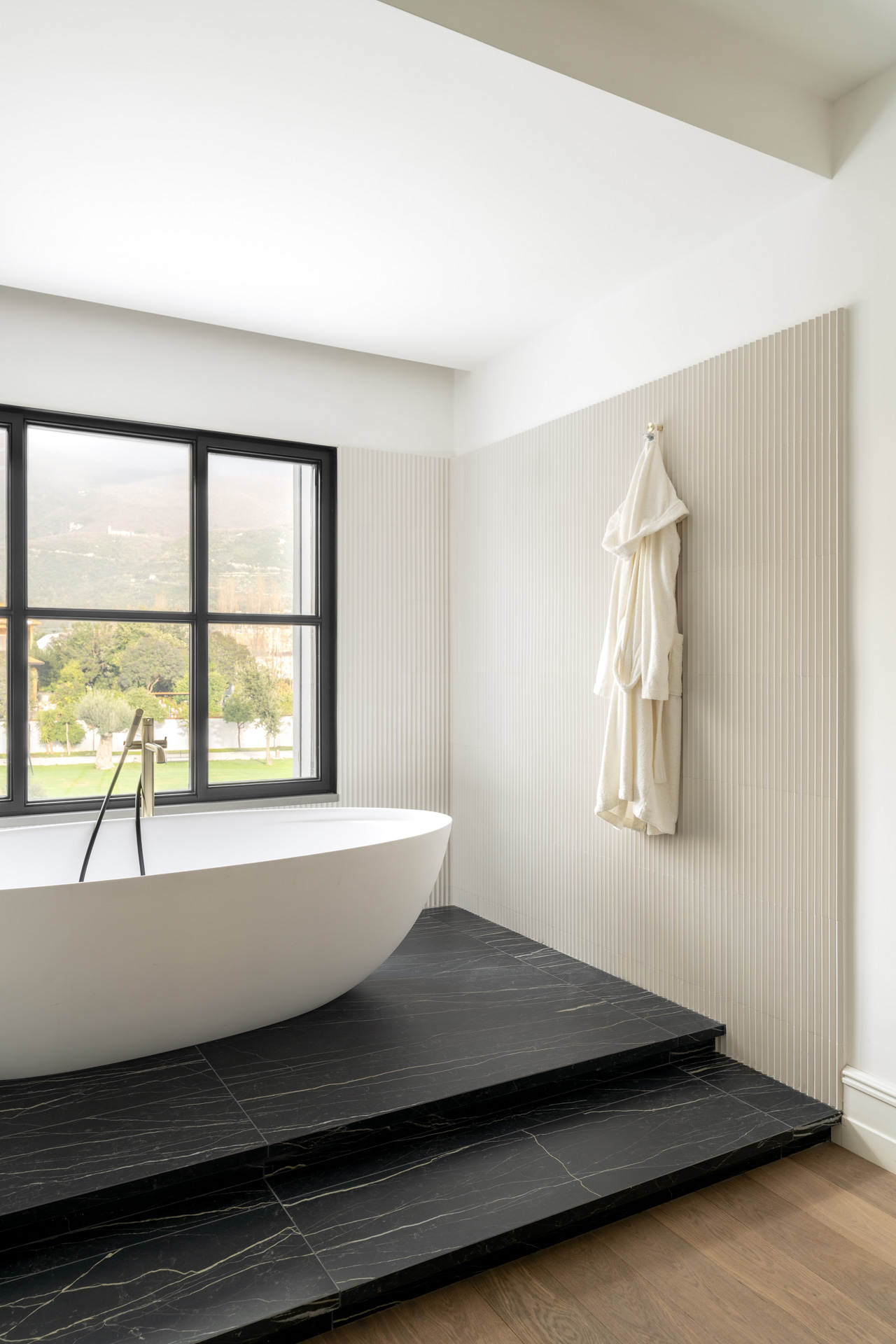 Ogni camera ha il proprio “bain en suite”, oltre questi, la casa ne prevede altri due di rappresentanza, ai diversi piani. Il bagno di punta resta quello della master bedroom padronale, concepito come una vera e propria sala in cui sostare e godere dell’esperienza di uno spazio grande ma molto intimo, e approfittare per rilassarsi nella grande vasca che si affaccia sul giardino sottostante.