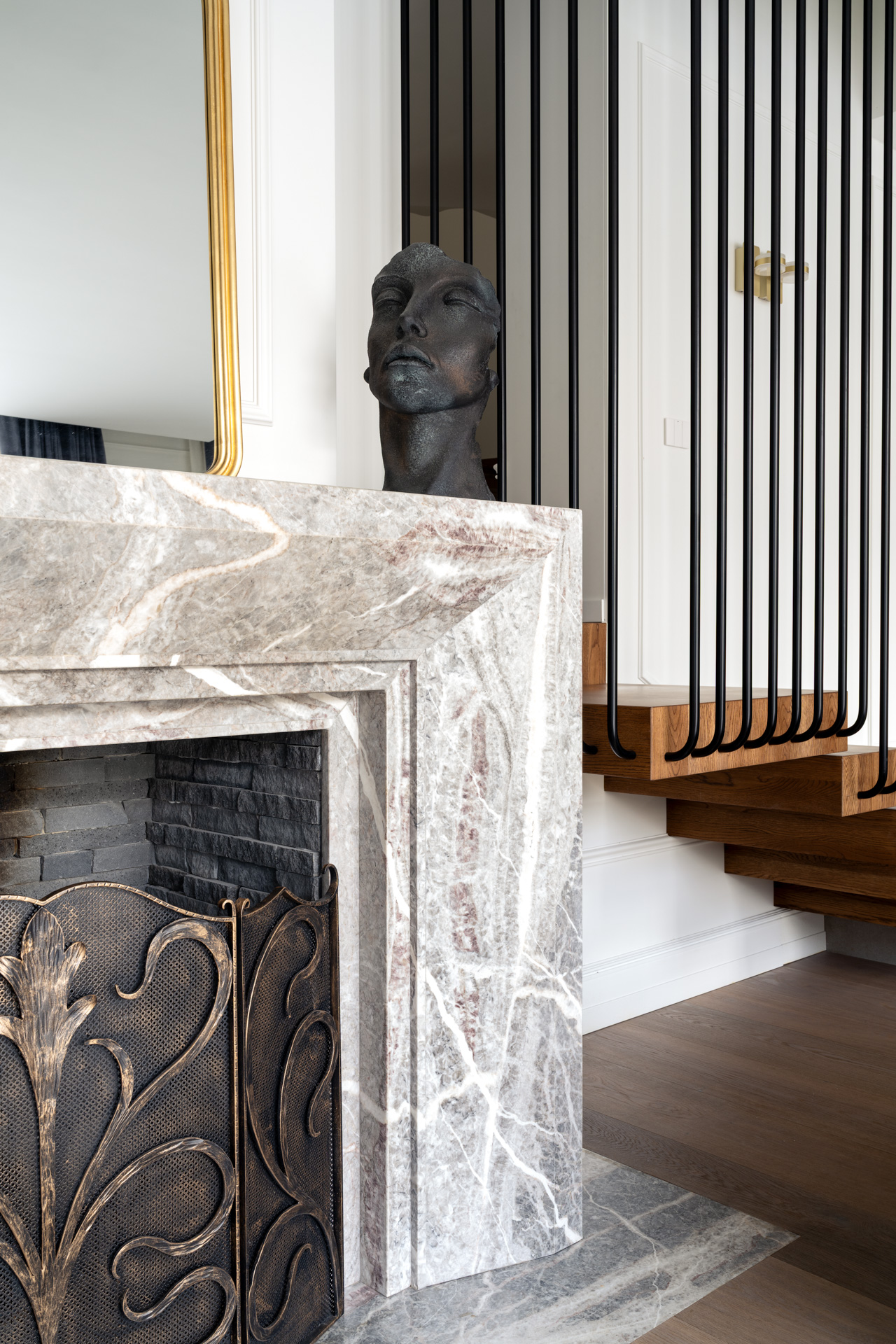 I materiali sono tutti molto pregiati, partendo dal parquet che circoscrive il living e lo eleva a spazio sacro, ma che troviamo anche nella zona notte, passando alle lastre in gres, diverse e più pratiche per uno spazio a contatto con un grande giardino esterno, per arrivare infine ai marmi come il fior di pesco o il grey usati per la realizzazione di pezzi unici.