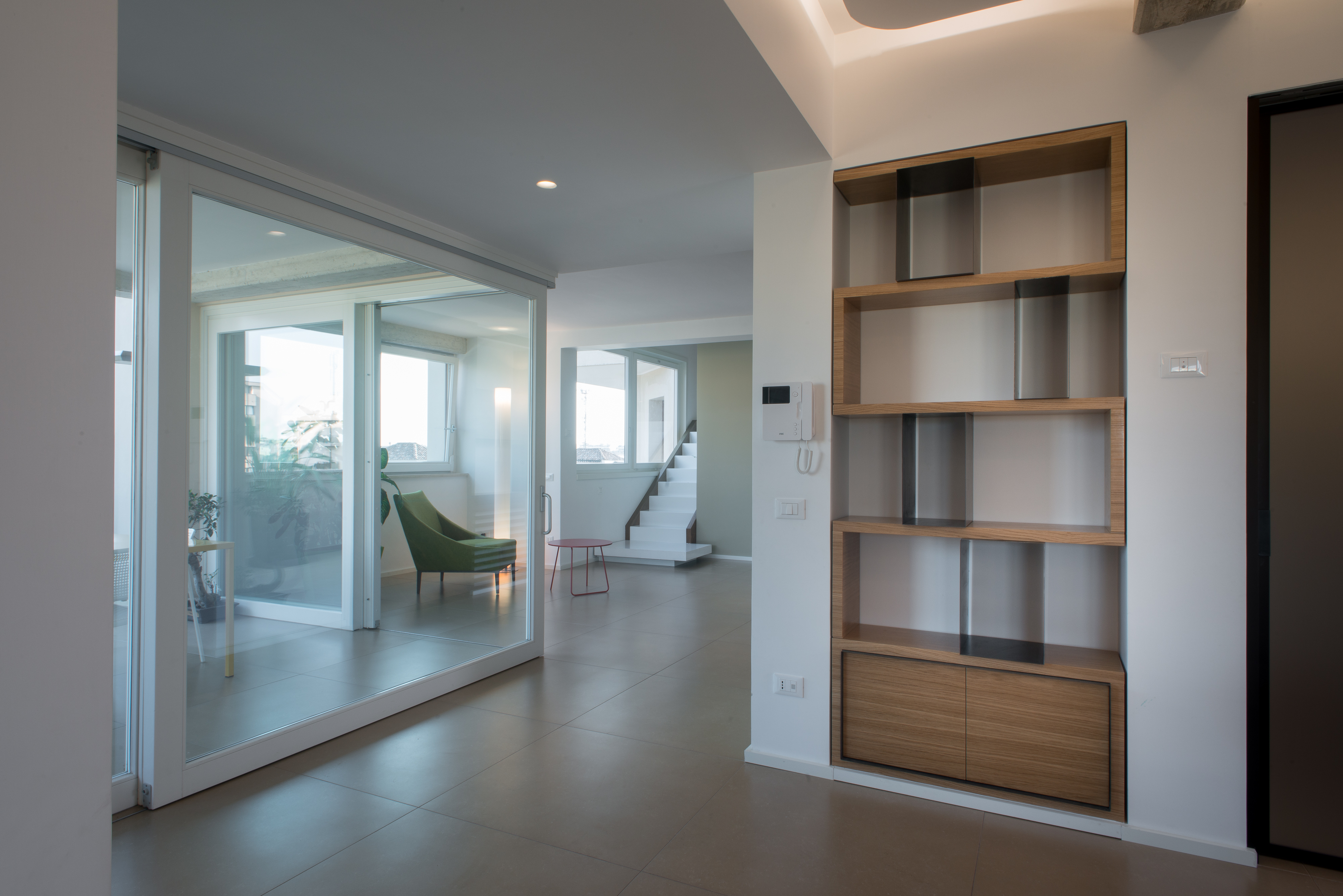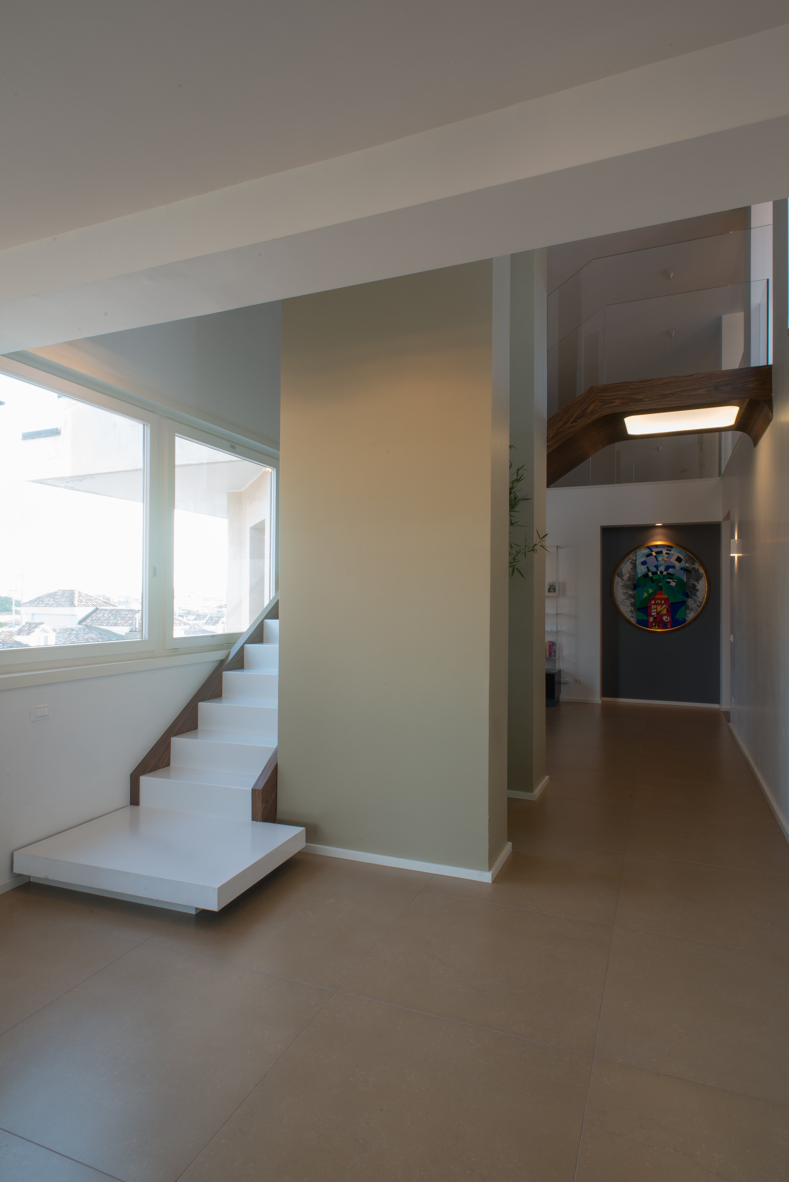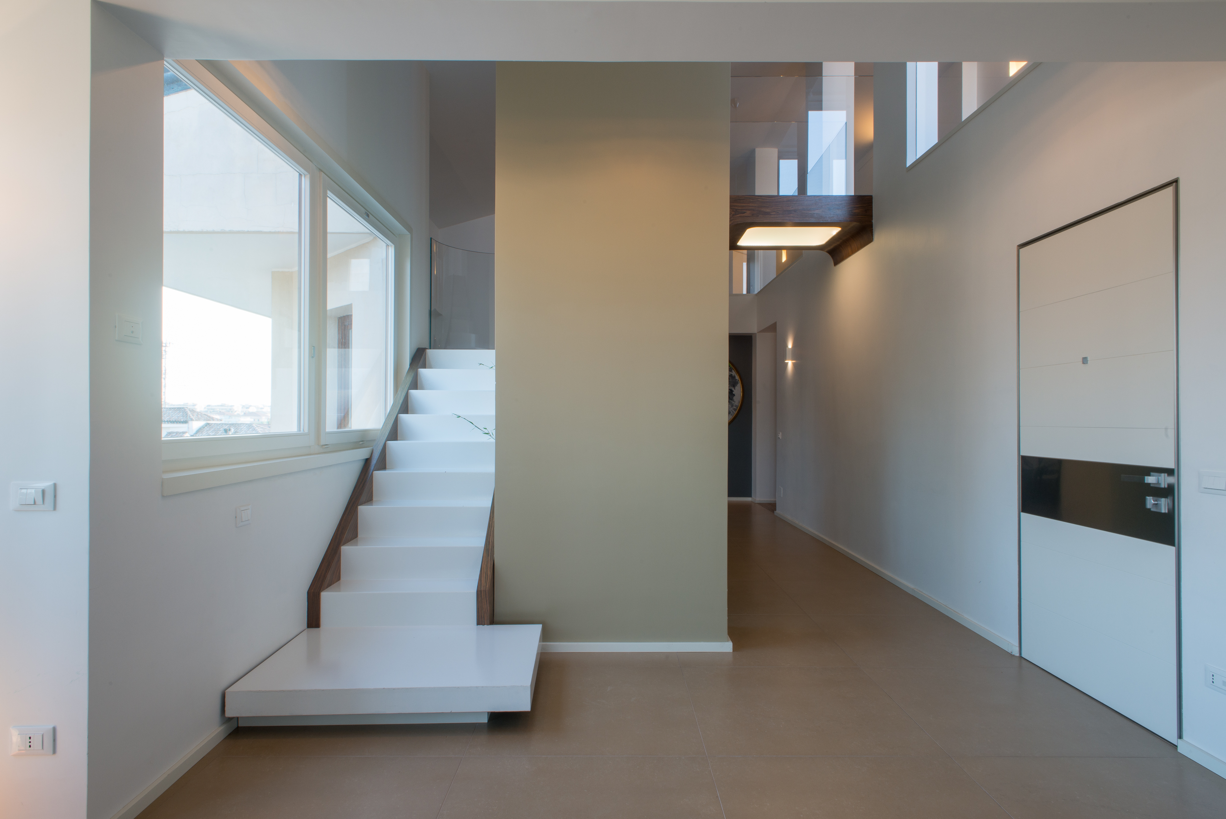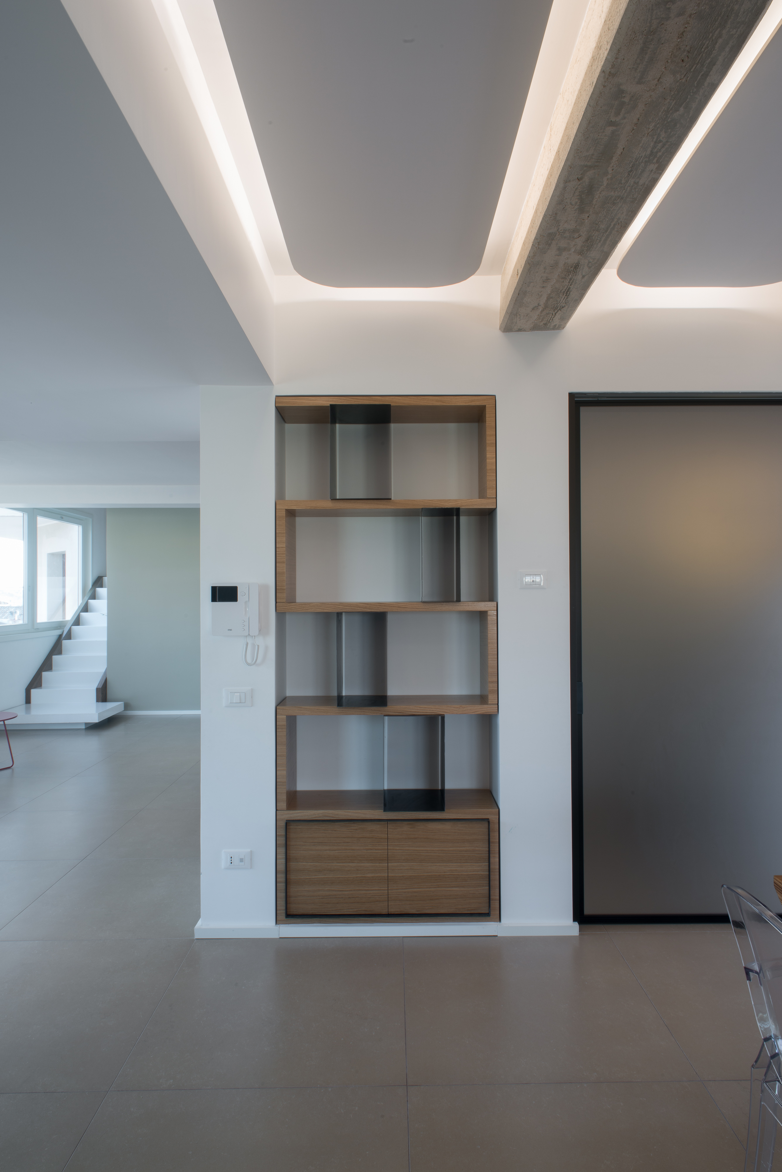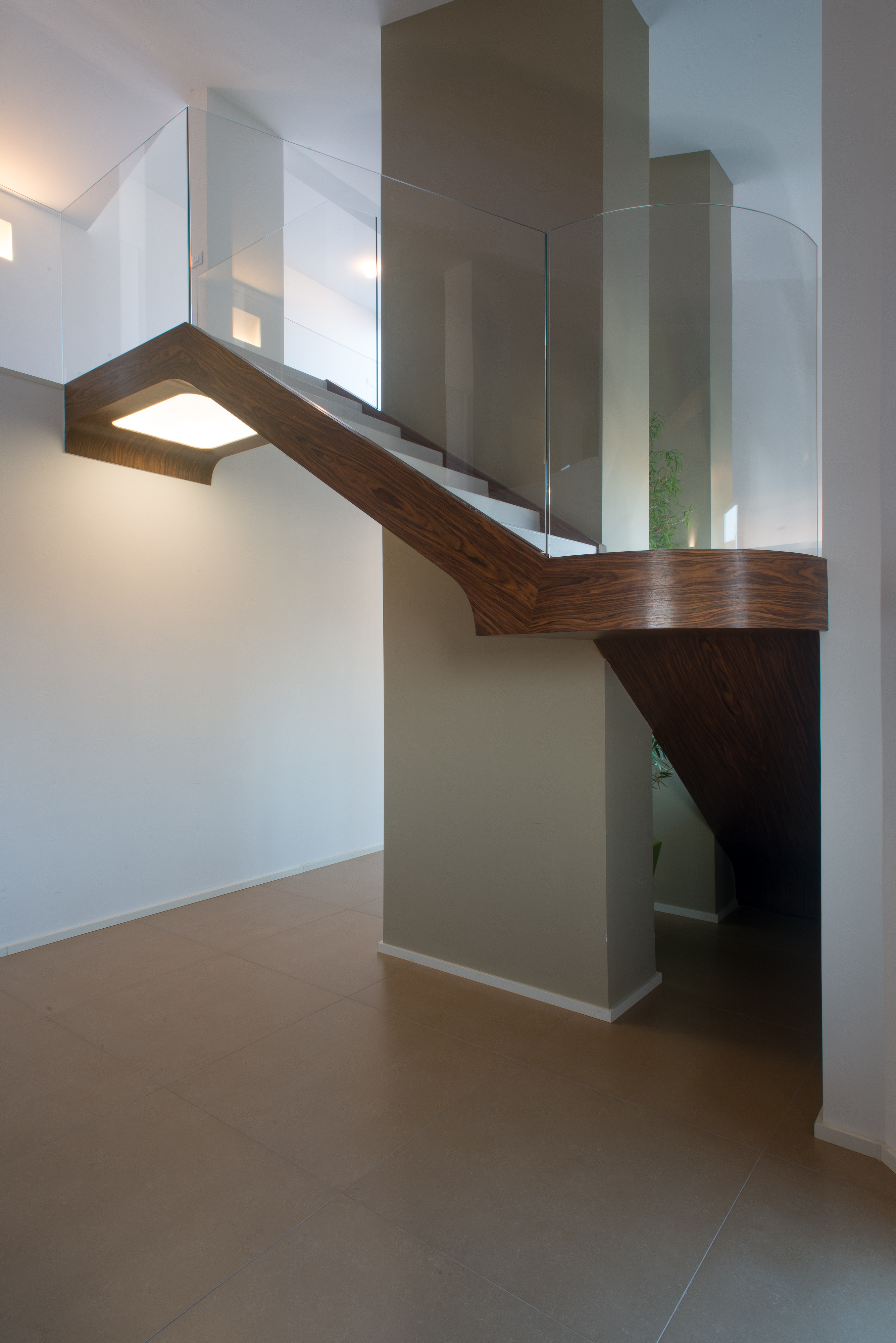 Si tratta di una scala di metallo completamente rivestita in resina, i vetri laterali enfatizzano la luce naturale e nella parte inferiore sono integrate le luci trasformandola in una vera e propria lampada. Il passaggio alla zona notte è contraddistinto da delle bellissime boiserie in legno. Le stanze da bagno sono personalizzate con rivestimenti Mutina.