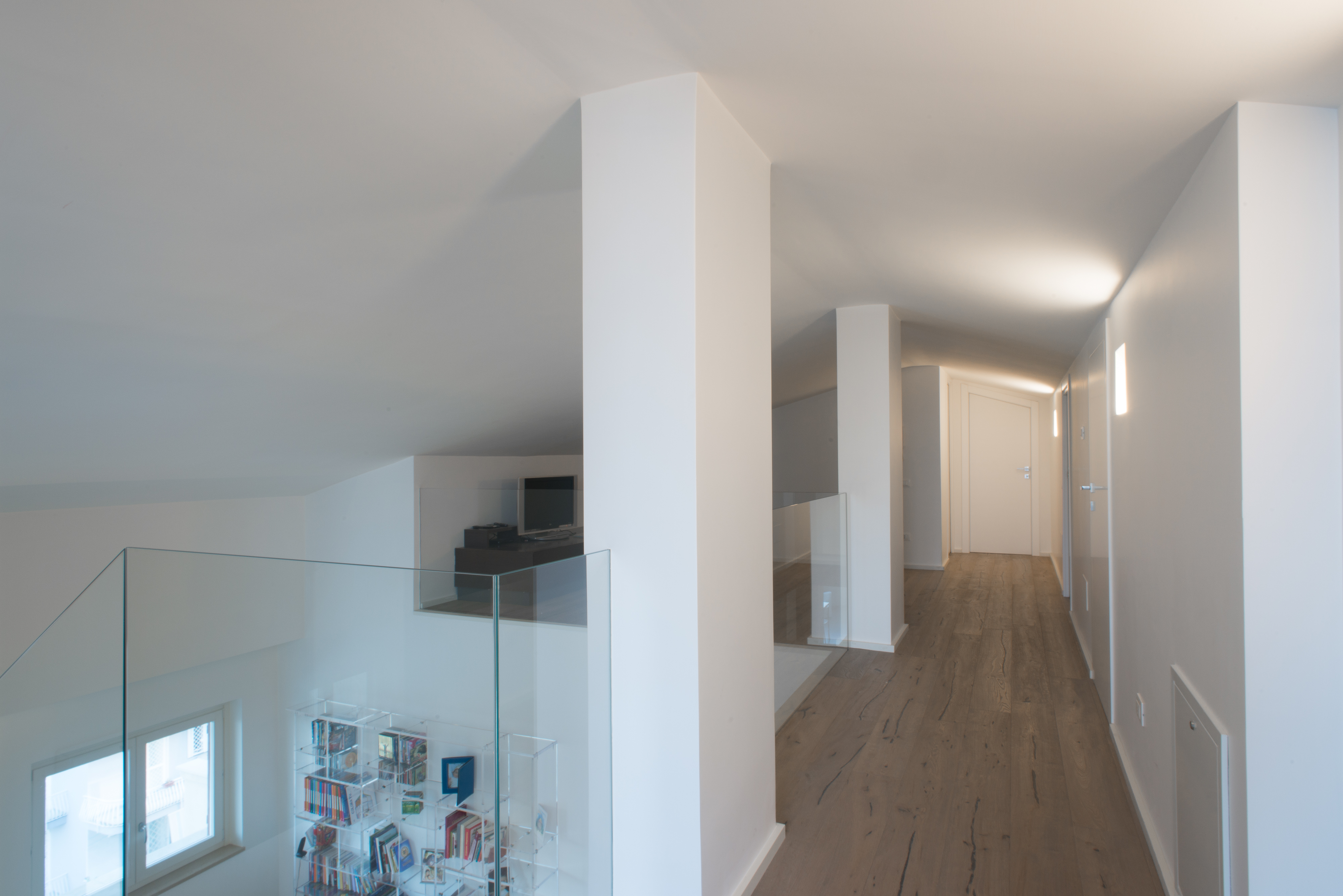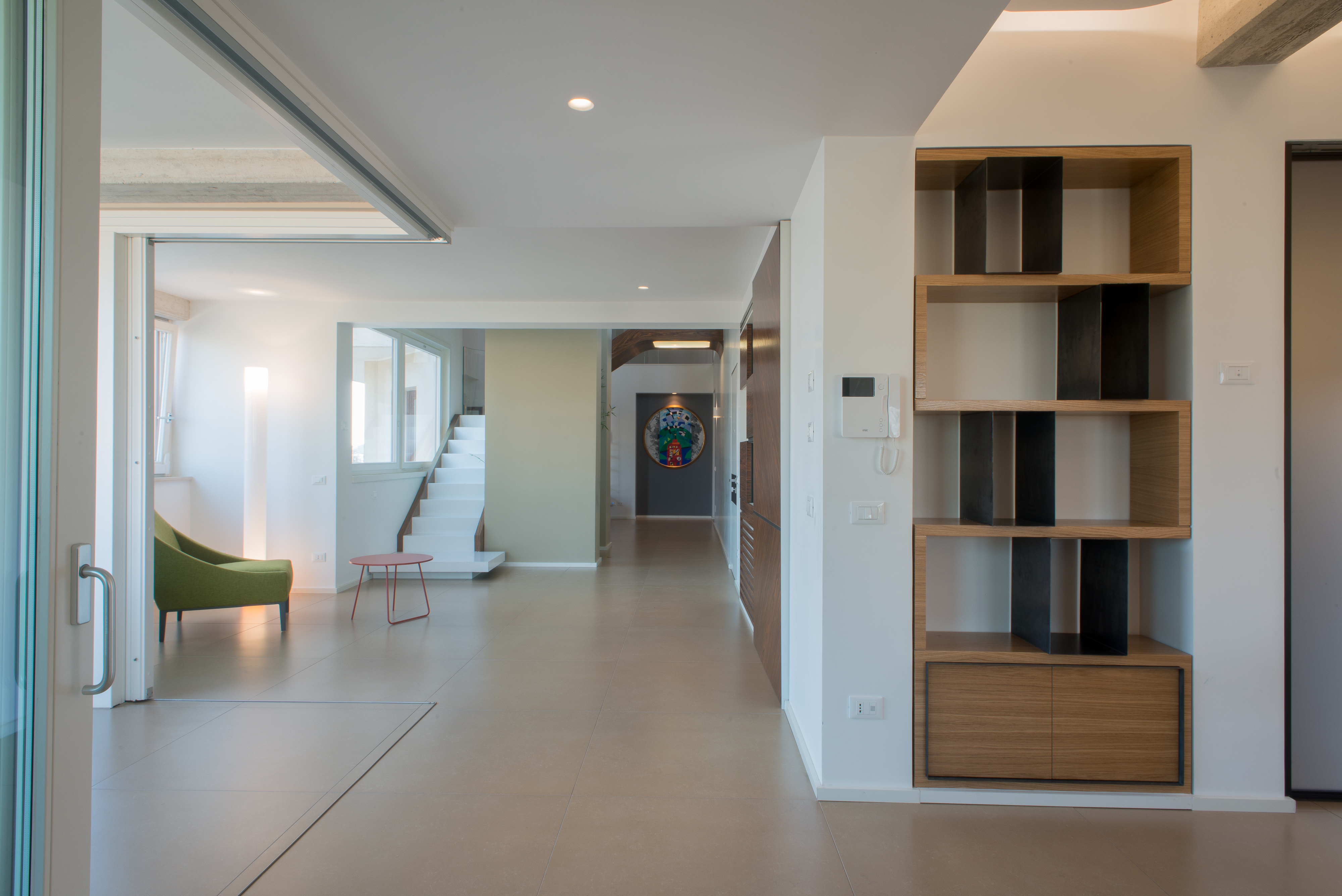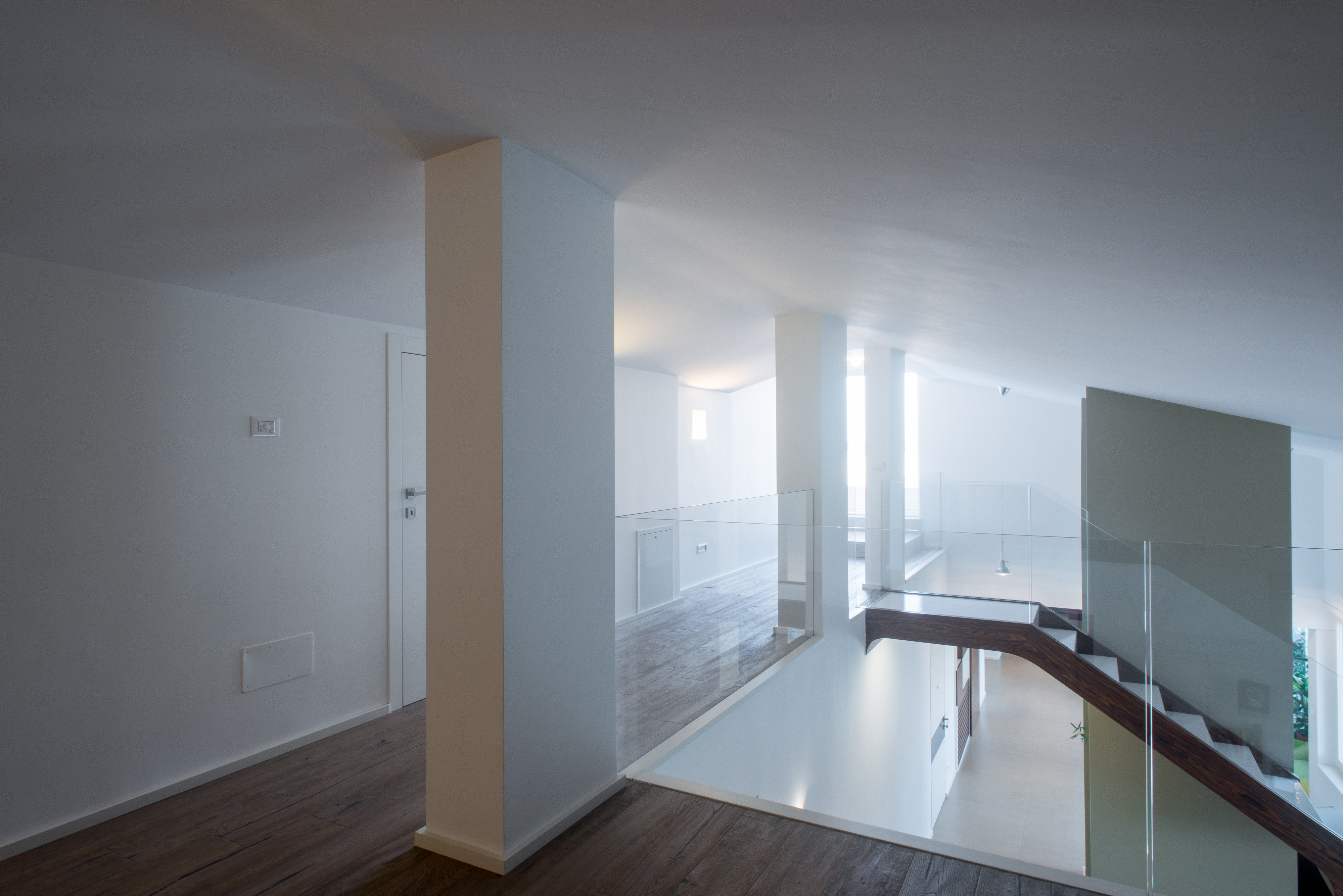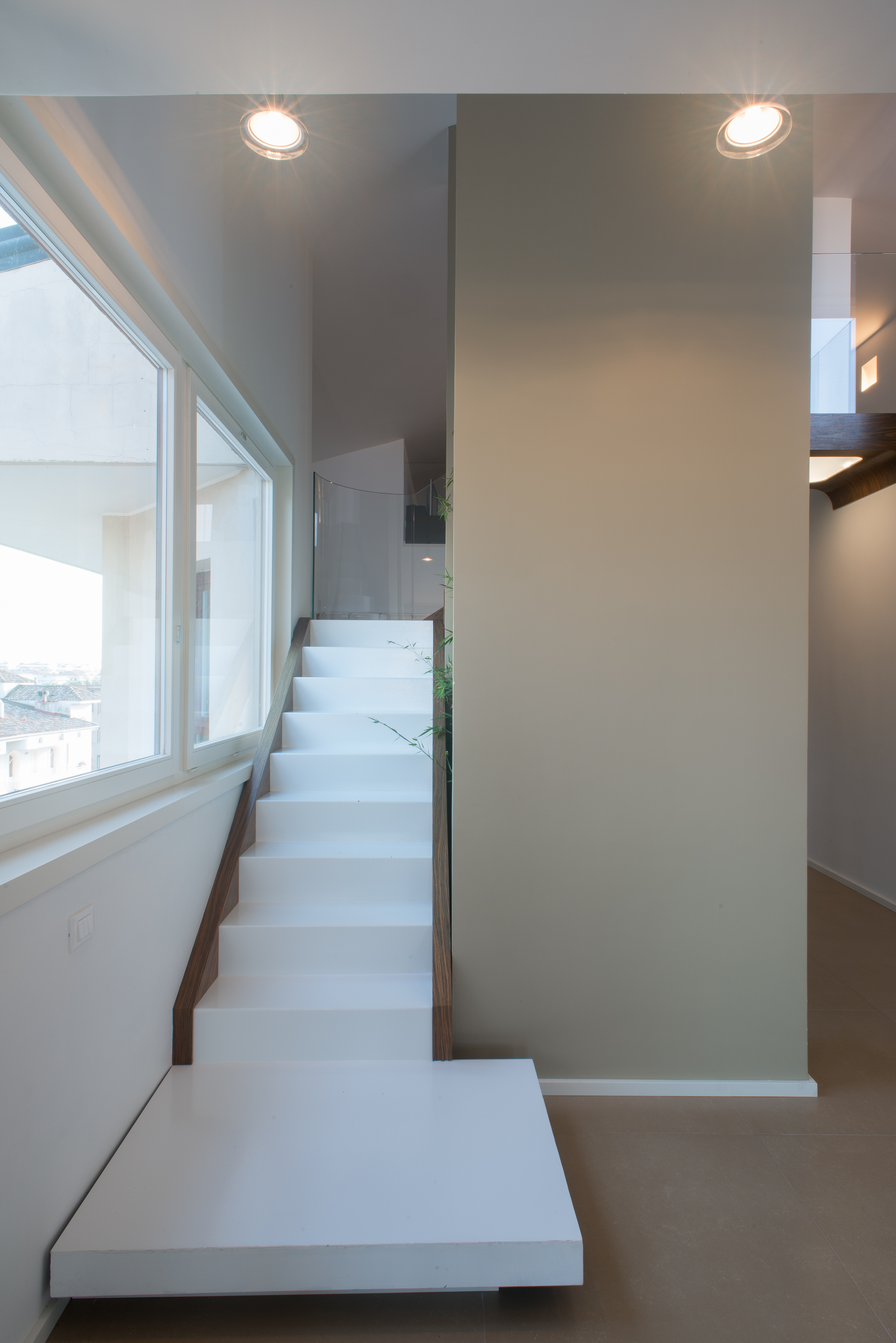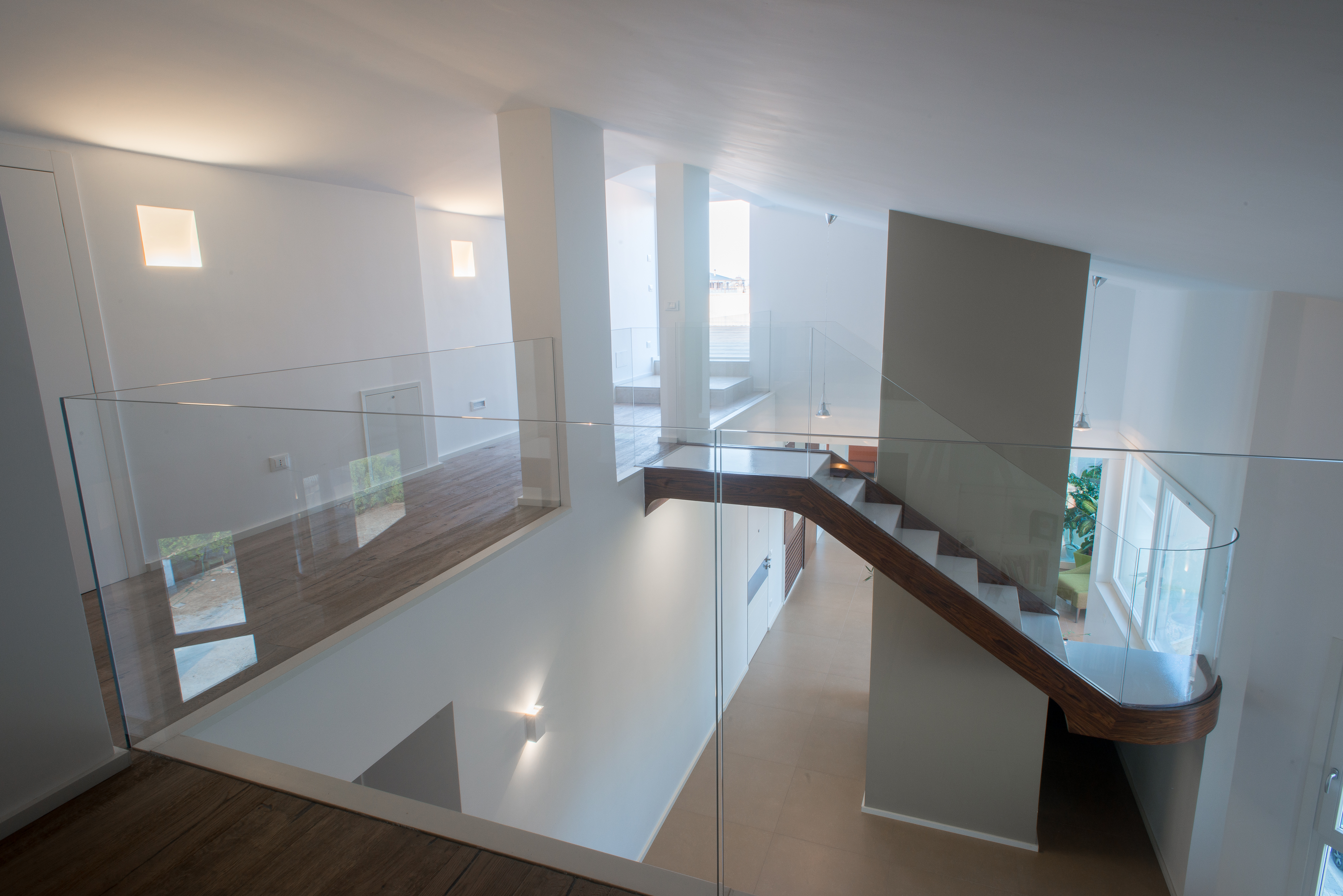 Si tratta di una scala di metallo completamente rivestita in resina, i vetri laterali enfatizzano la luce naturale e nella parte inferiore sono integrate le luci trasformandola in una vera e propria lampada. Il passaggio alla zona notte è contraddistinto da delle bellissime boiserie in legno. Le stanze da bagno sono personalizzate con rivestimenti Mutina.