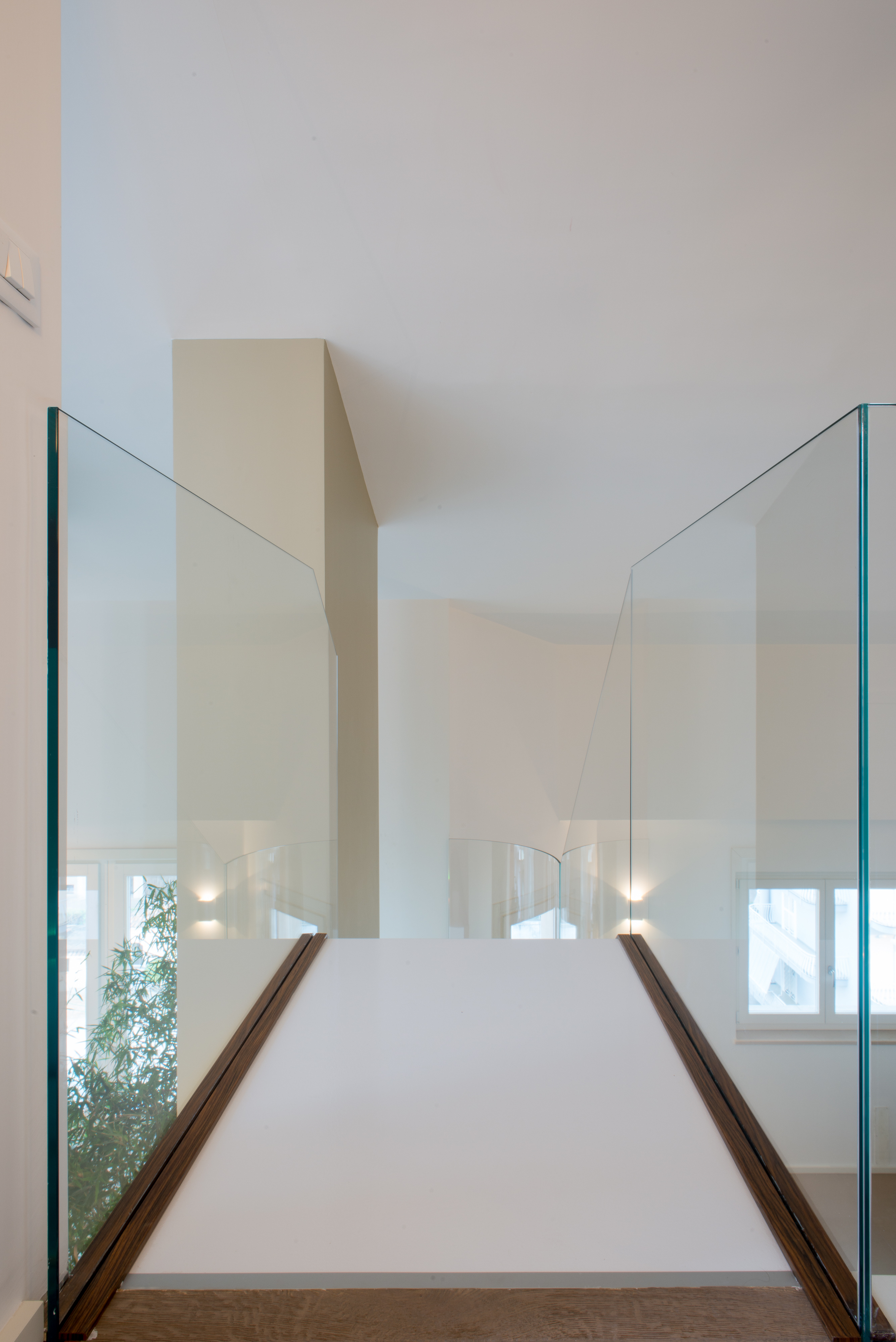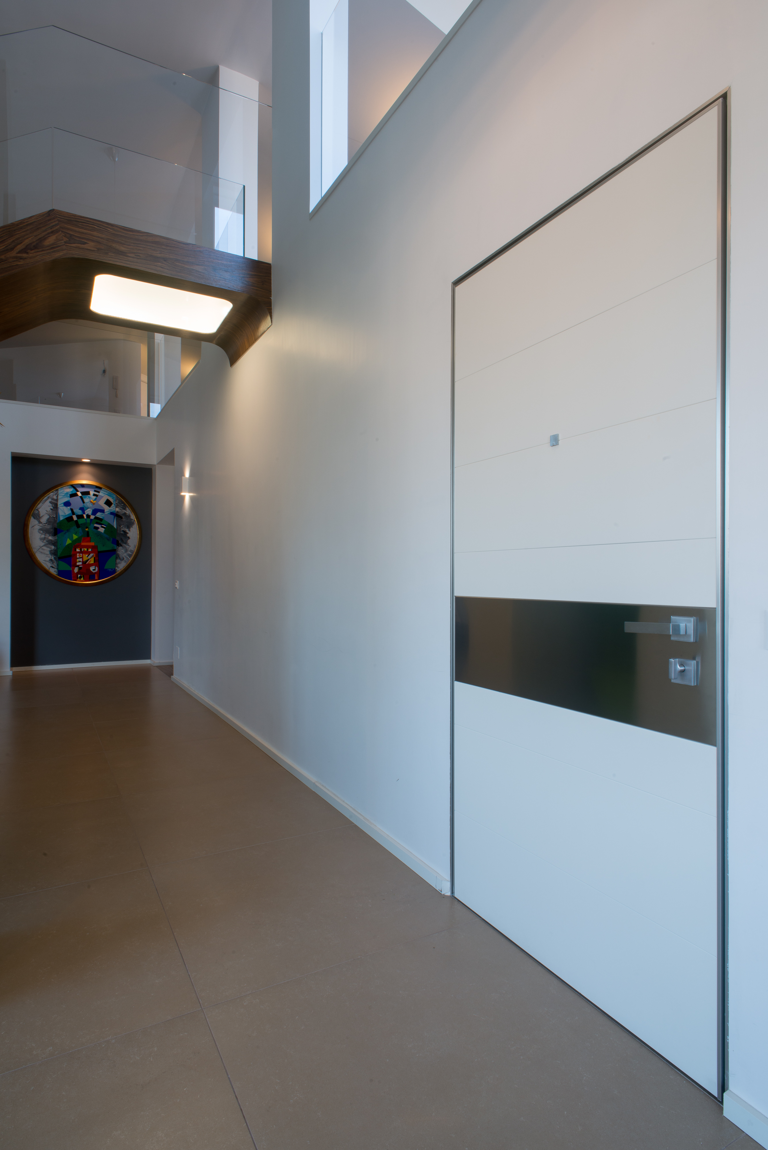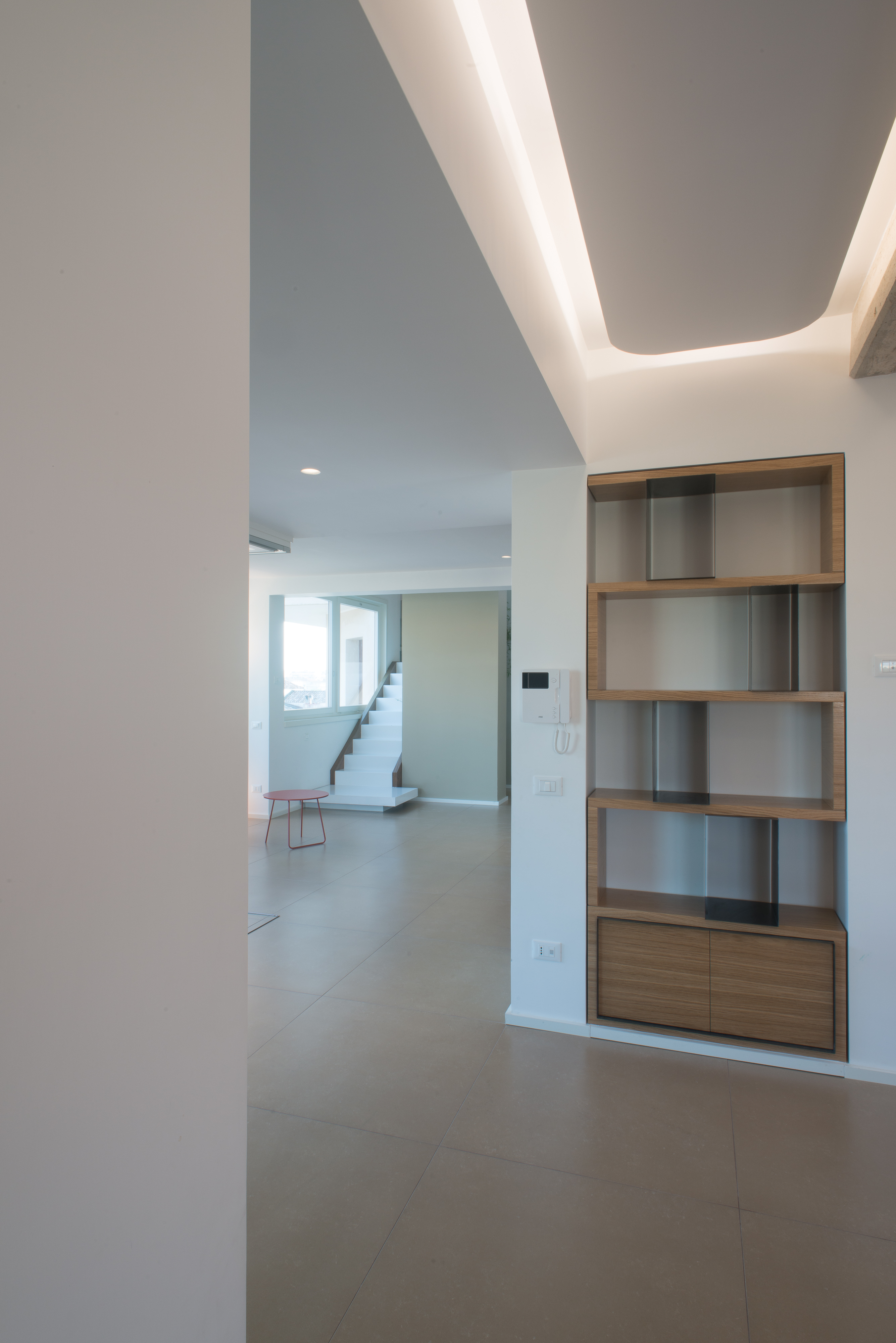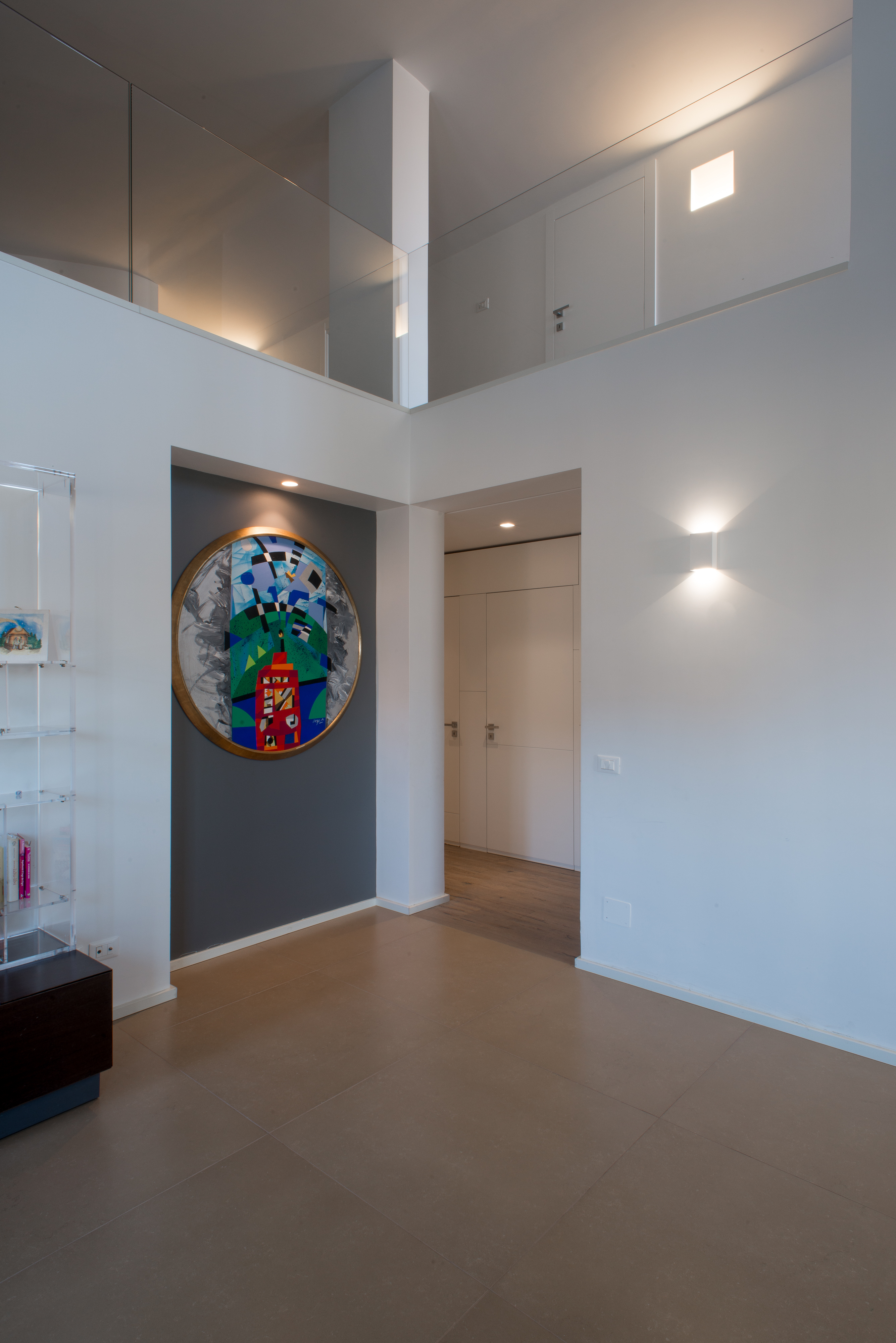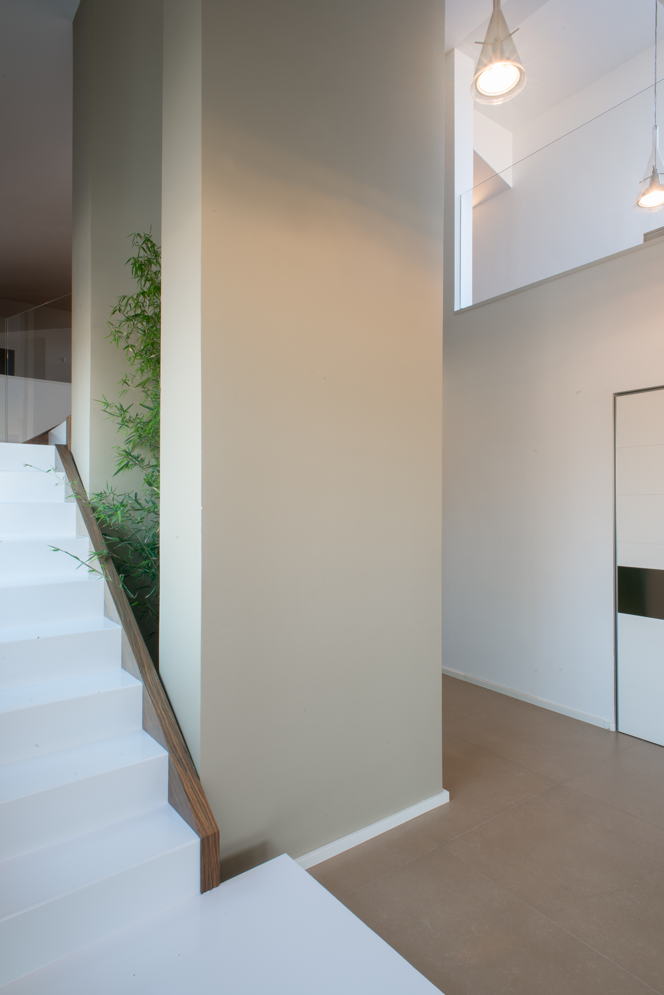 Si tratta di una scala di metallo completamente rivestita in resina, i vetri laterali enfatizzano la luce naturale e nella parte inferiore sono integrate le luci trasformandola in una vera e propria lampada. Il passaggio alla zona notte è contraddistinto da delle bellissime boiserie in legno. Le stanze da bagno sono personalizzate con rivestimenti Mutina.