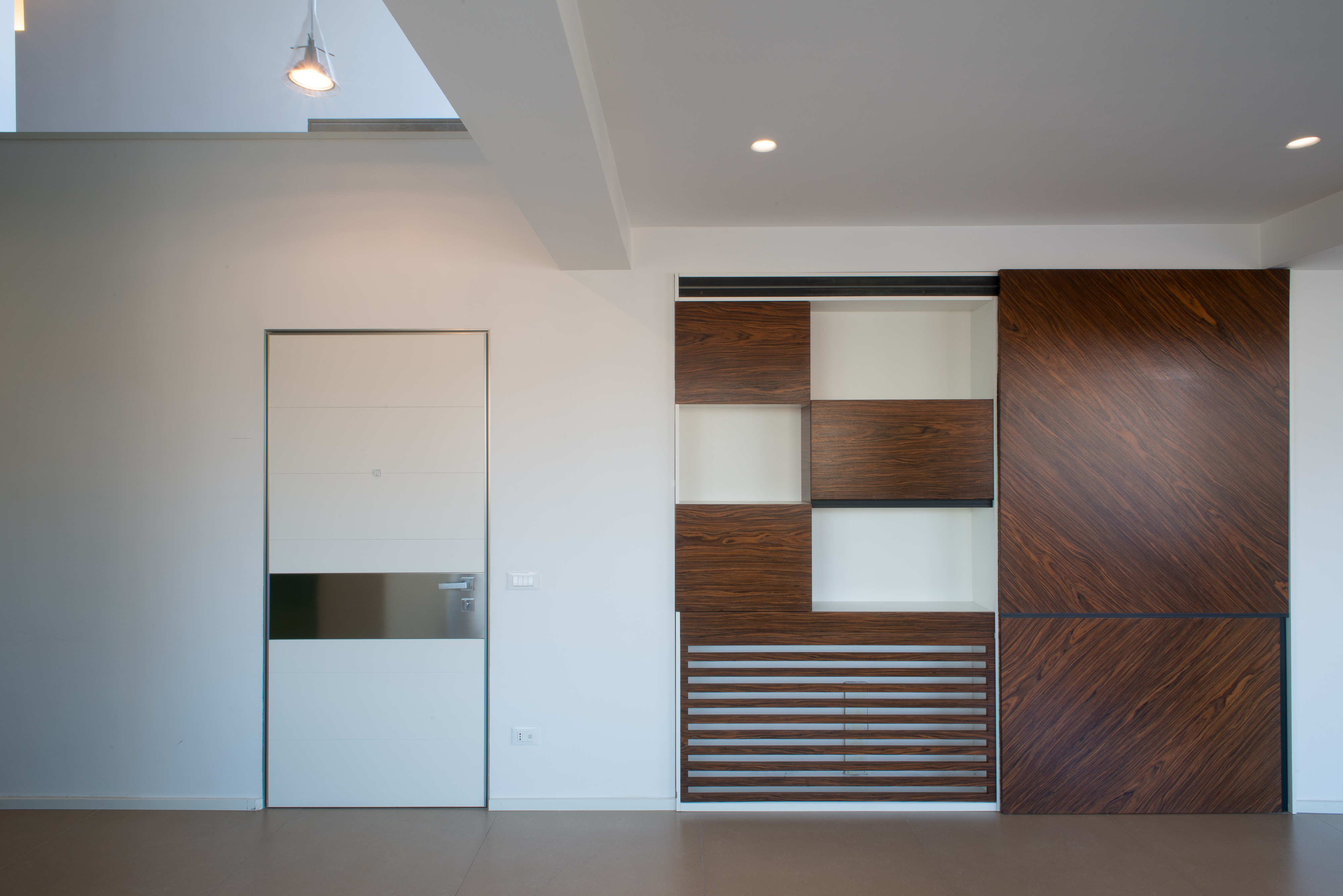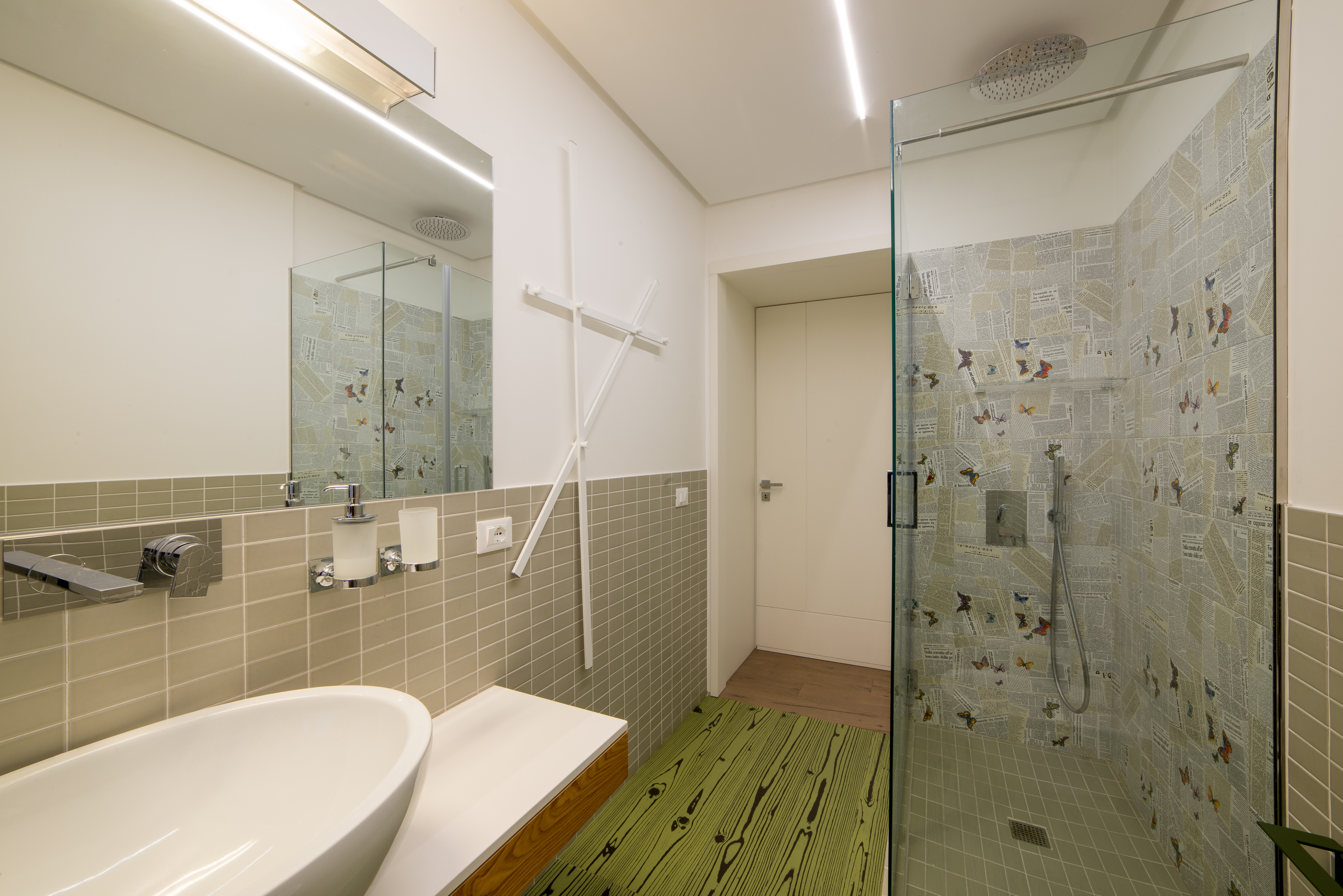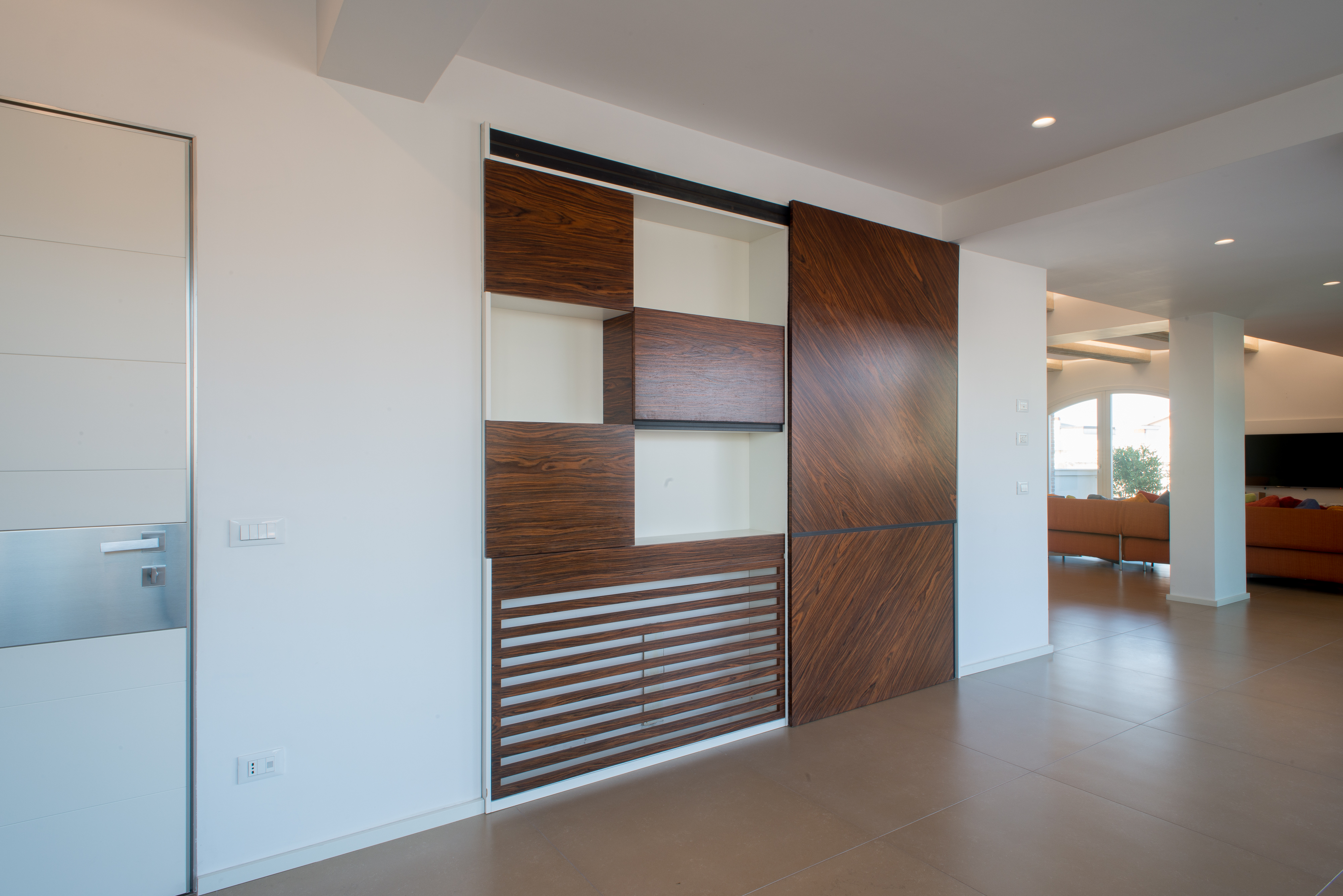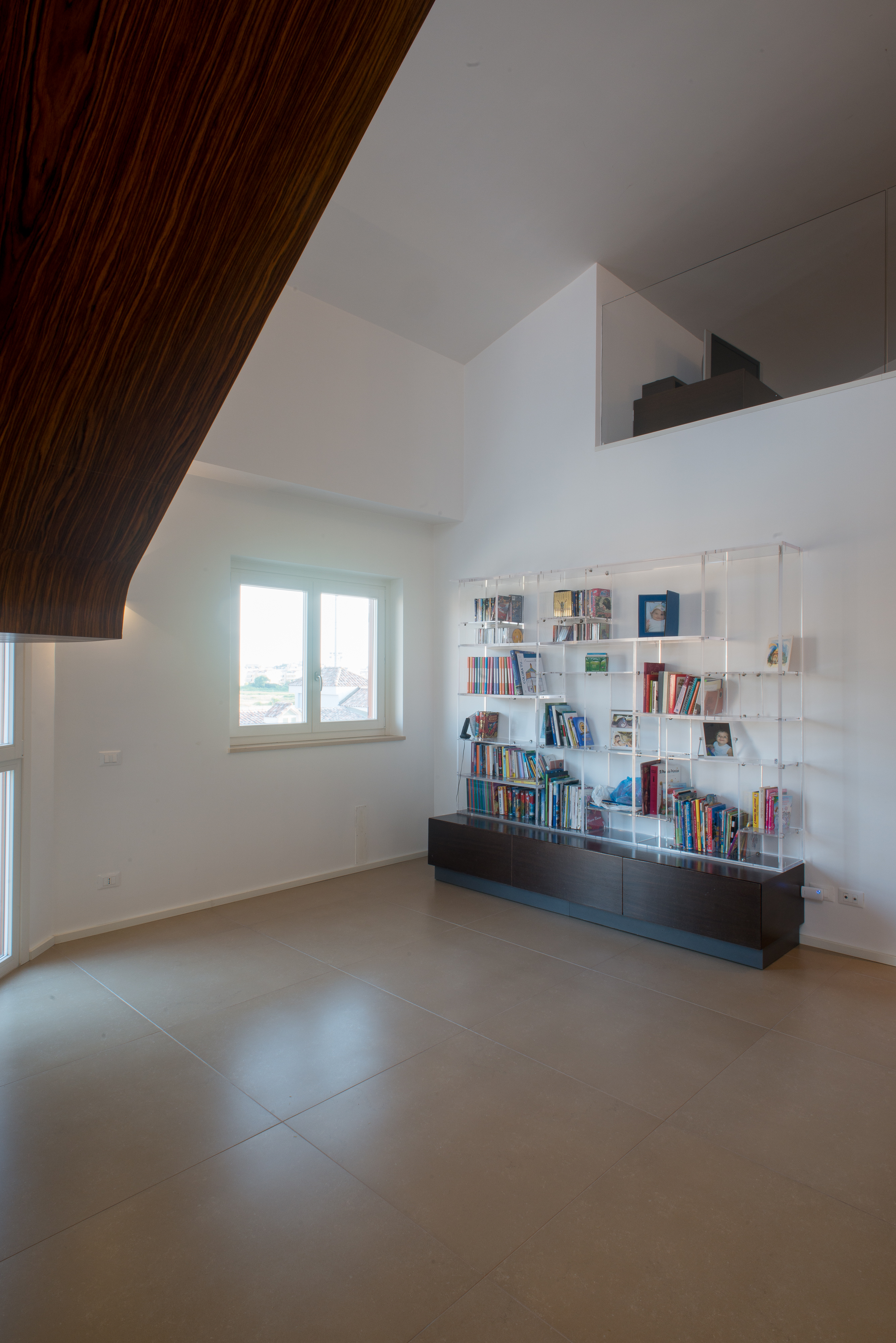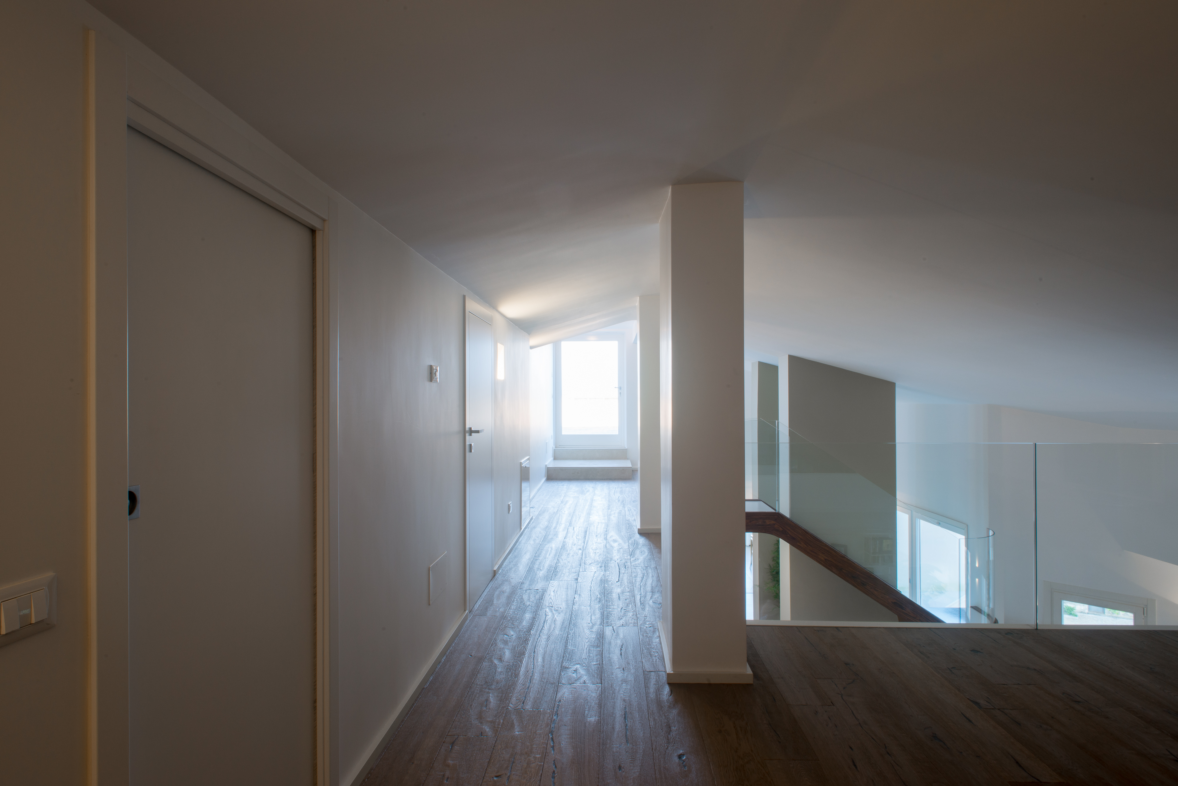 Si tratta di una scala di metallo completamente rivestita in resina, i vetri laterali enfatizzano la luce naturale e nella parte inferiore sono integrate le luci trasformandola in una vera e propria lampada. Il passaggio alla zona notte è contraddistinto da delle bellissime boiserie in legno. Le stanze da bagno sono personalizzate con rivestimenti Mutina.