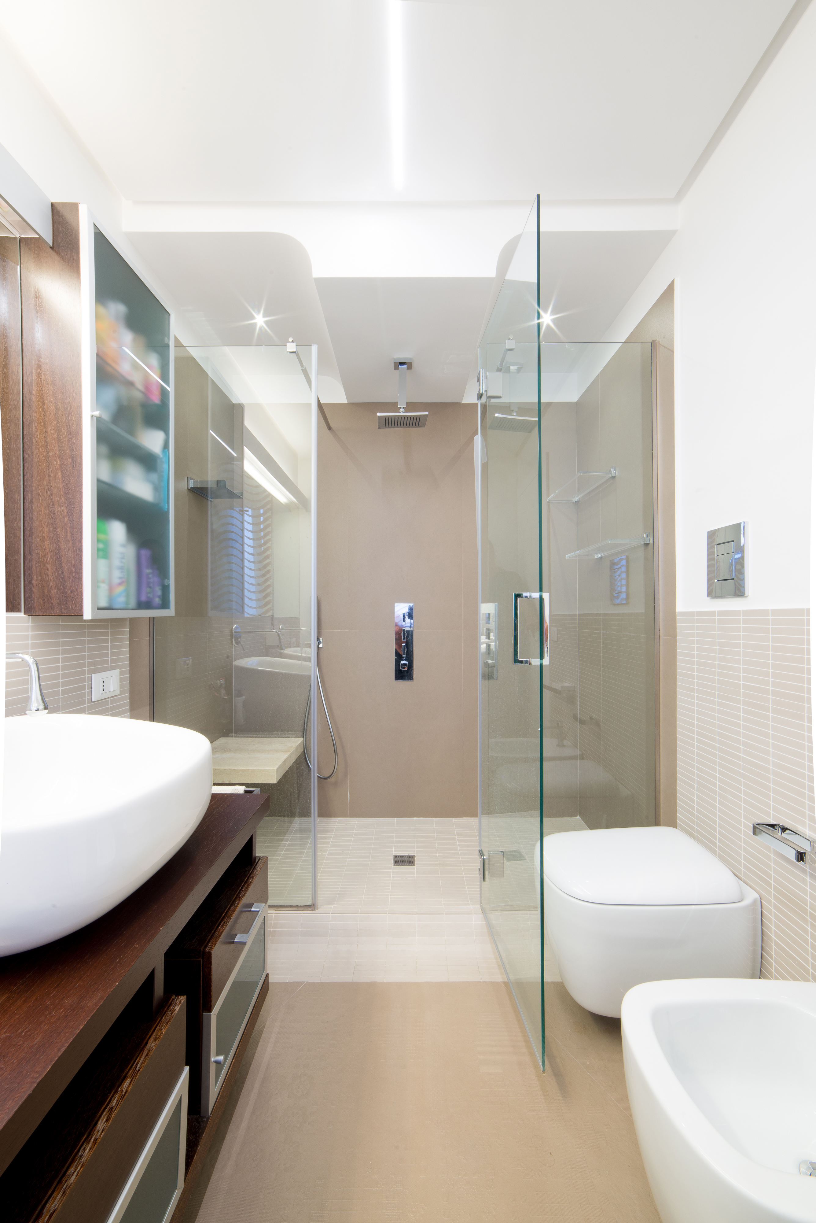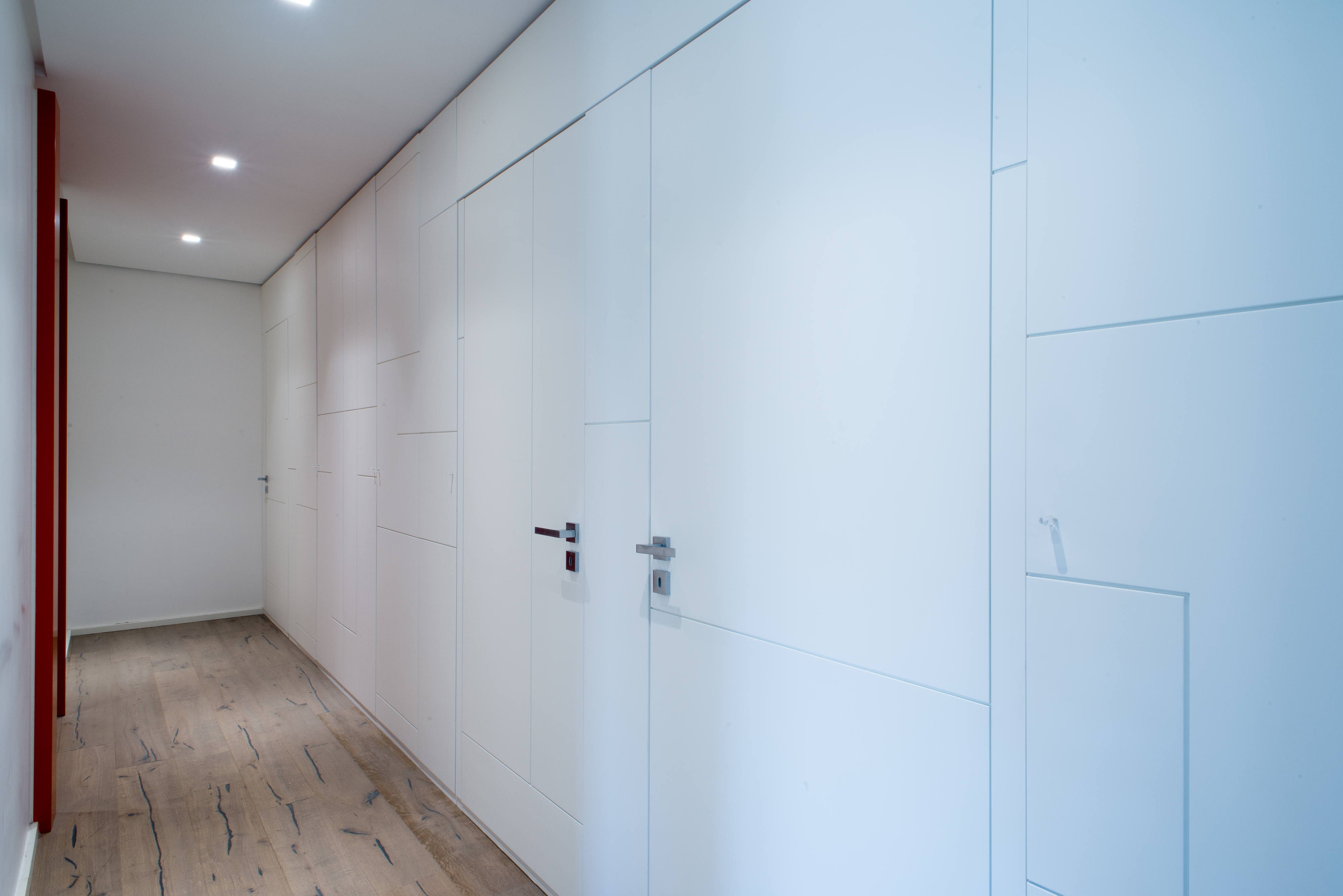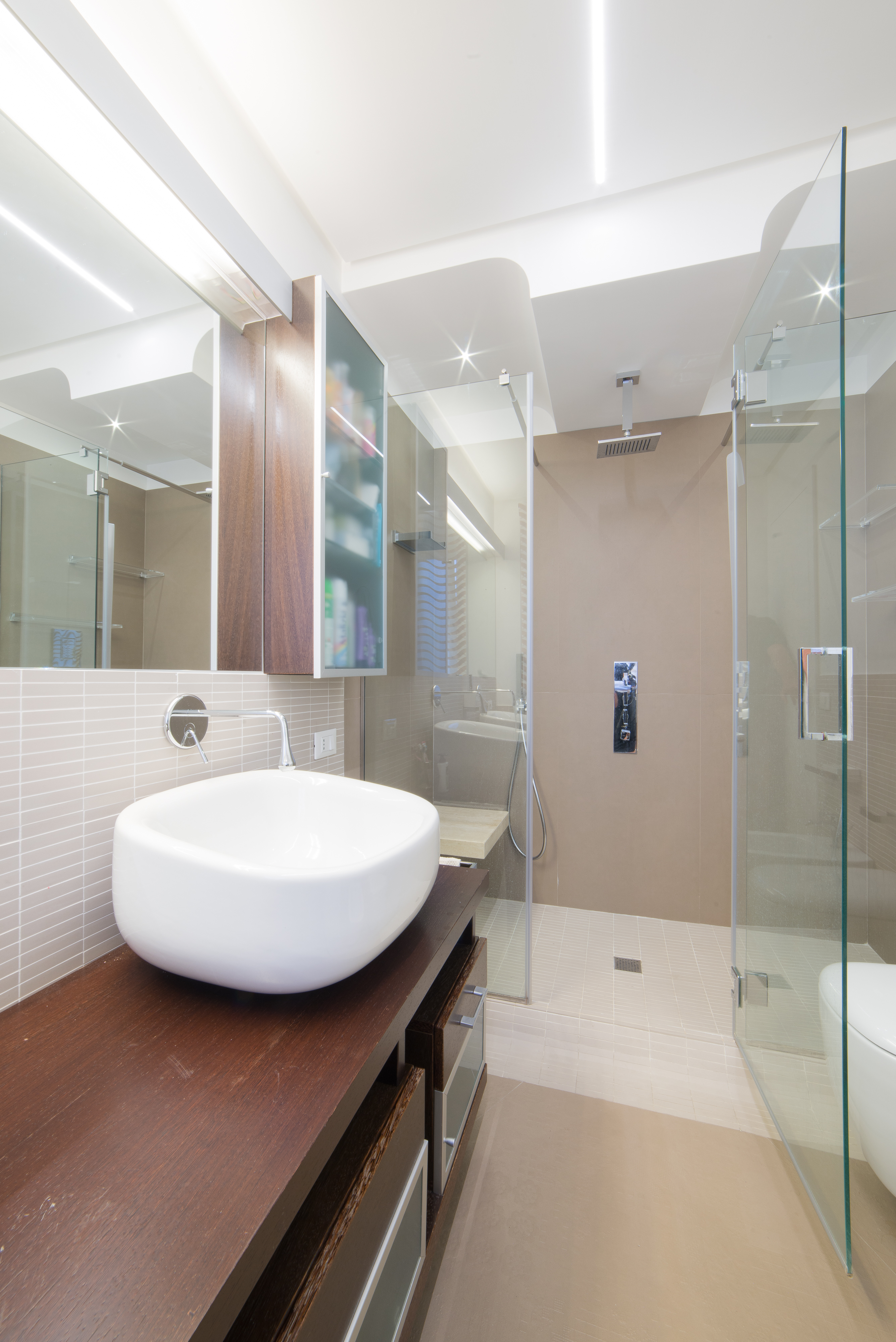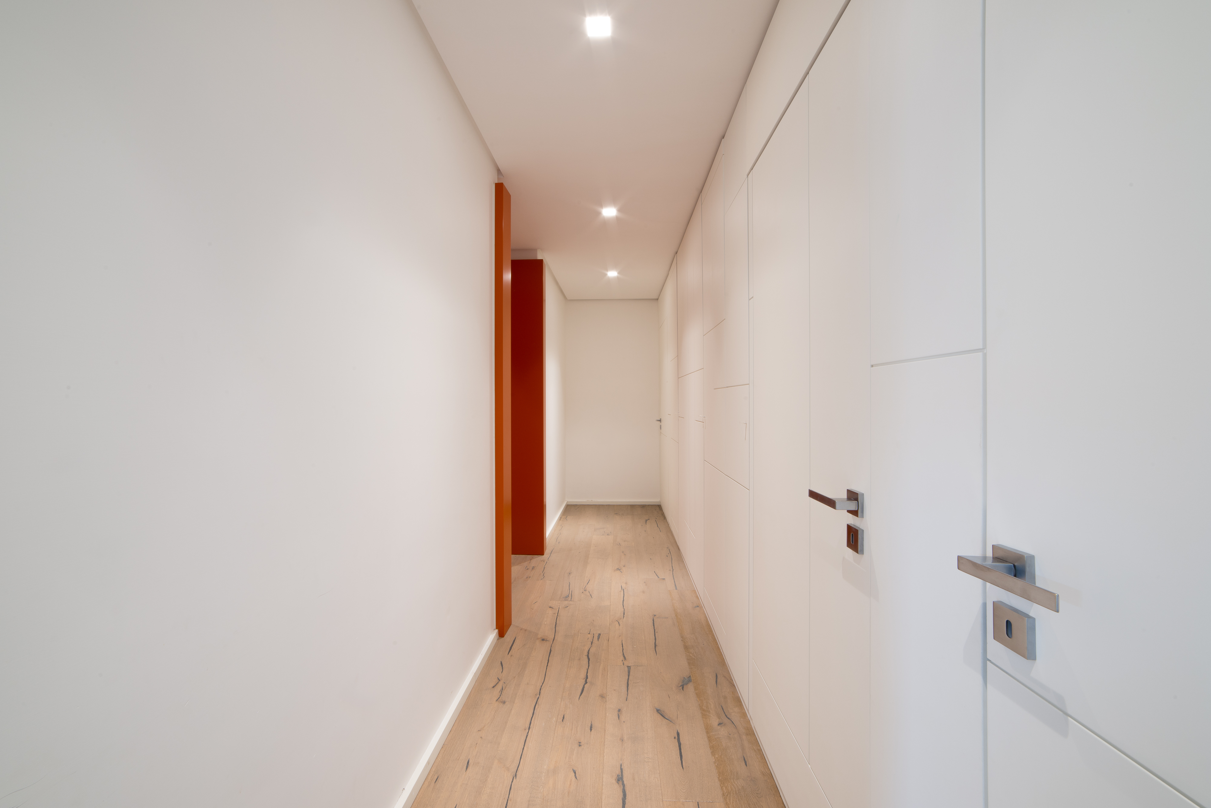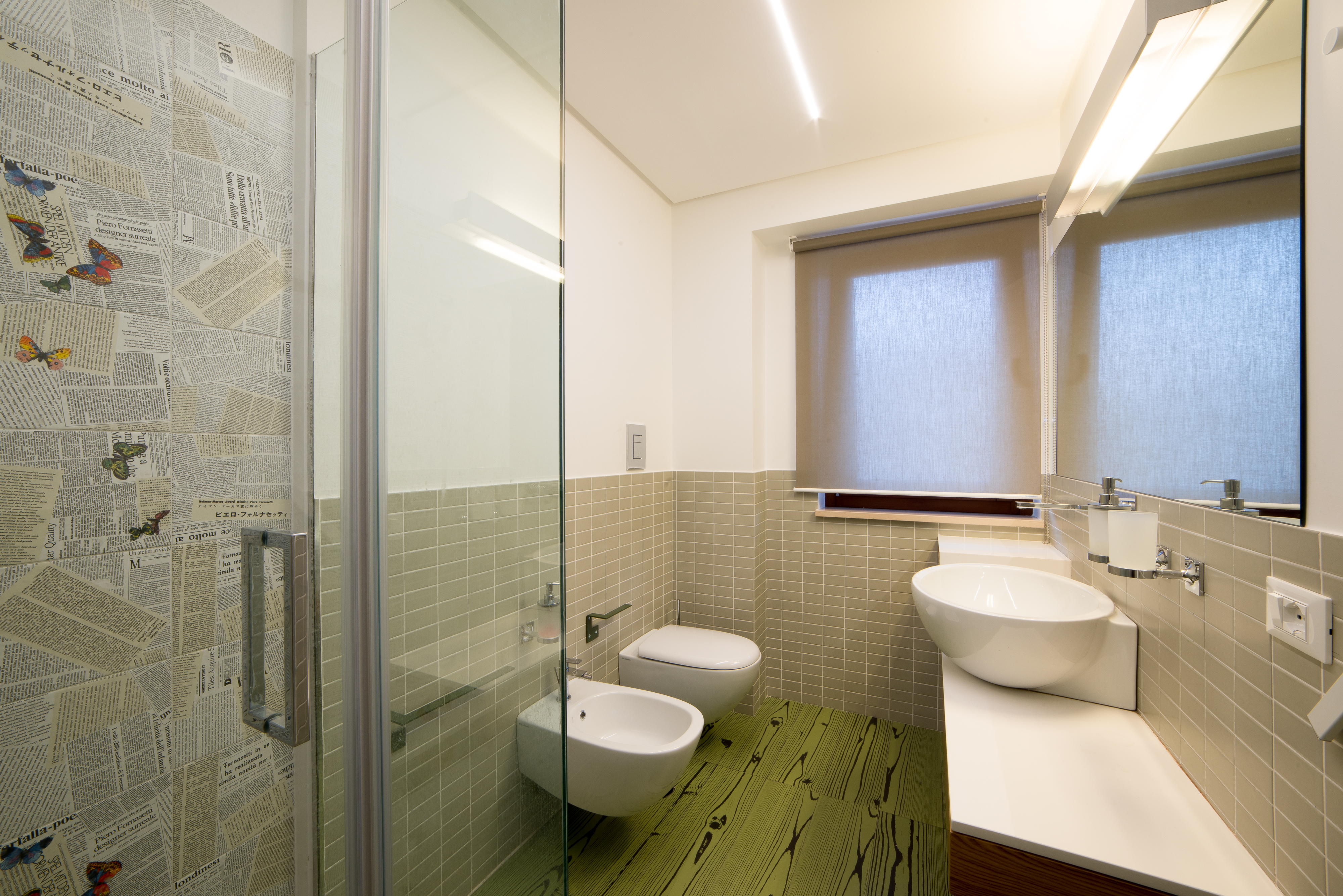 Si tratta di una scala di metallo completamente rivestita in resina, i vetri laterali enfatizzano la luce naturale e nella parte inferiore sono integrate le luci trasformandola in una vera e propria lampada. Il passaggio alla zona notte è contraddistinto da delle bellissime boiserie in legno. Le stanze da bagno sono personalizzate con rivestimenti Mutina.