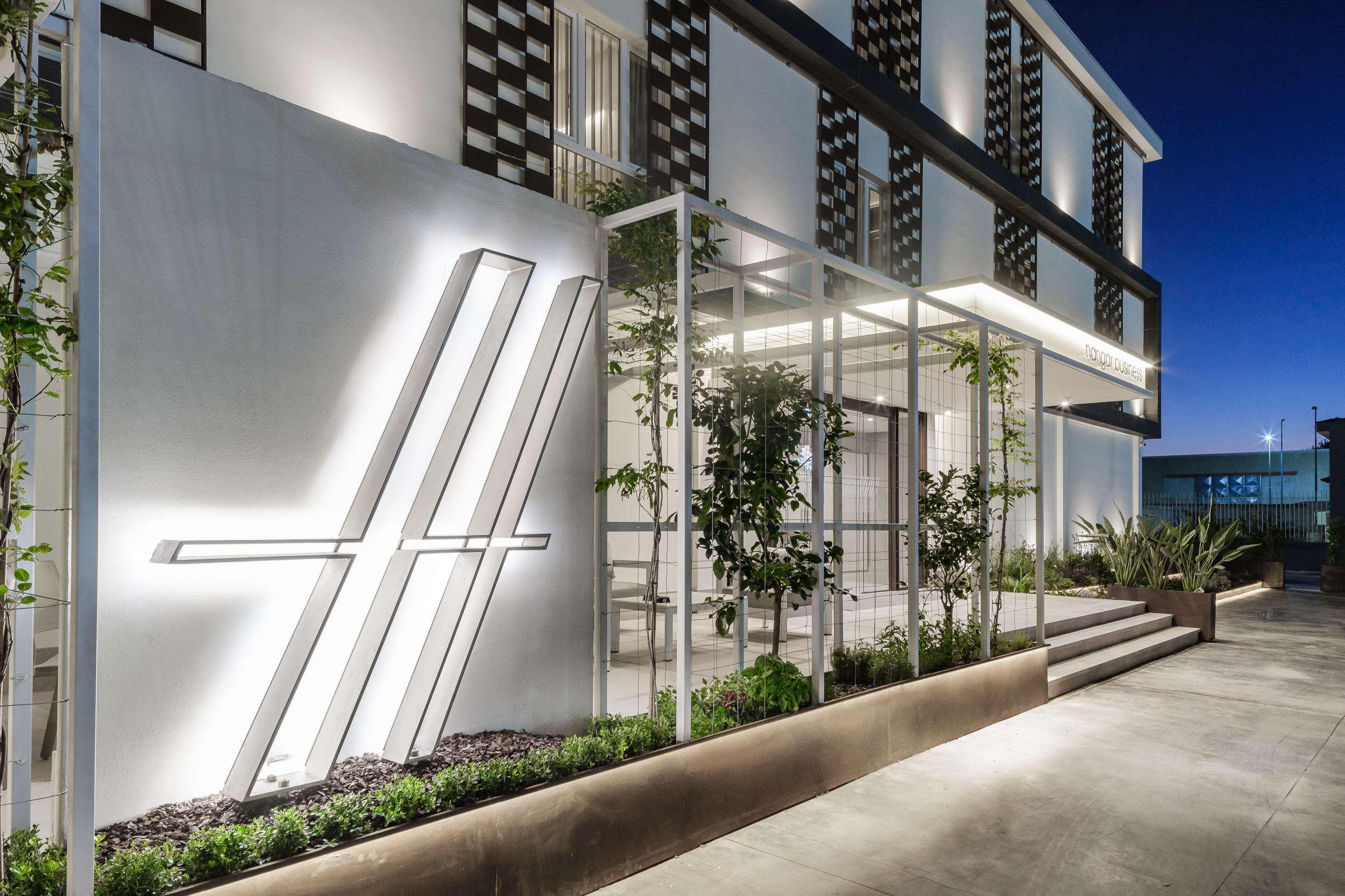 Il disegno della facciata prevede una serie di elementi traforati scorrevoli posti avanti le finestre così come il rivestimento del volume scala ad angolo che, grazie alla retroilluminazione, richiama ad una facciata di pieni e vuoti tipica degli opifici industriali otto-novecenteschi realizzati interamente in mattoni.