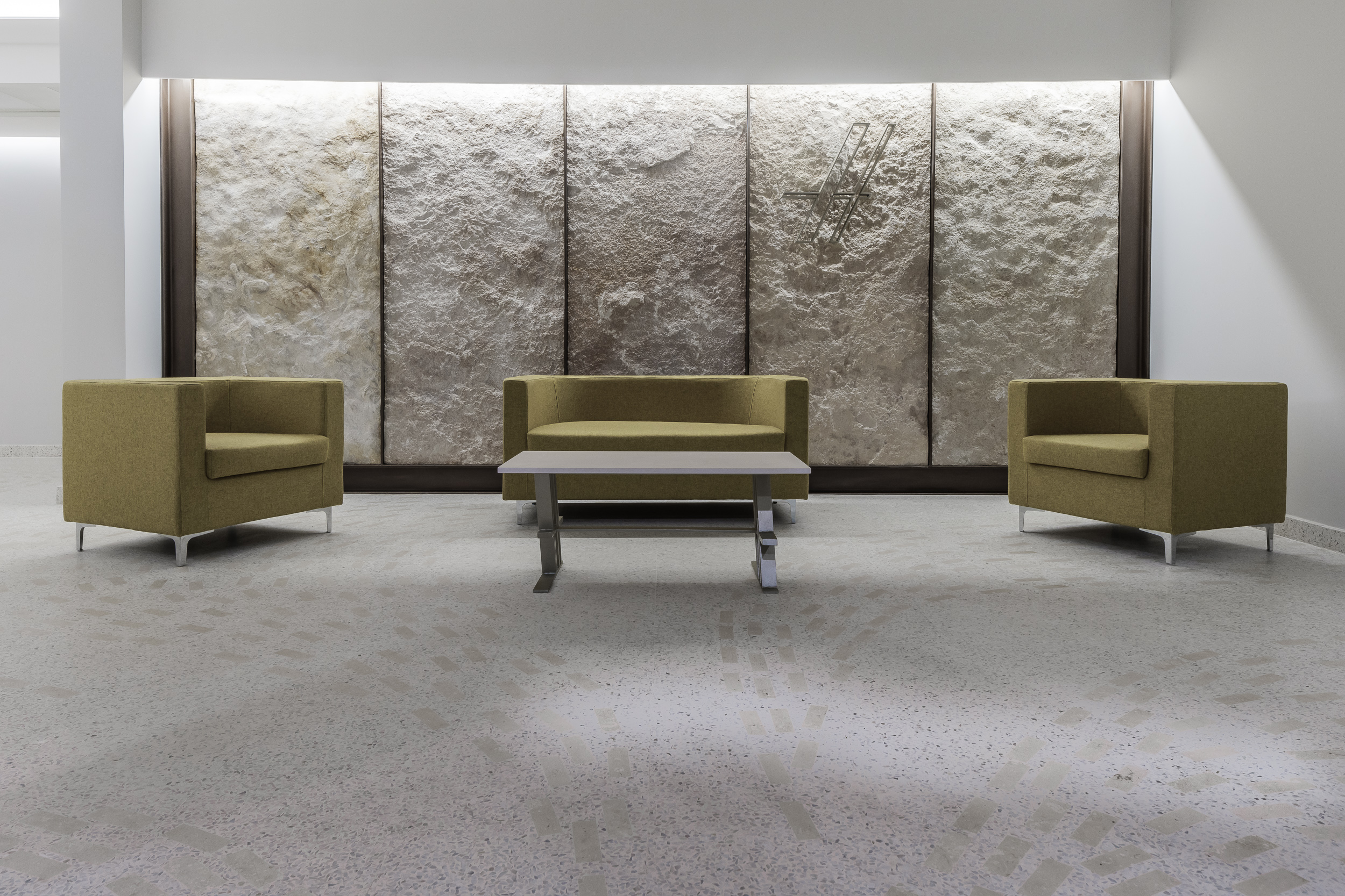 Abbiamo utilizzato una graniglia (ndr. un materiale composto da piccoli frammenti di varie tipologie di materiale) in cui abbiamo letteralmente annegato tozzetti di marmo, posizionati in modo da creare, secondo un percorso prestabilito, diversi flussi che dell’ingresso conducono ai vari ambienti del piano: si viene accompagnati così alla reception, all’area attesa e alla breakfast room.