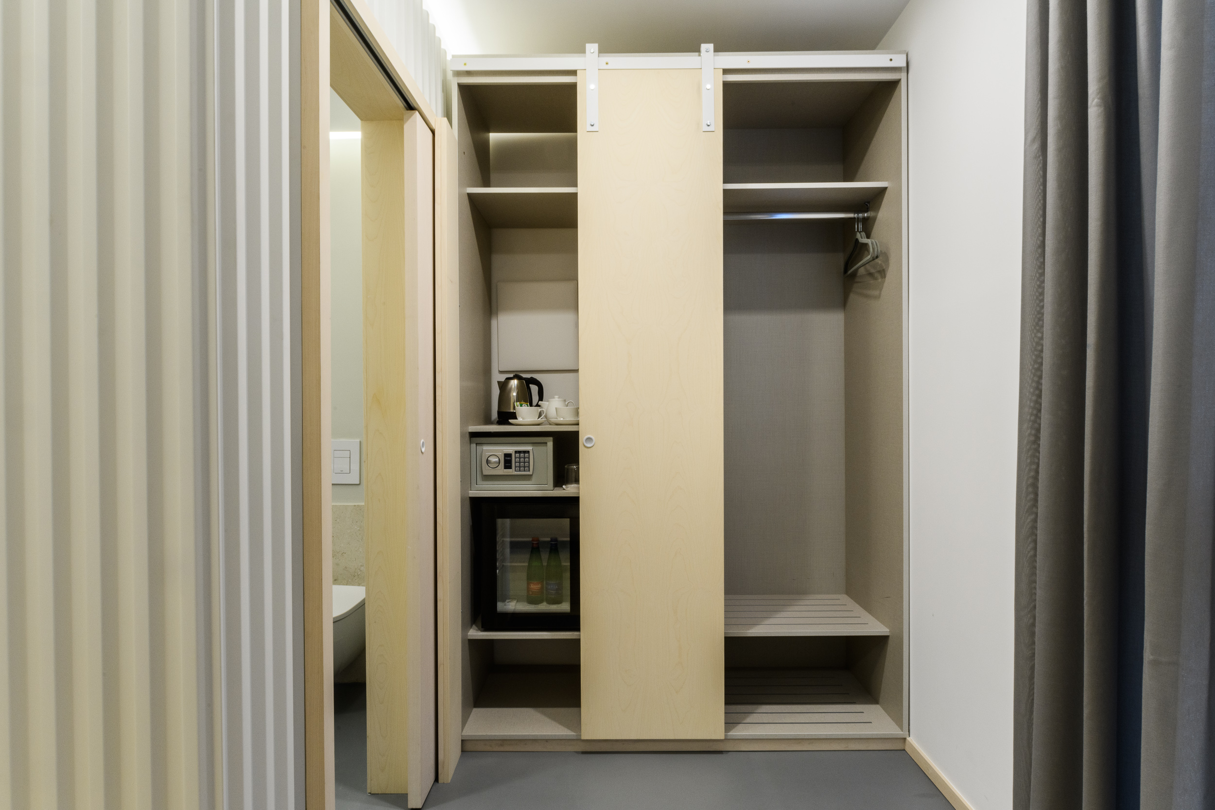 Anche le pareti interne delle camere sono realizzate con elementi in lamiera grecata che è un materiale solitamente utilizzato nell’edilizia per realizzare solai.