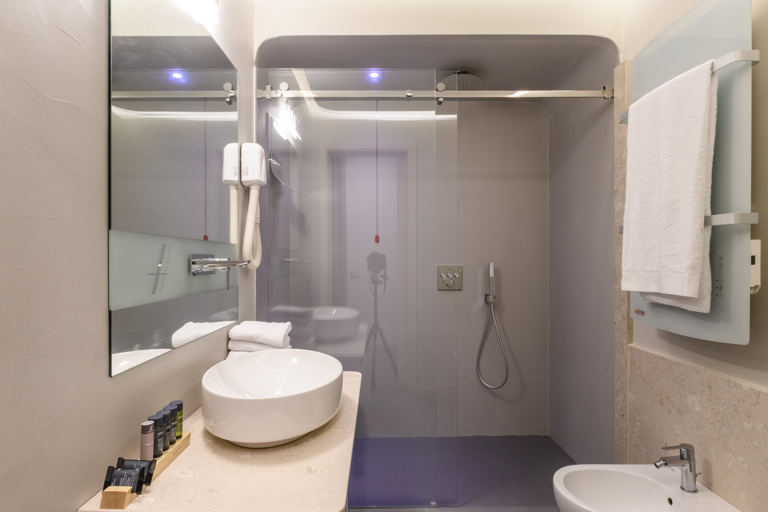 Per quanto concerne i pavimenti e i rivestimenti, laddove non è stata prevista la resina, per rivestire le pareti dei bagni della zona spa e della sala colazione sono stati scelti i rivestimenti Mutina e in particolare le collezioni Diarama e Tierras; il mosaico Appiani invece è stato scelto per rivestire interamente il bagno turco. Anche le strategiche pareti della zona colazione, per cui avevamo la necessità di mascherare la vicina area dedicata ai bagni, sono state realizzate utilizzando i forati CELOSIA di Mutina che creano un effetto rete diaframma.