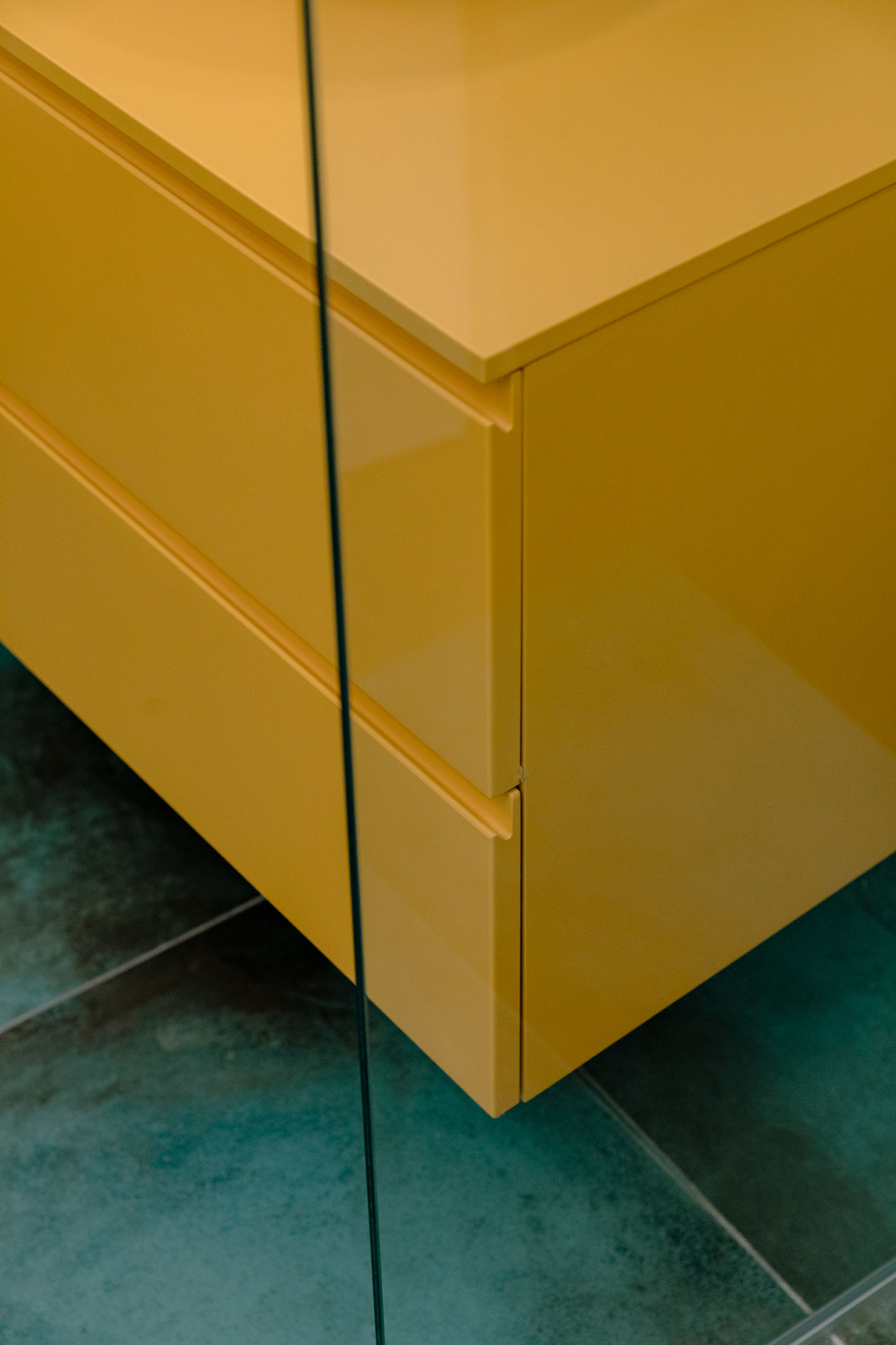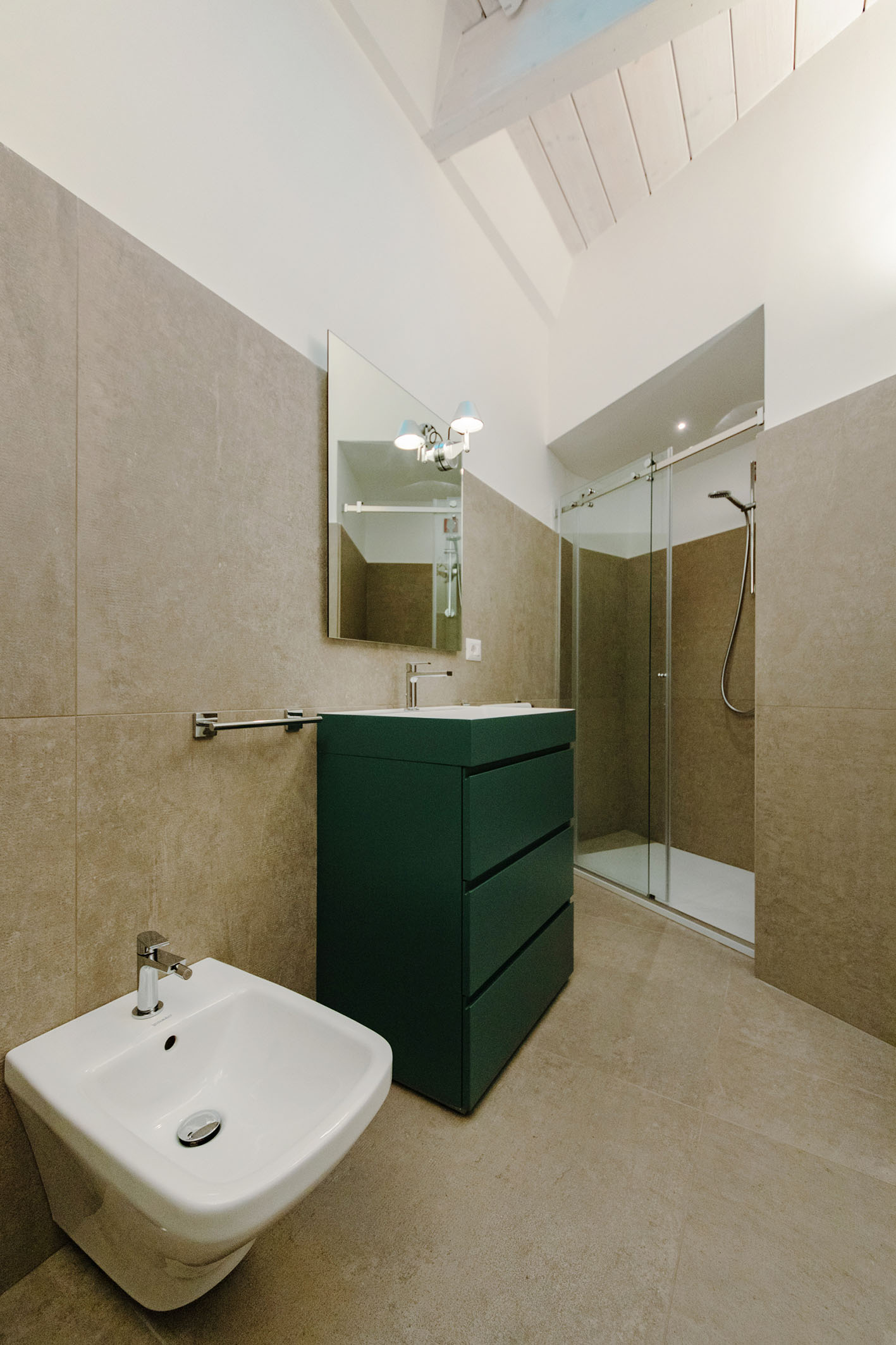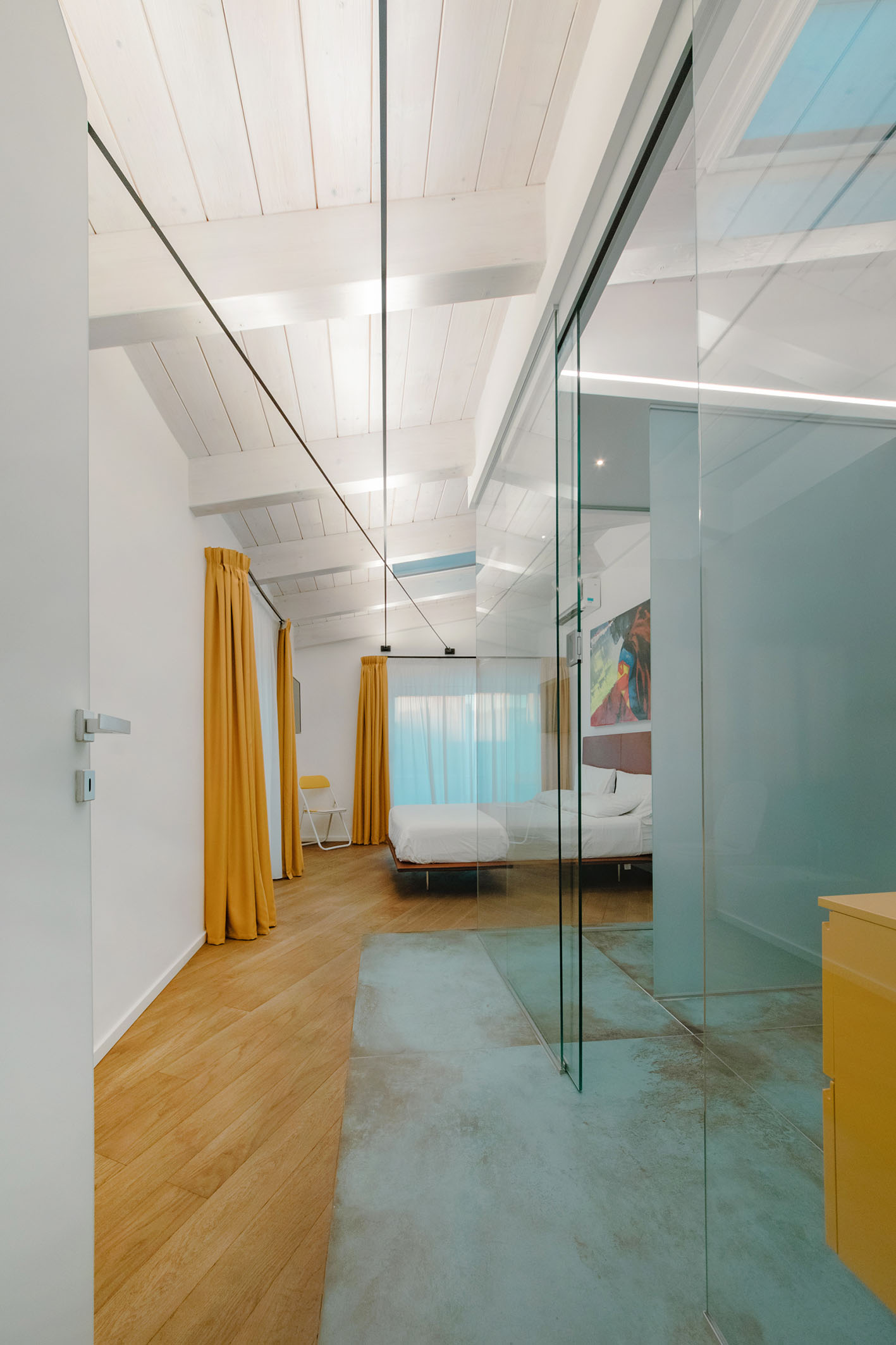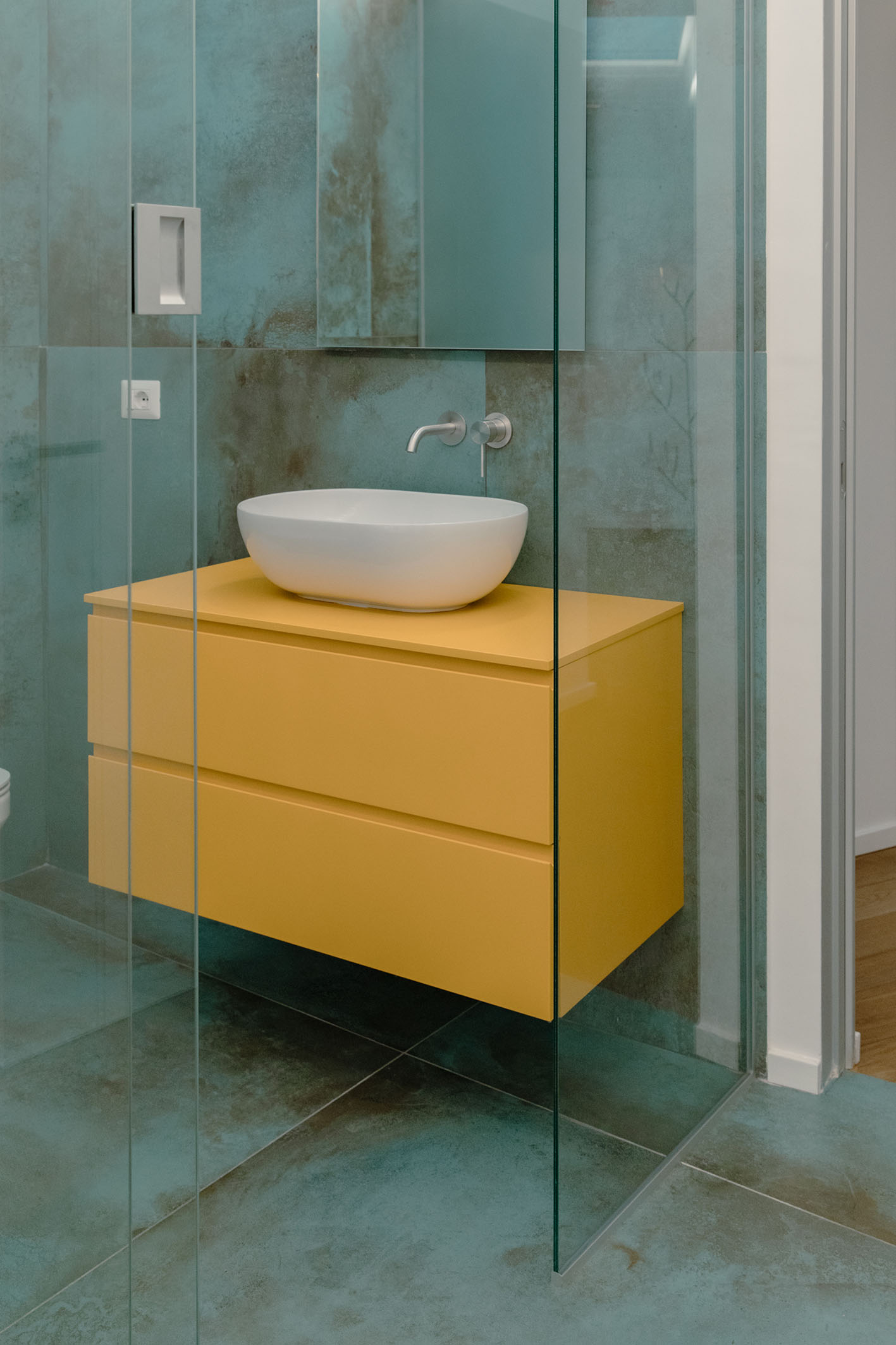 Le singole stanze da bagno sono esaltate sia dai materiali che dalla loro ubicazione nella composizione architettonica del progetto. La peculiarità evidente la si trova nella camera così detta padronale, questa contiene al suo interno una box di vetro nel quale è posizionato l’ambiente bagno a diretto ed esclusivo servizio della camera letto. Attraverso tali trasparenze, prevalgono i colori dei materiali, in primo luogo il verde menta della pavimentazione e del rivestimento, spezzato dal giallo degli arredi, il tutto sequenziale a quinte vetrate di separazione tra la doccia, i servizi igienici e la zona lavabo. In contrapposizione il bagno a servizio delle altre funzioni della casa, in questo caso si è scelto di rivestire e pavimentare l’intero ambiente con un rivestimento molto materico con effetto cemento rullato, mentre in continuità con l’altro bagno, per mantenere una linearità di cromie, gli arredi diventano di colore verde petrolio. Il tutto concluso da pavimenti in legno naturale a base rovere.
