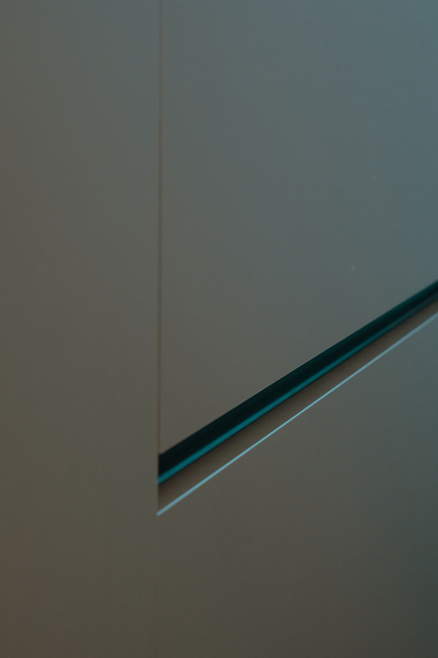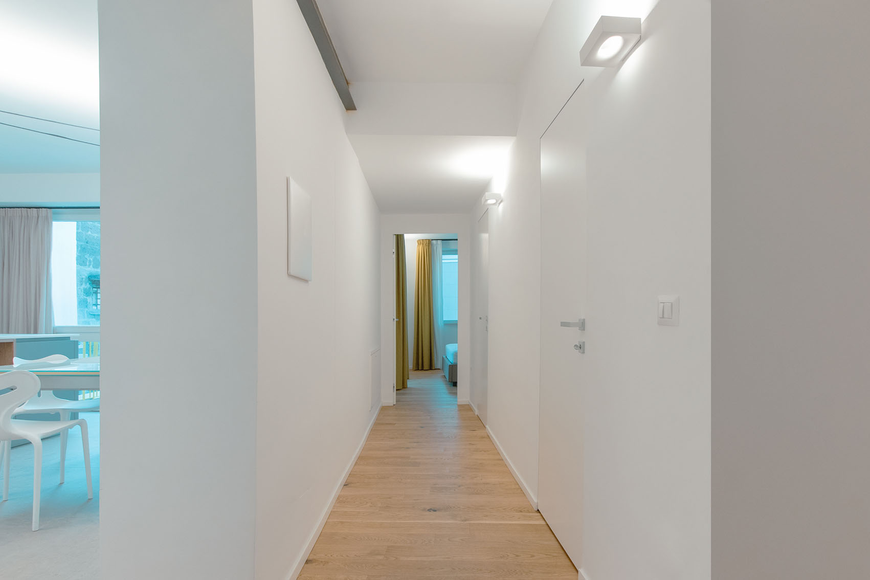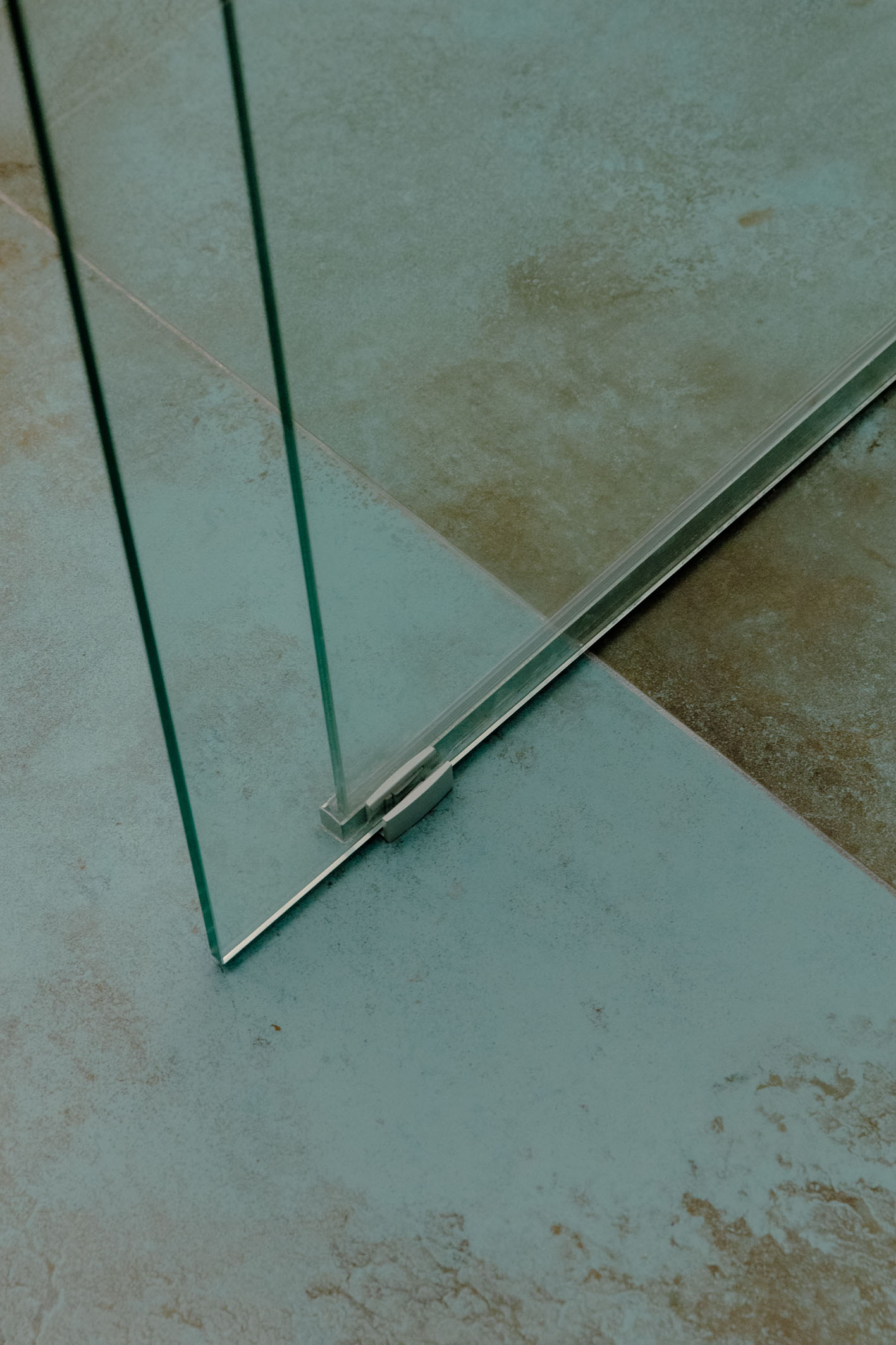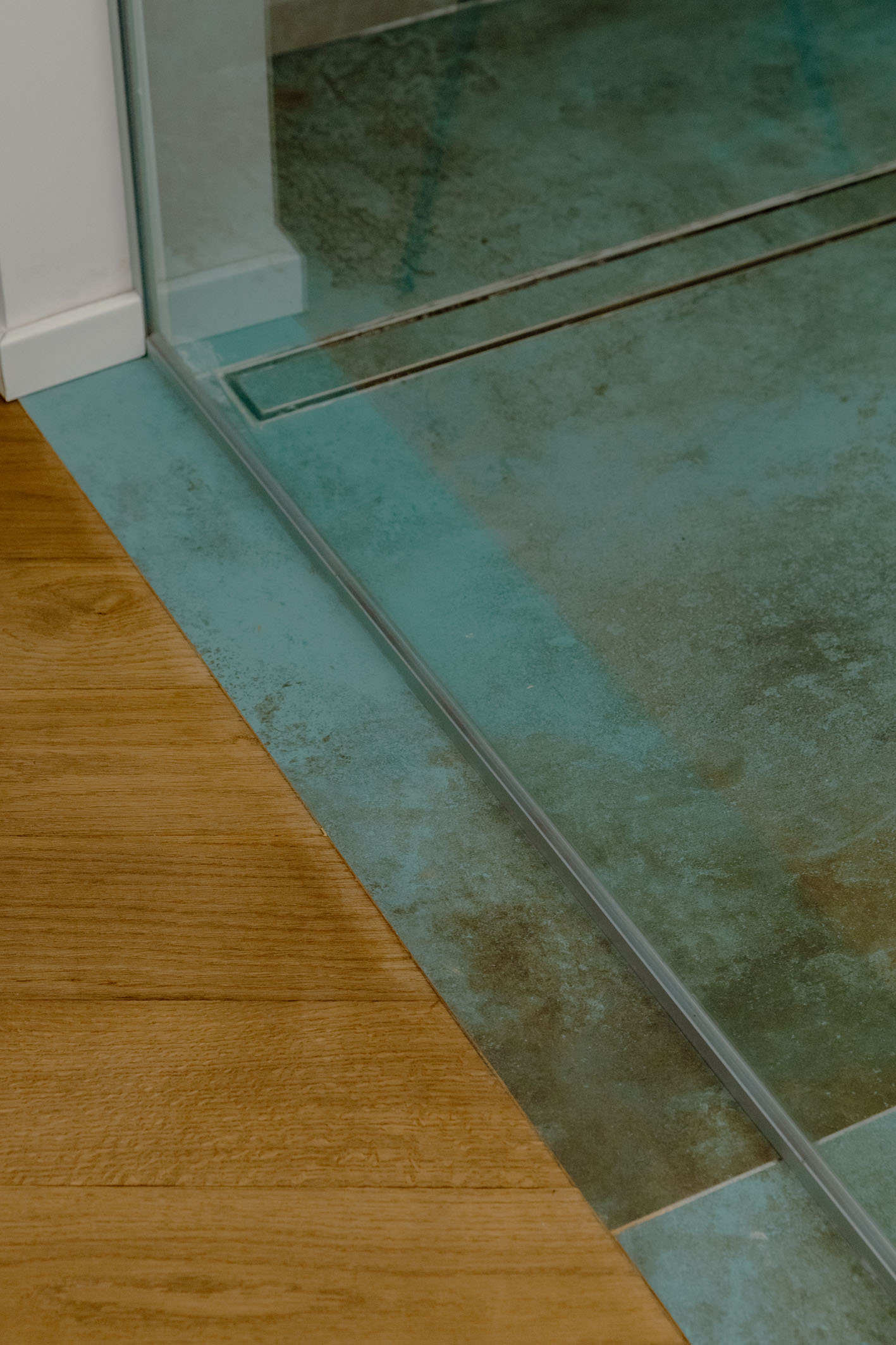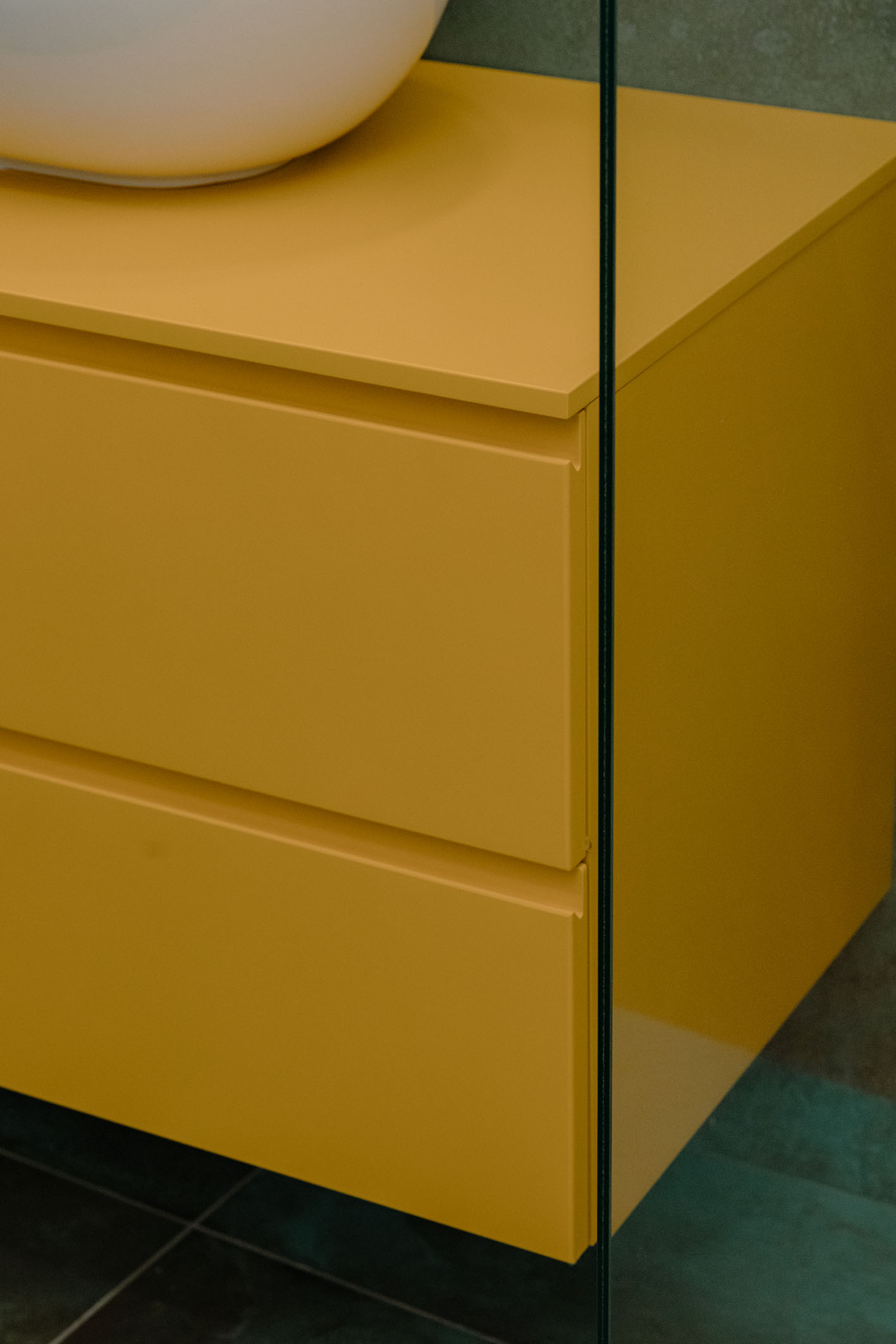 Le singole stanze da bagno sono esaltate sia dai materiali che dalla loro ubicazione nella composizione architettonica del progetto. La peculiarità evidente la si trova nella camera così detta padronale, questa contiene al suo interno una box di vetro nel quale è posizionato l’ambiente bagno a diretto ed esclusivo servizio della camera letto. Attraverso tali trasparenze, prevalgono i colori dei materiali, in primo luogo il verde menta della pavimentazione e del rivestimento, spezzato dal giallo degli arredi, il tutto sequenziale a quinte vetrate di separazione tra la doccia, i servizi igienici e la zona lavabo. In contrapposizione il bagno a servizio delle altre funzioni della casa, in questo caso si è scelto di rivestire e pavimentare l’intero ambiente con un rivestimento molto materico con effetto cemento rullato, mentre in continuità con l’altro bagno, per mantenere una linearità di cromie, gli arredi diventano di colore verde petrolio. Il tutto concluso da pavimenti in legno naturale a base rovere.