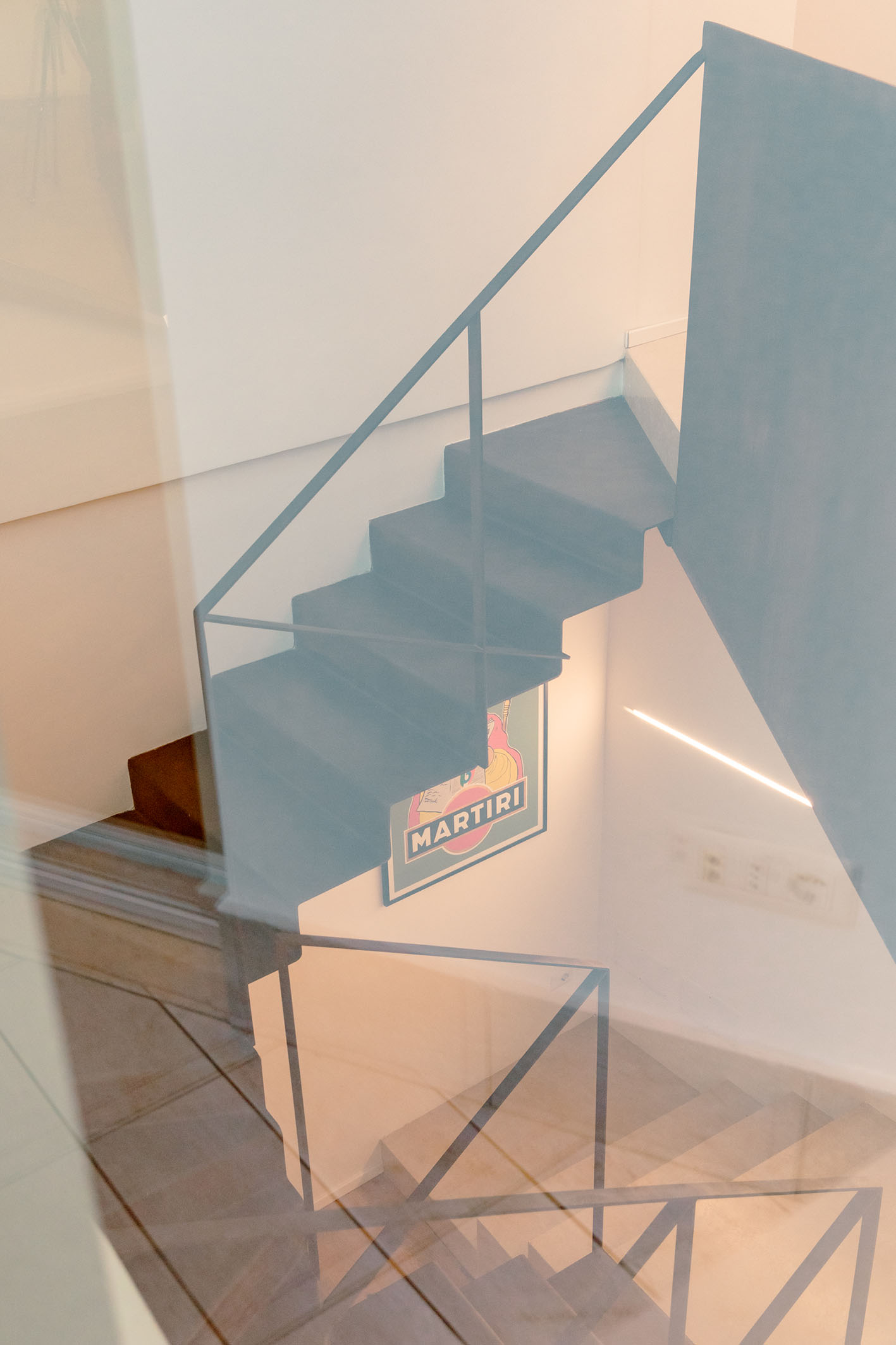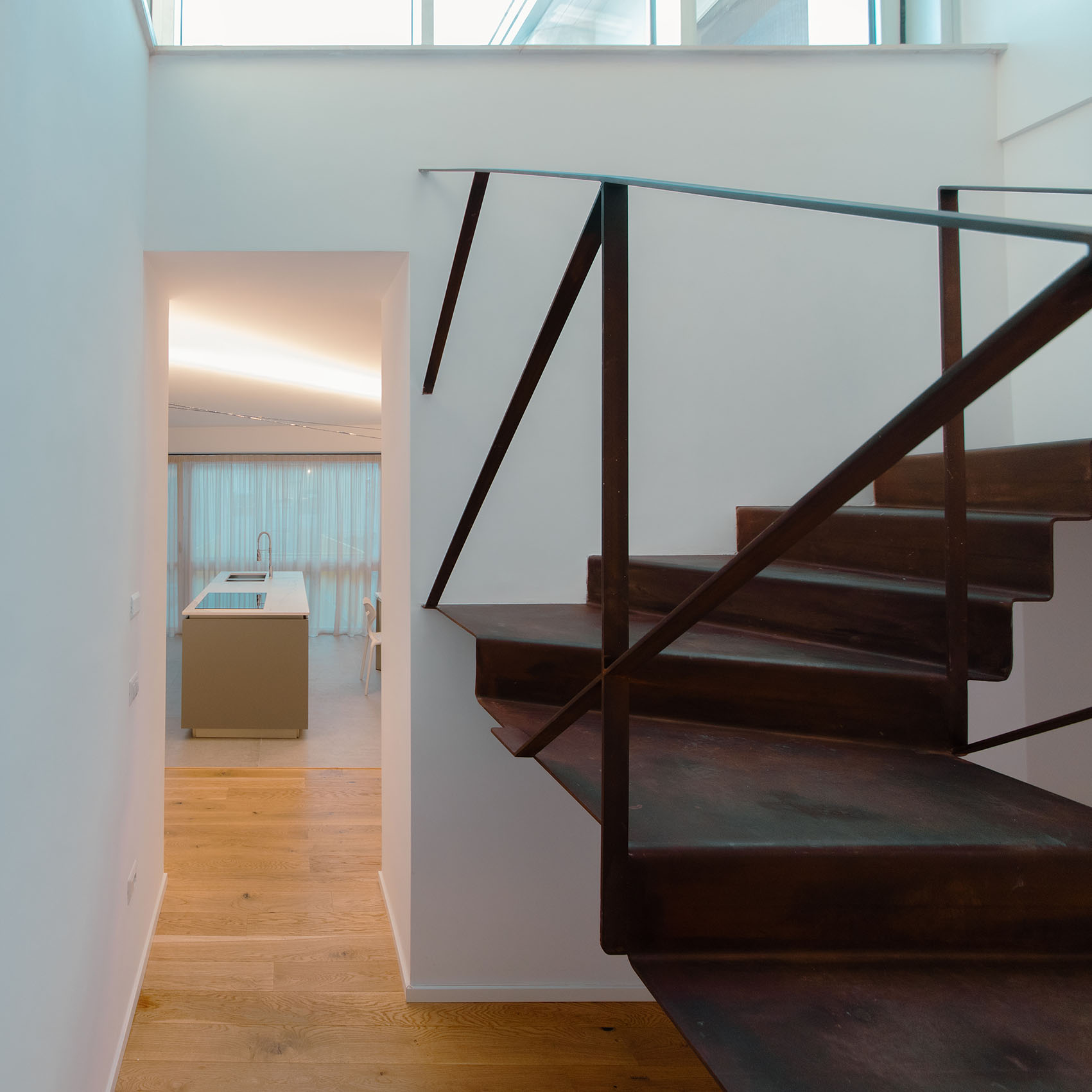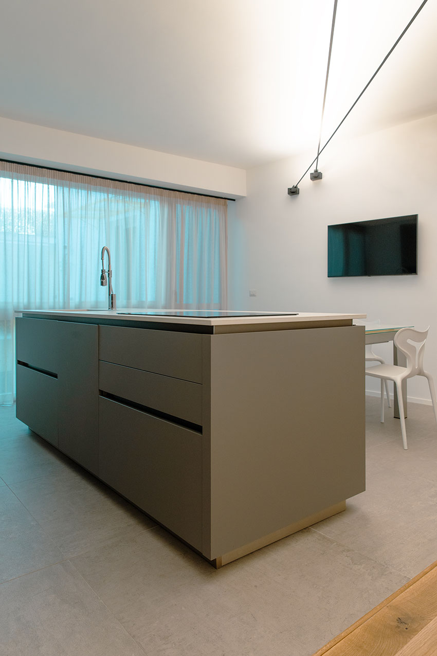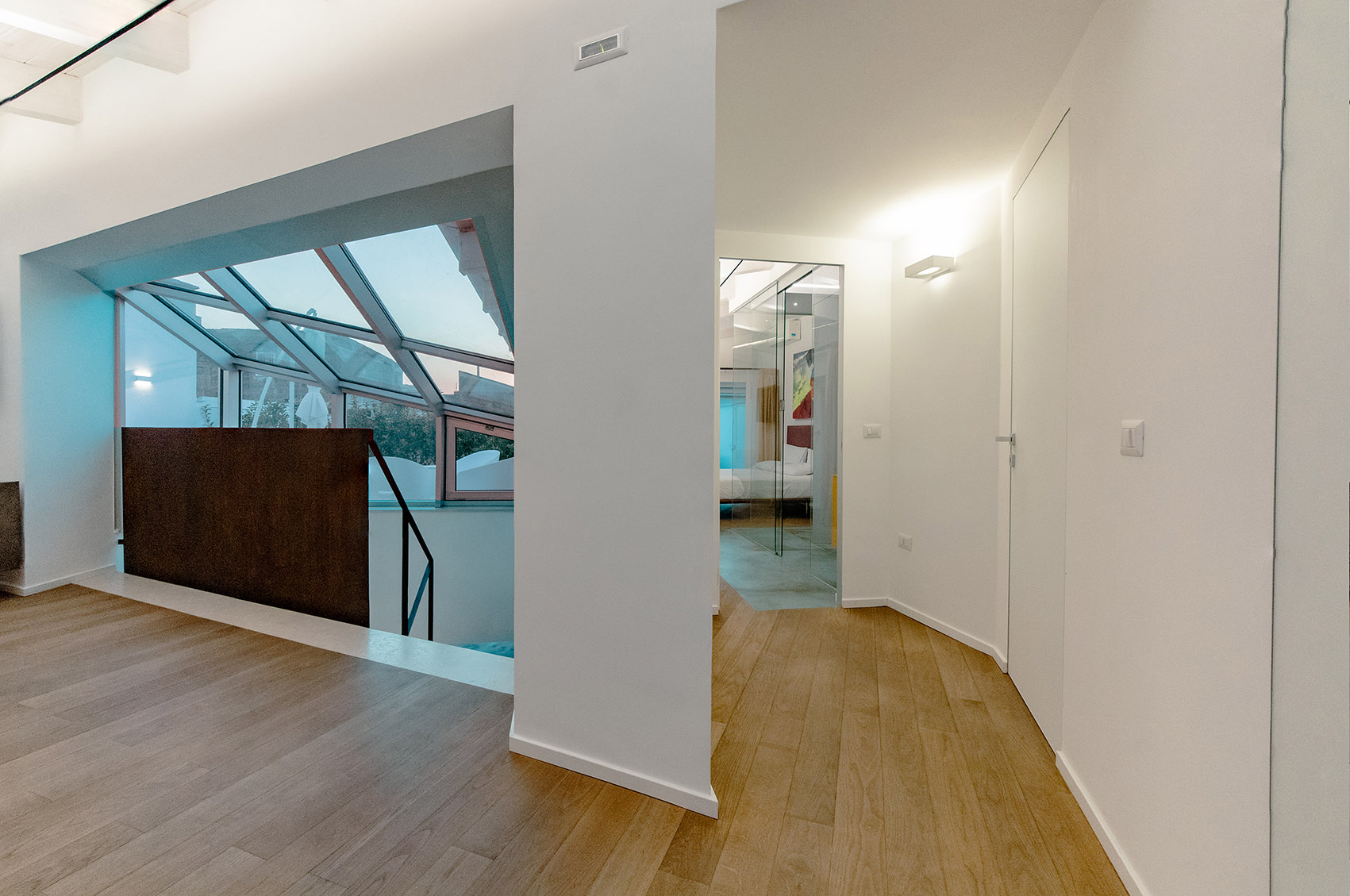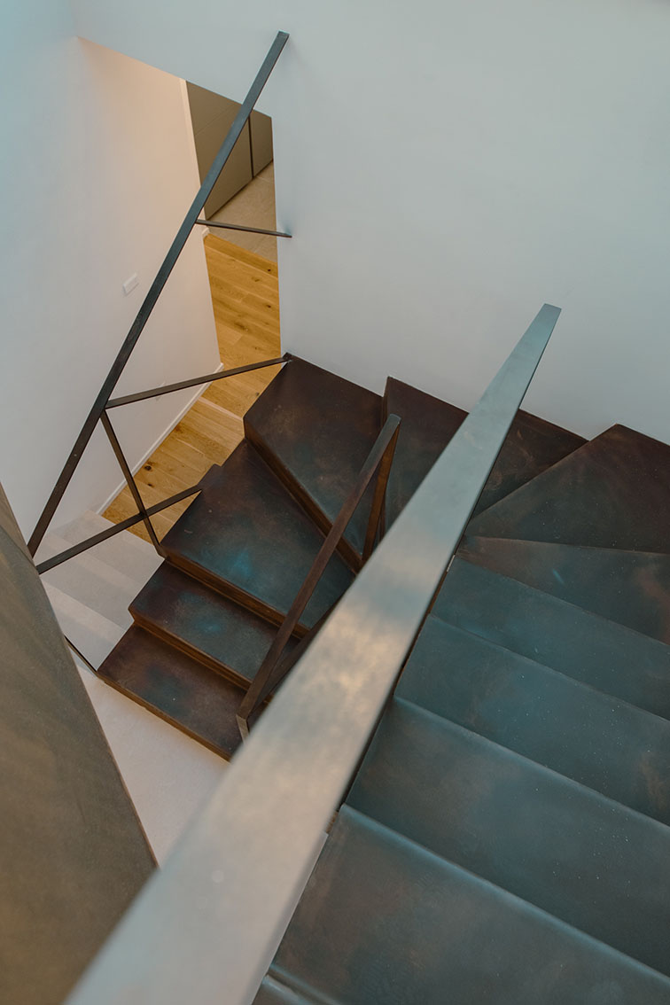 Da queste meditazioni nasce l’idea del progetto di architettura, dapprima utopico immateriale come visione intangibile che si trasferisce attraverso, il gesto, sulla carta prima e poi in corporeo nella mera realizzazione materiale attraverso la costruzione, la “téchne”. Tipologicamente lo spazio residenziale si connette in un sistema duplex, in verticale, mediante una scala immaginata in lamiera piegata in acciaio cor-ten, che si diparte racchiusa in un involucro di vetro. Il vetro incorniciato dai serramenti è il punto focale del progetto, perché elemento che si interpone tra l’esterno e l’interno utilizzando come fattore sensoriale la luce, elemento principale del progetto. Nel livello inferiore sono disposte le funzioni definibili giorno, quali ingresso, cucina che presenta una parete completamente vetrata, ed area ludica. Al livello superiore l’area notte e la zona conviviale, connesse con un ampio terrazzo dove vivere a contatto con l’esterno. L’atmosfera conseguita è una sensazione di avvolgente tepore e senso di certezza dato dalle scelte cromatiche e materiche.