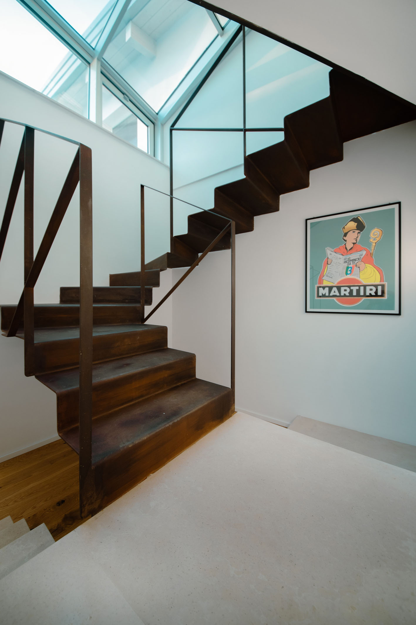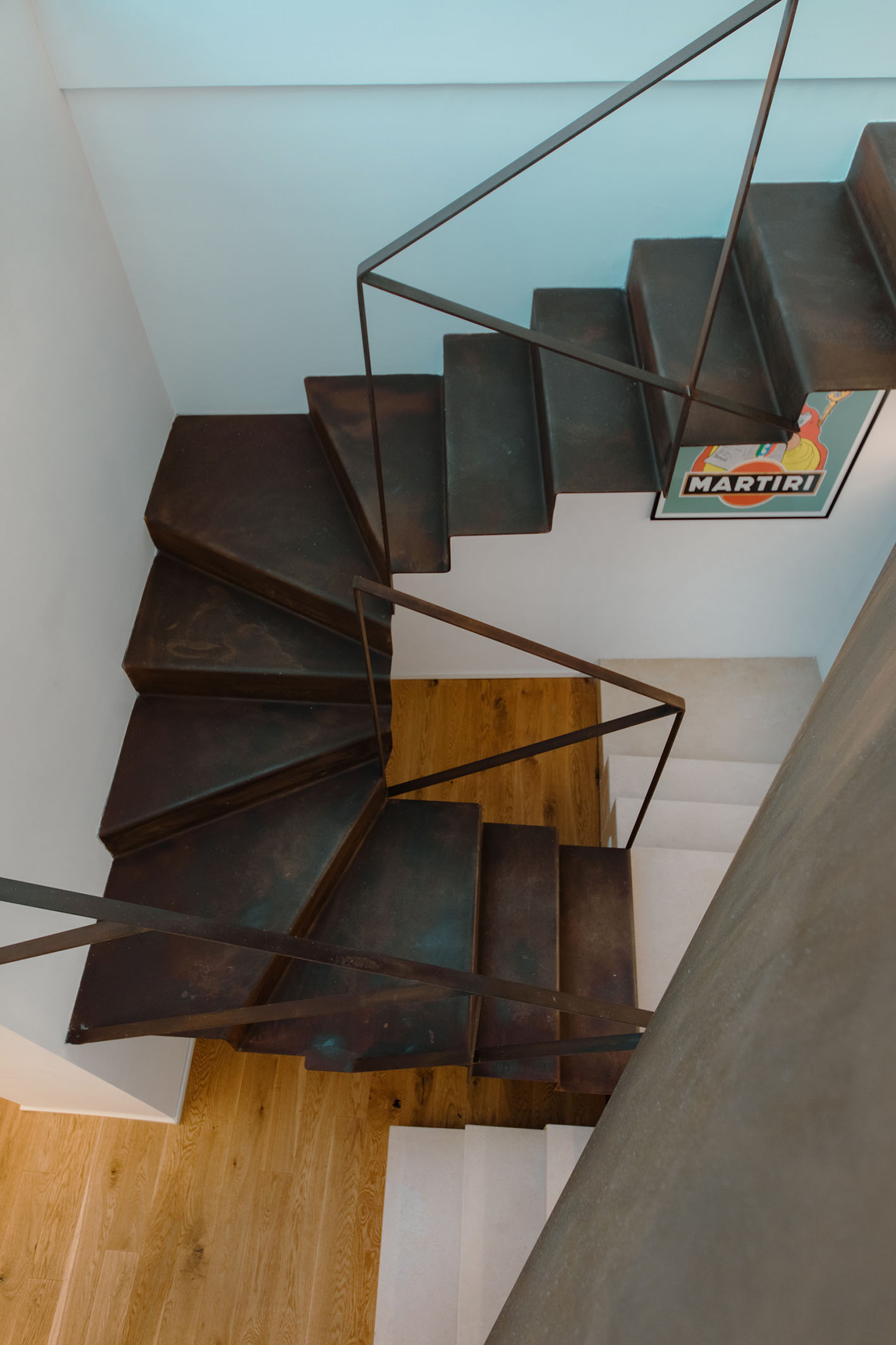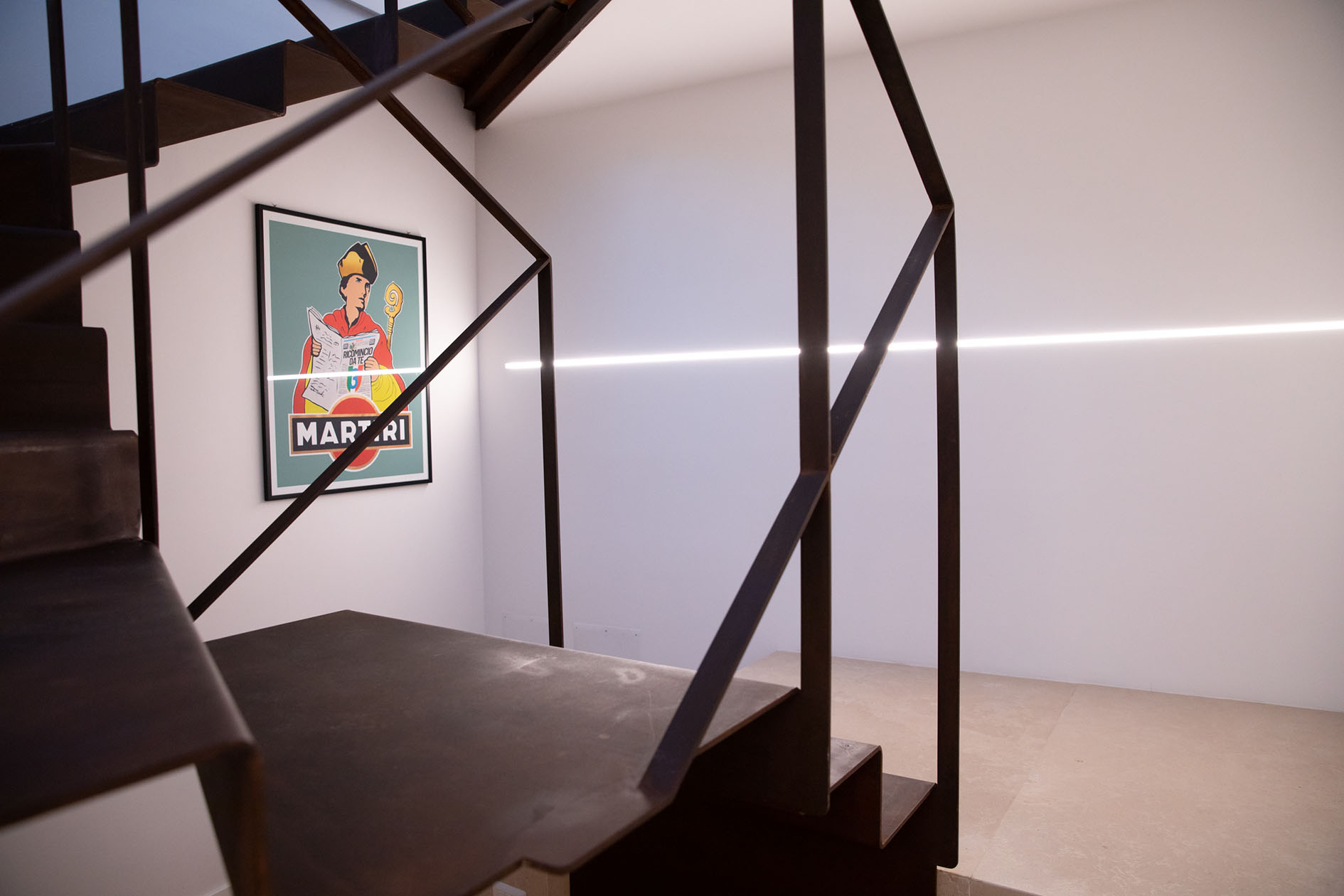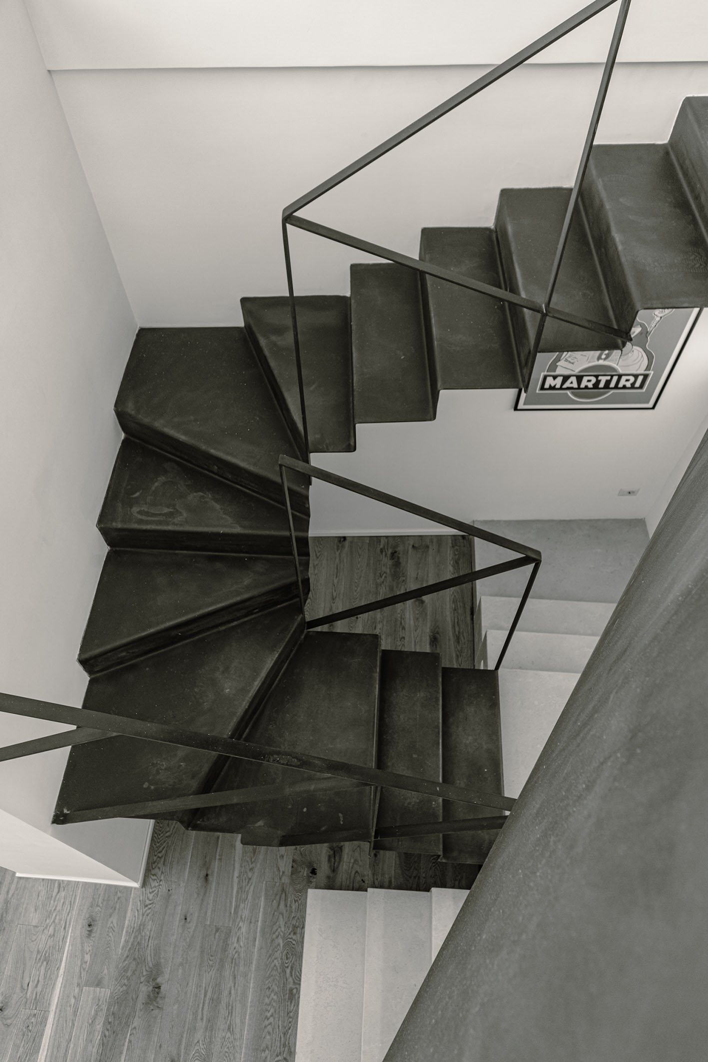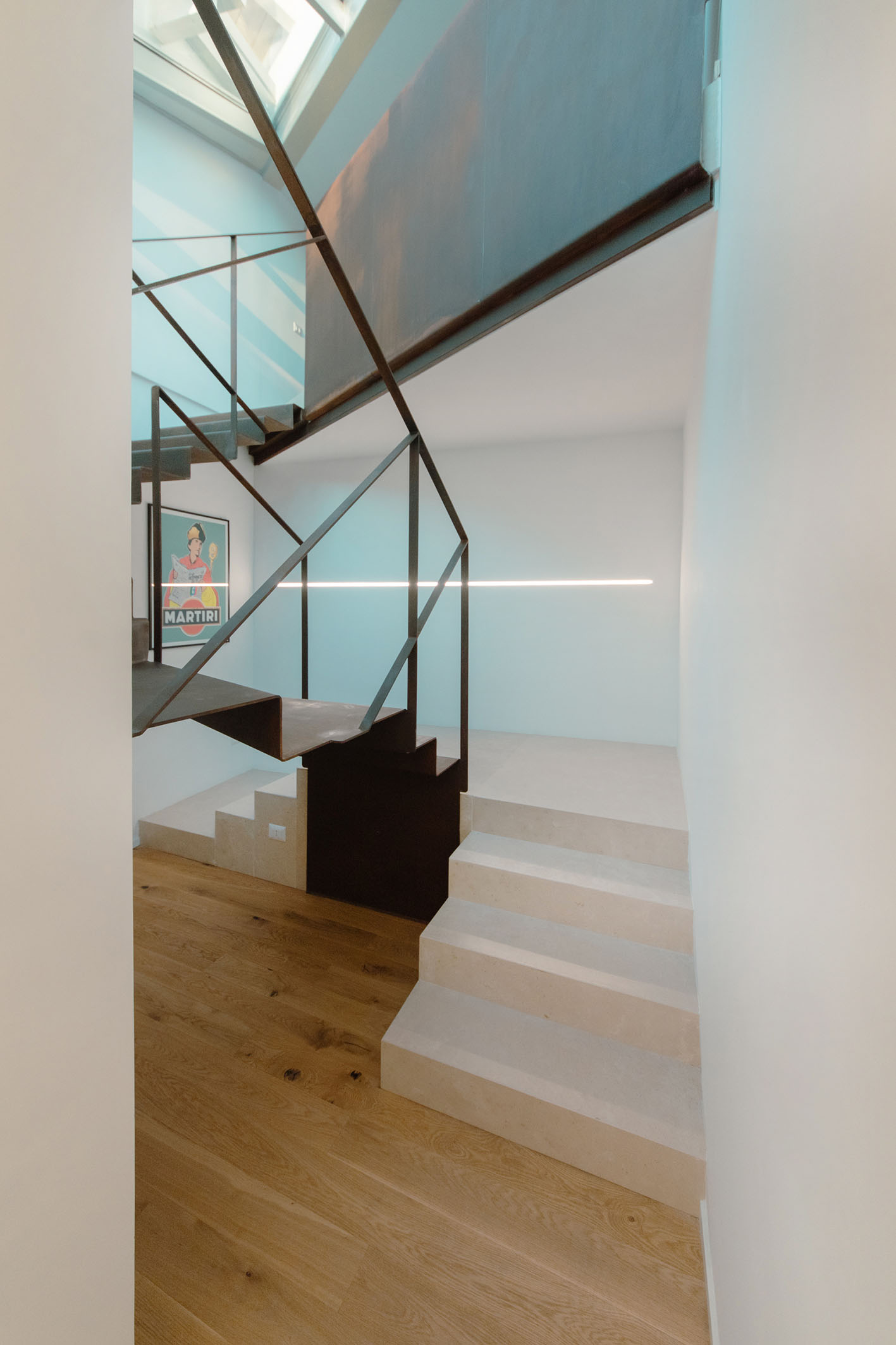 Da queste meditazioni nasce l’idea del progetto di architettura, dapprima utopico immateriale come visione intangibile che si trasferisce attraverso, il gesto, sulla carta prima e poi in corporeo nella mera realizzazione materiale attraverso la costruzione, la “téchne”. Tipologicamente lo spazio residenziale si connette in un sistema duplex, in verticale, mediante una scala immaginata in lamiera piegata in acciaio cor-ten, che si diparte racchiusa in un involucro di vetro. Il vetro incorniciato dai serramenti è il punto focale del progetto, perché elemento che si interpone tra l’esterno e l’interno utilizzando come fattore sensoriale la luce, elemento principale del progetto. Nel livello inferiore sono disposte le funzioni definibili giorno, quali ingresso, cucina che presenta una parete completamente vetrata, ed area ludica. Al livello superiore l’area notte e la zona conviviale, connesse con un ampio terrazzo dove vivere a contatto con l’esterno. L’atmosfera conseguita è una sensazione di avvolgente tepore e senso di certezza dato dalle scelte cromatiche e materiche.