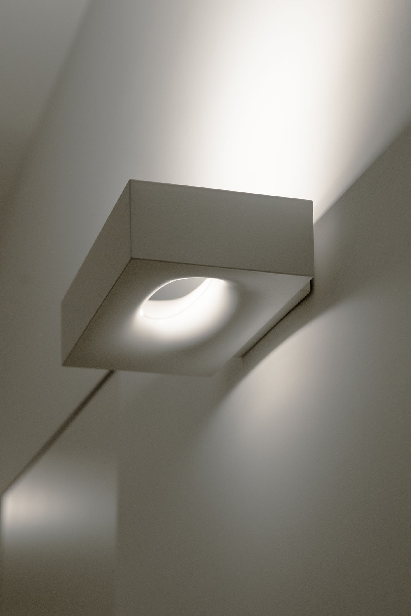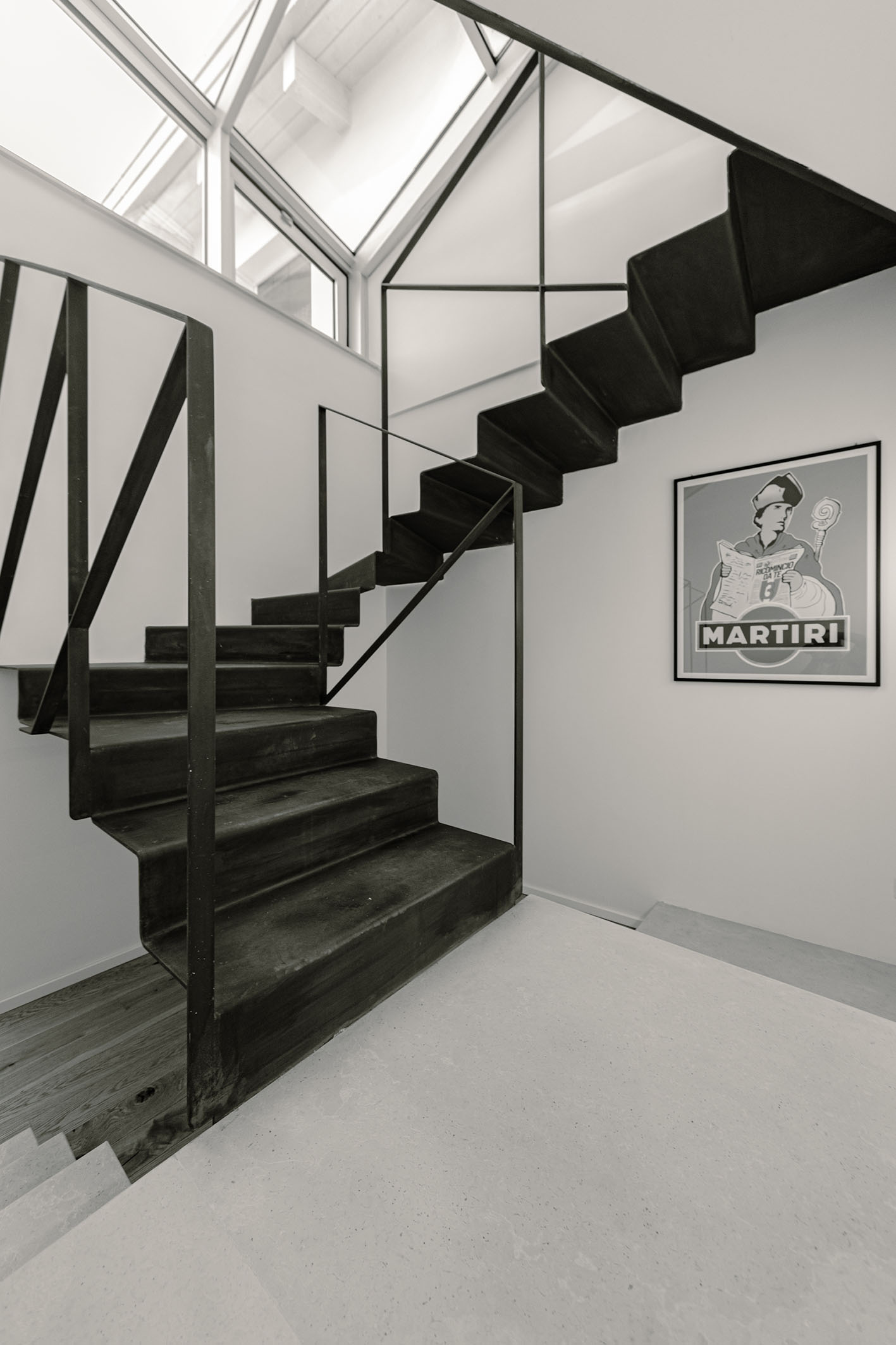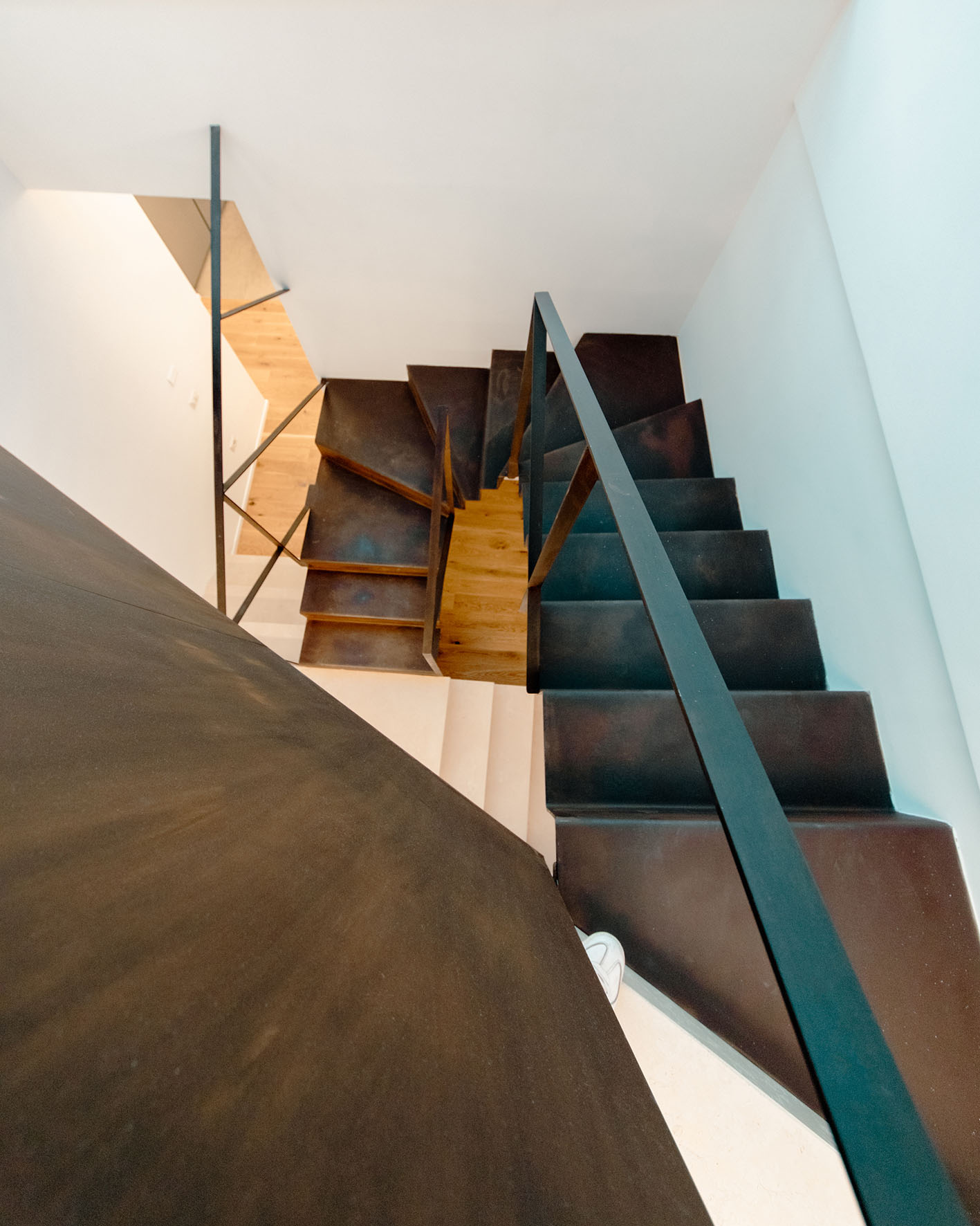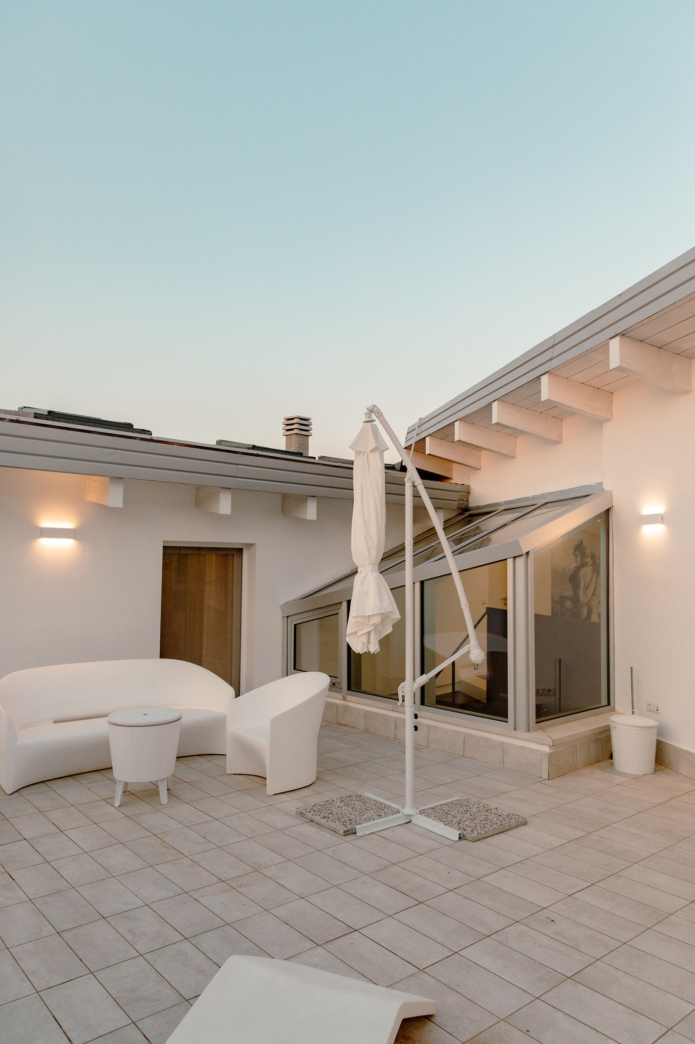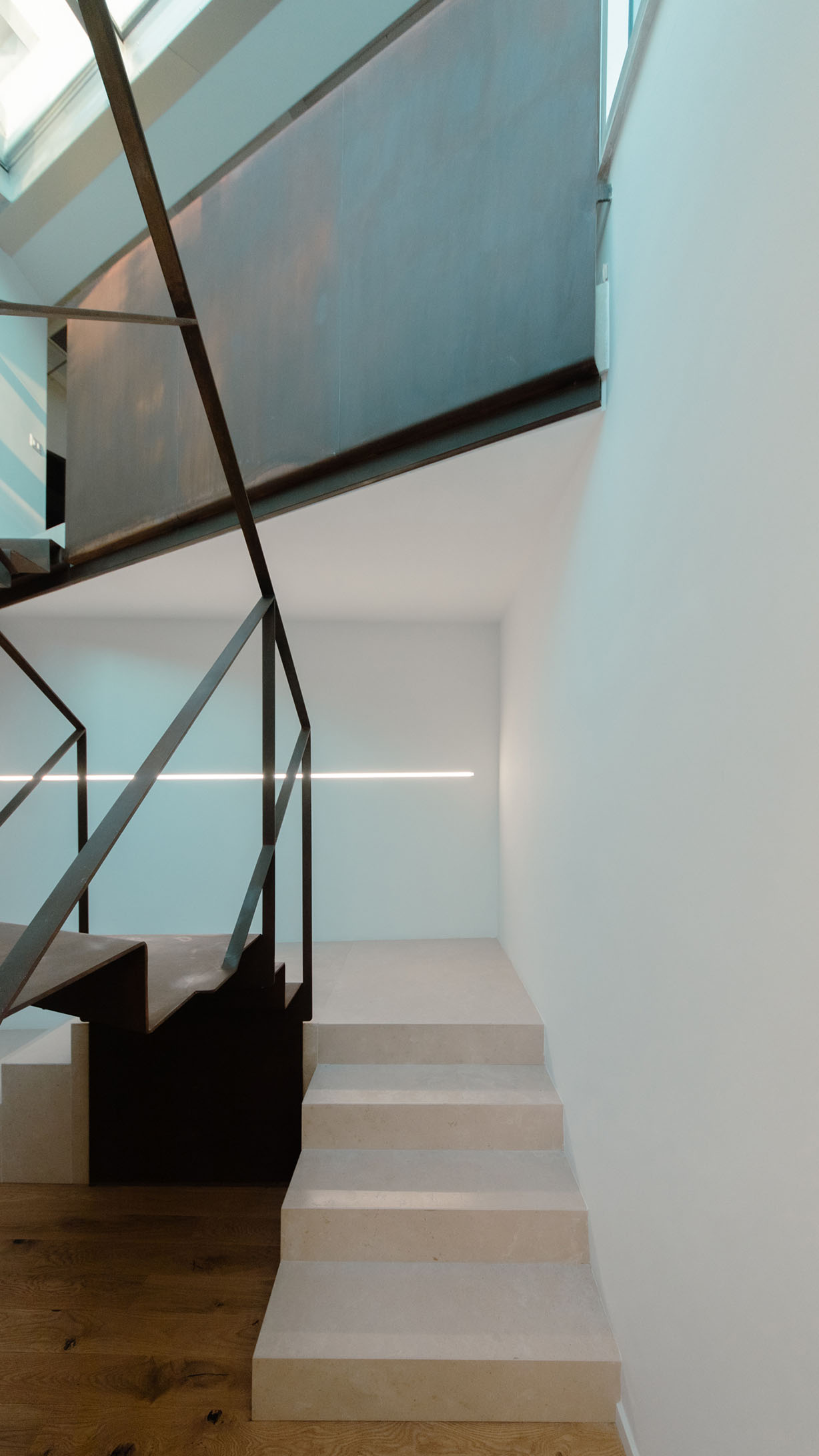 Da queste meditazioni nasce l’idea del progetto di architettura, dapprima utopico immateriale come visione intangibile che si trasferisce attraverso, il gesto, sulla carta prima e poi in corporeo nella mera realizzazione materiale attraverso la costruzione, la “téchne”. Tipologicamente lo spazio residenziale si connette in un sistema duplex, in verticale, mediante una scala immaginata in lamiera piegata in acciaio cor-ten, che si diparte racchiusa in un involucro di vetro. Il vetro incorniciato dai serramenti è il punto focale del progetto, perché elemento che si interpone tra l’esterno e l’interno utilizzando come fattore sensoriale la luce, elemento principale del progetto. Nel livello inferiore sono disposte le funzioni definibili giorno, quali ingresso, cucina che presenta una parete completamente vetrata, ed area ludica. Al livello superiore l’area notte e la zona conviviale, connesse con un ampio terrazzo dove vivere a contatto con l’esterno. L’atmosfera conseguita è una sensazione di avvolgente tepore e senso di certezza dato dalle scelte cromatiche e materiche.
