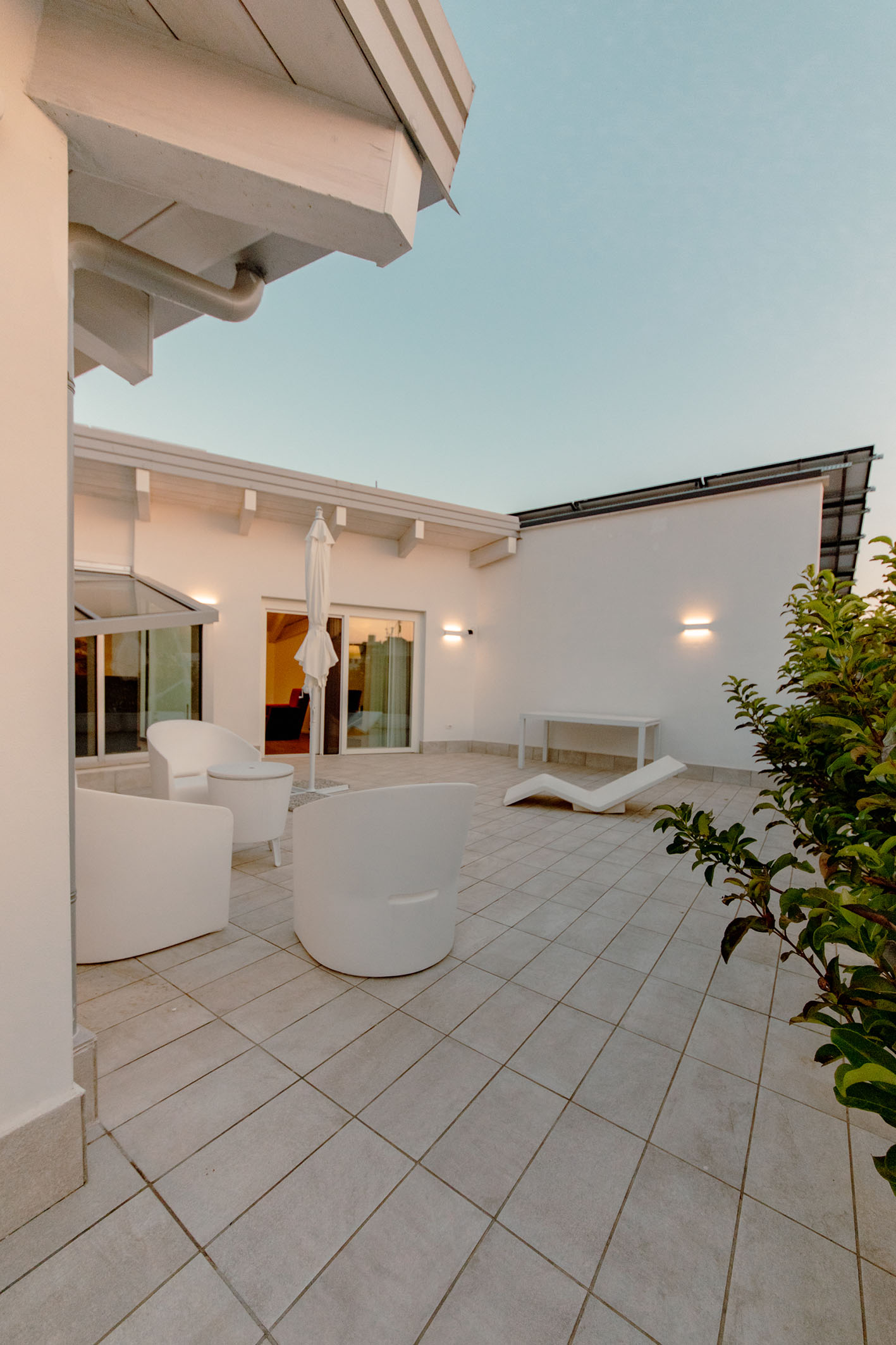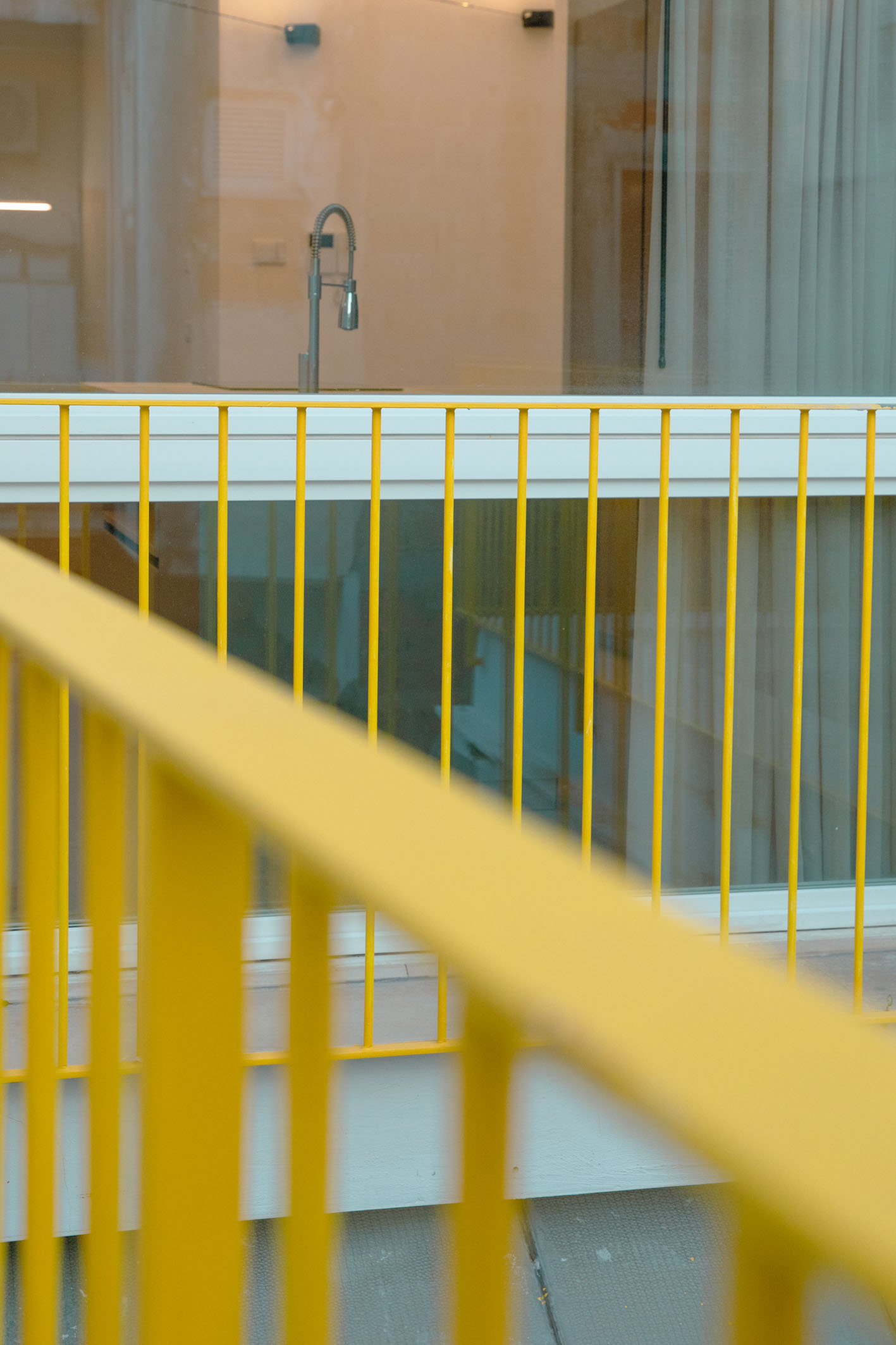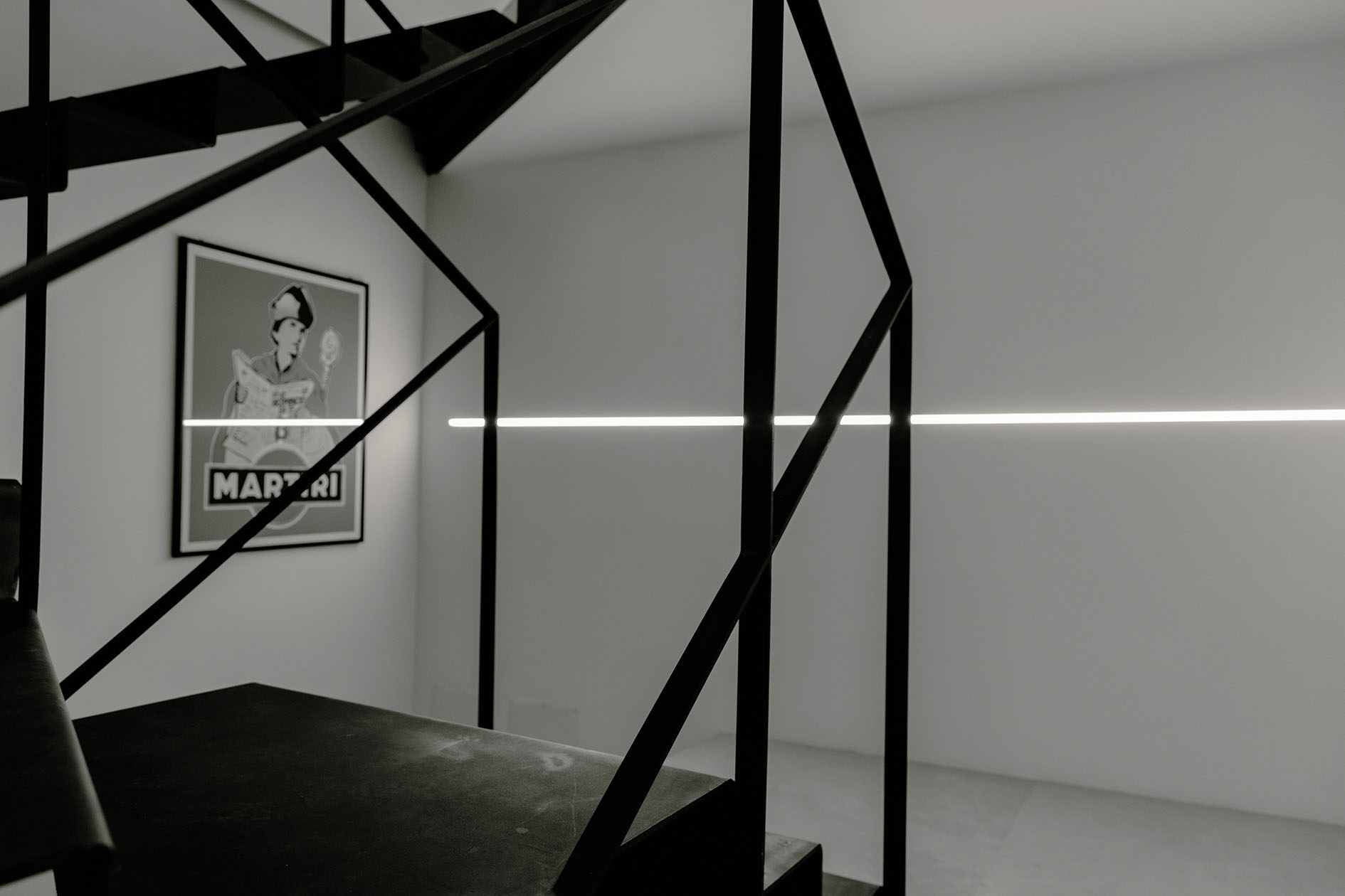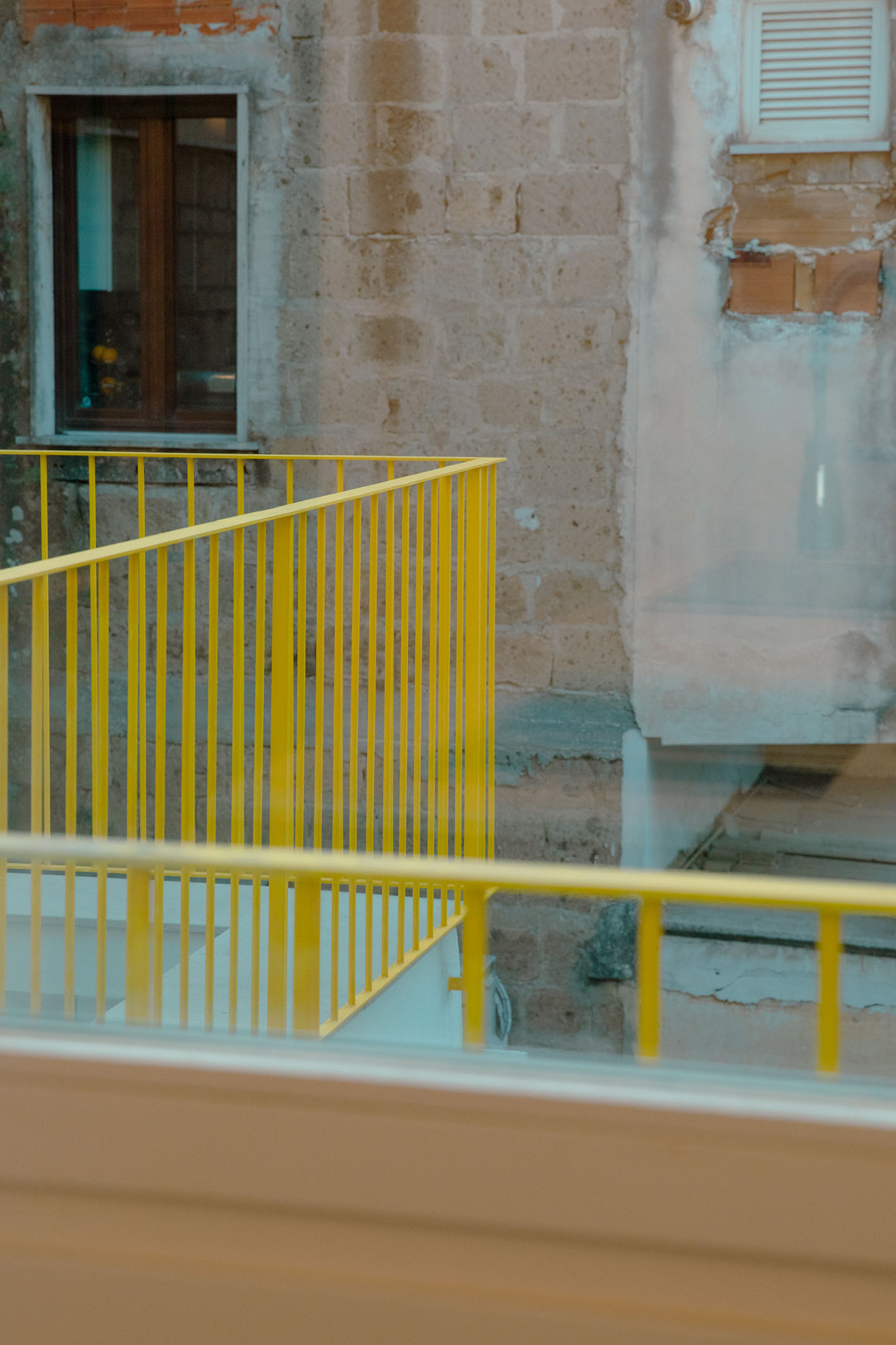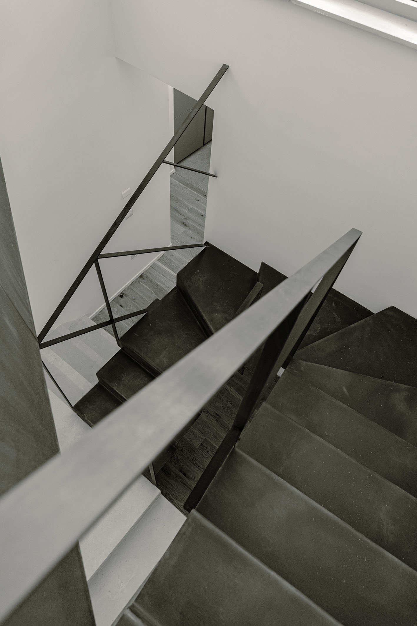 Da queste meditazioni nasce l’idea del progetto di architettura, dapprima utopico immateriale come visione intangibile che si trasferisce attraverso, il gesto, sulla carta prima e poi in corporeo nella mera realizzazione materiale attraverso la costruzione, la “téchne”. Tipologicamente lo spazio residenziale si connette in un sistema duplex, in verticale, mediante una scala immaginata in lamiera piegata in acciaio cor-ten, che si diparte racchiusa in un involucro di vetro. Il vetro incorniciato dai serramenti è il punto focale del progetto, perché elemento che si interpone tra l’esterno e l’interno utilizzando come fattore sensoriale la luce, elemento principale del progetto. Nel livello inferiore sono disposte le funzioni definibili giorno, quali ingresso, cucina che presenta una parete completamente vetrata, ed area ludica. Al livello superiore l’area notte e la zona conviviale, connesse con un ampio terrazzo dove vivere a contatto con l’esterno. L’atmosfera conseguita è una sensazione di avvolgente tepore e senso di certezza dato dalle scelte cromatiche e materiche.