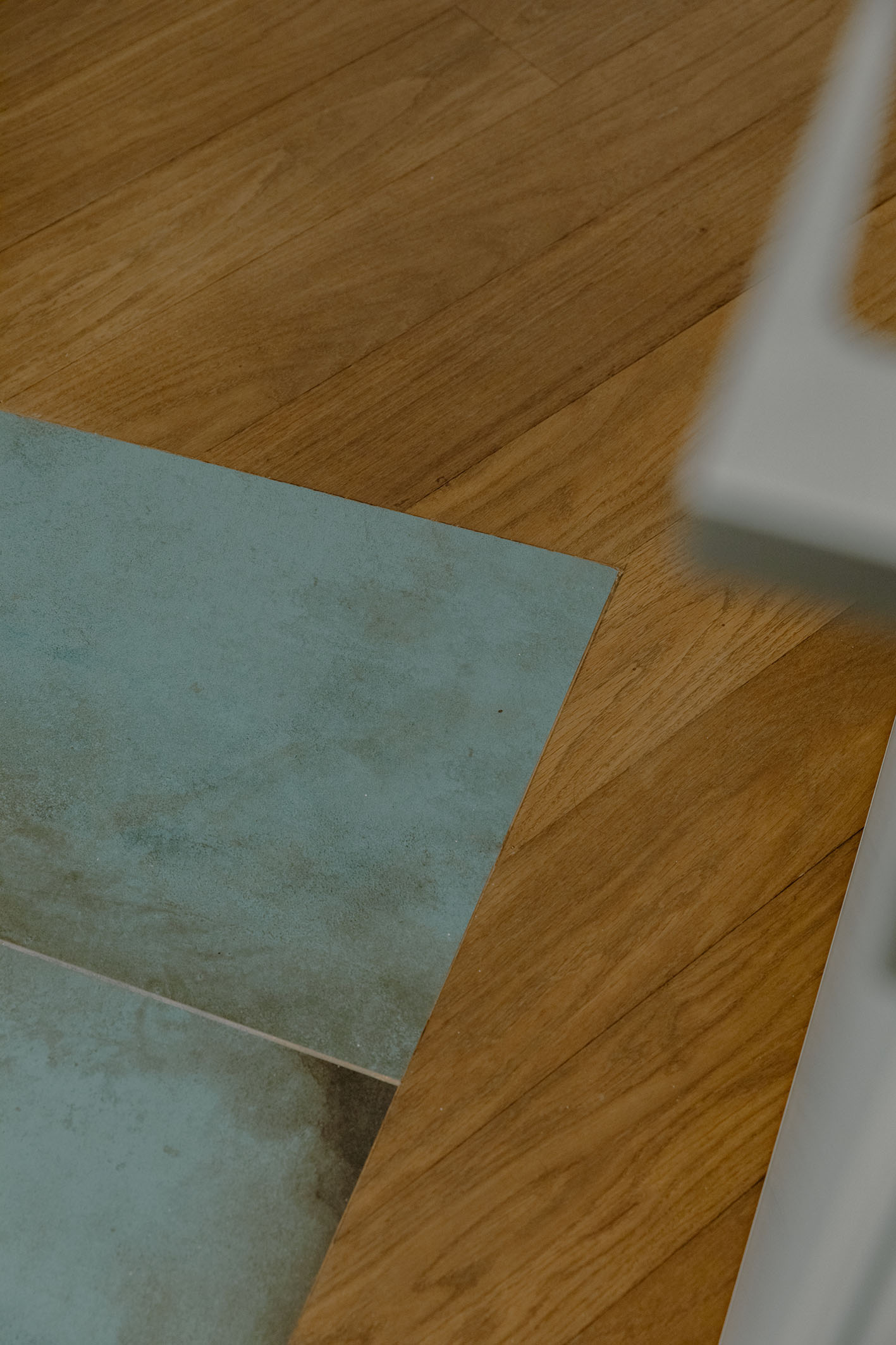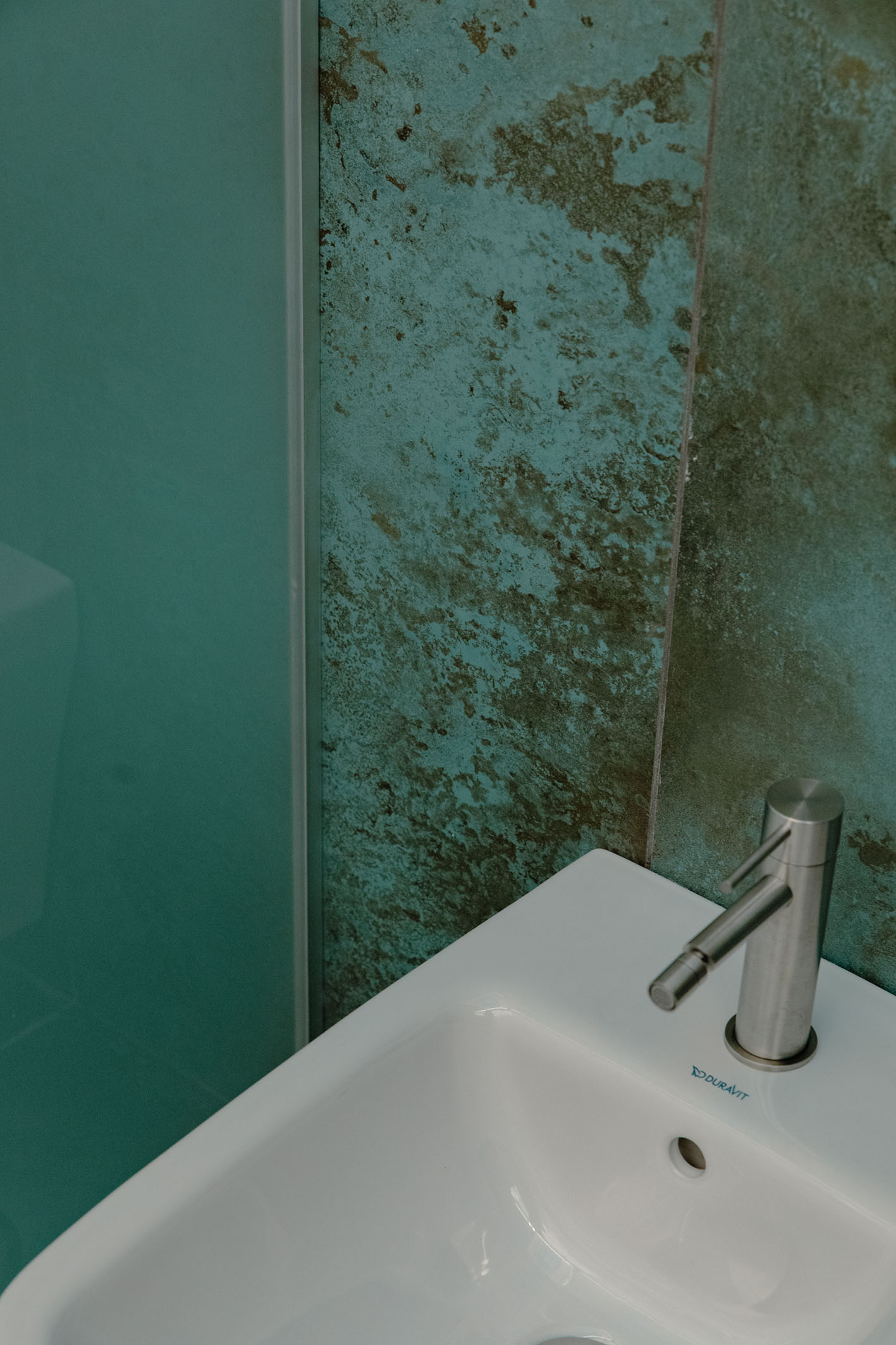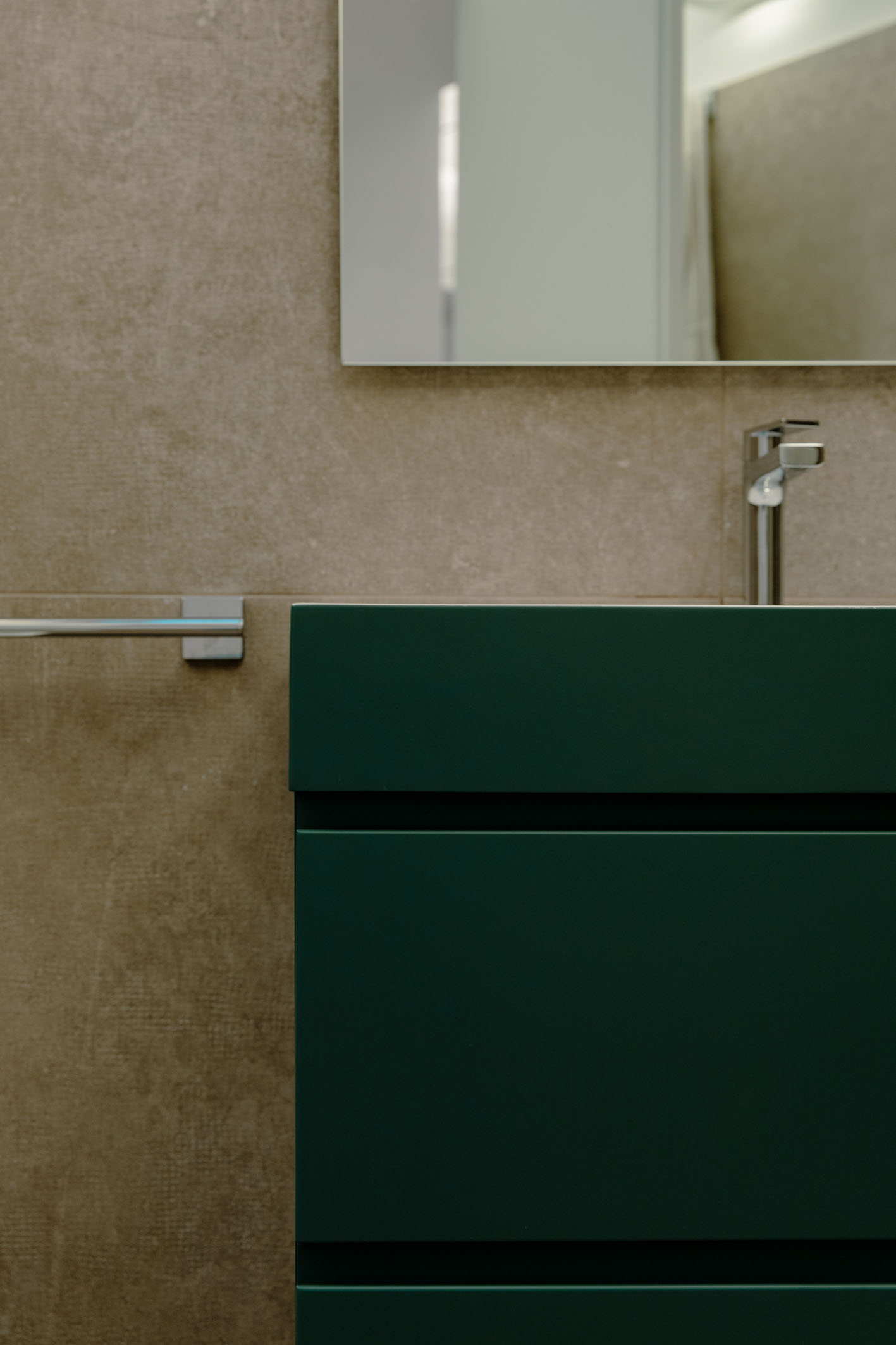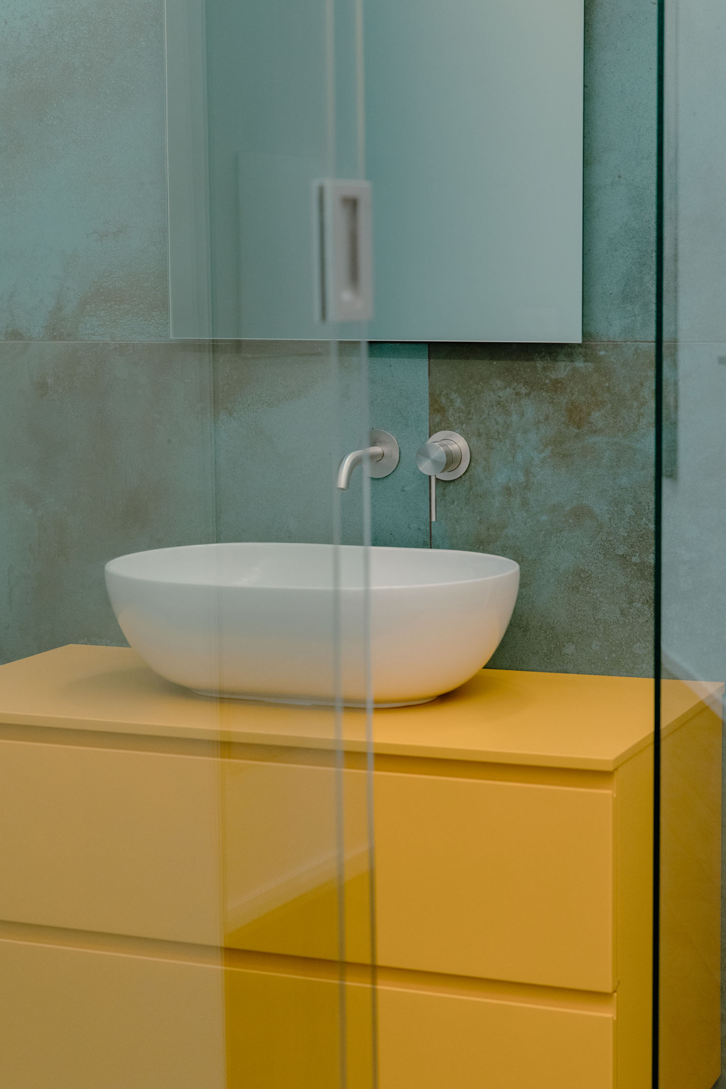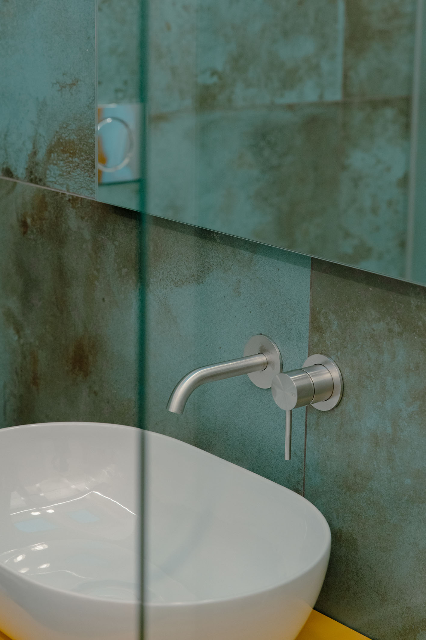 Per i materiali la scelta si è diretta su superfici materiche con cromie per lo più naturali. L’intera unità immobiliare è formata da una superfice di fondo (pavimentazione) in legno naturale con finitura oliata (Bauwerk). Tale scelta è stata perseguita per mantenere quanto più vicino alla realtà la materia legno. Negli ambienti bagno si sono scelte pavimentazioni e rivestimenti dello stesso prodotto. Per il bagno padronale il box vetro, descritto in precedenza, presenta una piastrella di grosso formato e di un colore stonalizzato, con superfice con effetto bump sulla cromia del verde menta (Cesar Alchemy – tc. Mint) per evocare il verde del sottobosco, che abbinato al legno crea una sensazione, che possiamo definire… boschiva? Con ovviamente essenze floreali sul primaverile giallo, per il mobile lavabo (Artesi). In contrapposizione l’altro bagno completamente rivestito in una piastrella dal forte carattere materico. Un effetto cemento industrial rullato (Cotto D’Este X-Beton), e mobile lavabo verde petrolio. Le rubinetterie tutte della stessa tipologia (Gessi). Per le restanti finiture sono stati impiegati prodotti in continuità stilistiche con i punti principali dell’intero progetto.