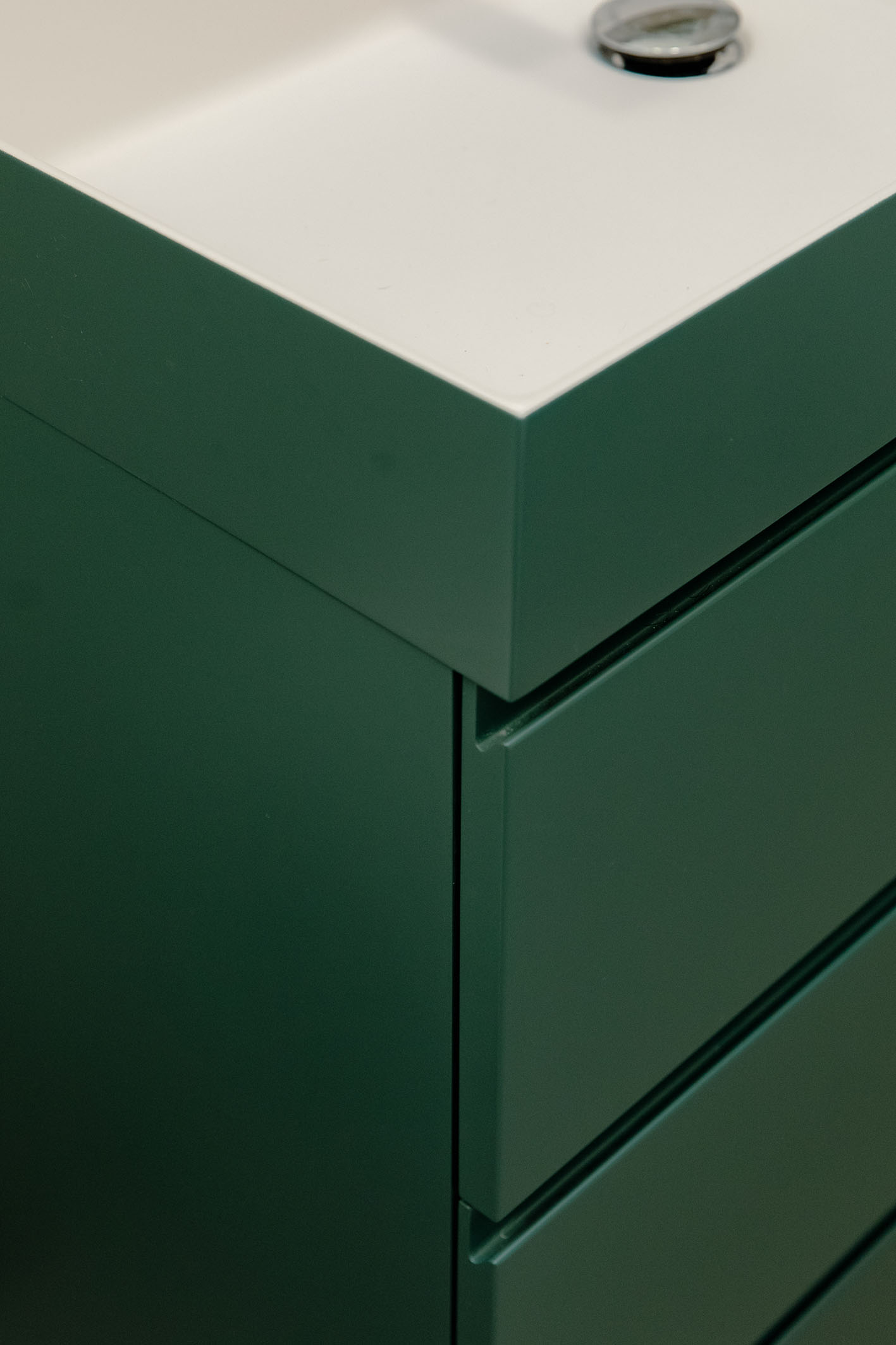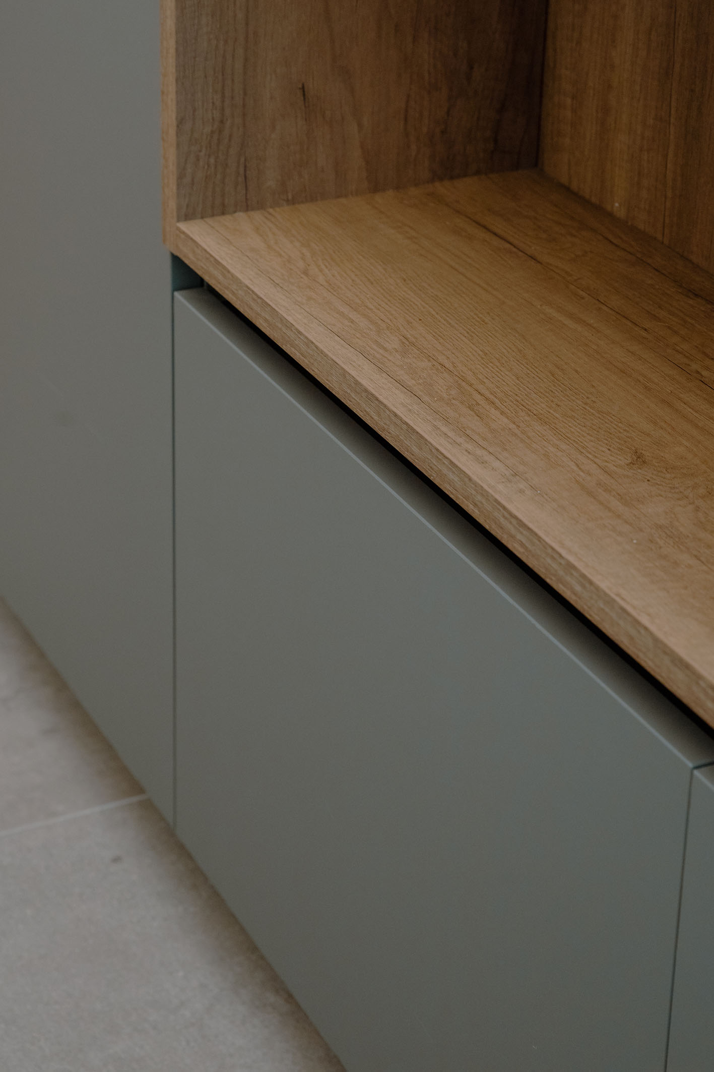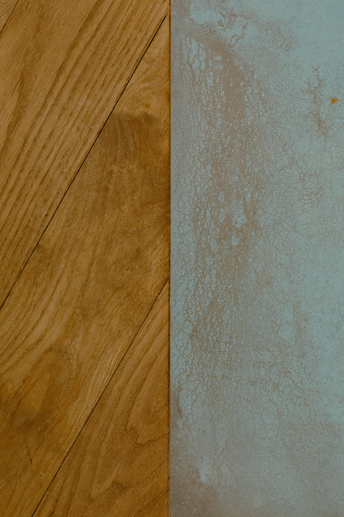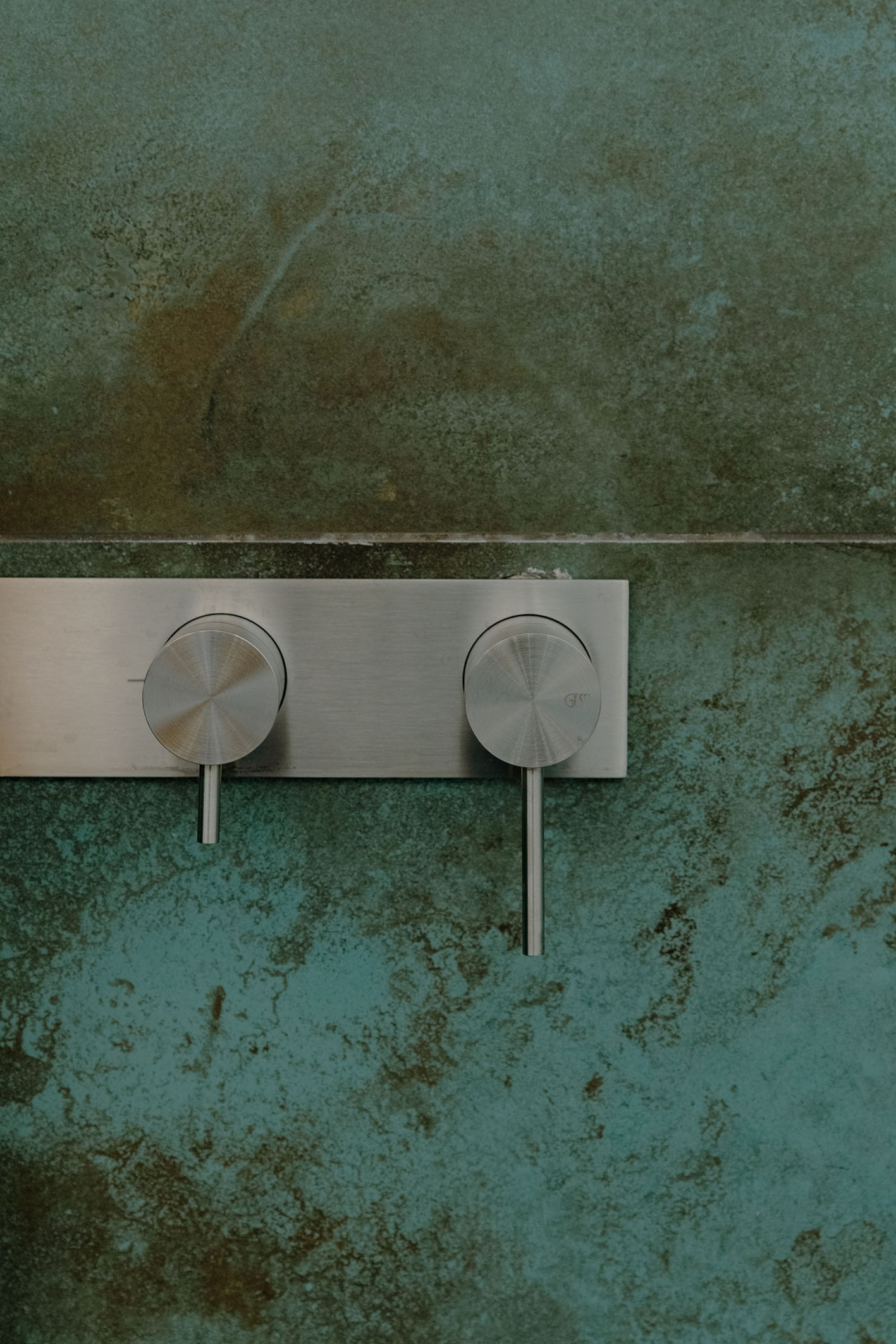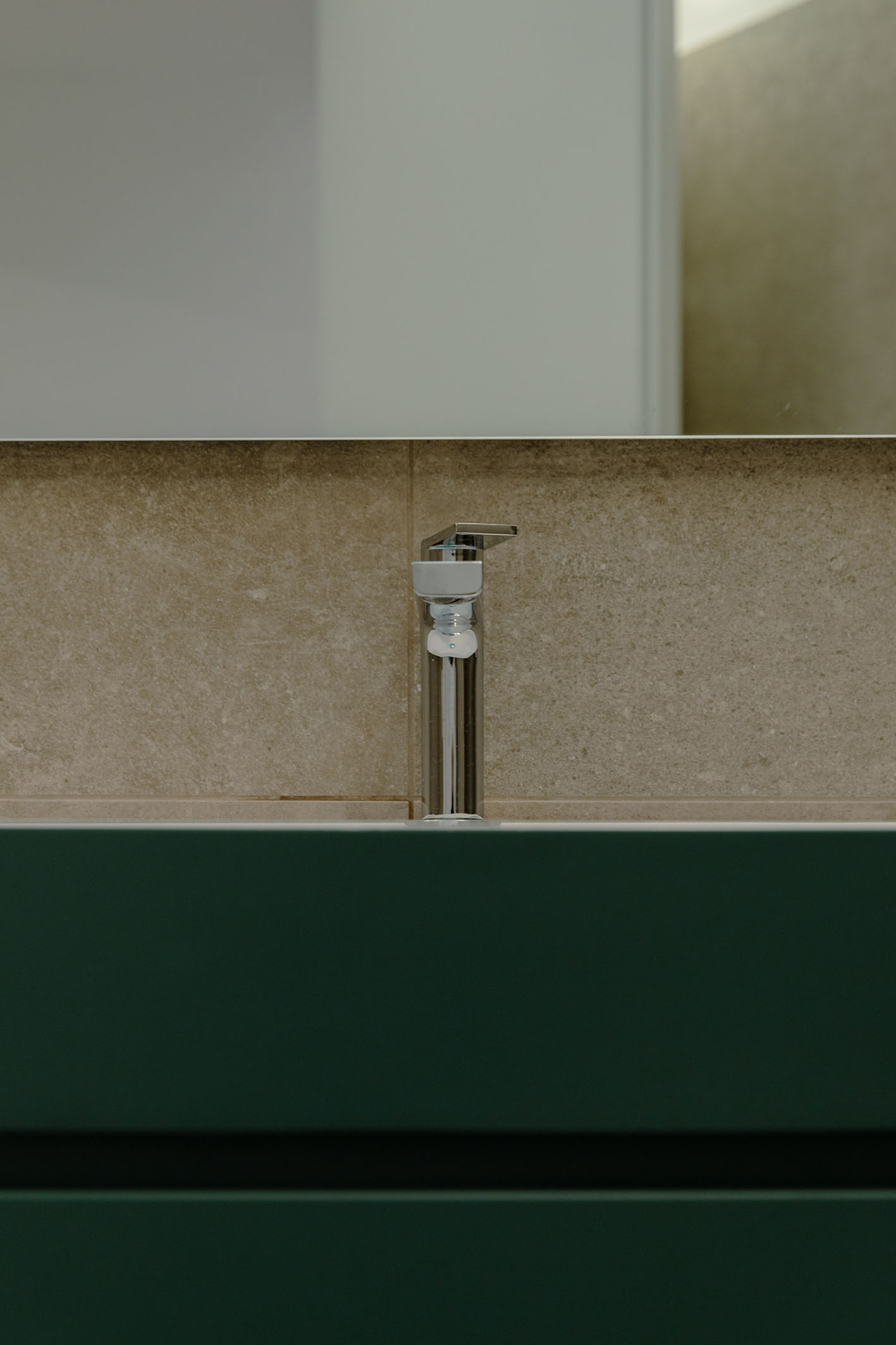 Per i materiali la scelta si è diretta su superfici materiche con cromie per lo più naturali. L’intera unità immobiliare è formata da una superfice di fondo (pavimentazione) in legno naturale con finitura oliata (Bauwerk). Tale scelta è stata perseguita per mantenere quanto più vicino alla realtà la materia legno. Negli ambienti bagno si sono scelte pavimentazioni e rivestimenti dello stesso prodotto. Per il bagno padronale il box vetro, descritto in precedenza, presenta una piastrella di grosso formato e di un colore stonalizzato, con superfice con effetto bump sulla cromia del verde menta (Cesar Alchemy – tc. Mint) per evocare il verde del sottobosco, che abbinato al legno crea una sensazione, che possiamo definire… boschiva? Con ovviamente essenze floreali sul primaverile giallo, per il mobile lavabo (Artesi). In contrapposizione l’altro bagno completamente rivestito in una piastrella dal forte carattere materico. Un effetto cemento industrial rullato (Cotto D’Este X-Beton), e mobile lavabo verde petrolio. Le rubinetterie tutte della stessa tipologia (Gessi). Per le restanti finiture sono stati impiegati prodotti in continuità stilistiche con i punti principali dell’intero progetto.