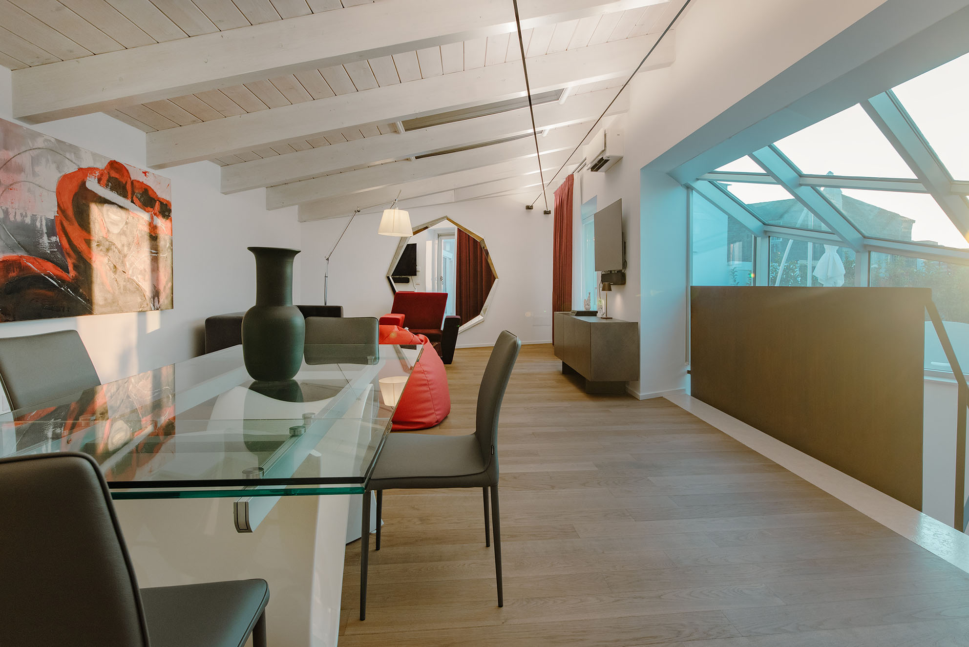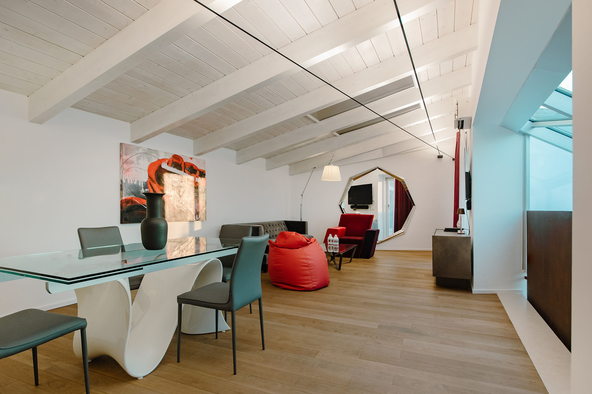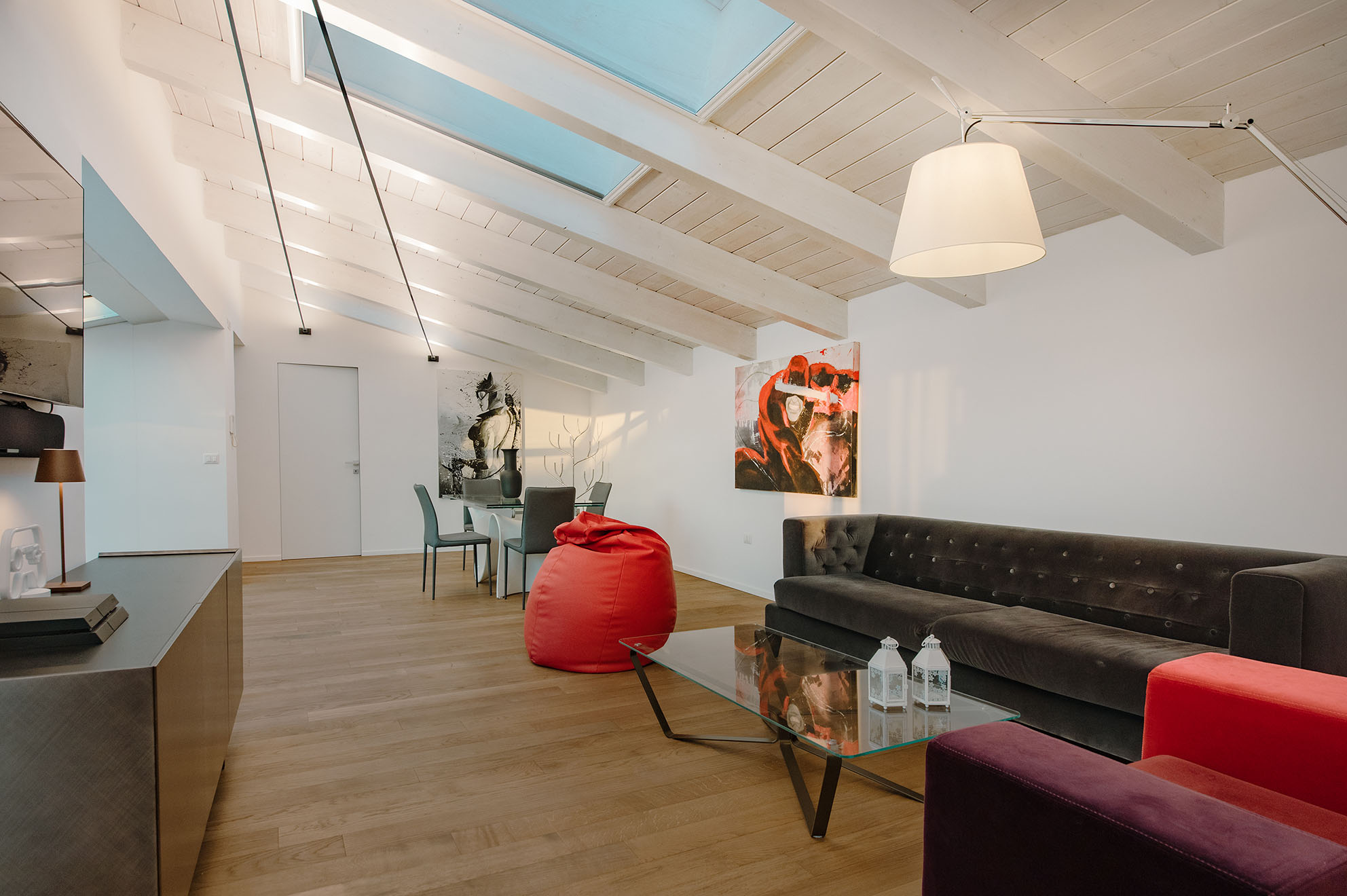 Un duplex dove la scelta dei materiali si è rivelata fondamentale per creare armonie materiche e risaltassero i singoli spazi. In particolar modo, la scelta del parquet rovere per rendere subito l’ambiente elegante e confortevole.