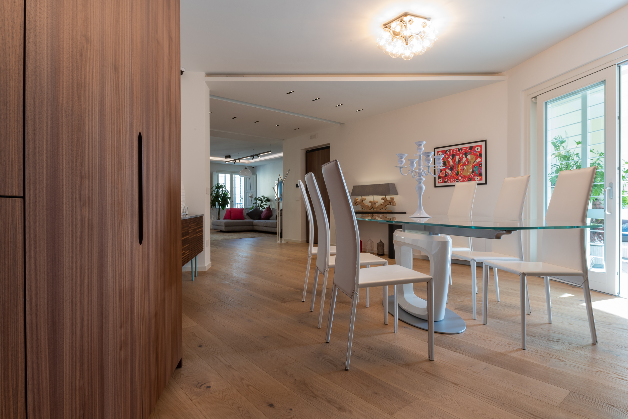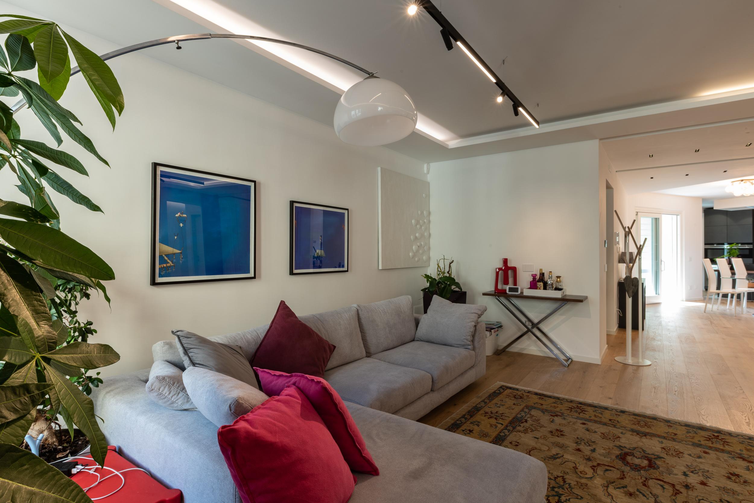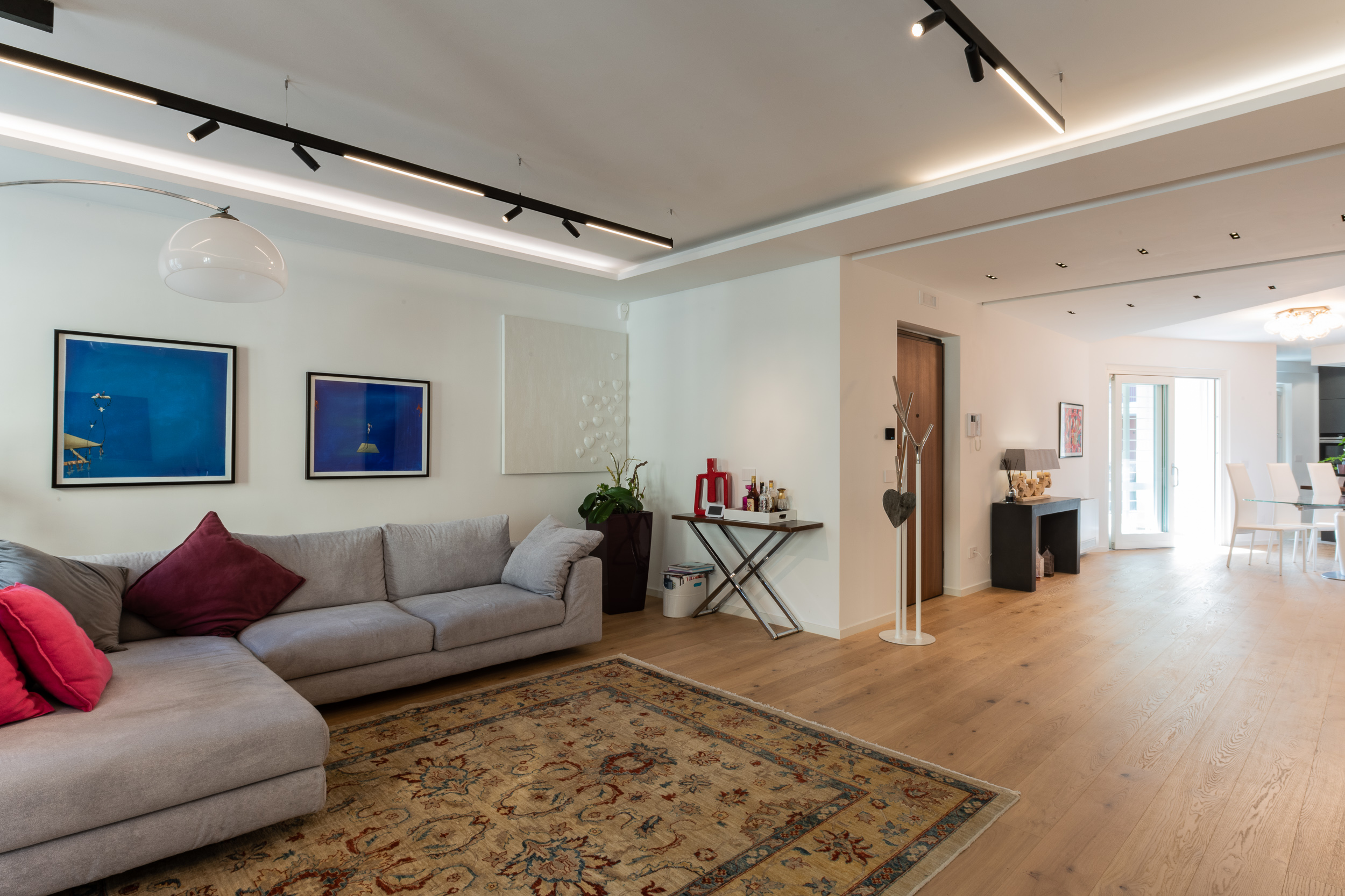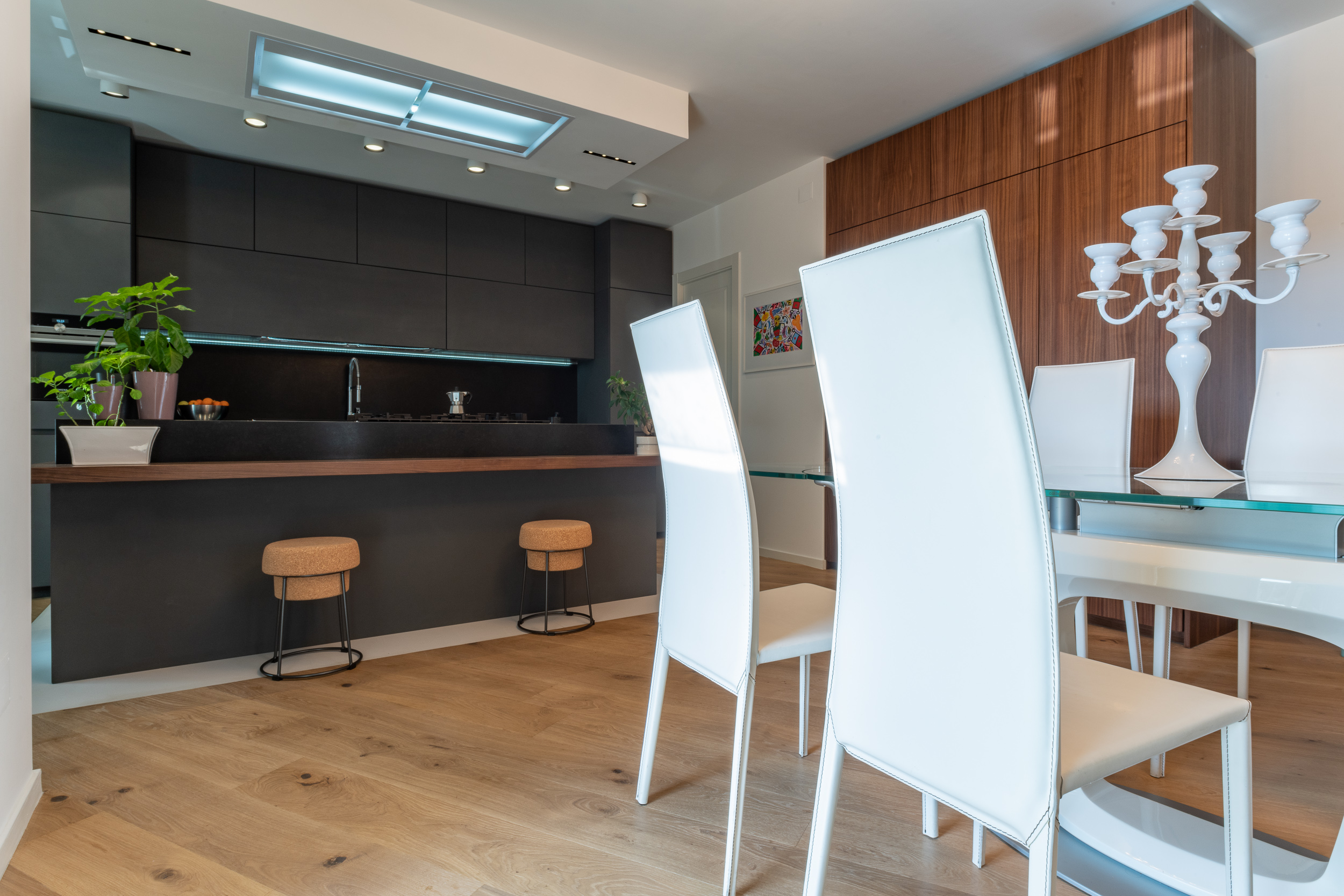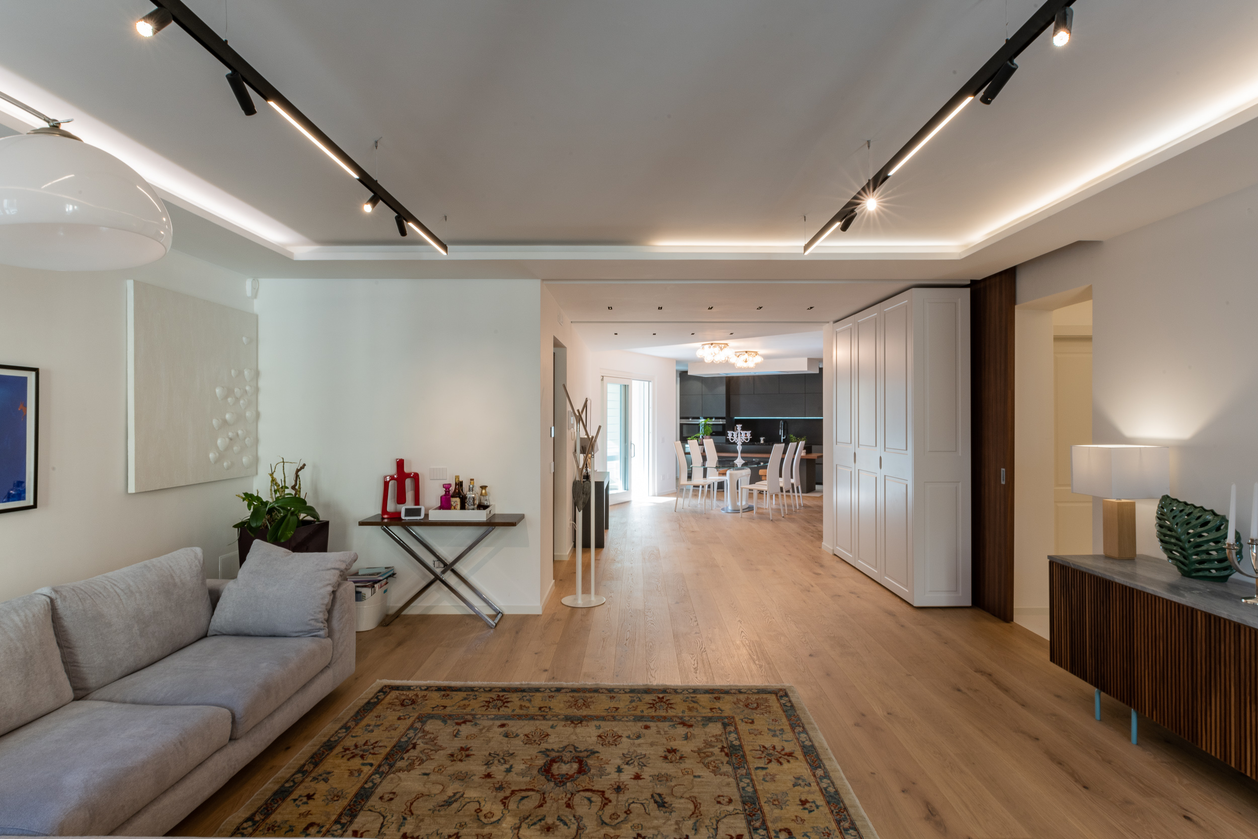 L’abitazione è stata rifinita in stile contemporaneo, con un gusto ne classico ne moderno ma dove suggestioni del passaggio con intuizioni futuristiche si sposano bene per rendere l’ambiente vivibile e piacevole. Per sottolineare la natura di questo stile abbiamo lavorato sull’impianto illumino-tecnico e progettato arredi dallo stile classico con materiali quali noce canaletto e metallo. Lo stile contemporaeno è sottolineato anche dalla scelta dei materiali, com e il parquet in quasi tutti gli ambienti.