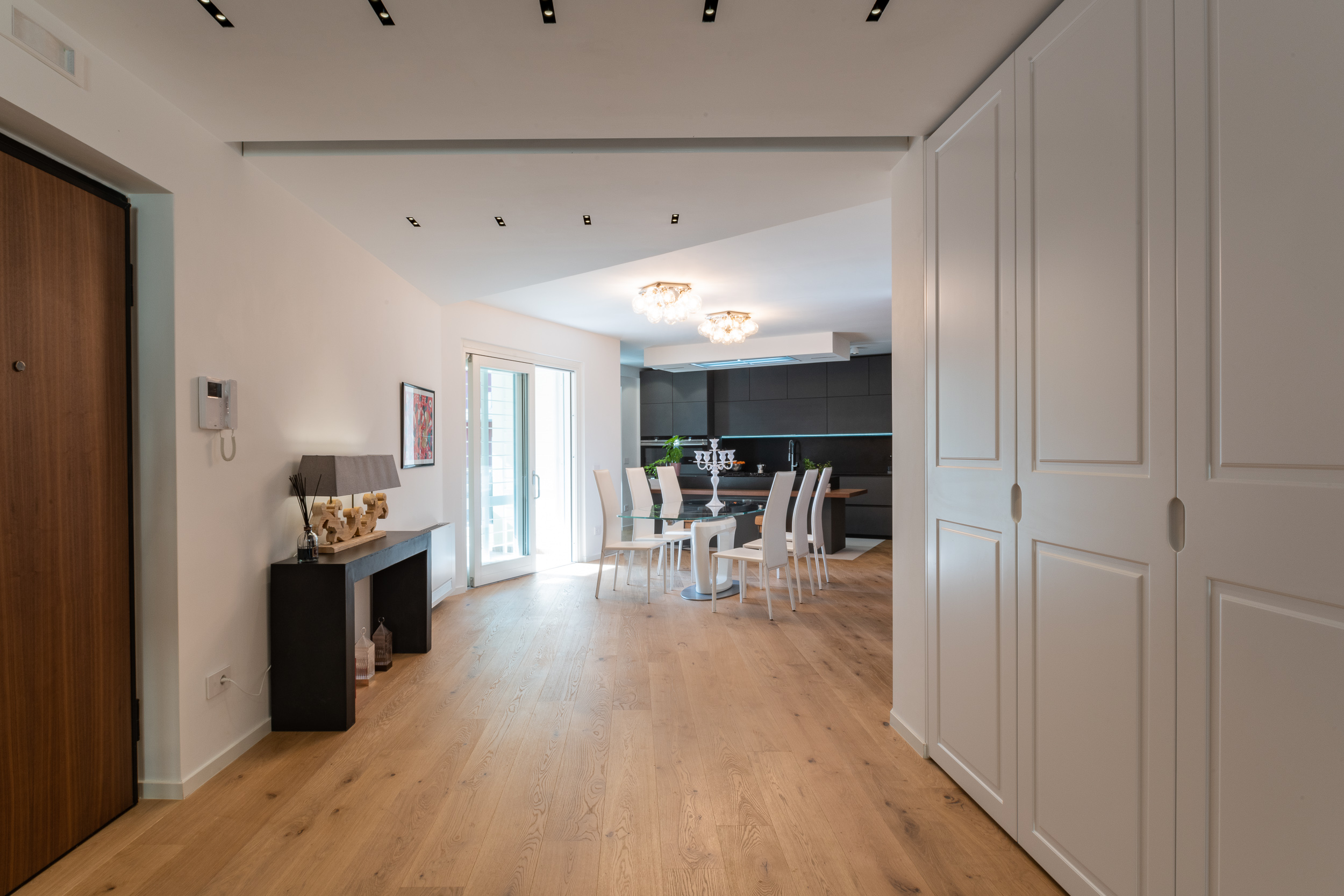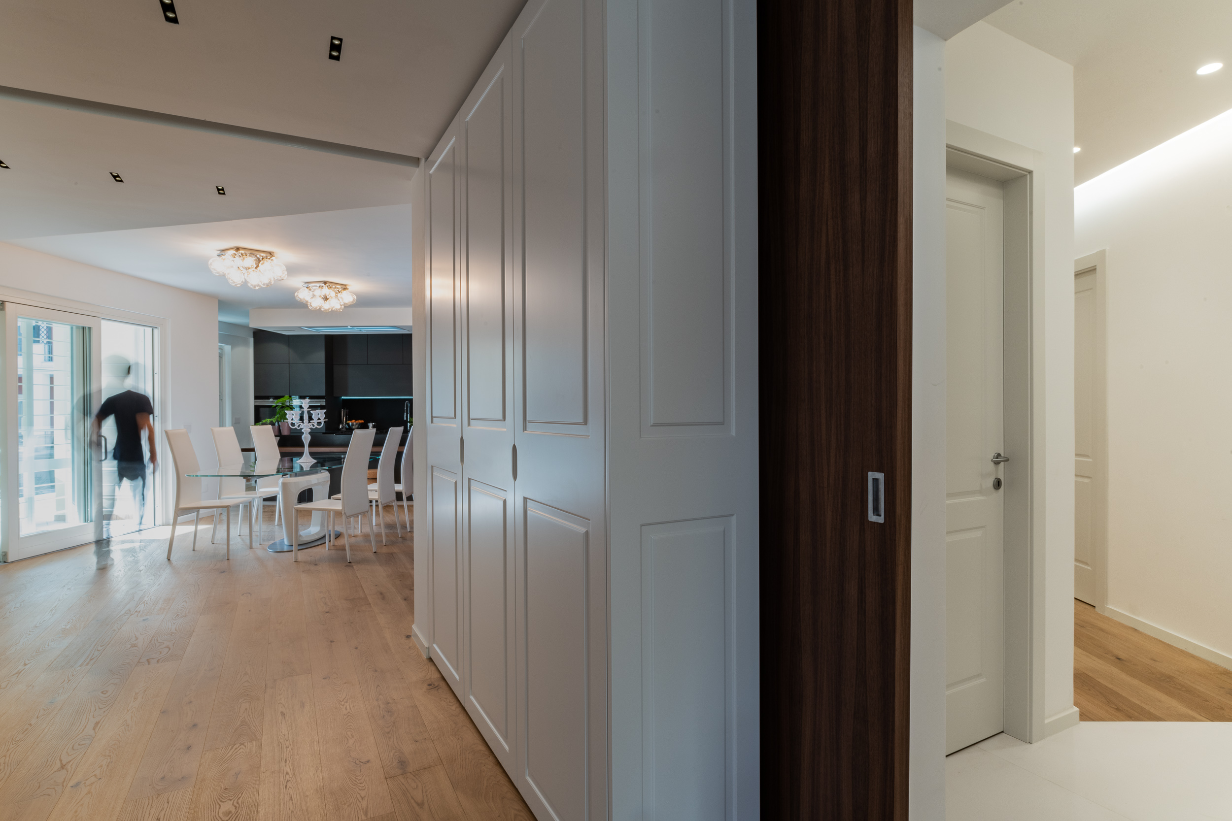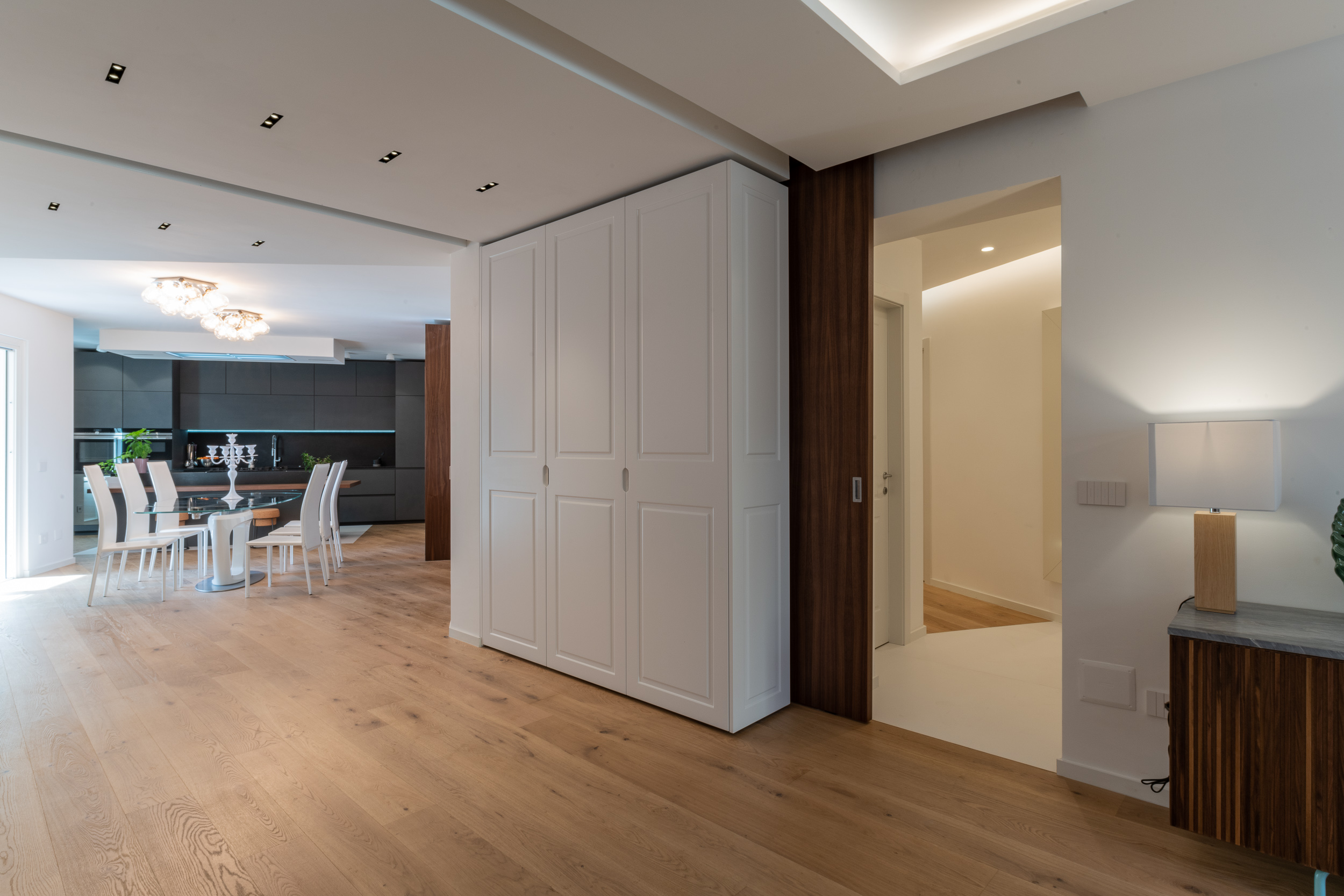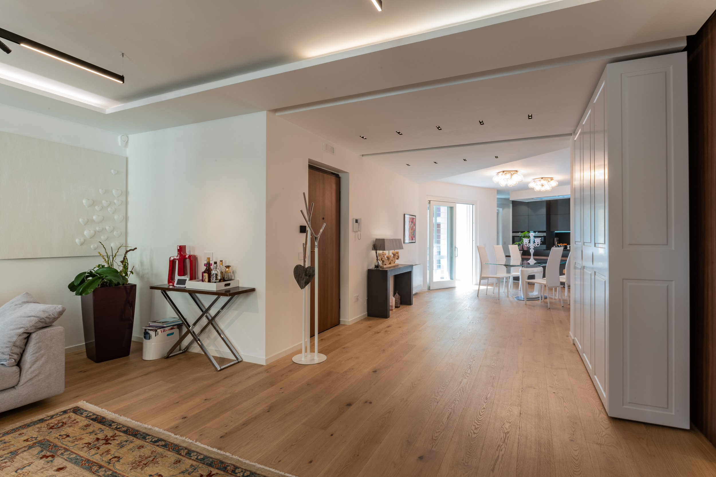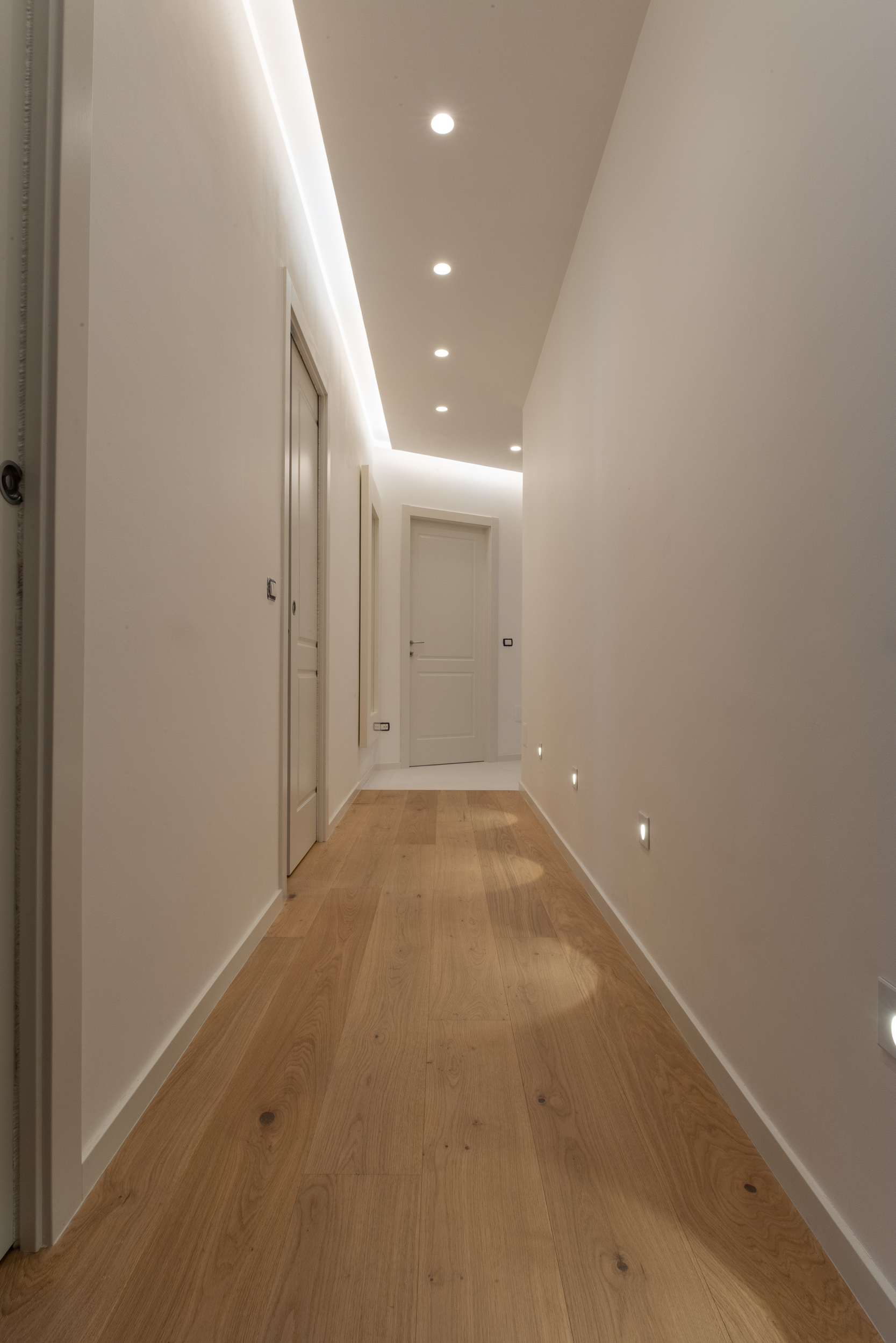L’abitazione è stata rifinita in stile contemporaneo, con un gusto ne classico ne moderno ma dove suggestioni del passaggio con intuizioni futuristiche si sposano bene per rendere l’ambiente vivibile e piacevole. Per sottolineare la natura di questo stile abbiamo lavorato sull’impianto illumino-tecnico e progettato arredi dallo stile classico con materiali quali noce canaletto e metallo. Lo stile contemporaeno è sottolineato anche dalla scelta dei materiali, com e il parquet in quasi tutti gli ambienti.