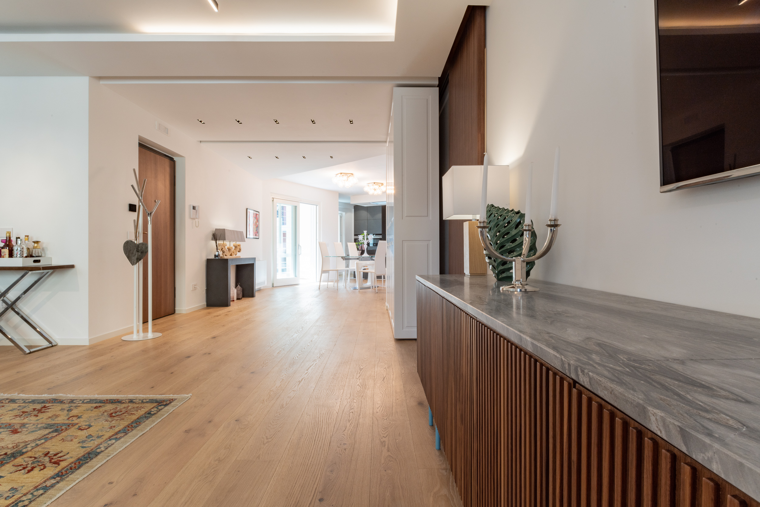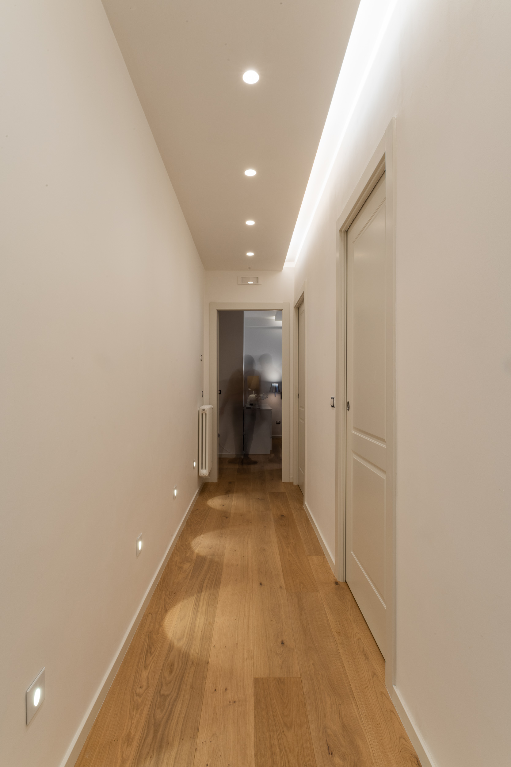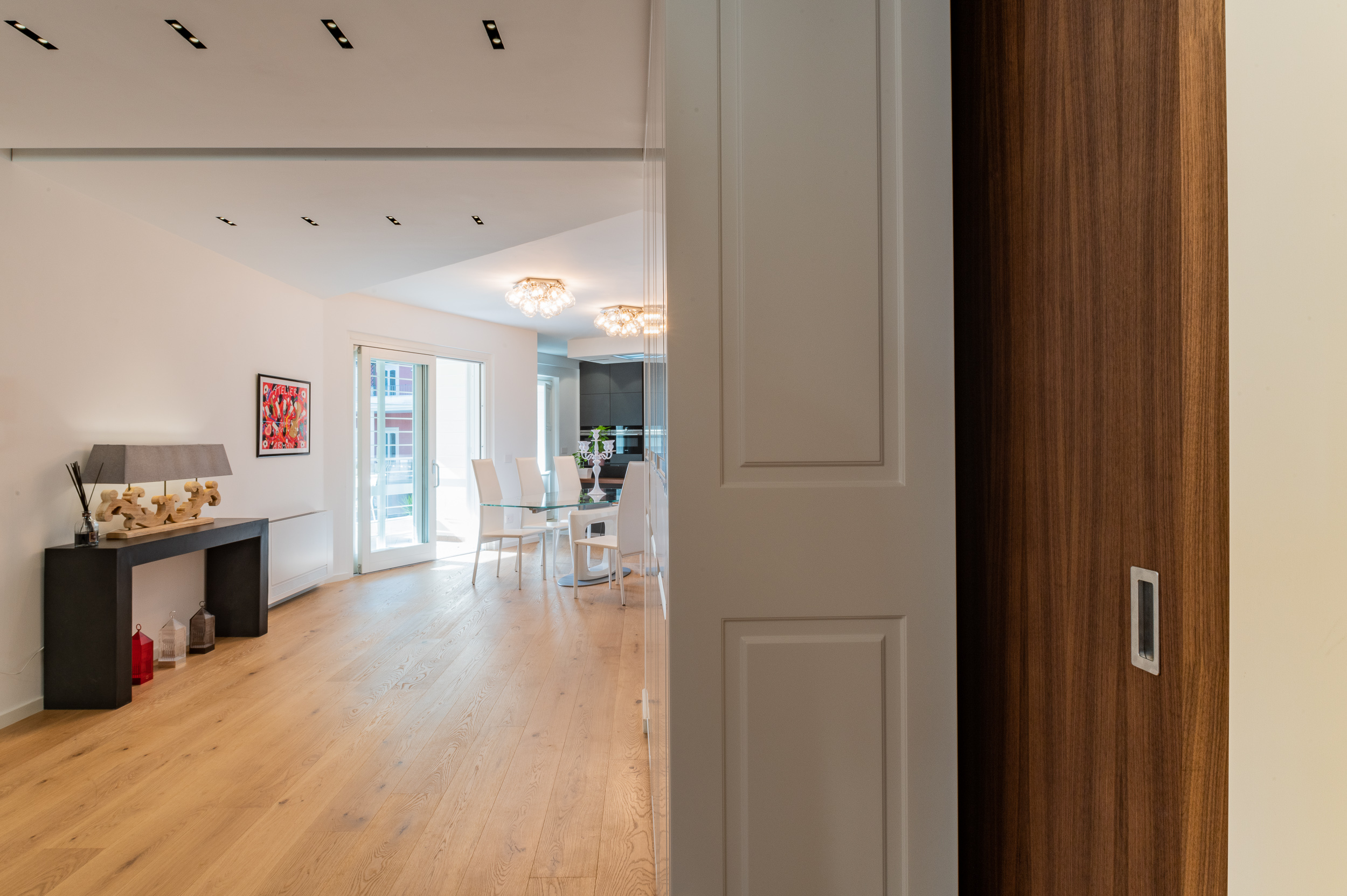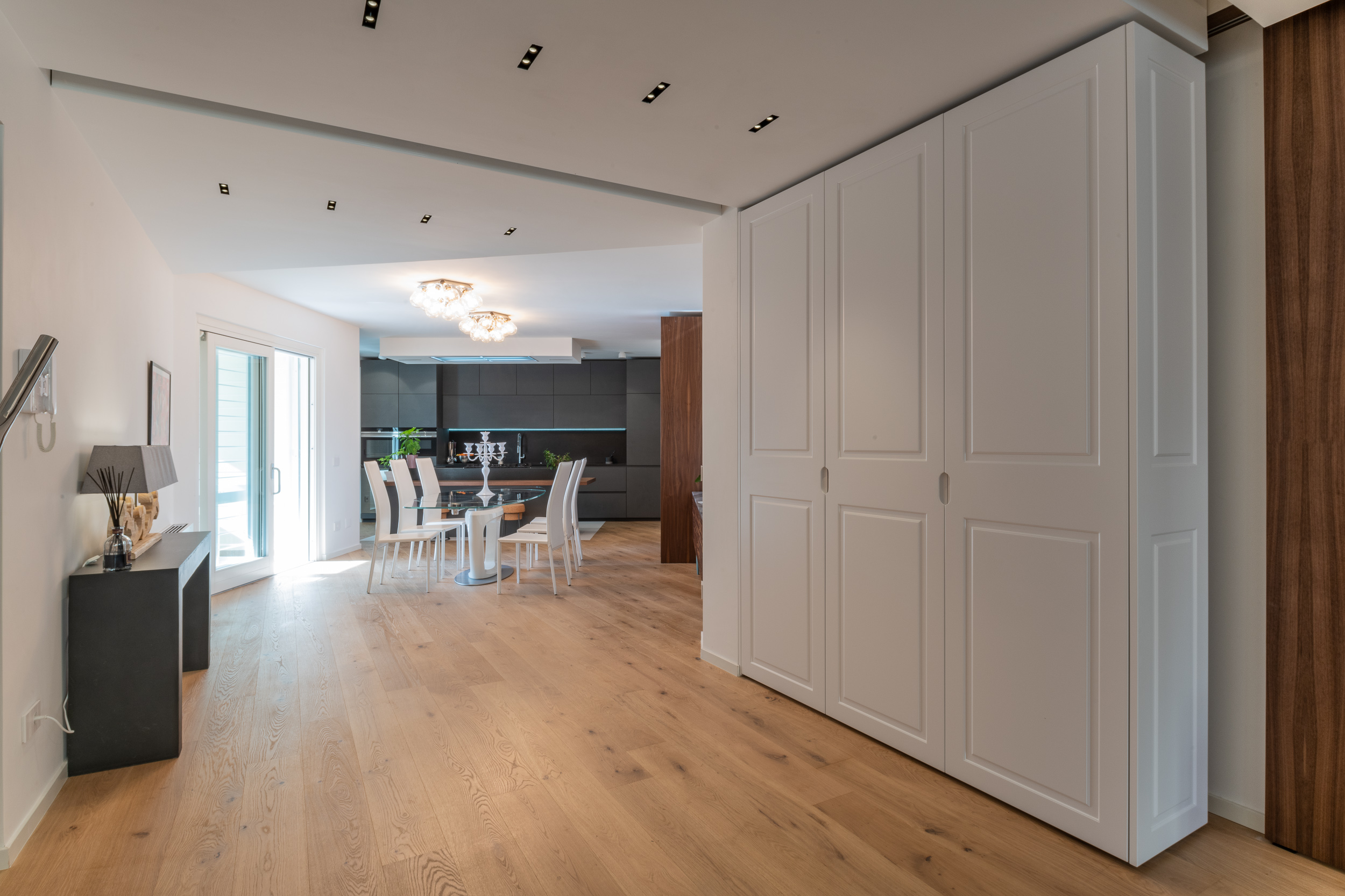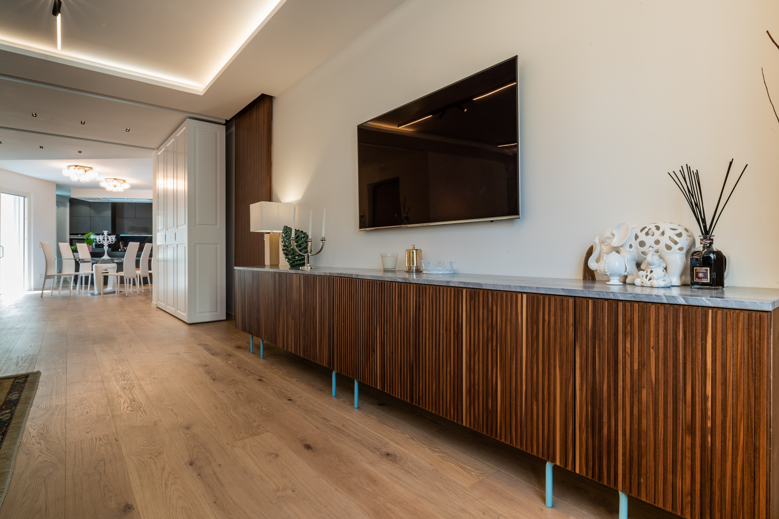 L’abitazione è stata rifinita in stile contemporaneo, con un gusto ne classico ne moderno ma dove suggestioni del passaggio con intuizioni futuristiche si sposano bene per rendere l’ambiente vivibile e piacevole. Per sottolineare la natura di questo stile abbiamo lavorato sull’impianto illumino-tecnico e progettato arredi dallo stile classico con materiali quali noce canaletto e metallo. Lo stile contemporaeno è sottolineato anche dalla scelta dei materiali, com e il parquet in quasi tutti gli ambienti.