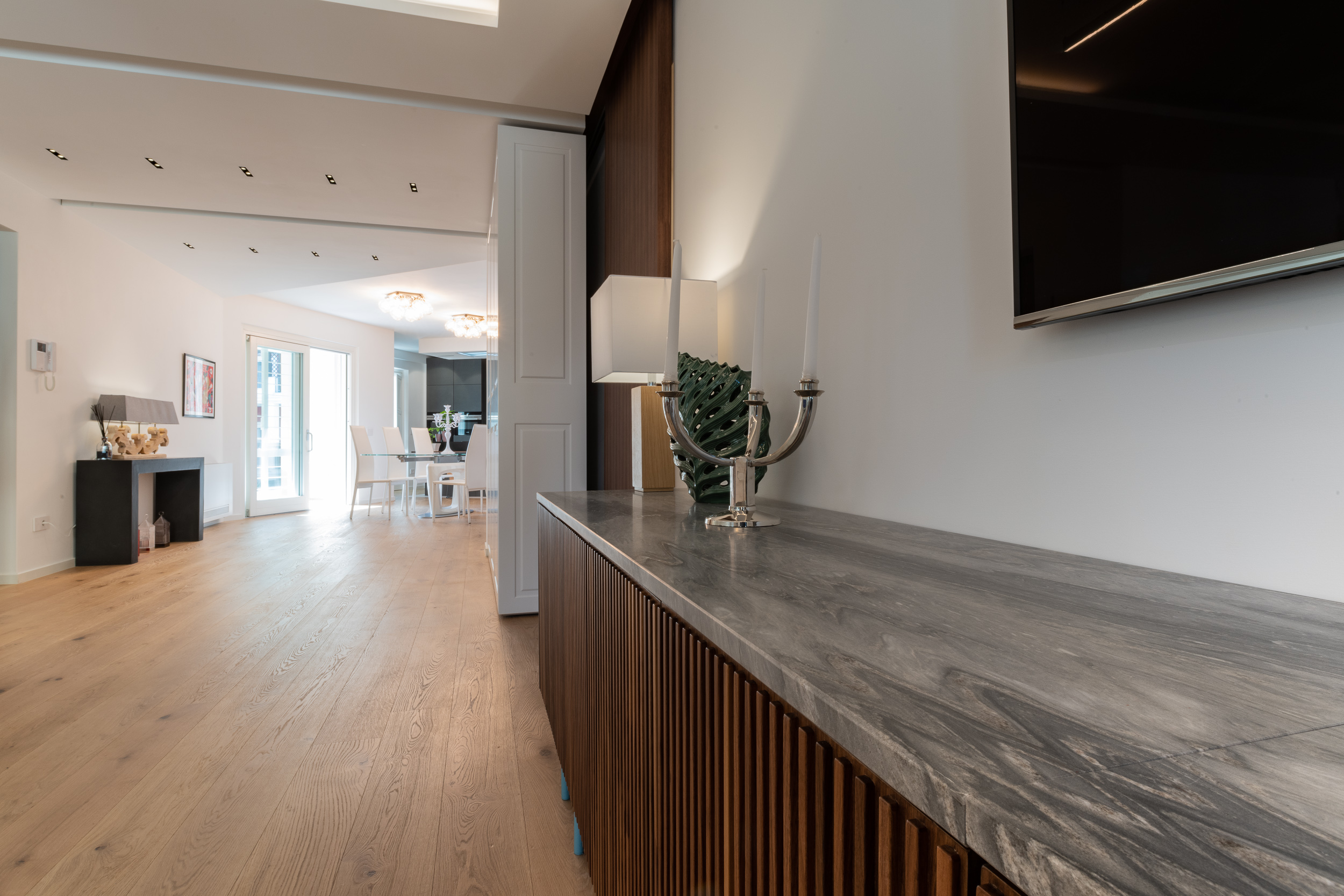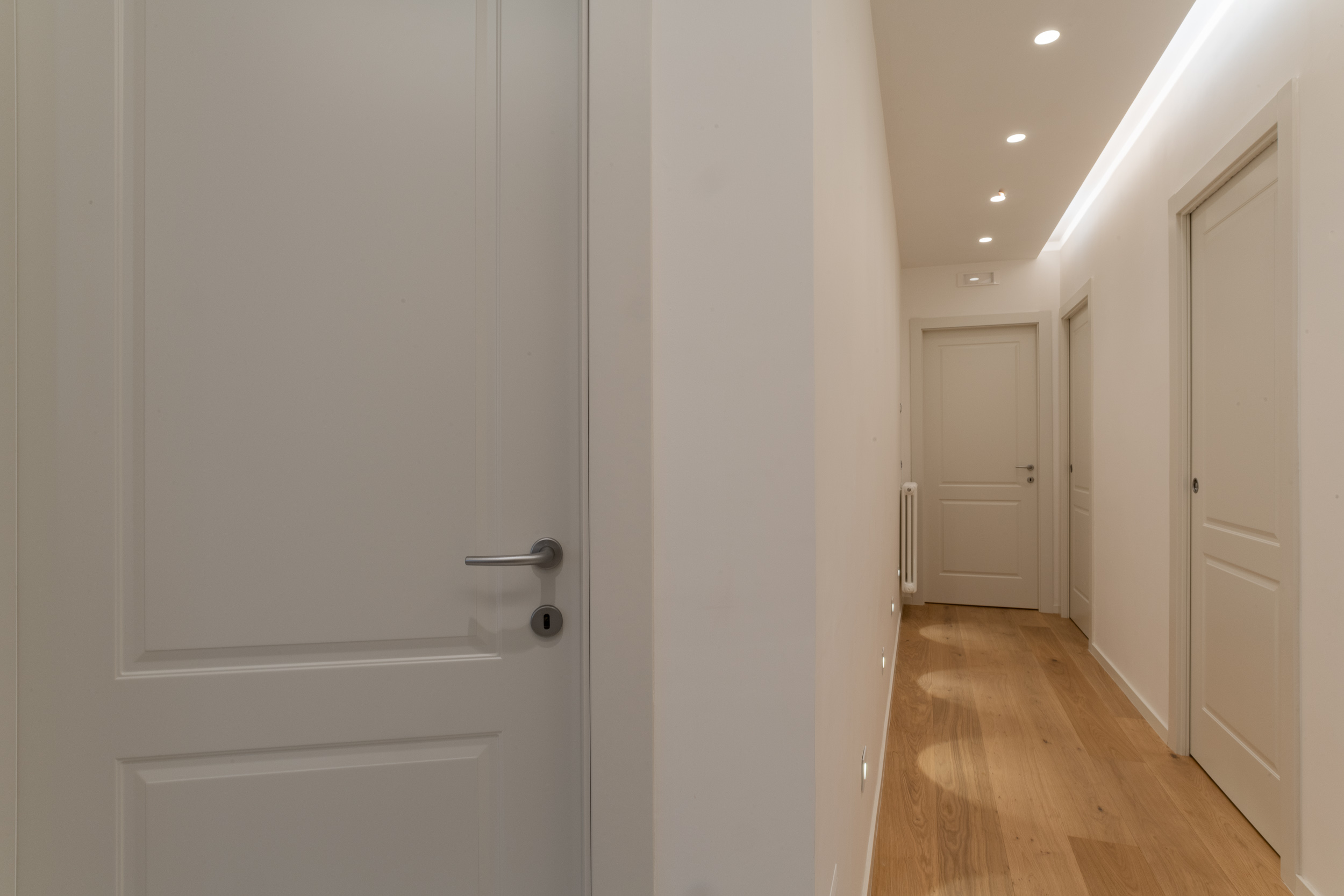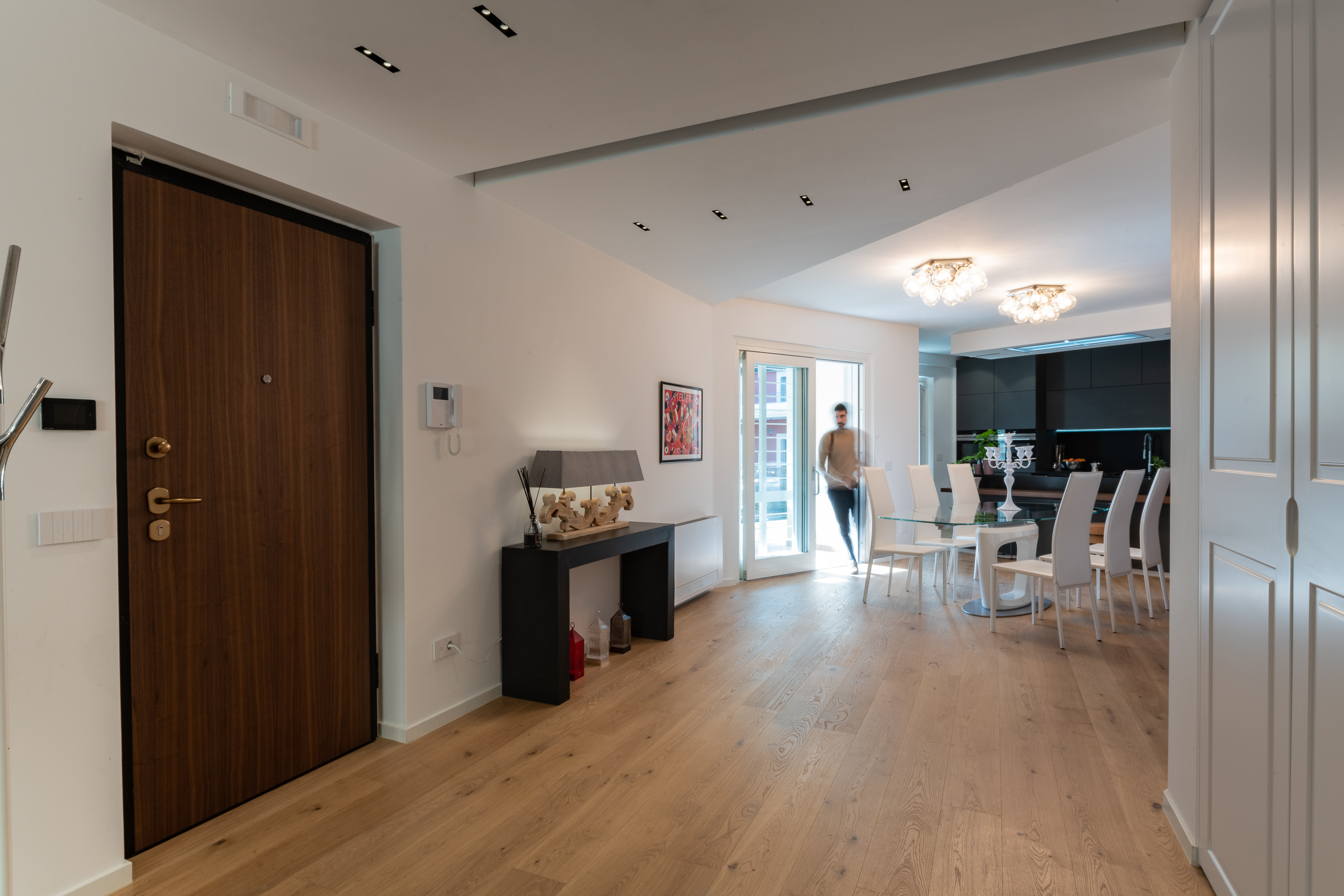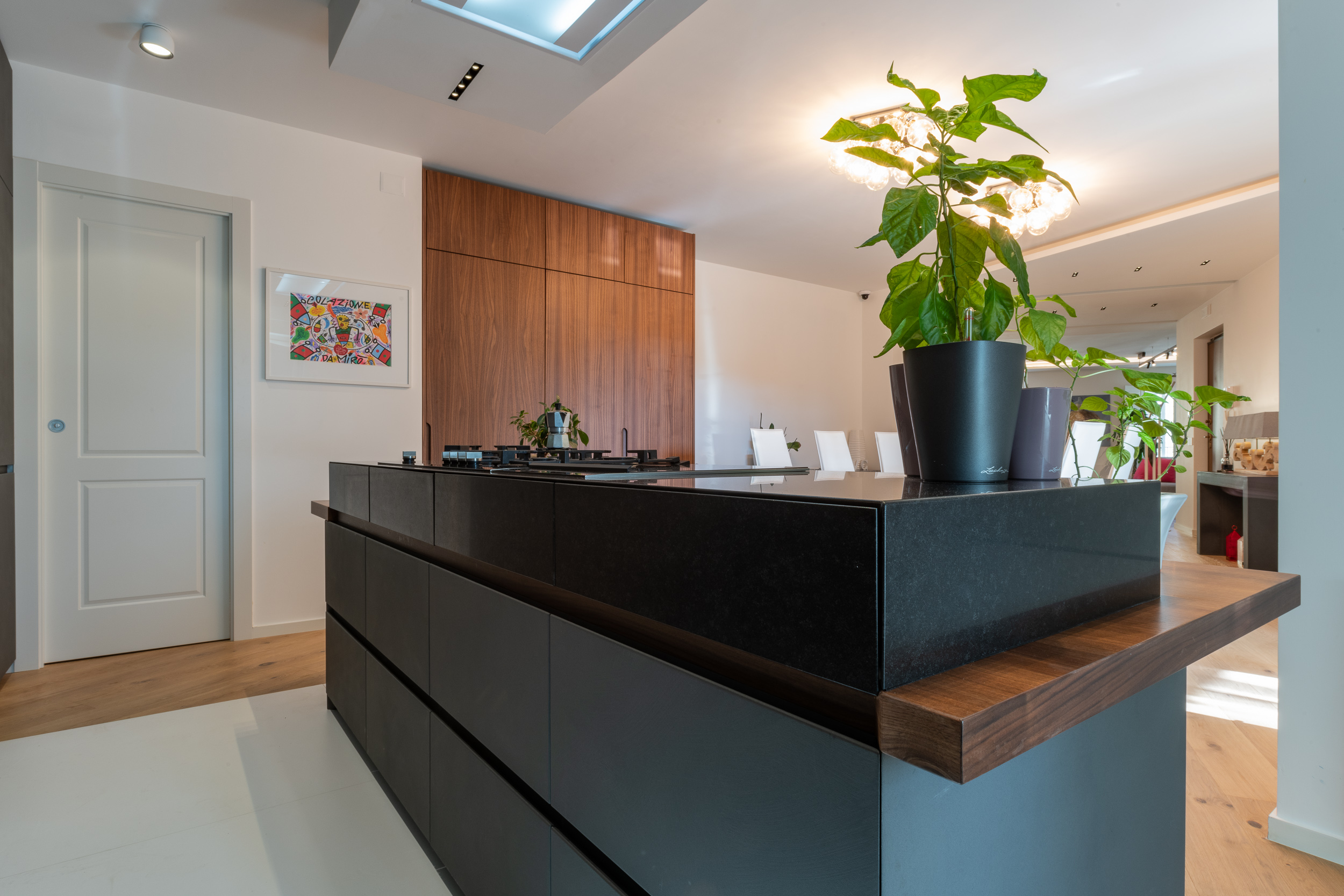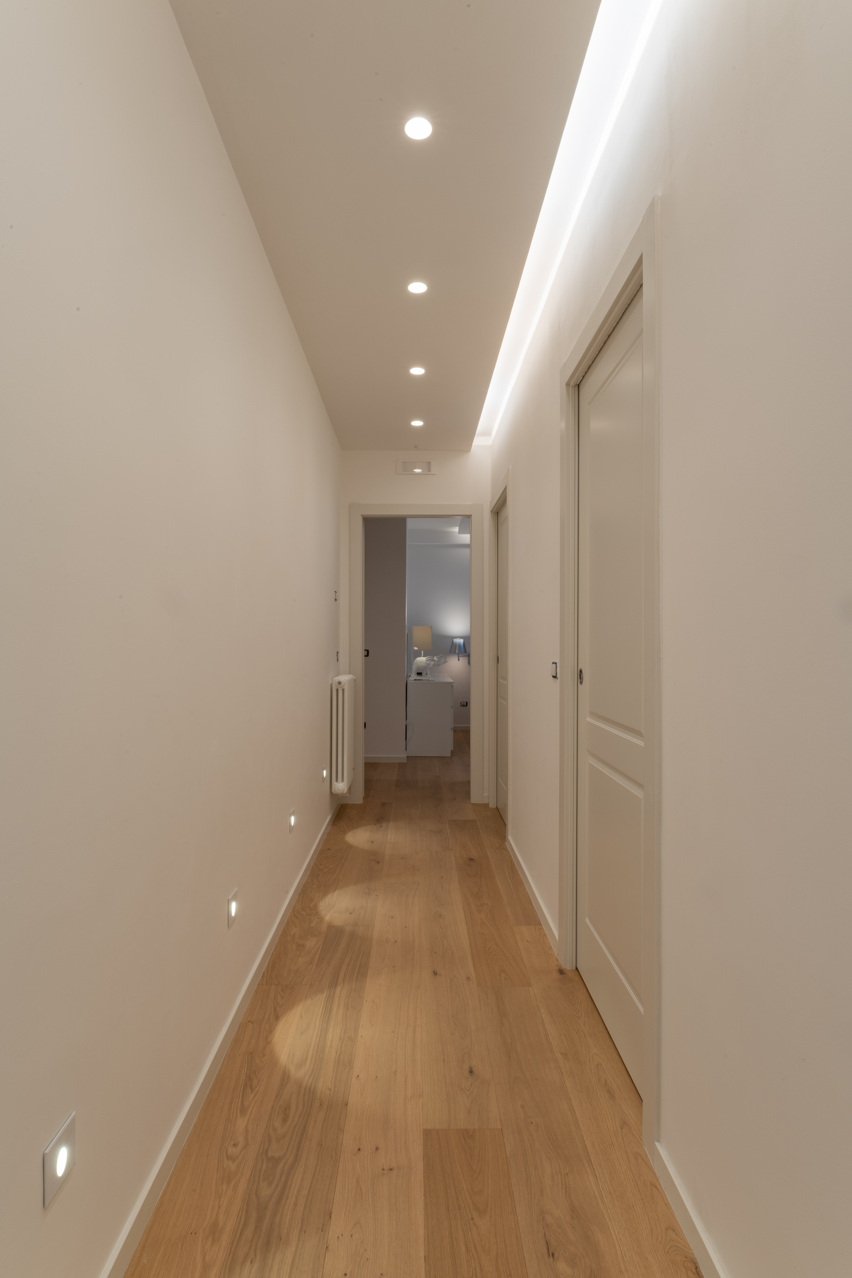 L’abitazione è stata rifinita in stile contemporaneo, con un gusto ne classico ne moderno ma dove suggestioni del passaggio con intuizioni futuristiche si sposano bene per rendere l’ambiente vivibile e piacevole. Per sottolineare la natura di questo stile abbiamo lavorato sull’impianto illumino-tecnico e progettato arredi dallo stile classico con materiali quali noce canaletto e metallo. Lo stile contemporaeno è sottolineato anche dalla scelta dei materiali, com e il parquet in quasi tutti gli ambienti.