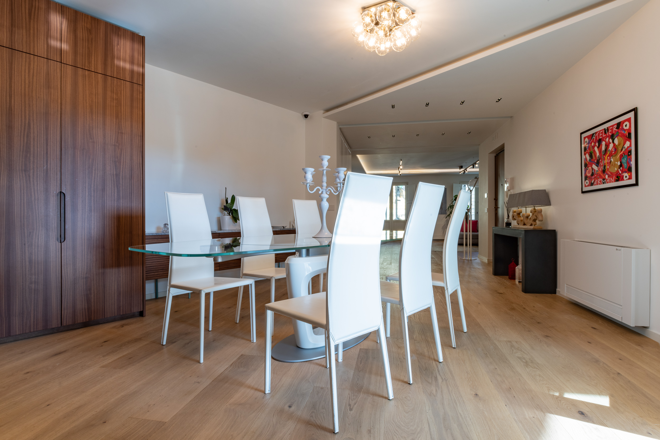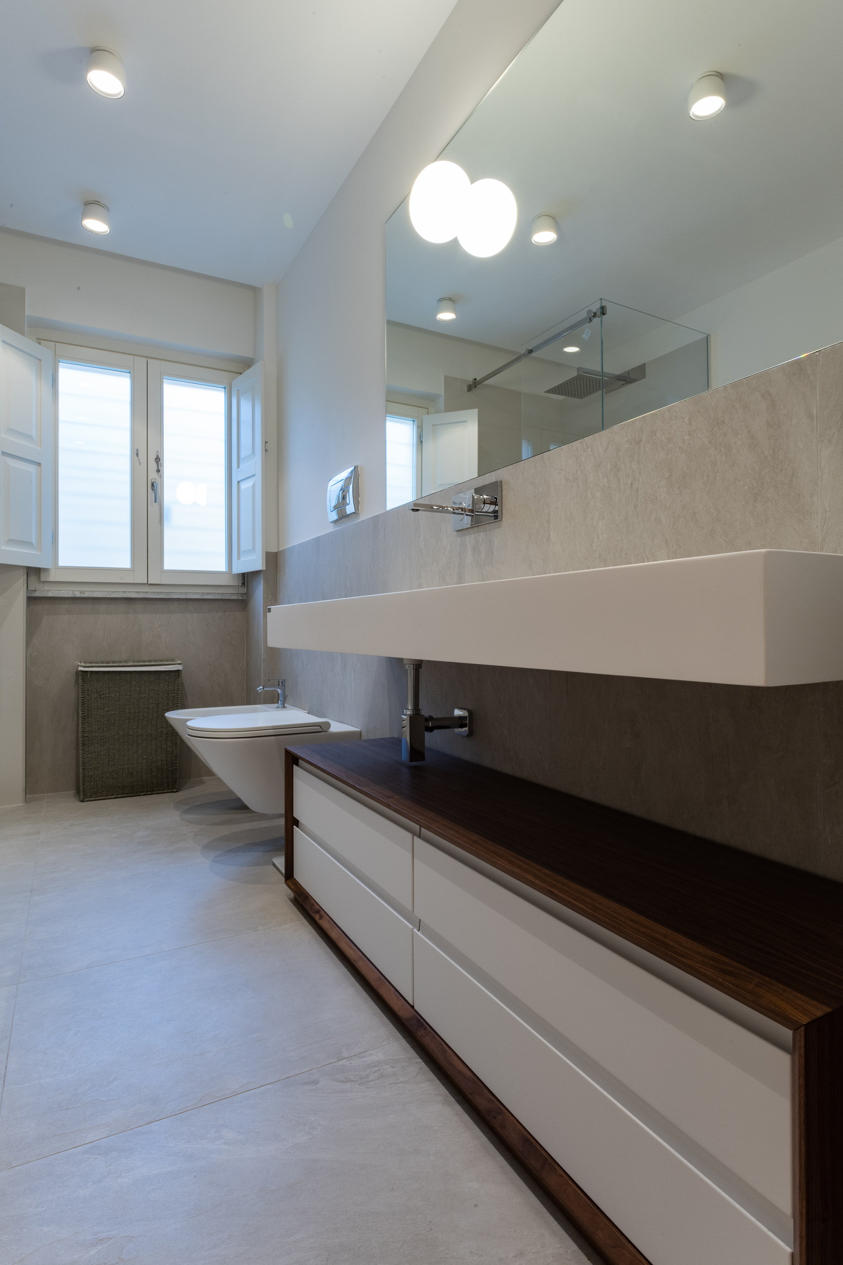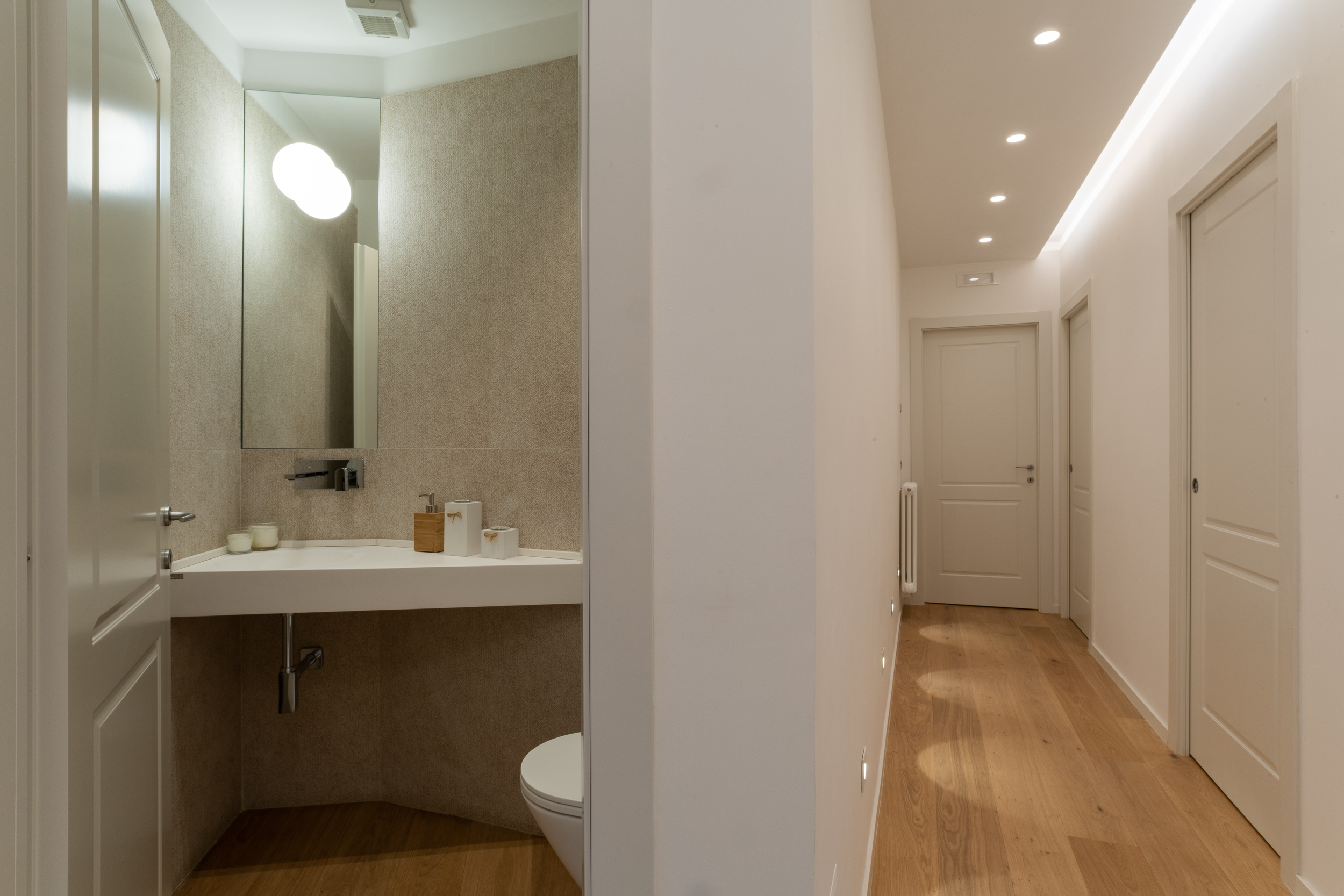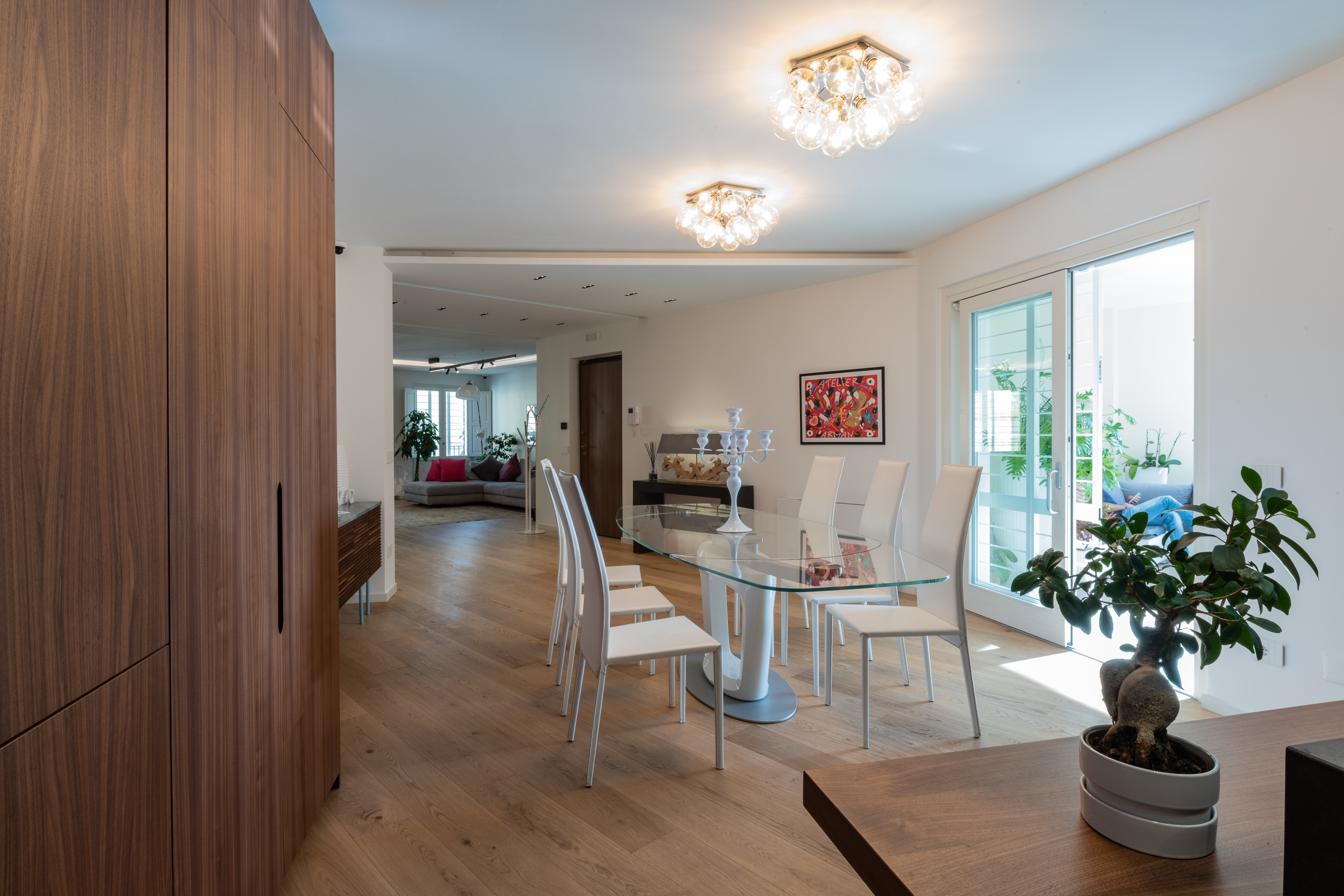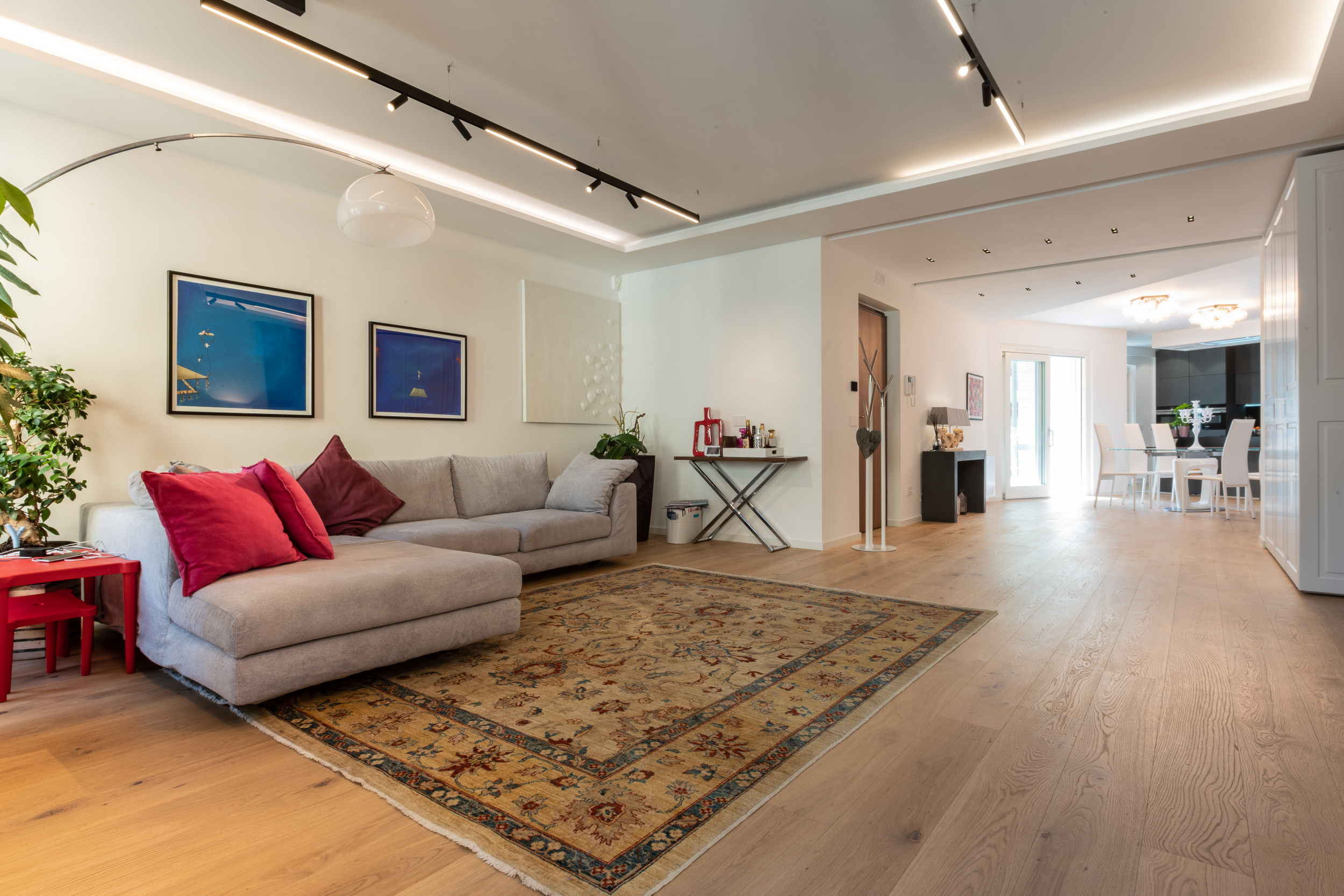 L’abitazione è stata rifinita in stile contemporaneo, con un gusto ne classico ne moderno ma dove suggestioni del passaggio con intuizioni futuristiche si sposano bene per rendere l’ambiente vivibile e piacevole. Per sottolineare la natura di questo stile abbiamo lavorato sull’impianto illumino-tecnico e progettato arredi dallo stile classico con materiali quali noce canaletto e metallo. Lo stile contemporaeno è sottolineato anche dalla scelta dei materiali, com e il parquet in quasi tutti gli ambienti.