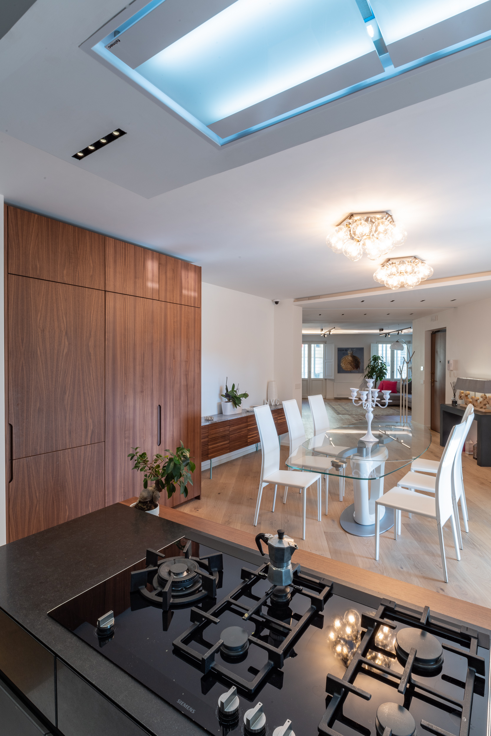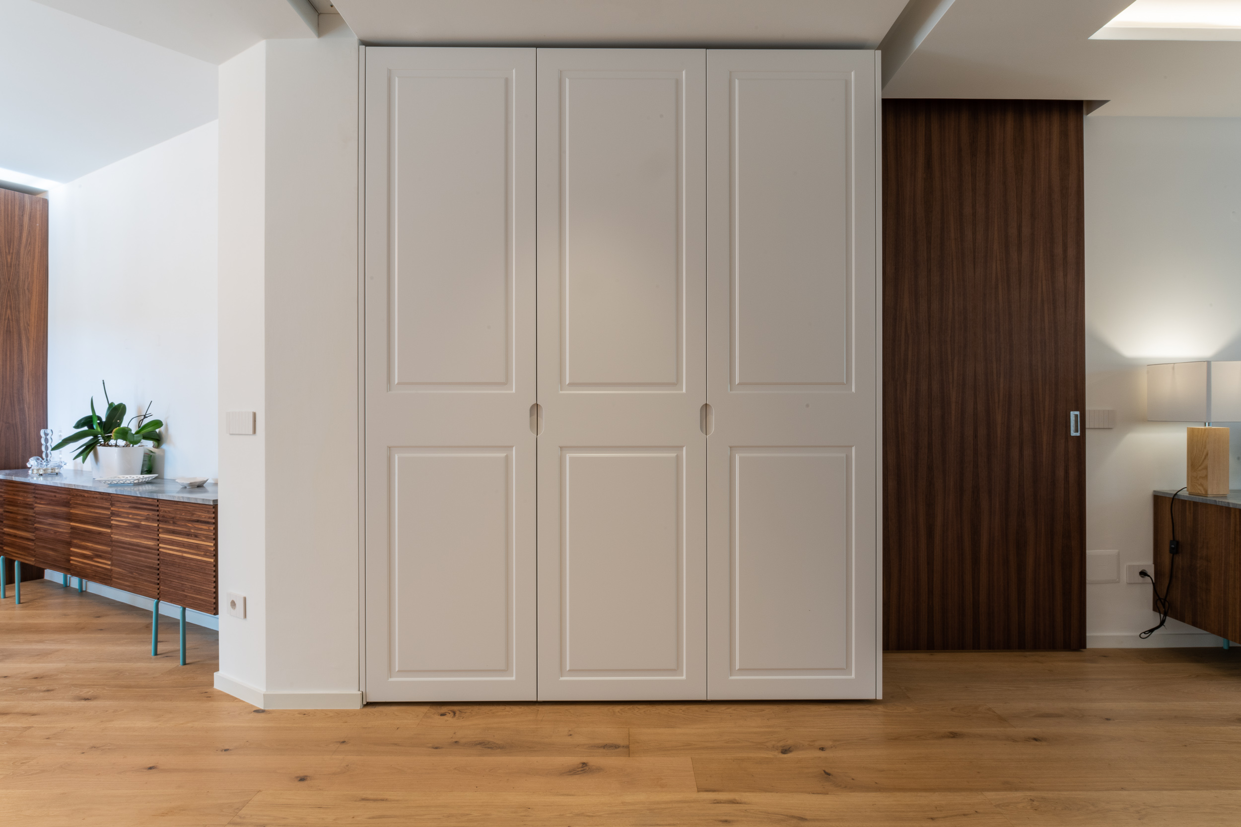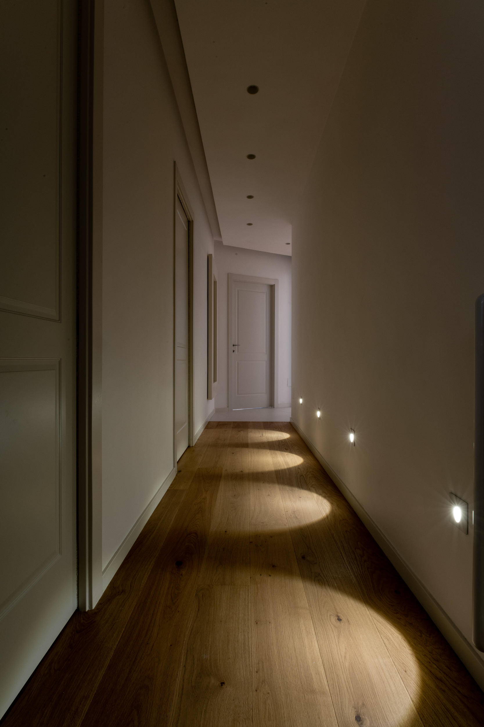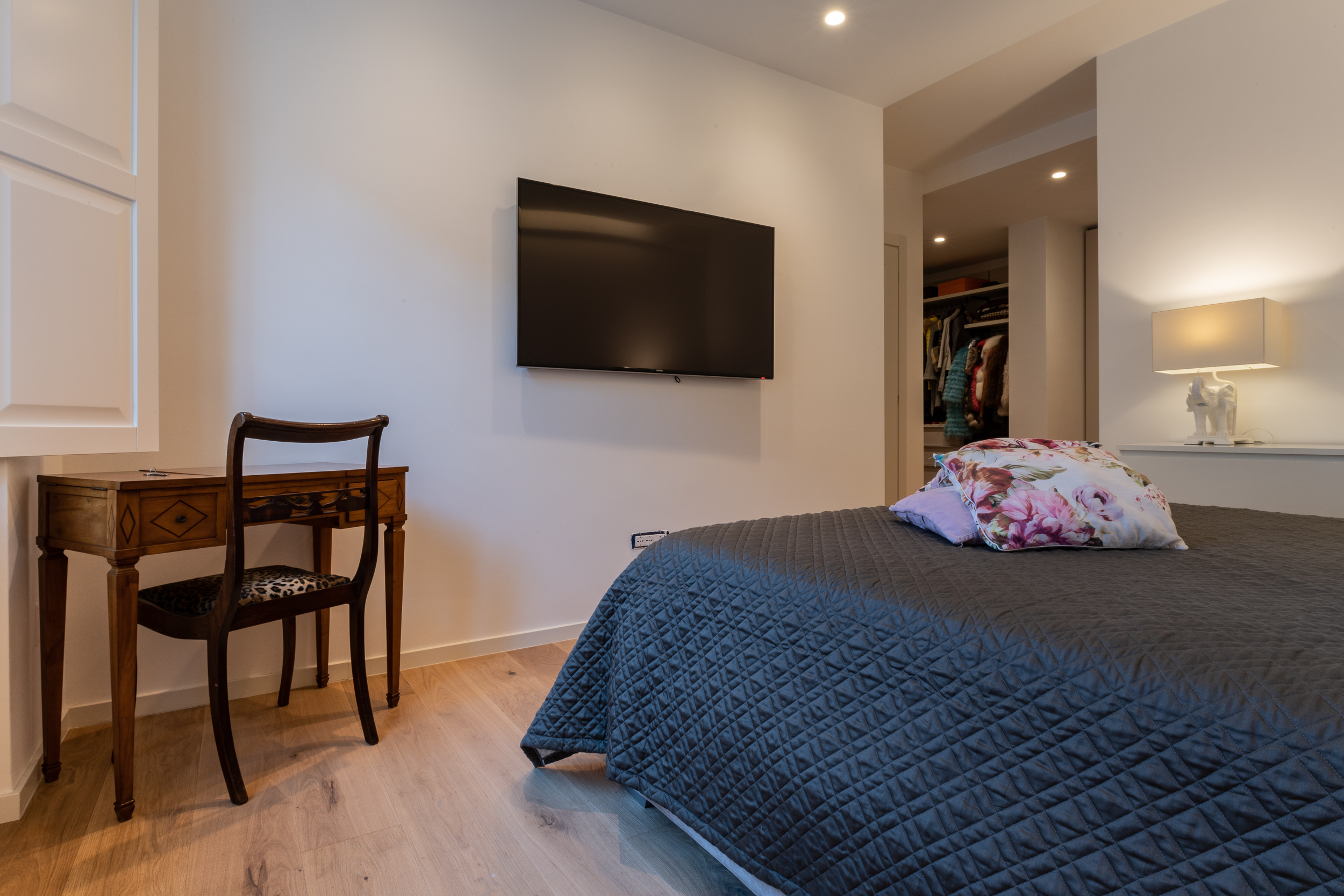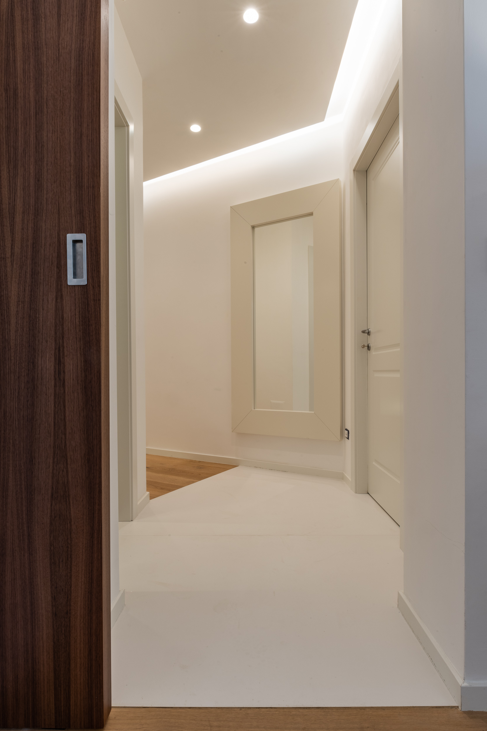 L’abitazione è stata rifinita in stile contemporaneo, con un gusto ne classico ne moderno ma dove suggestioni del passaggio con intuizioni futuristiche si sposano bene per rendere l’ambiente vivibile e piacevole. Per sottolineare la natura di questo stile abbiamo lavorato sull’impianto illumino-tecnico e progettato arredi dallo stile classico con materiali quali noce canaletto e metallo. Lo stile contemporaeno è sottolineato anche dalla scelta dei materiali, com e il parquet in quasi tutti gli ambienti.