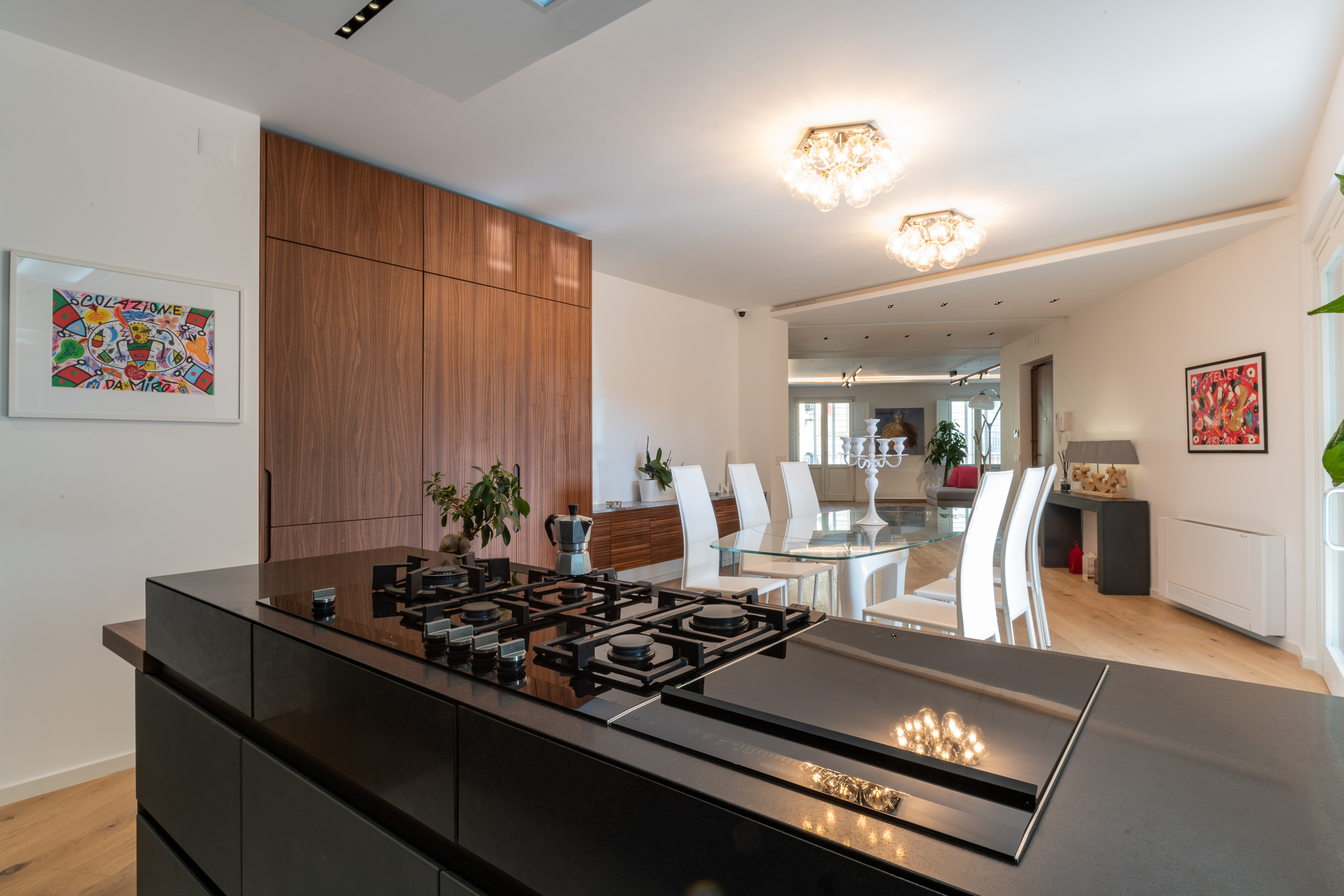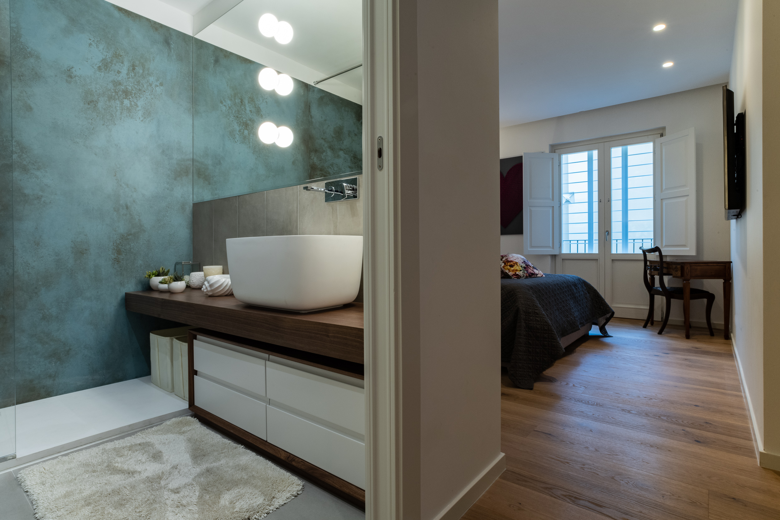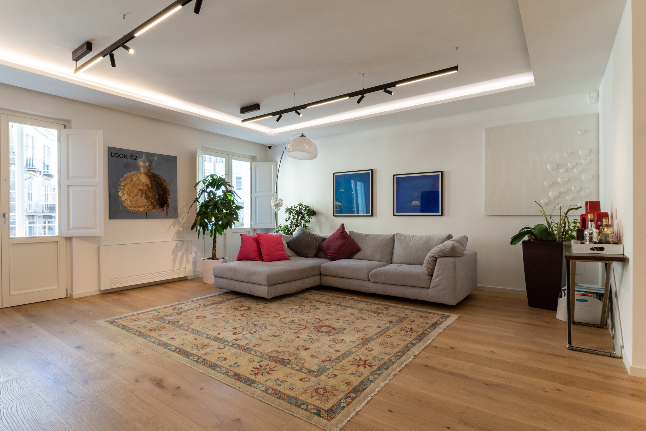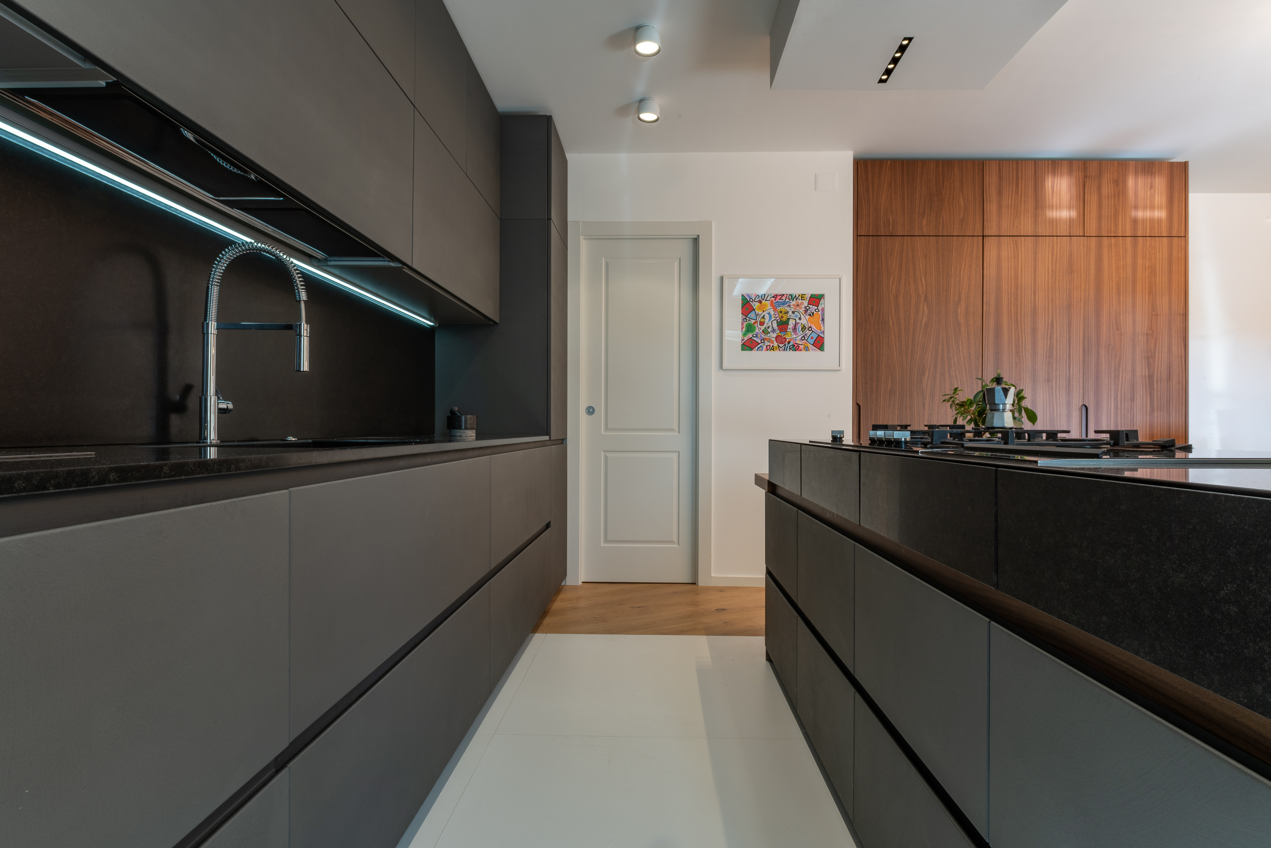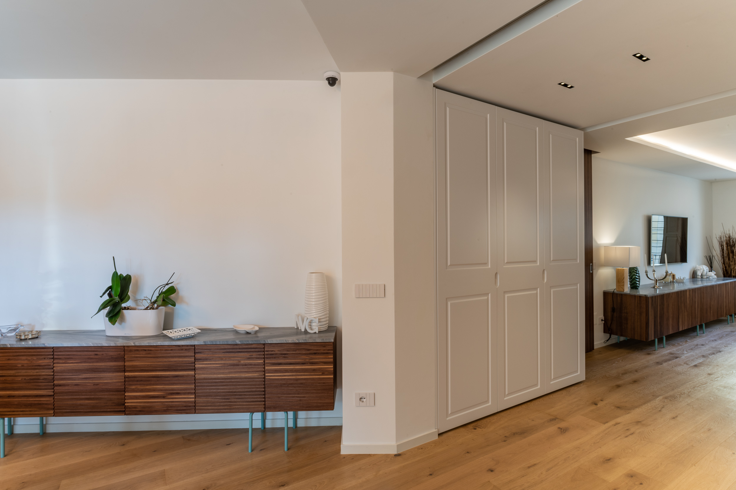 L’abitazione è stata rifinita in stile contemporaneo, con un gusto ne classico ne moderno ma dove suggestioni del passaggio con intuizioni futuristiche si sposano bene per rendere l’ambiente vivibile e piacevole. Per sottolineare la natura di questo stile abbiamo lavorato sull’impianto illumino-tecnico e progettato arredi dallo stile classico con materiali quali noce canaletto e metallo. Lo stile contemporaeno è sottolineato anche dalla scelta dei materiali, com e il parquet in quasi tutti gli ambienti.