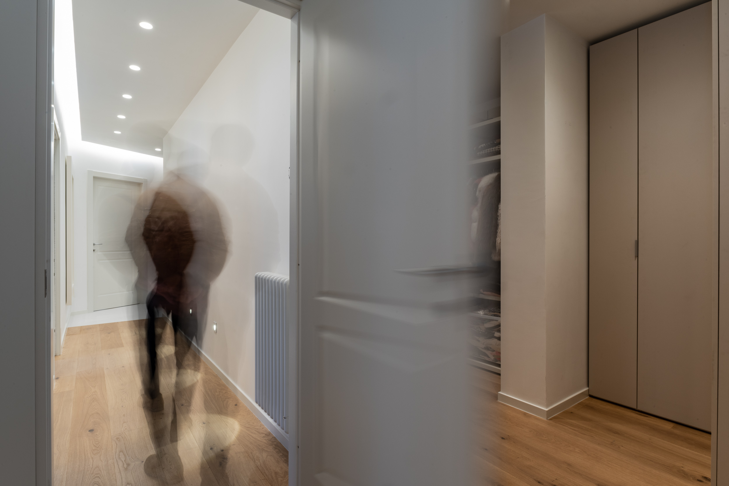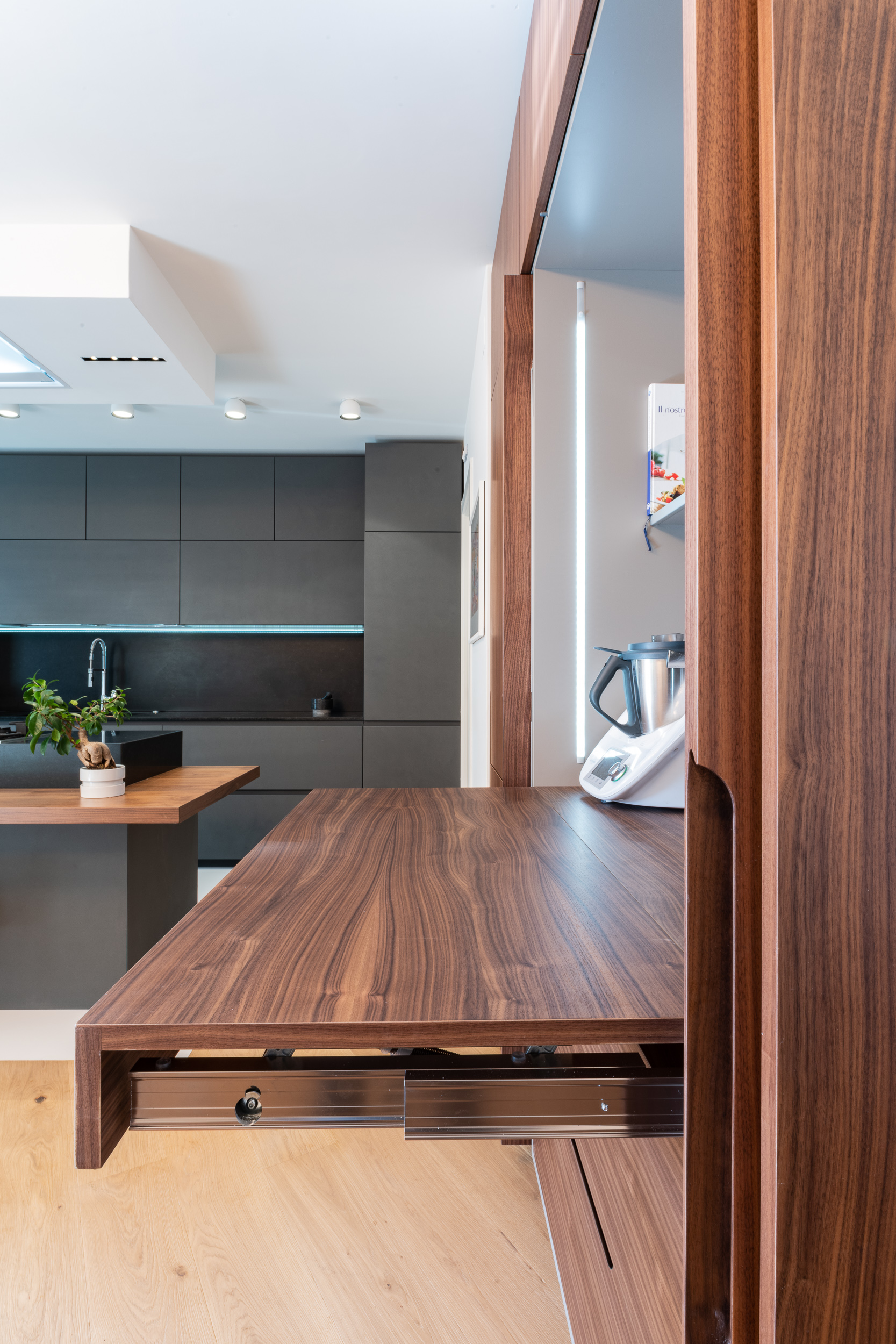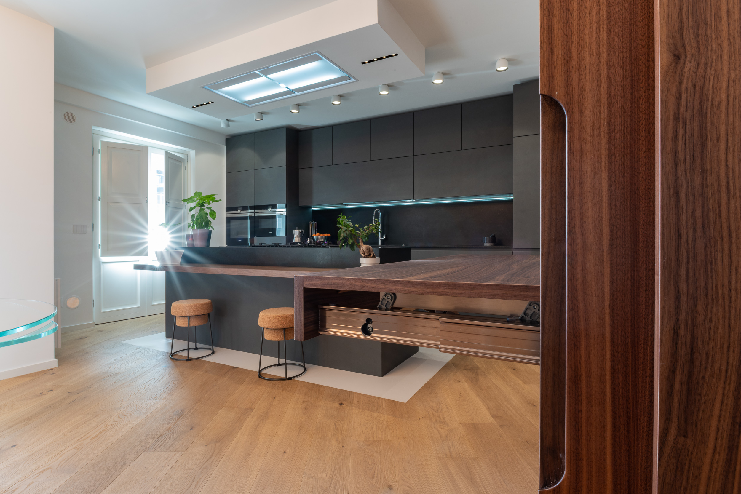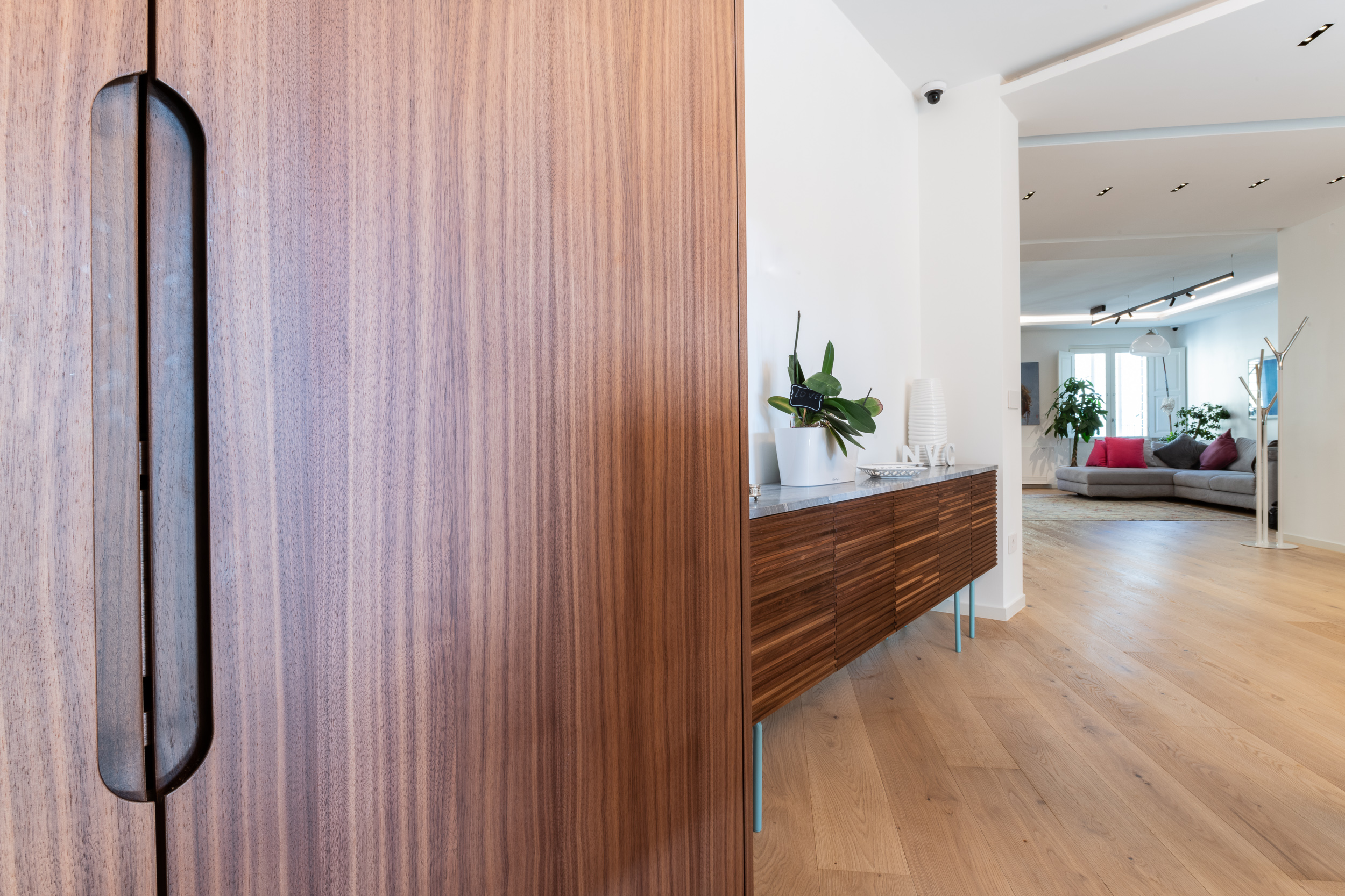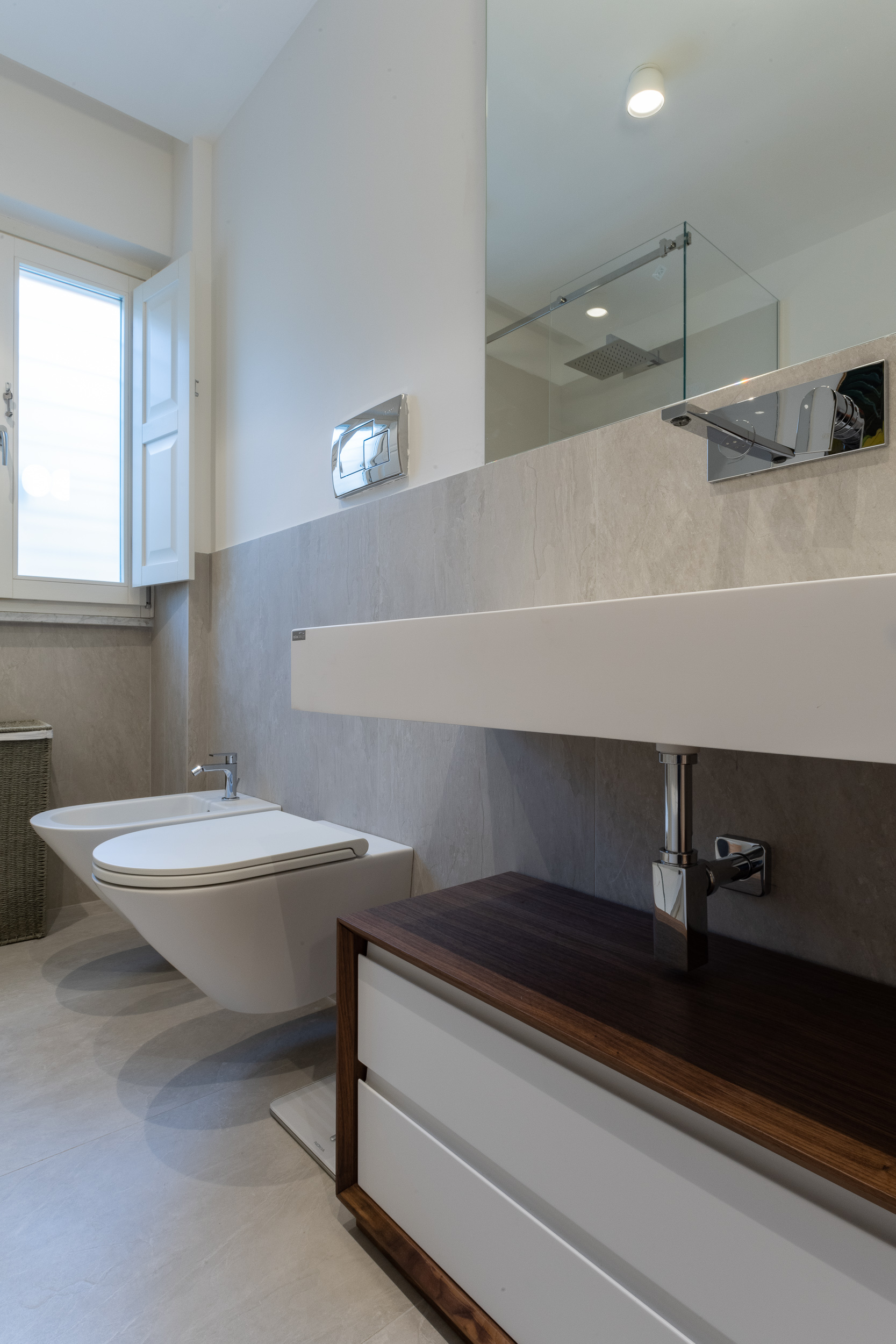 L’abitazione è stata rifinita in stile contemporaneo, con un gusto ne classico ne moderno ma dove suggestioni del passaggio con intuizioni futuristiche si sposano bene per rendere l’ambiente vivibile e piacevole. Per sottolineare la natura di questo stile abbiamo lavorato sull’impianto illumino-tecnico e progettato arredi dallo stile classico con materiali quali noce canaletto e metallo. Lo stile contemporaeno è sottolineato anche dalla scelta dei materiali, com e il parquet in quasi tutti gli ambienti.