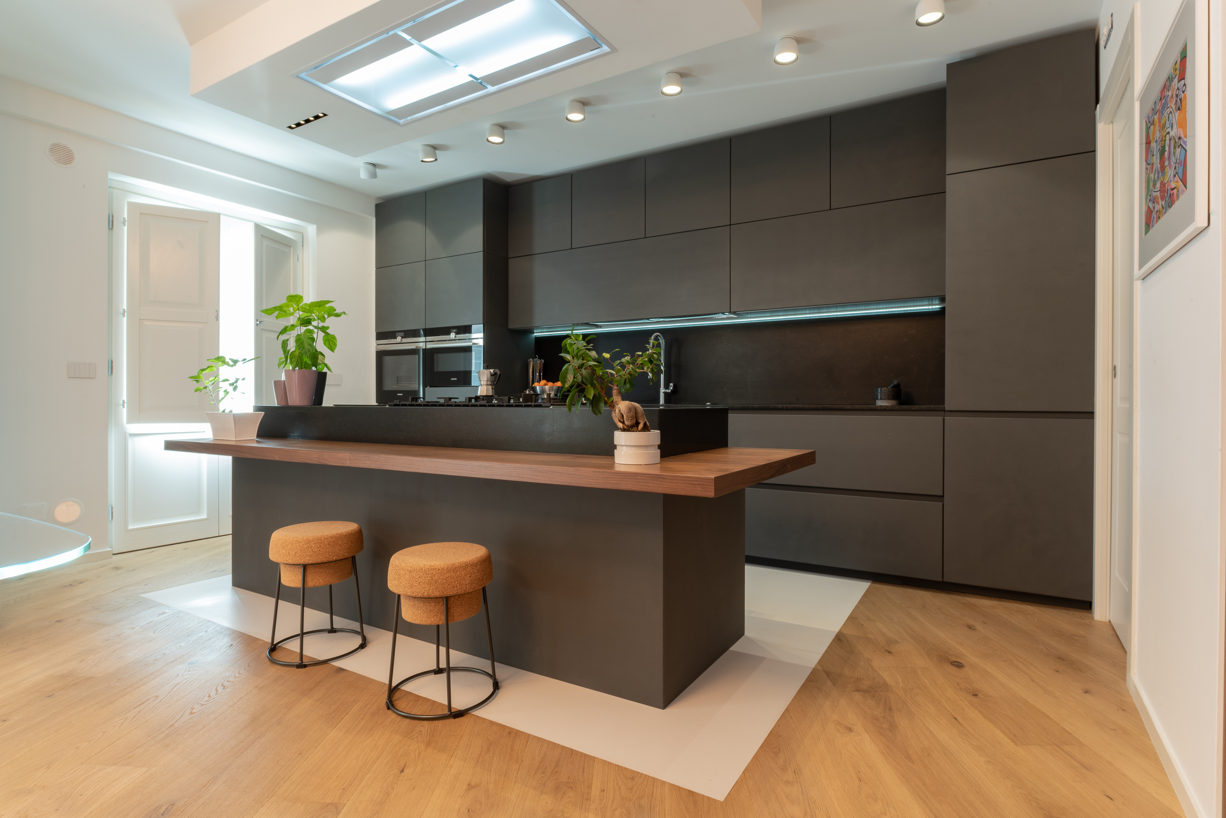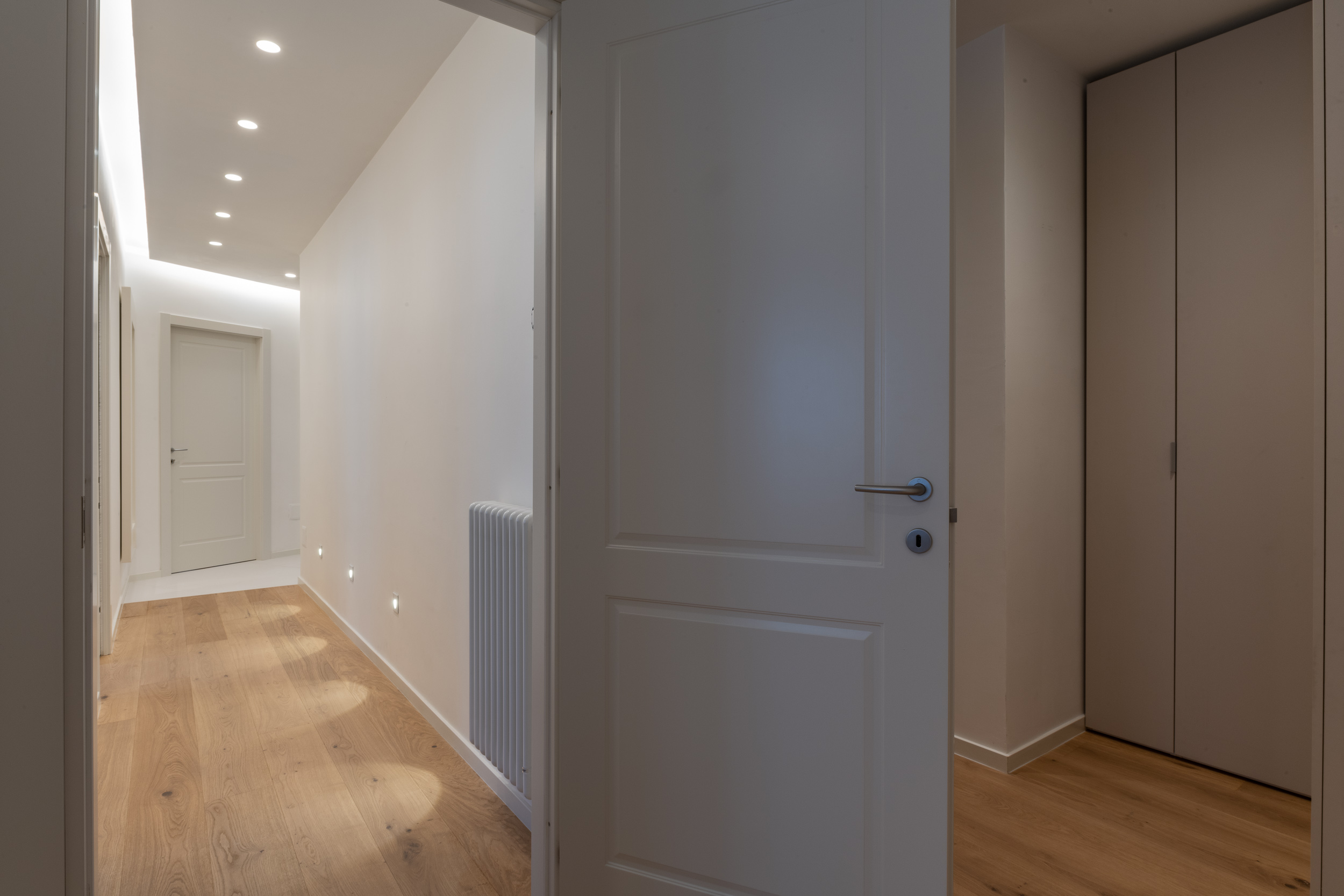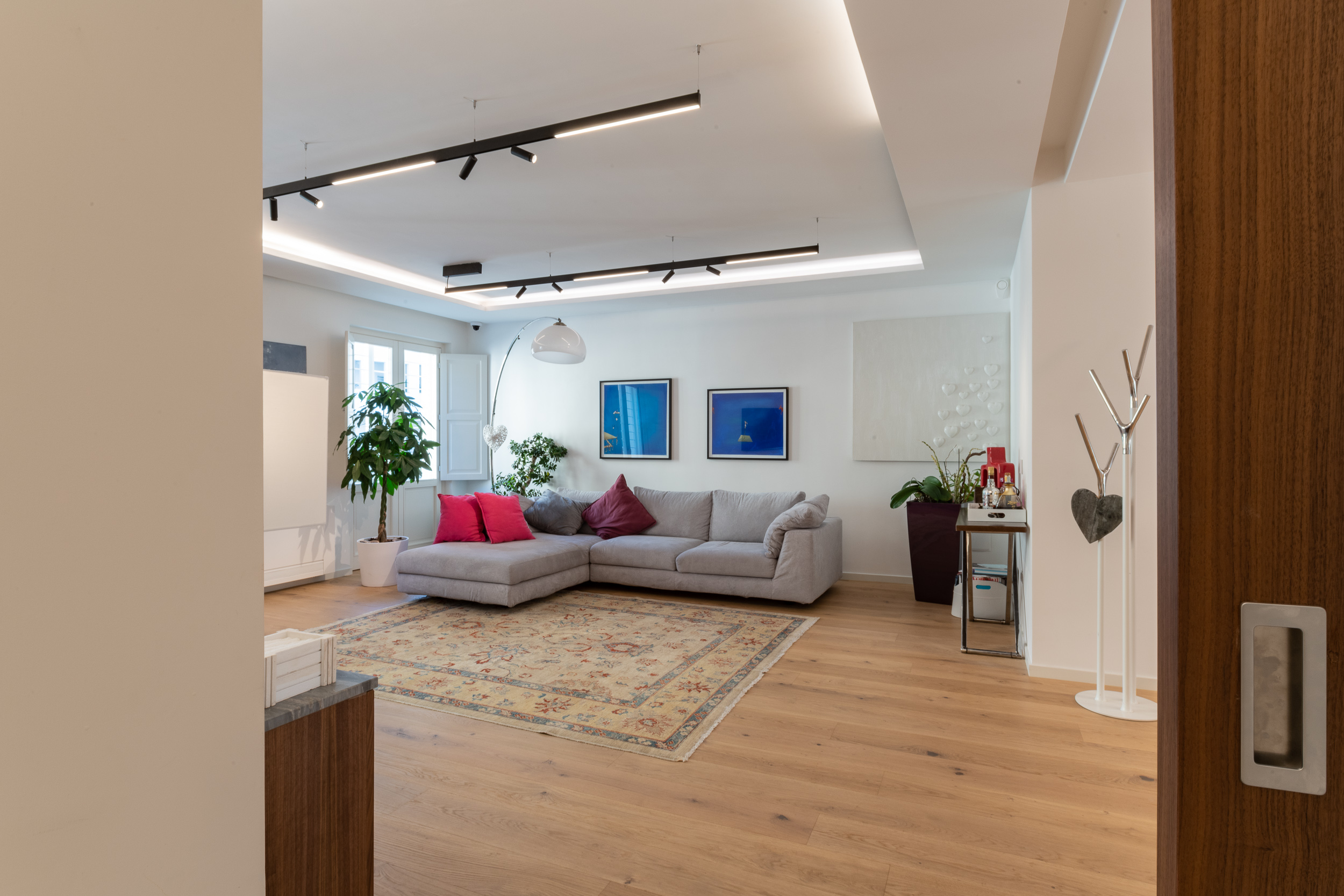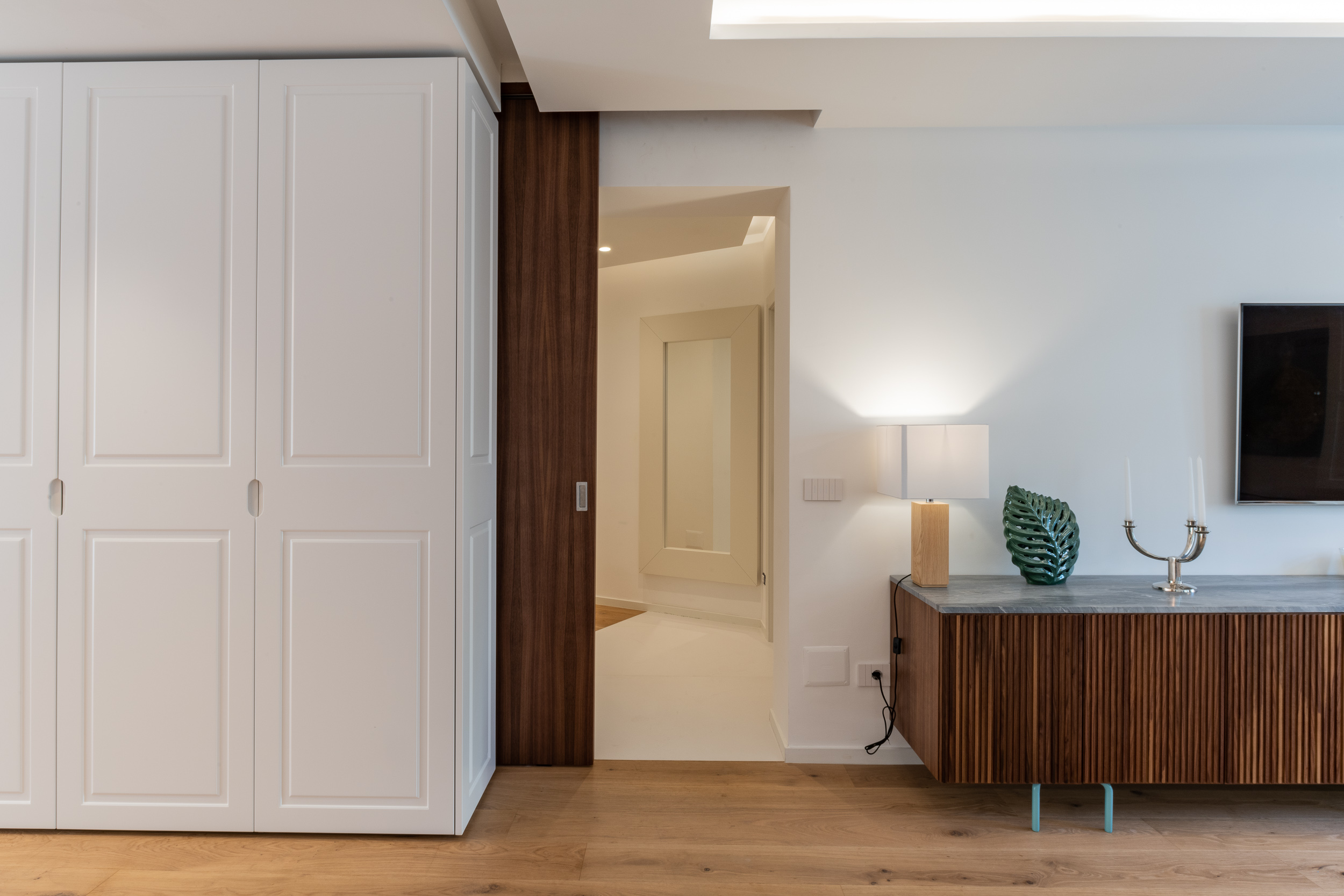 L’abitazione è stata rifinita in stile contemporaneo, con un gusto ne classico ne moderno ma dove suggestioni del passaggio con intuizioni futuristiche si sposano bene per rendere l’ambiente vivibile e piacevole. Per sottolineare la natura di questo stile abbiamo lavorato sull’impianto illumino-tecnico e progettato arredi dallo stile classico con materiali quali noce canaletto e metallo. Lo stile contemporaeno è sottolineato anche dalla scelta dei materiali, com e il parquet in quasi tutti gli ambienti.