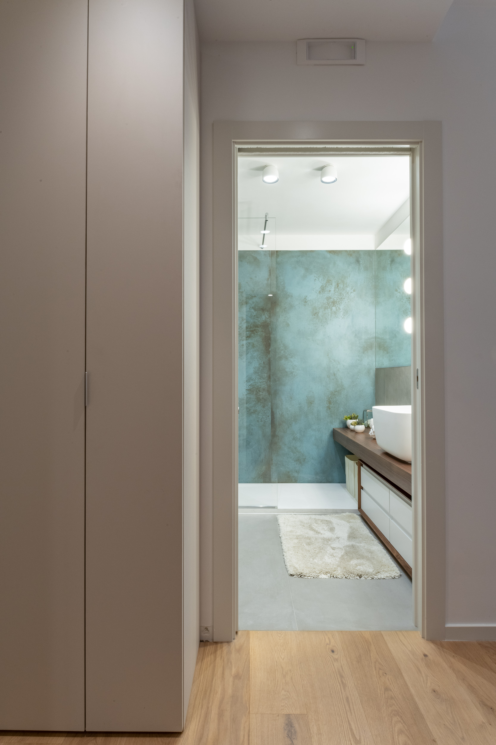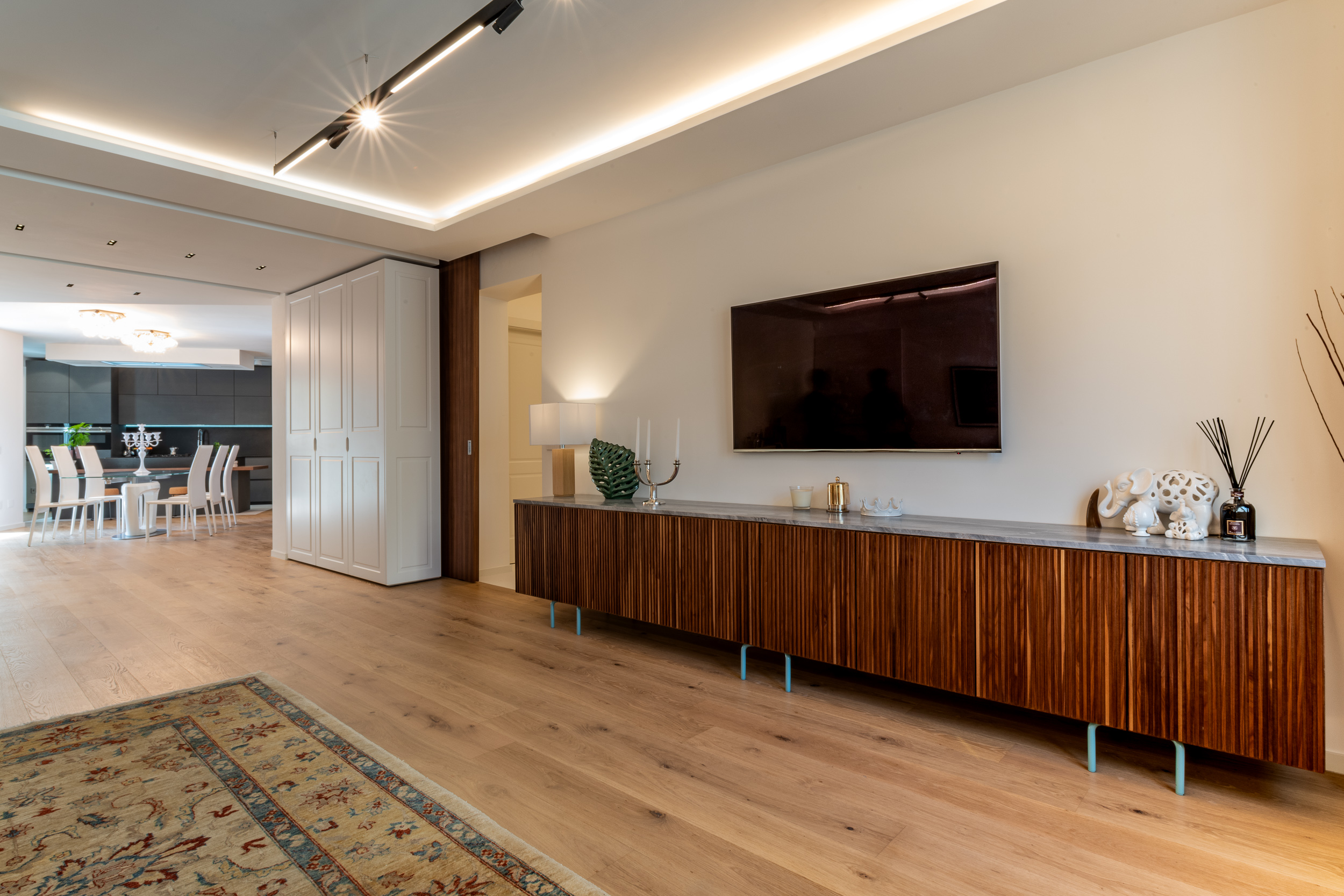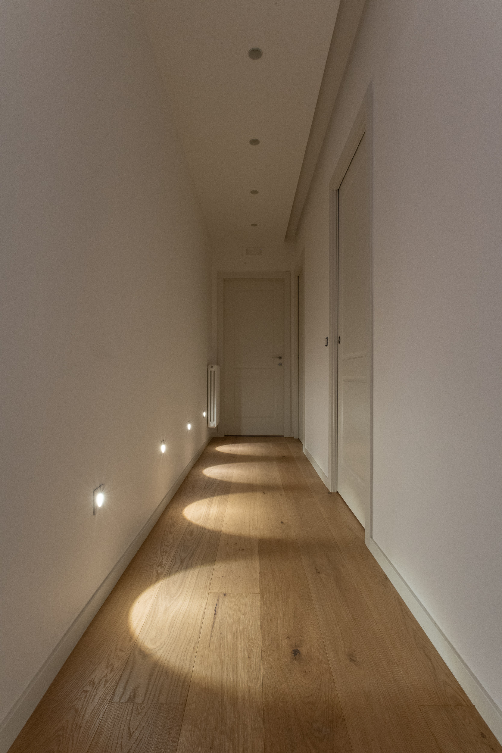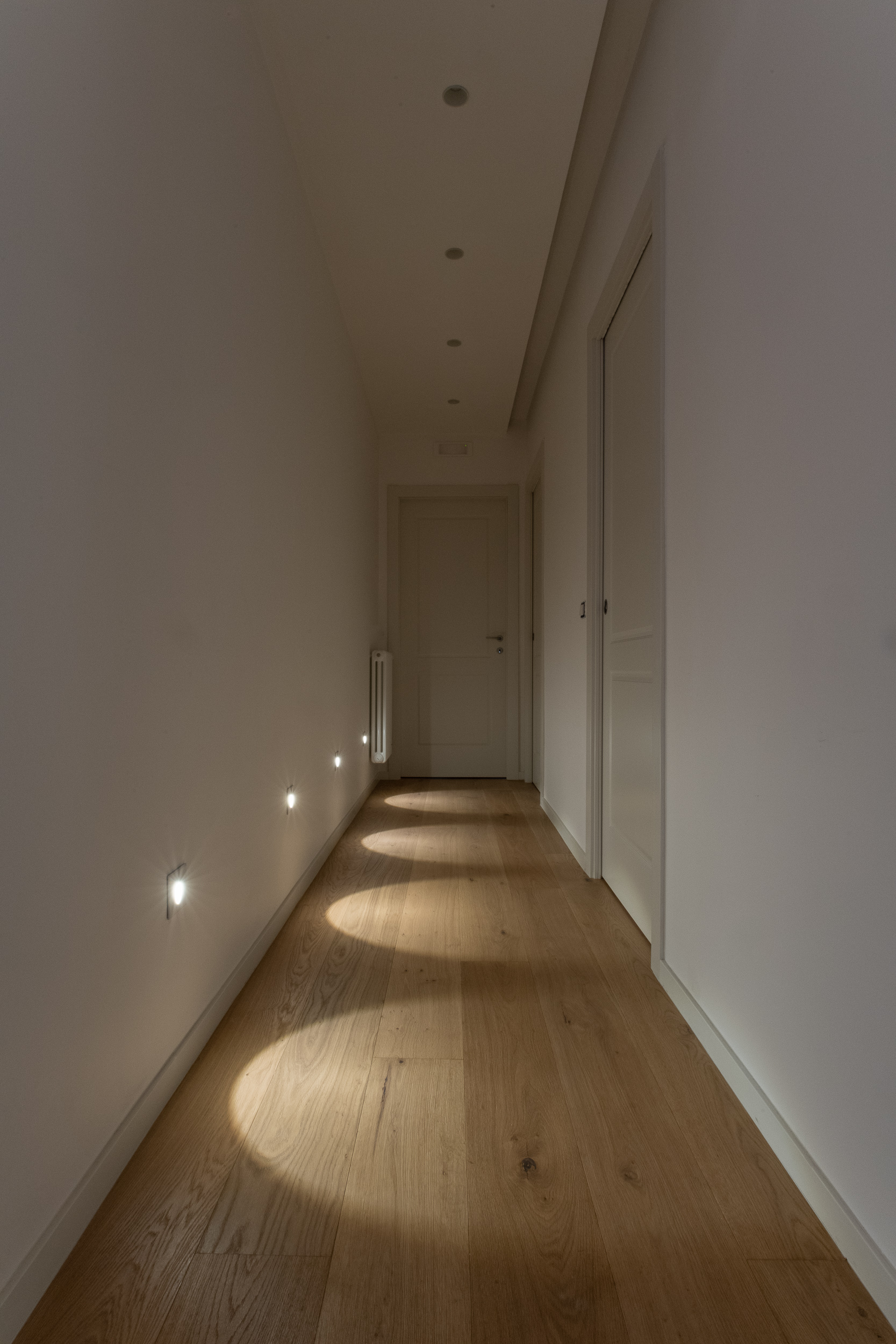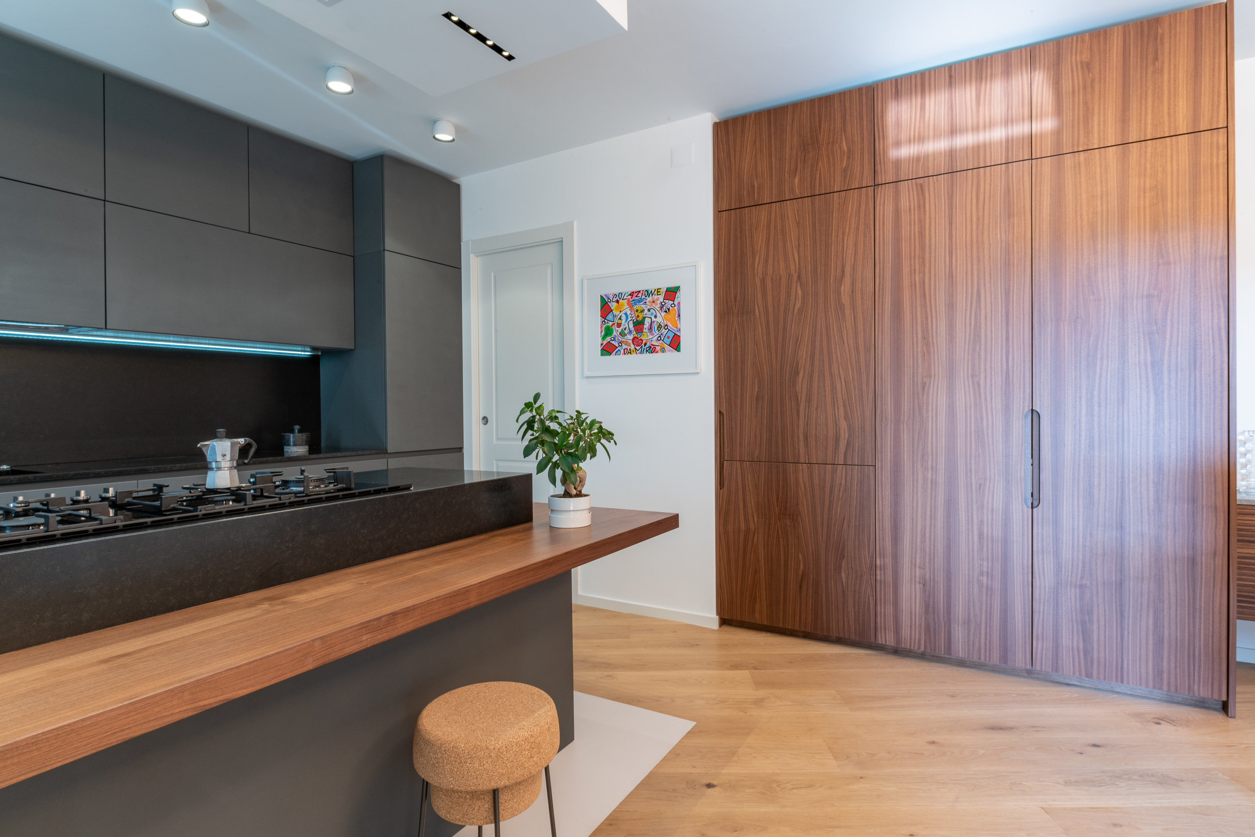 L’abitazione è stata rifinita in stile contemporaneo, con un gusto ne classico ne moderno ma dove suggestioni del passaggio con intuizioni futuristiche si sposano bene per rendere l’ambiente vivibile e piacevole. Per sottolineare la natura di questo stile abbiamo lavorato sull’impianto illumino-tecnico e progettato arredi dallo stile classico con materiali quali noce canaletto e metallo. Lo stile contemporaeno è sottolineato anche dalla scelta dei materiali, com e il parquet in quasi tutti gli ambienti.
