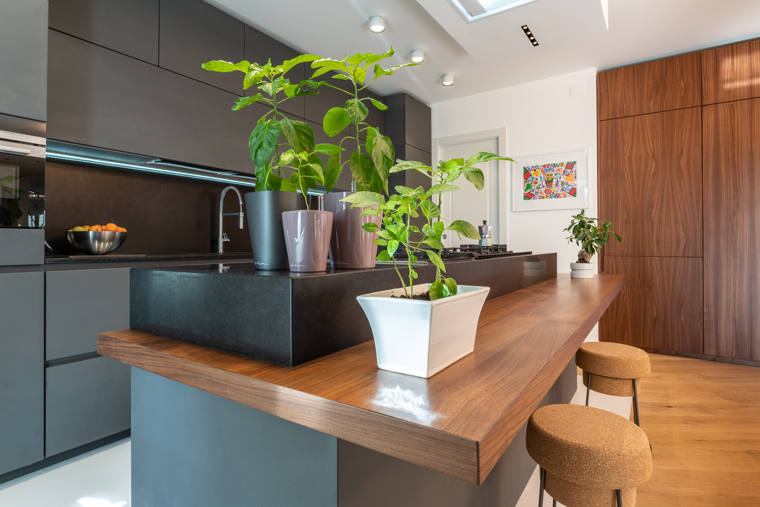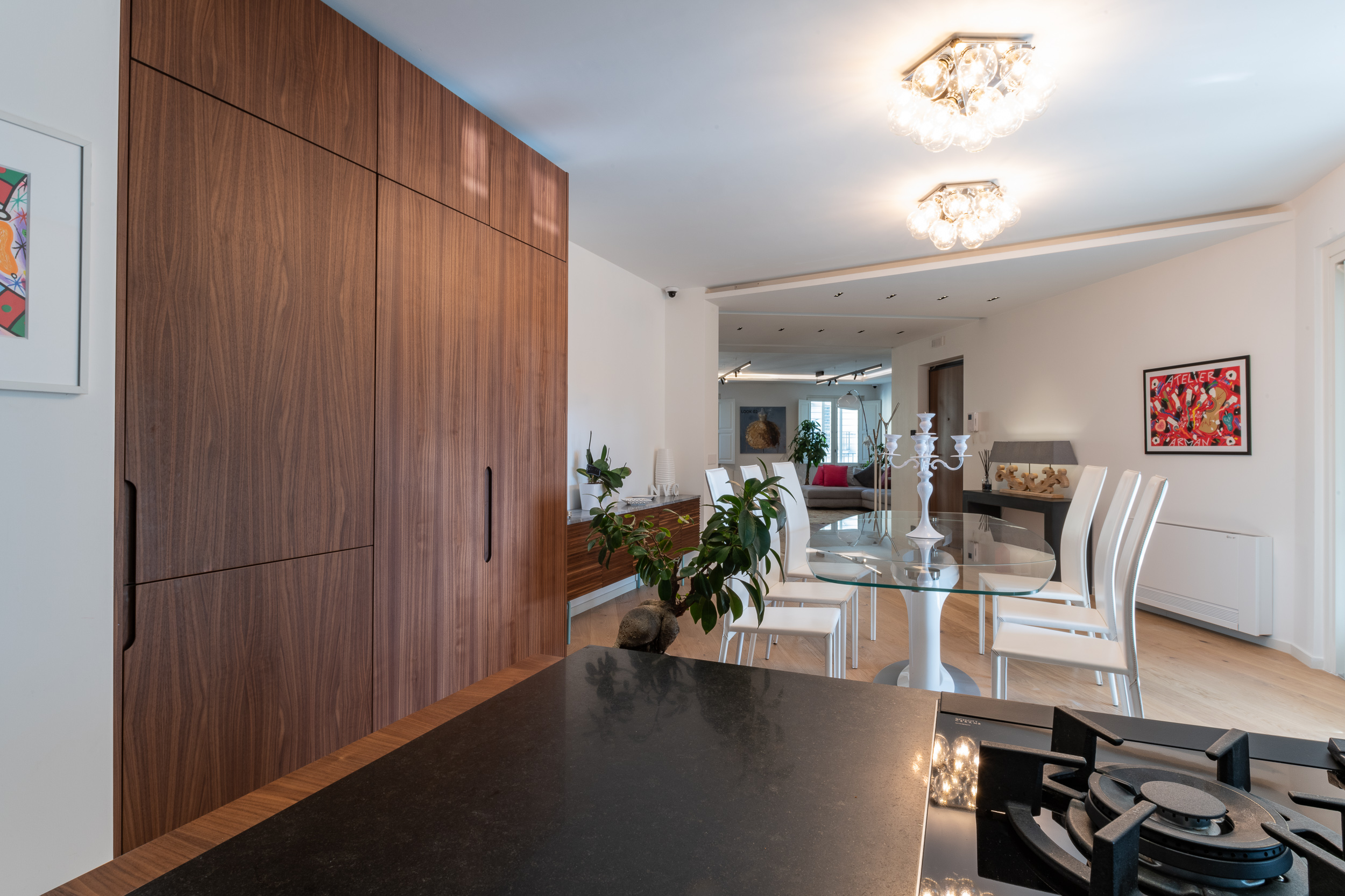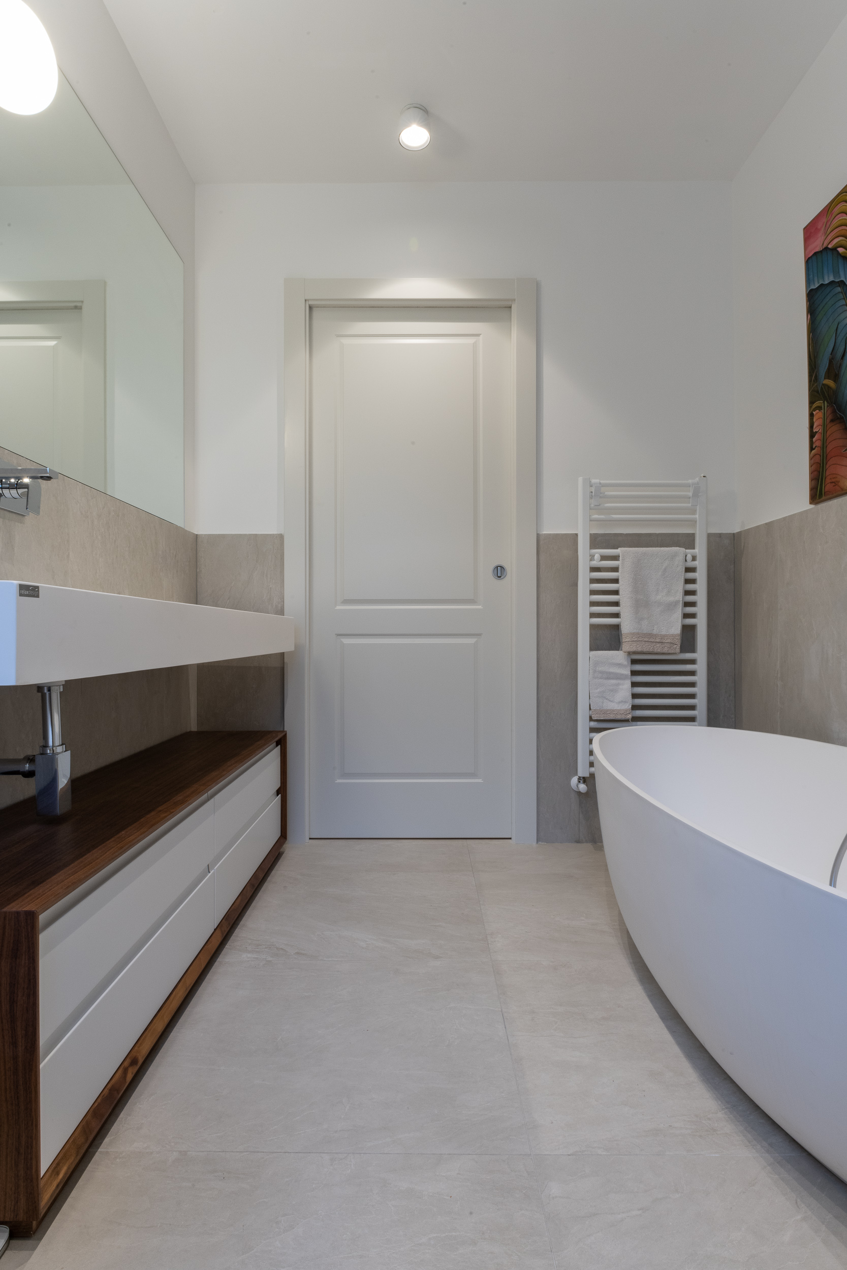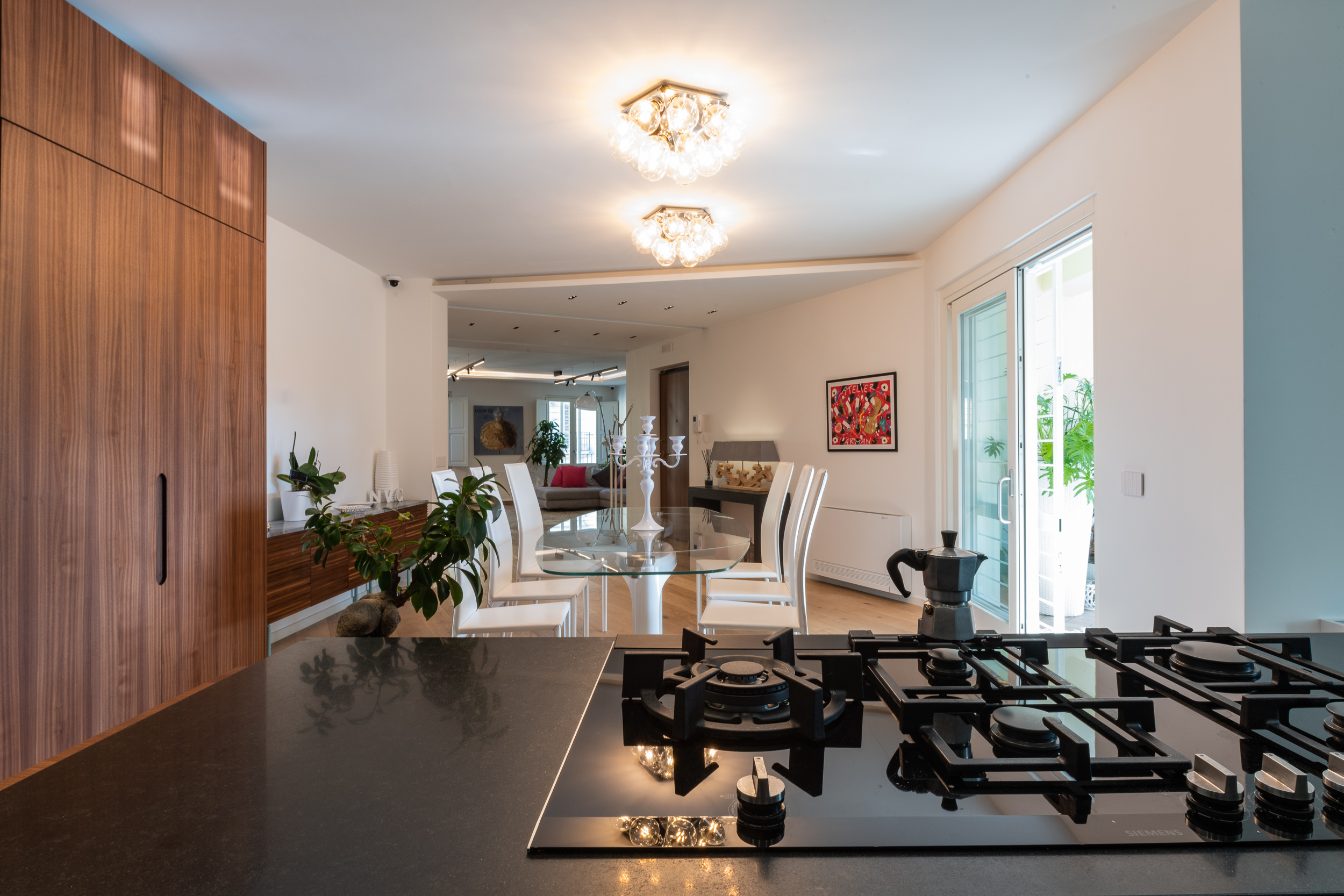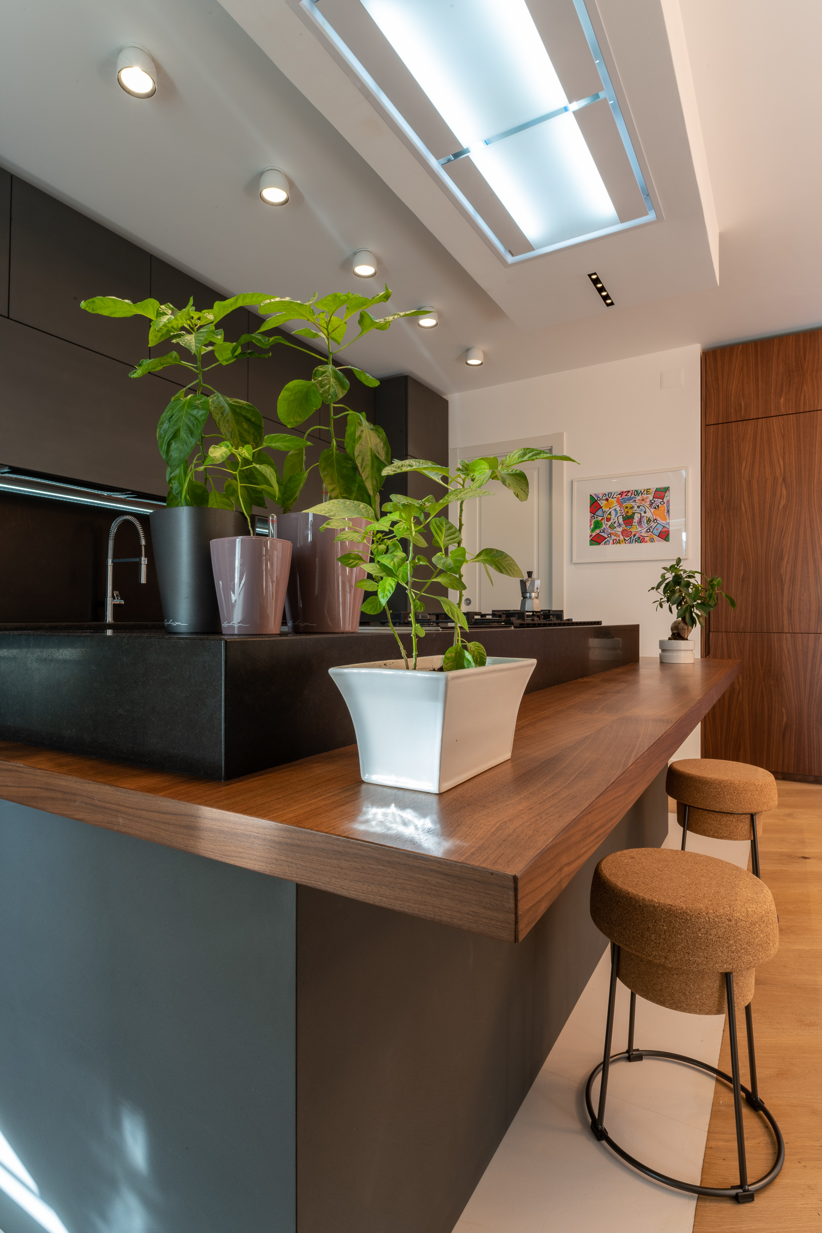 L’abitazione è stata rifinita in stile contemporaneo, con un gusto ne classico ne moderno ma dove suggestioni del passaggio con intuizioni futuristiche si sposano bene per rendere l’ambiente vivibile e piacevole. Per sottolineare la natura di questo stile abbiamo lavorato sull’impianto illumino-tecnico e progettato arredi dallo stile classico con materiali quali noce canaletto e metallo. Lo stile contemporaeno è sottolineato anche dalla scelta dei materiali, com e il parquet in quasi tutti gli ambienti.