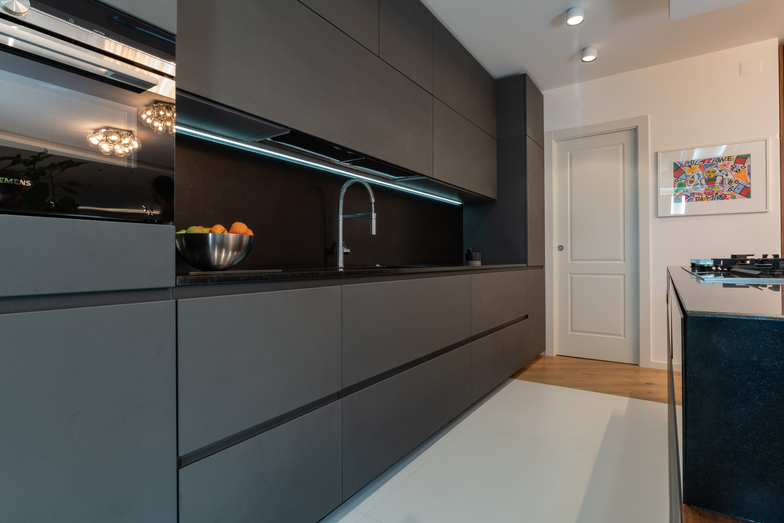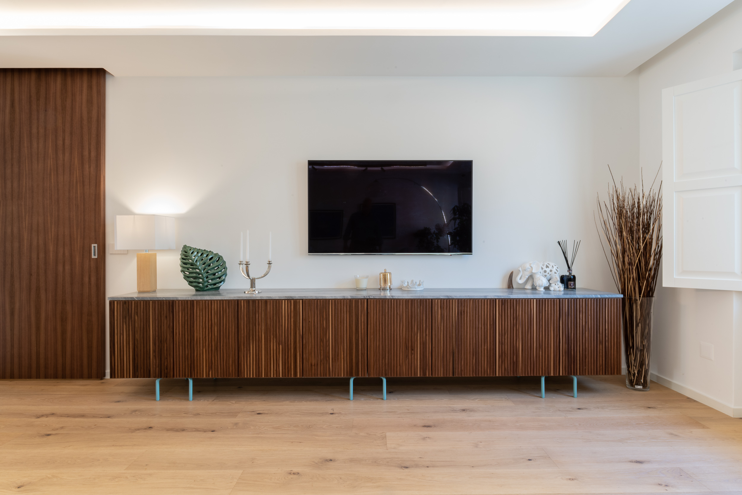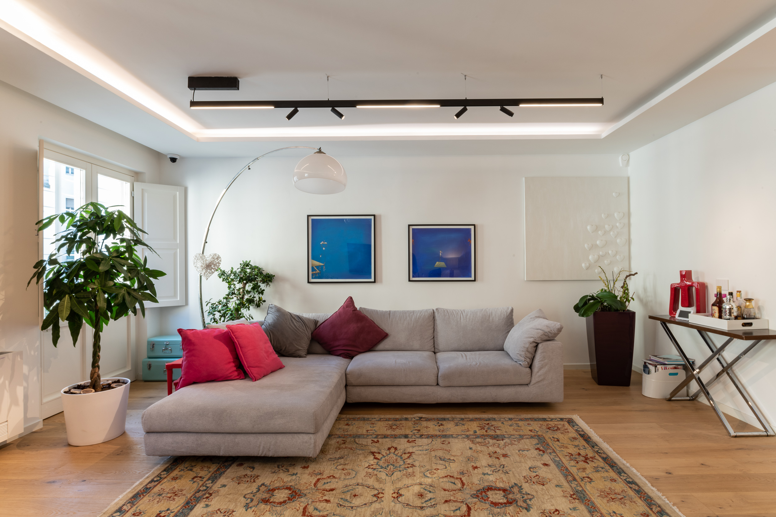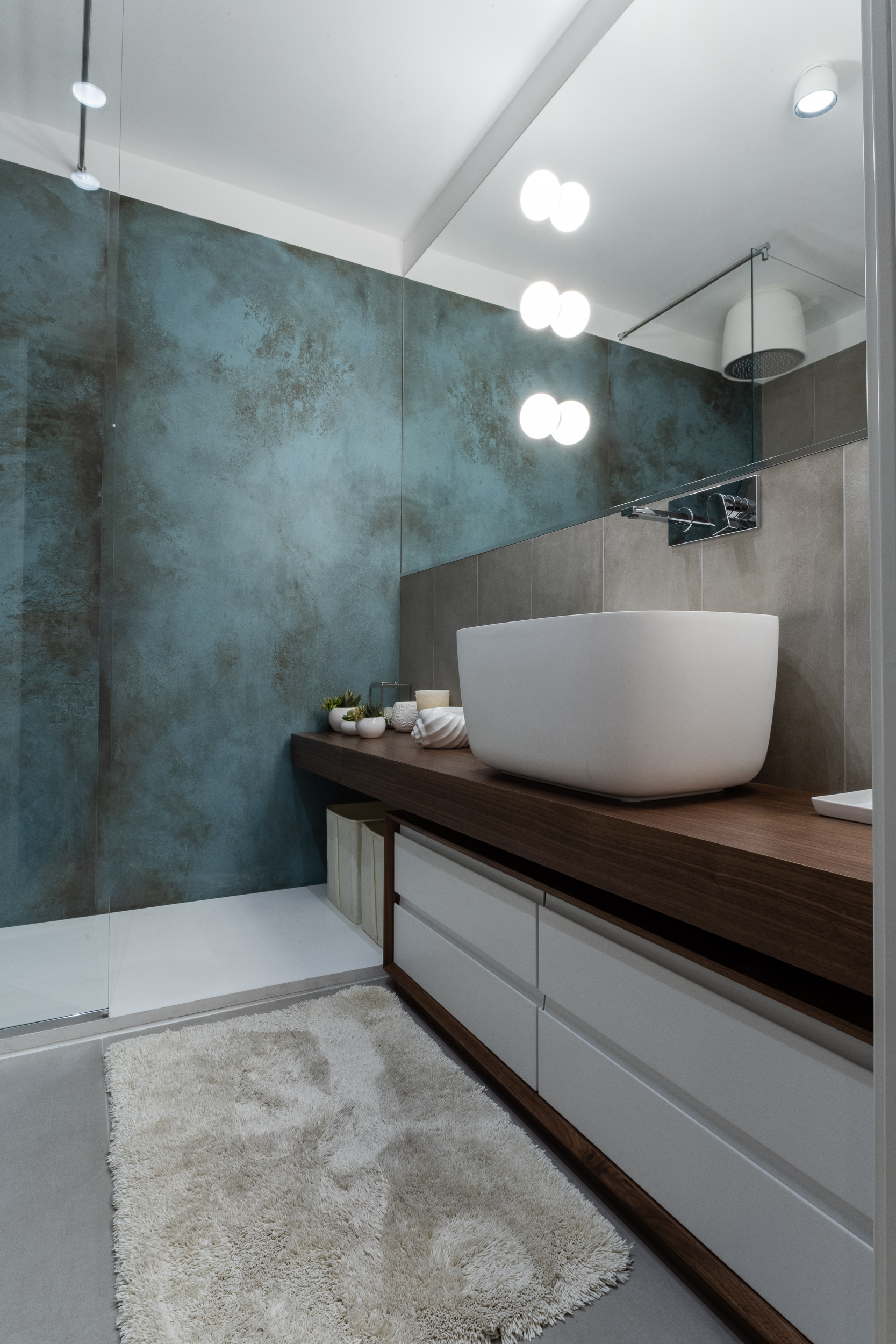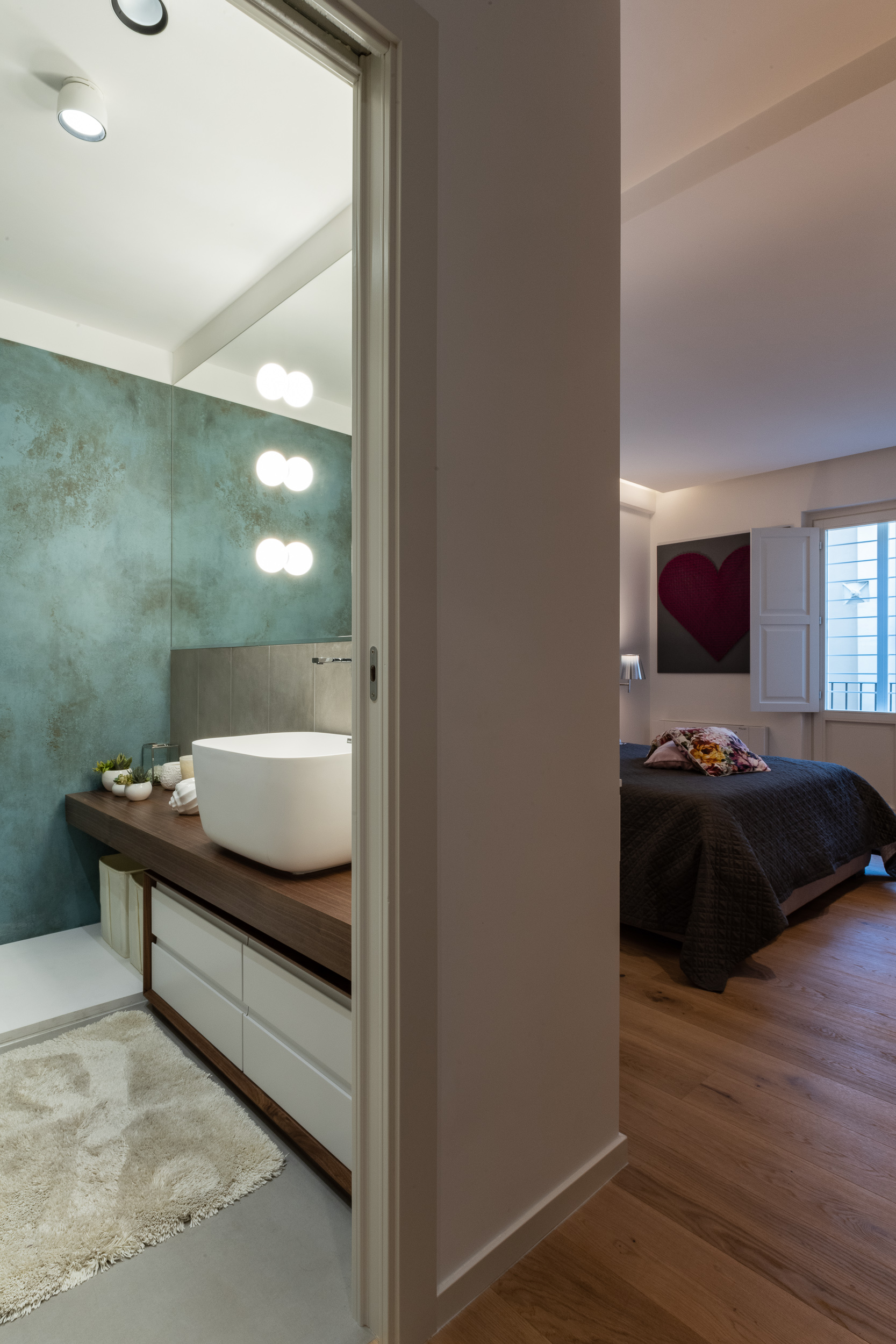 L’abitazione è stata rifinita in stile contemporaneo, con un gusto ne classico ne moderno ma dove suggestioni del passaggio con intuizioni futuristiche si sposano bene per rendere l’ambiente vivibile e piacevole. Per sottolineare la natura di questo stile abbiamo lavorato sull’impianto illumino-tecnico e progettato arredi dallo stile classico con materiali quali noce canaletto e metallo. Lo stile contemporaeno è sottolineato anche dalla scelta dei materiali, com e il parquet in quasi tutti gli ambienti.