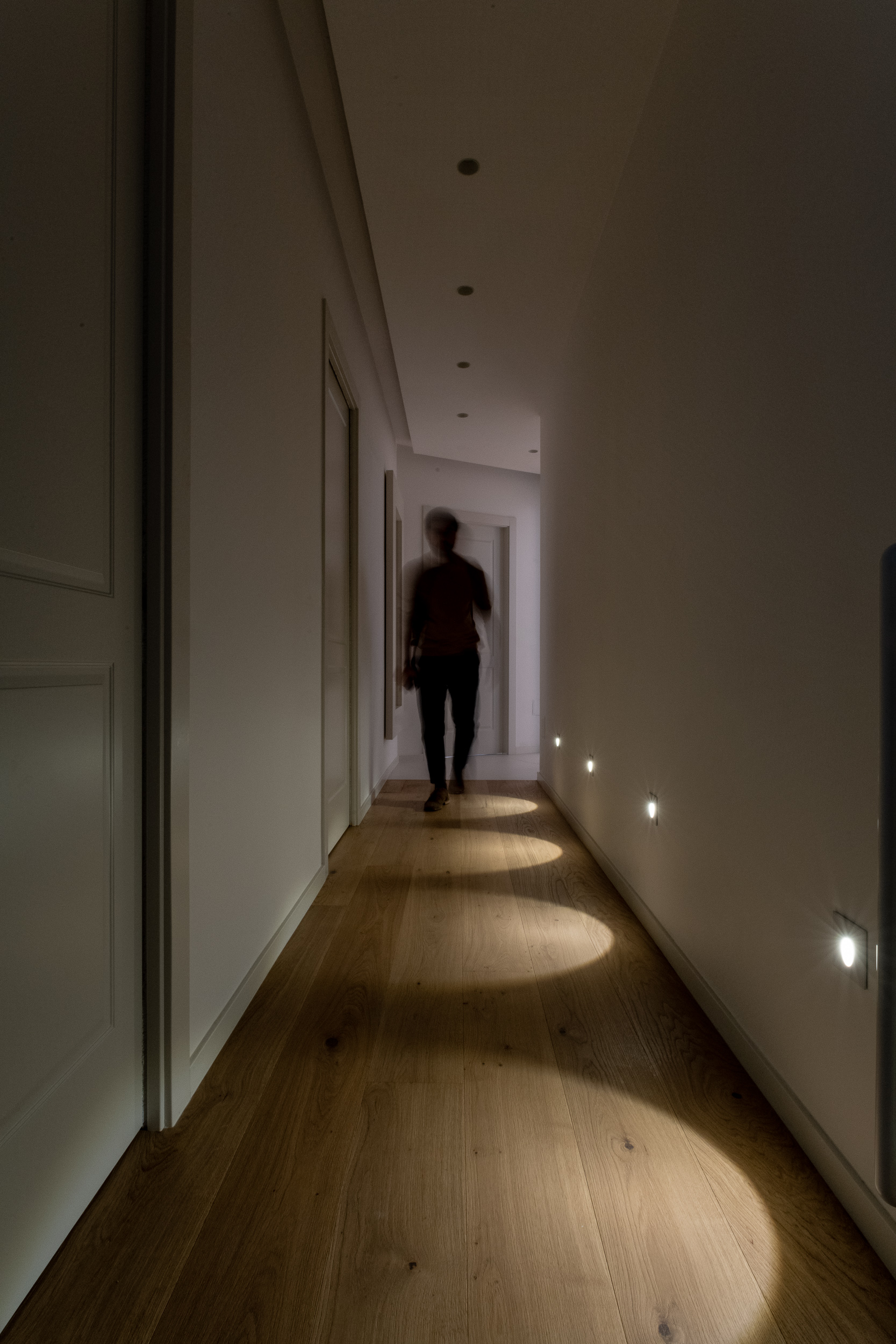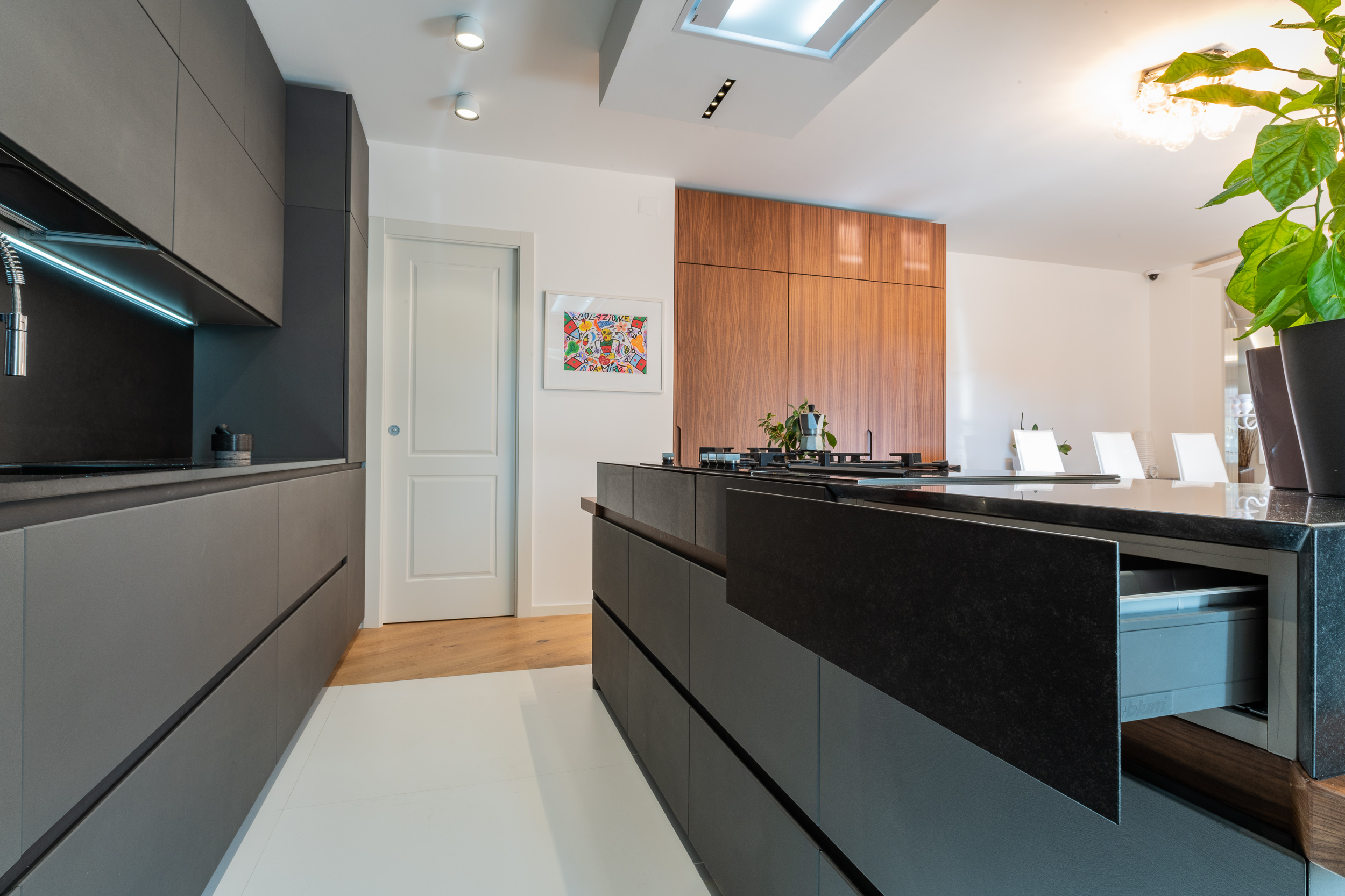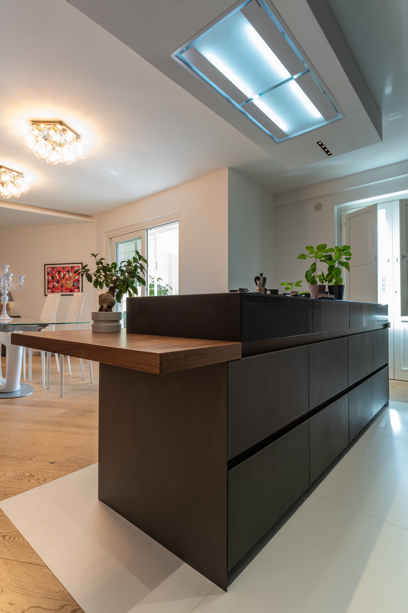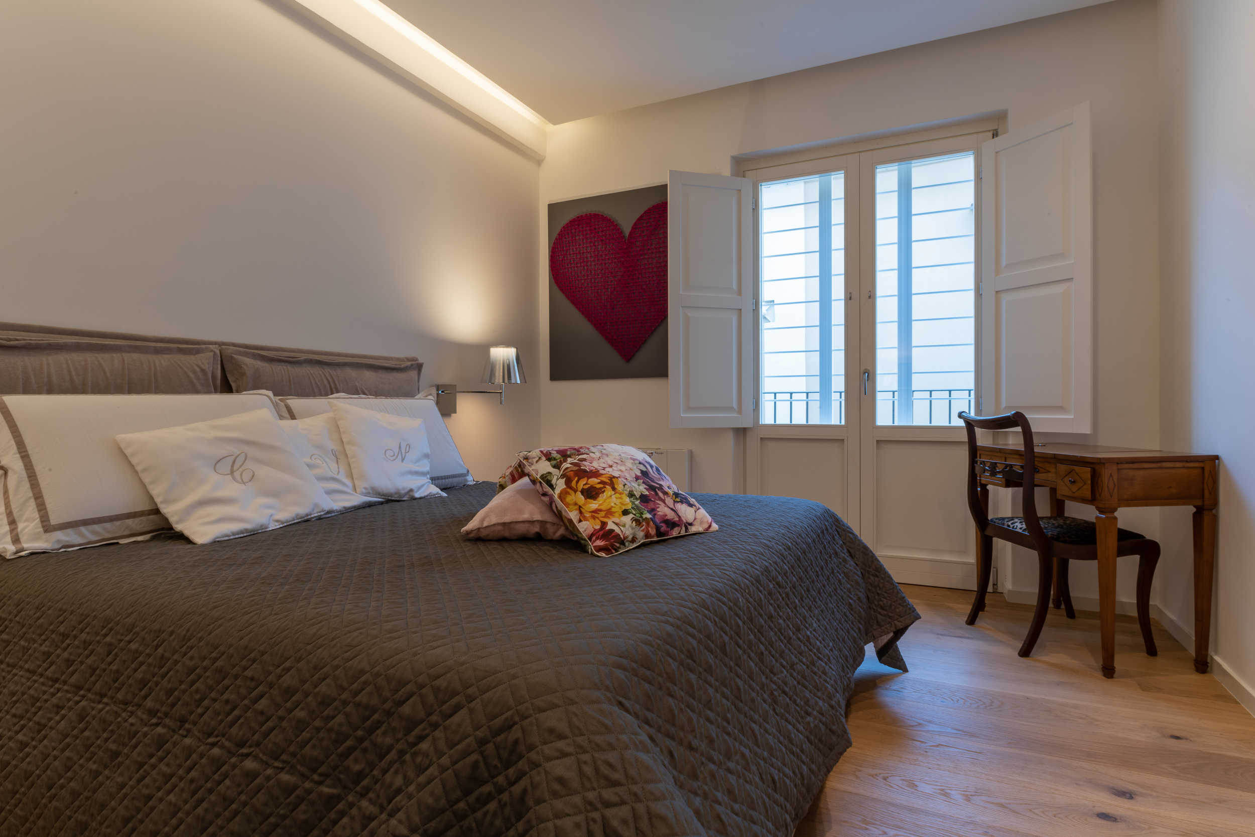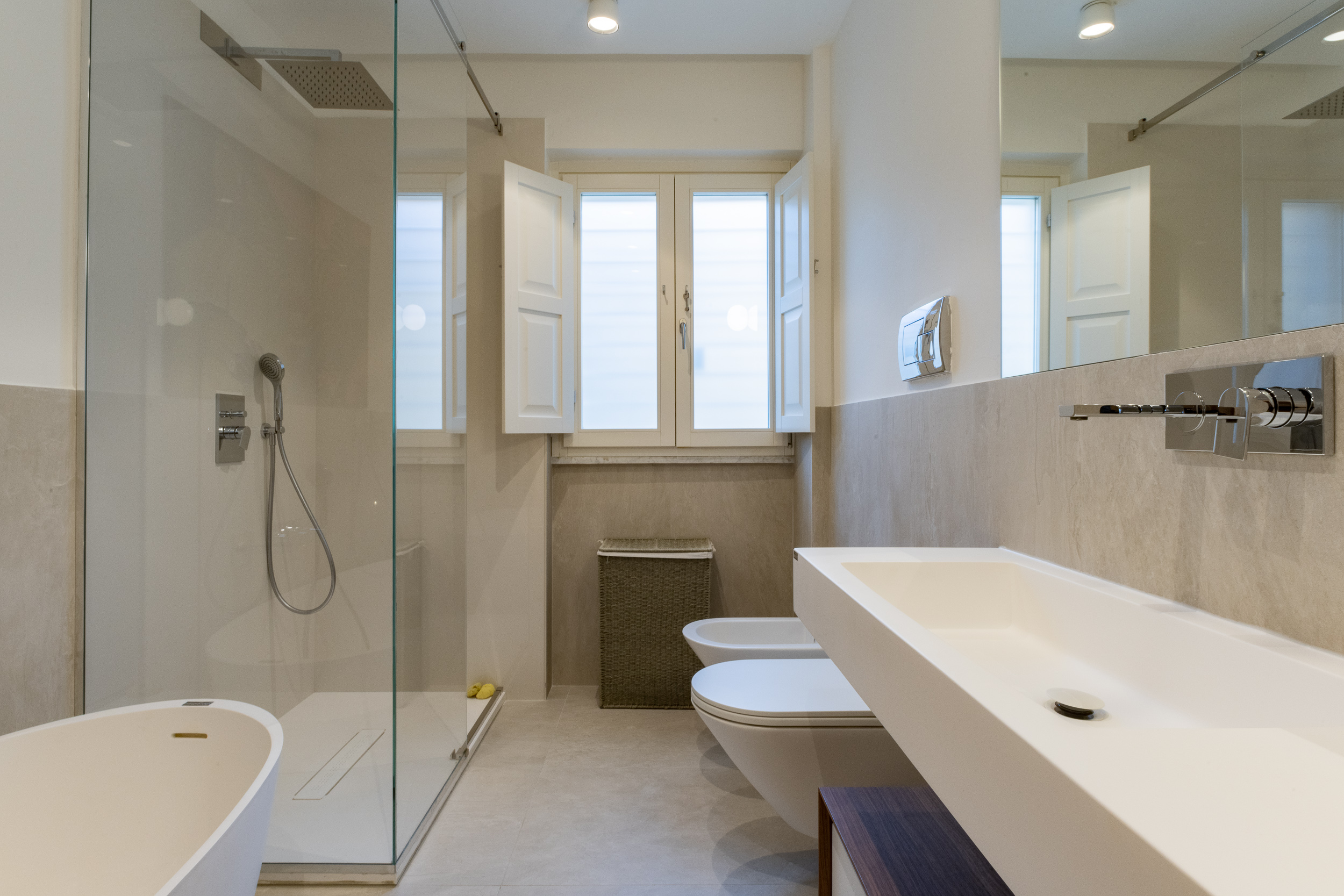L’abitazione è stata rifinita in stile contemporaneo, con un gusto ne classico ne moderno ma dove suggestioni del passaggio con intuizioni futuristiche si sposano bene per rendere l’ambiente vivibile e piacevole. Per sottolineare la natura di questo stile abbiamo lavorato sull’impianto illumino-tecnico e progettato arredi dallo stile classico con materiali quali noce canaletto e metallo. Lo stile contemporaeno è sottolineato anche dalla scelta dei materiali, com e il parquet in quasi tutti gli ambienti.