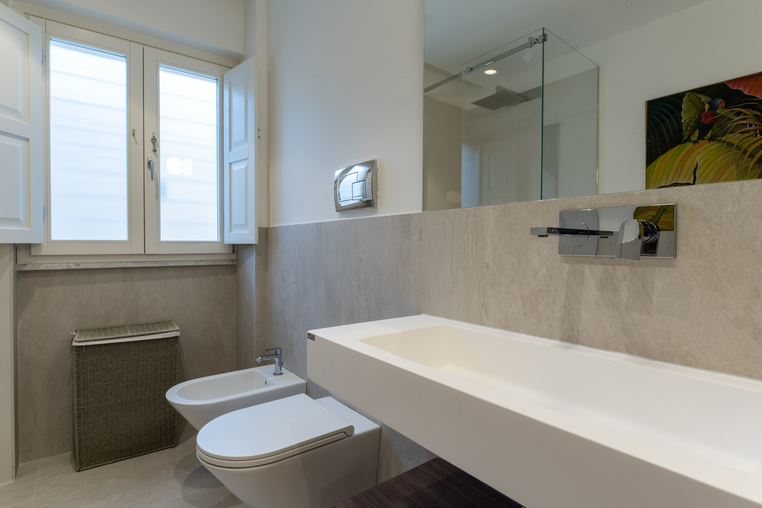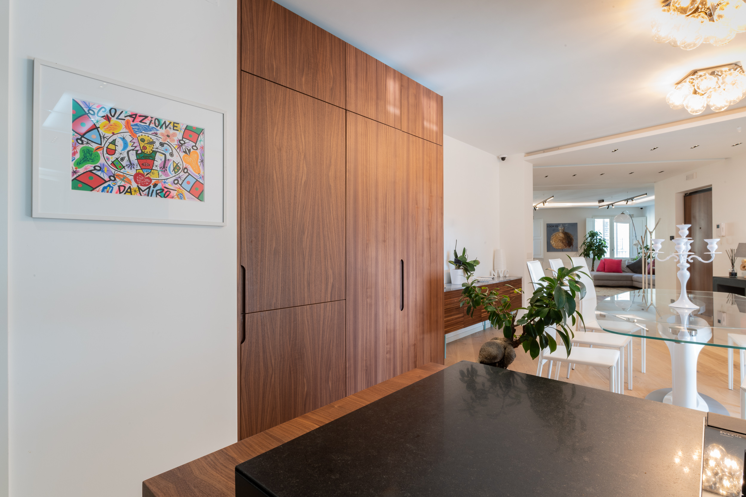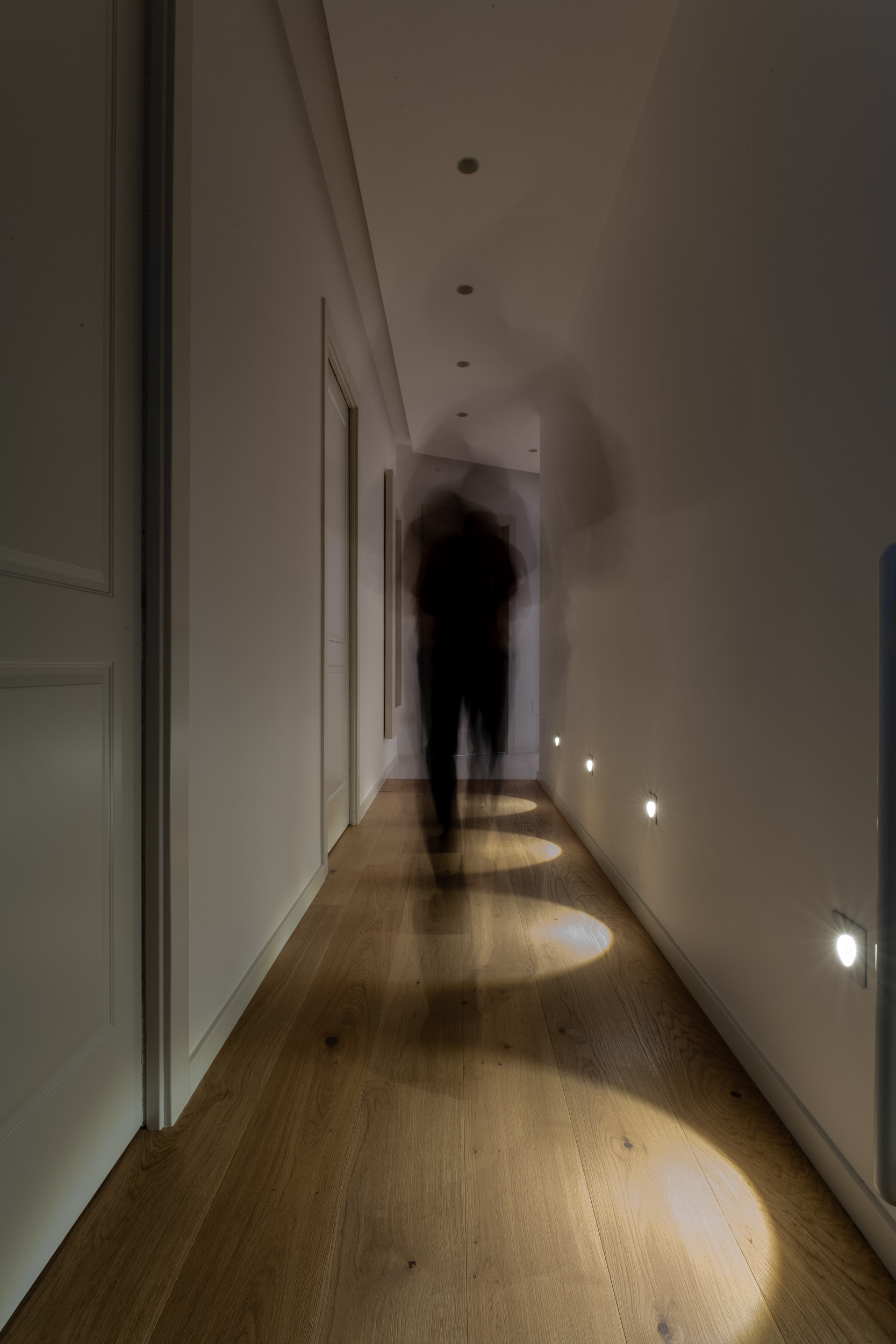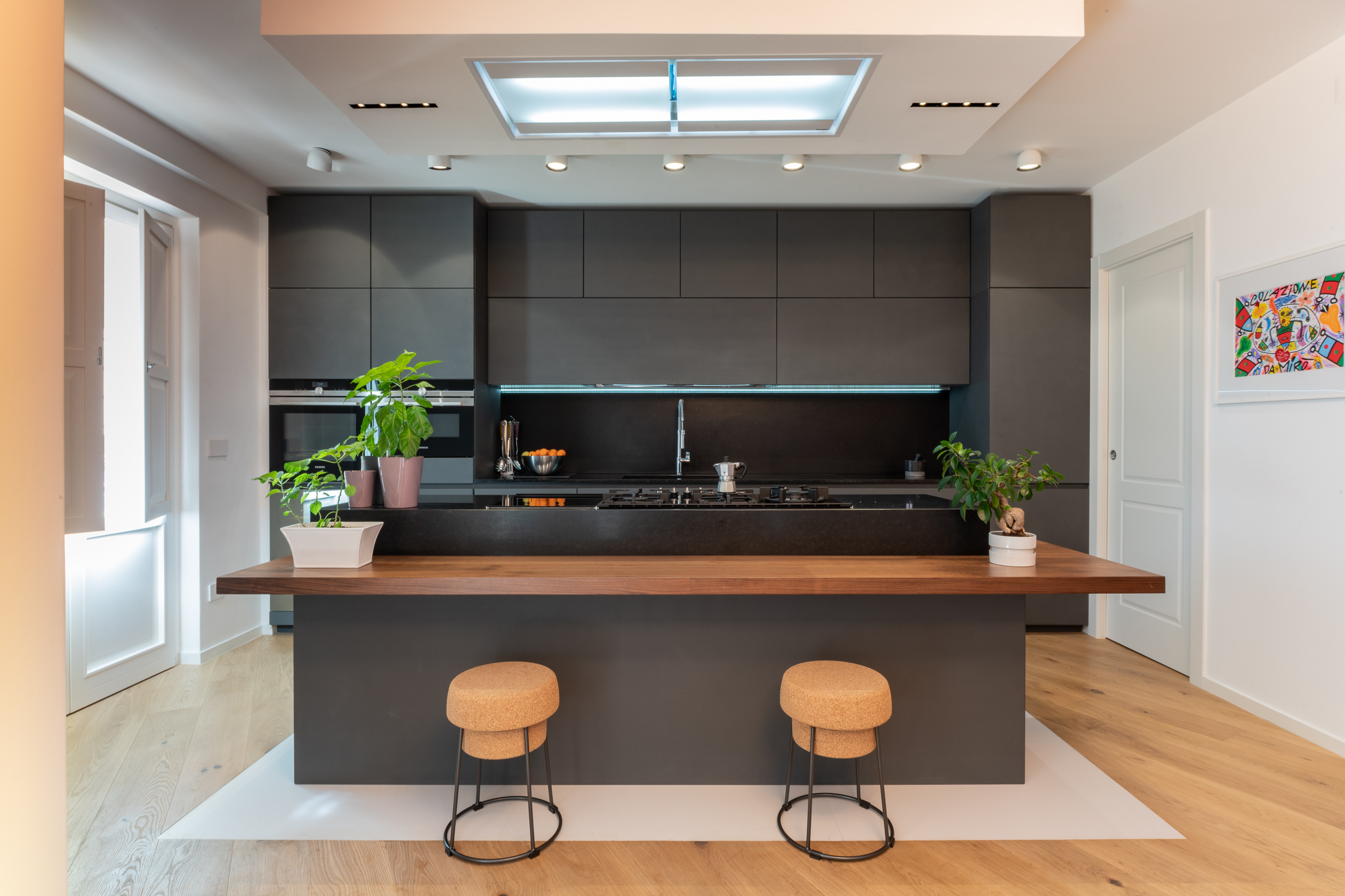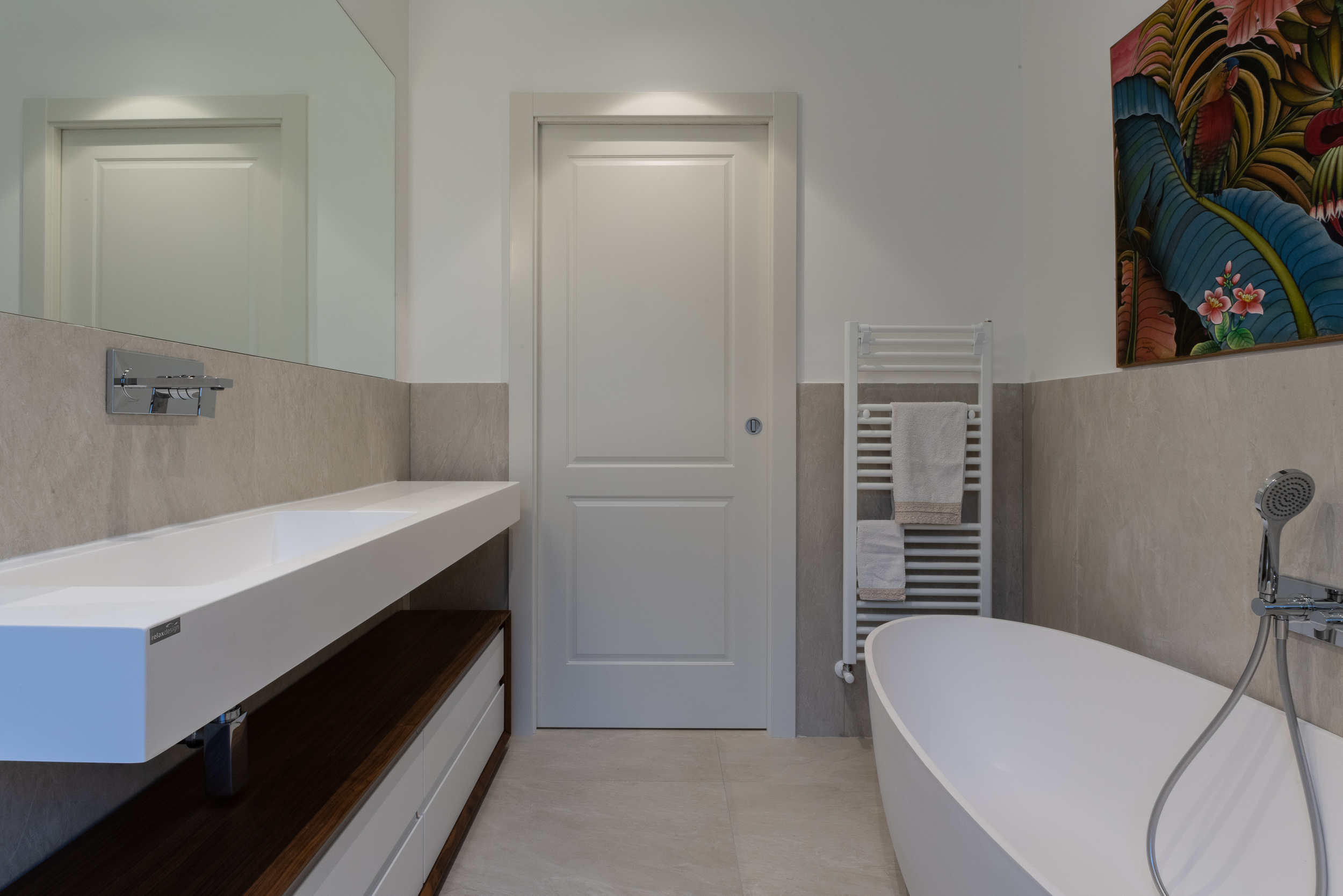 L’abitazione è stata rifinita in stile contemporaneo, con un gusto ne classico ne moderno ma dove suggestioni del passaggio con intuizioni futuristiche si sposano bene per rendere l’ambiente vivibile e piacevole. Per sottolineare la natura di questo stile abbiamo lavorato sull’impianto illumino-tecnico e progettato arredi dallo stile classico con materiali quali noce canaletto e metallo. Lo stile contemporaeno è sottolineato anche dalla scelta dei materiali, com e il parquet in quasi tutti gli ambienti.