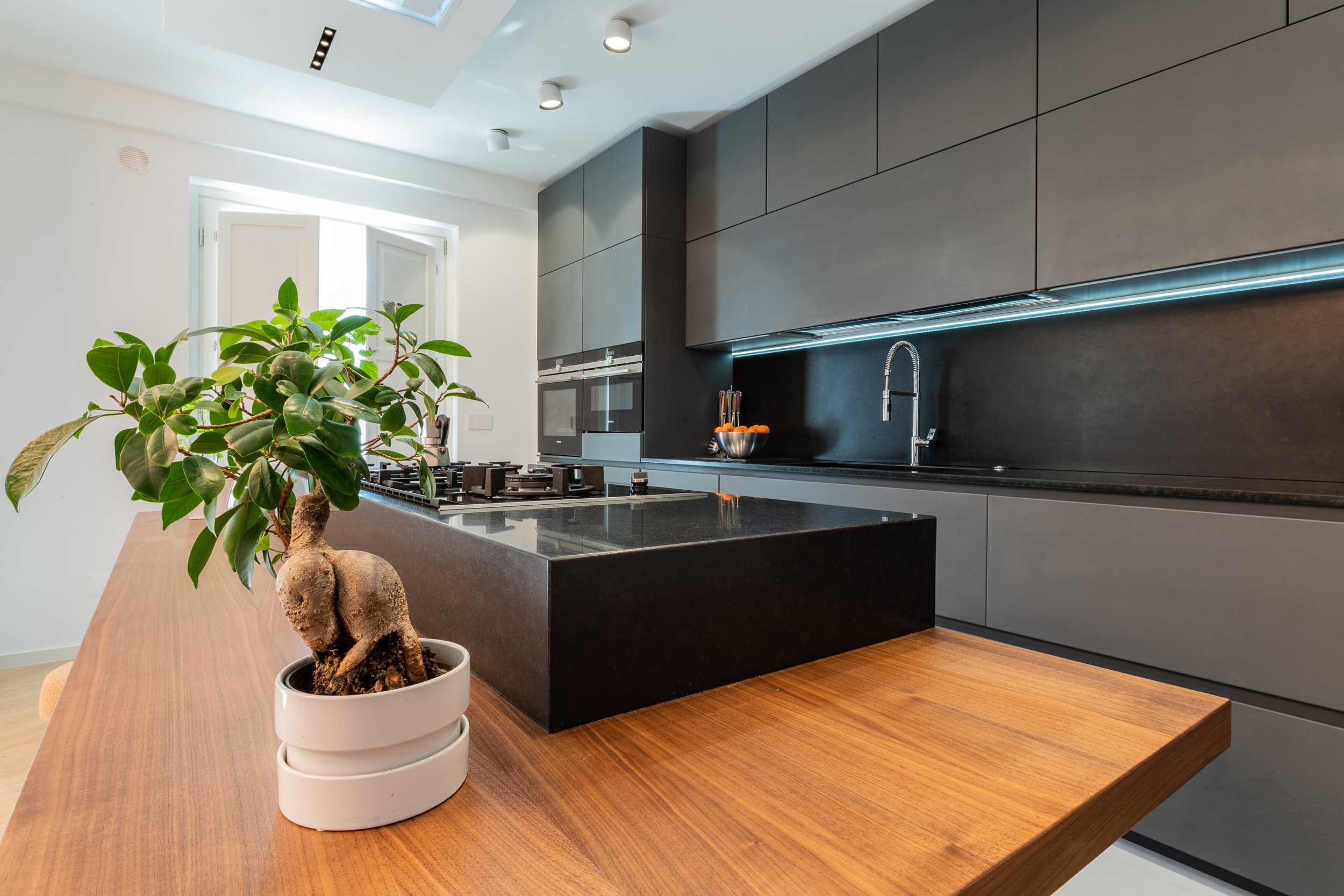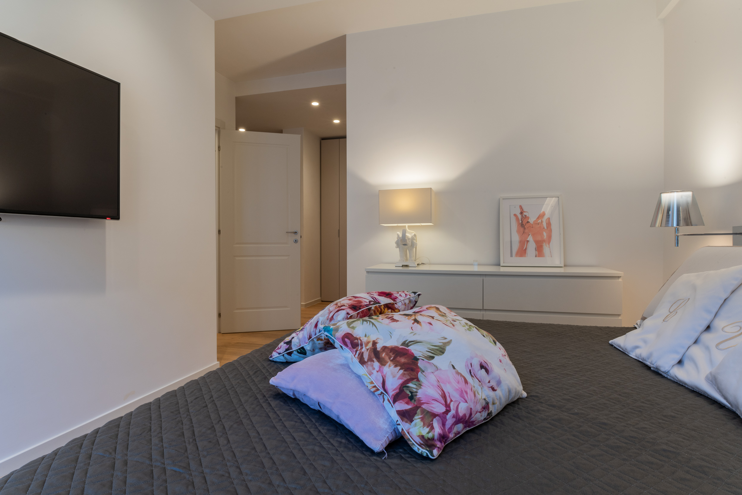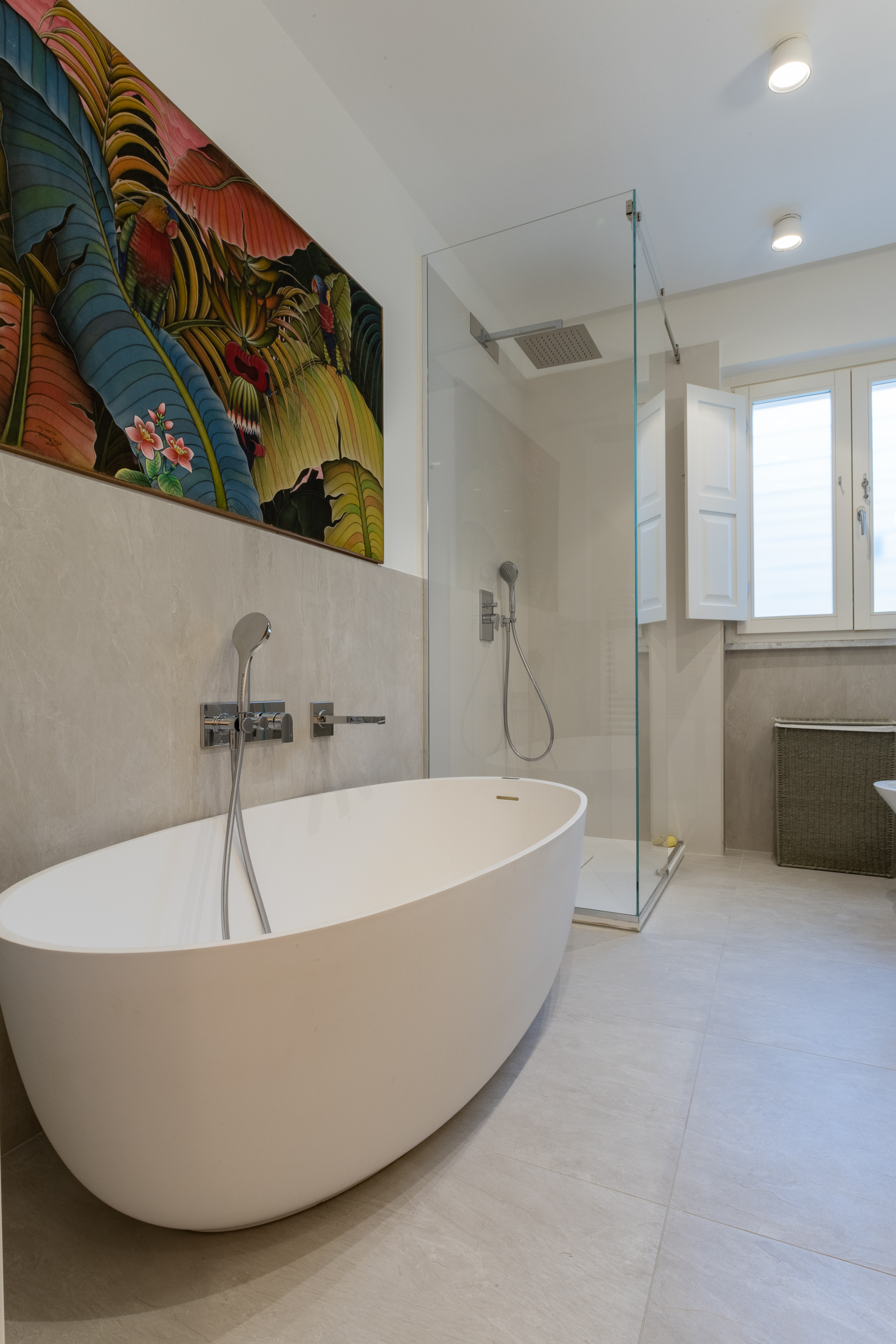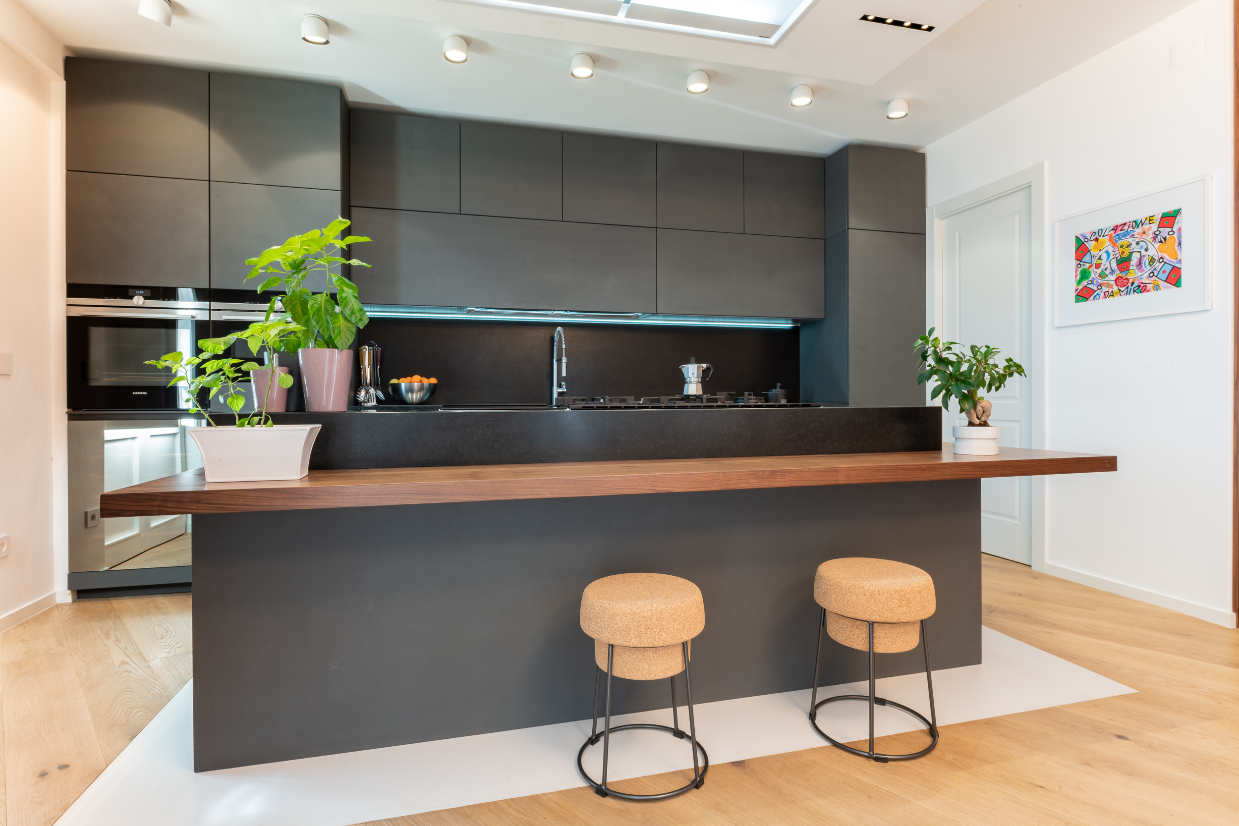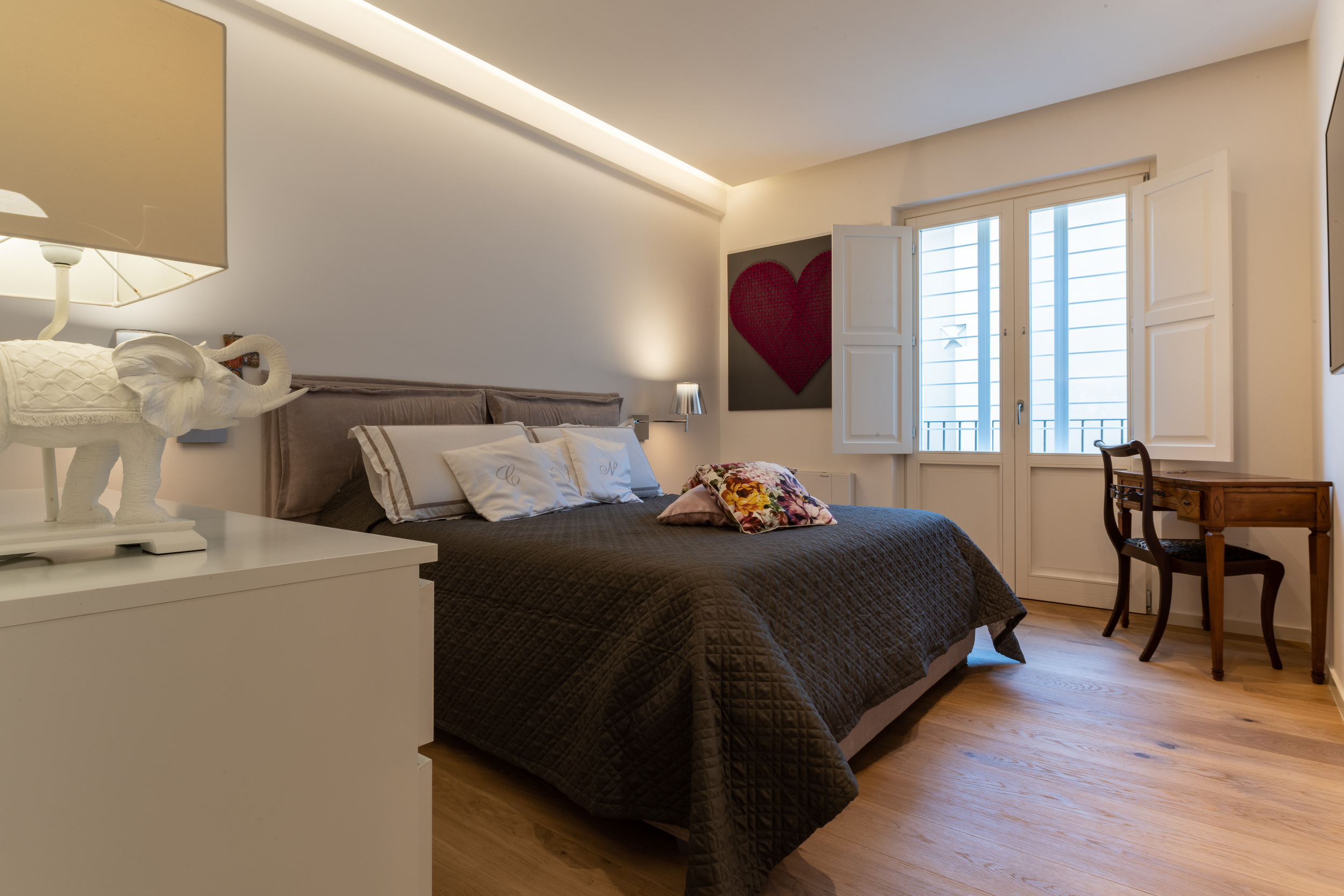 L’abitazione è stata rifinita in stile contemporaneo, con un gusto ne classico ne moderno ma dove suggestioni del passaggio con intuizioni futuristiche si sposano bene per rendere l’ambiente vivibile e piacevole. Per sottolineare la natura di questo stile abbiamo lavorato sull’impianto illumino-tecnico e progettato arredi dallo stile classico con materiali quali noce canaletto e metallo. Lo stile contemporaeno è sottolineato anche dalla scelta dei materiali, com e il parquet in quasi tutti gli ambienti.