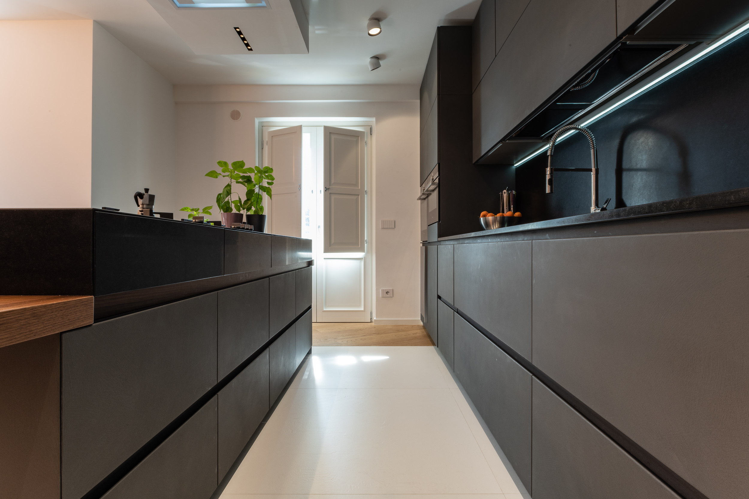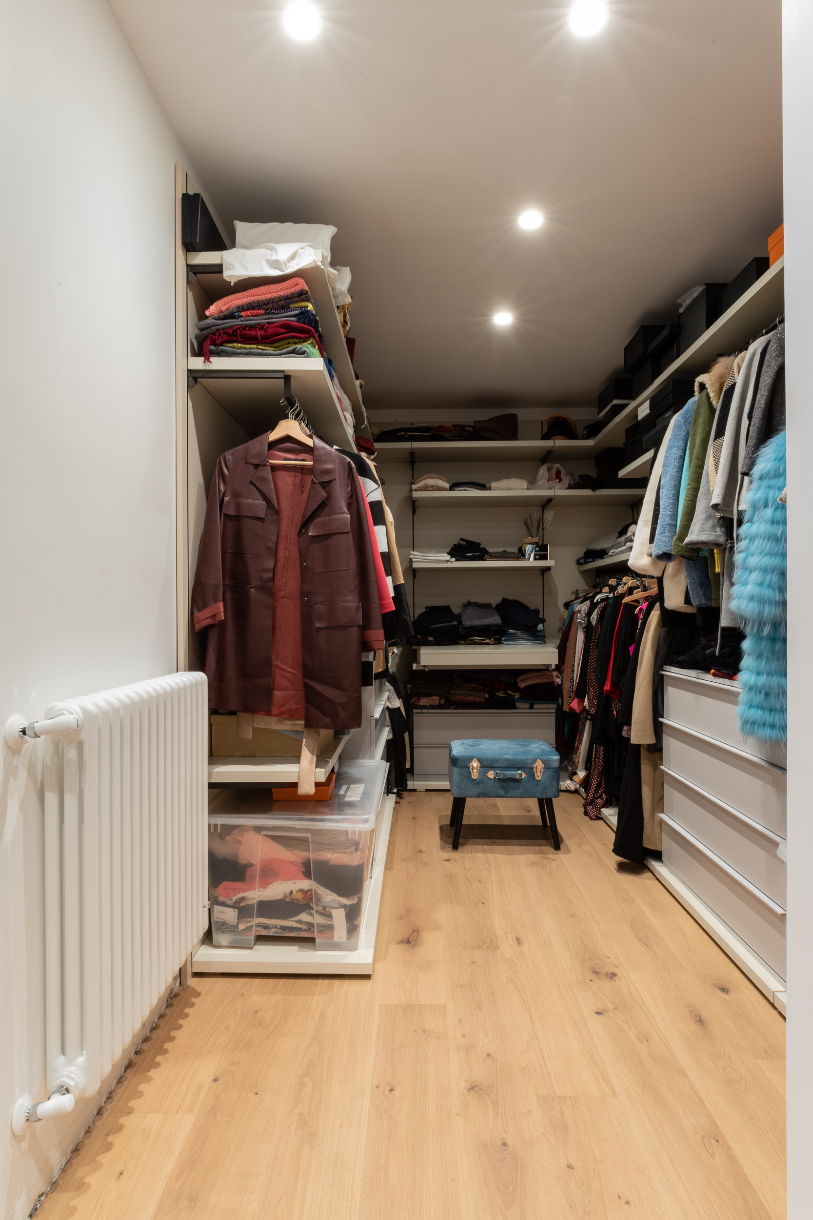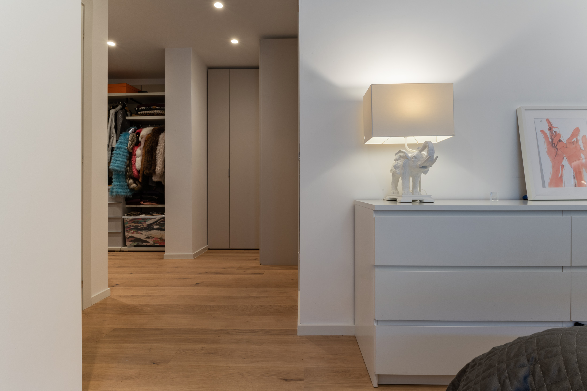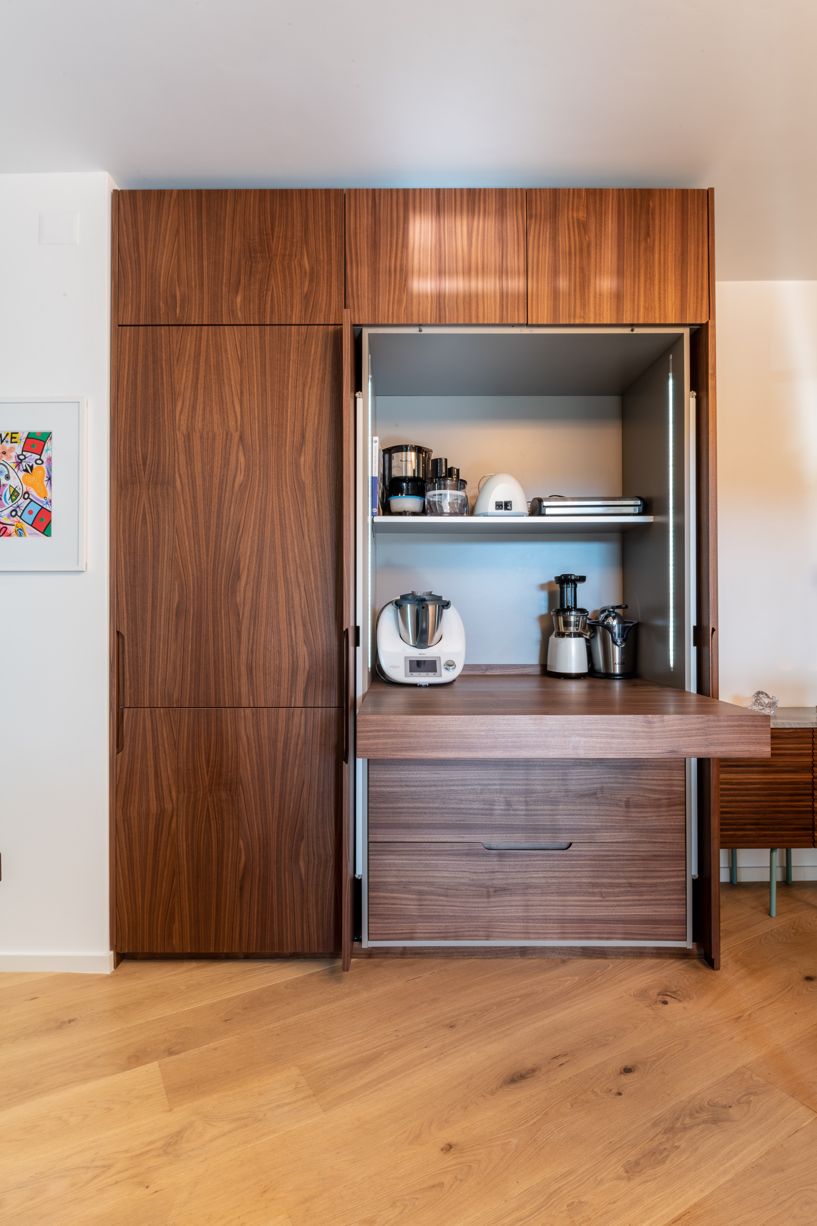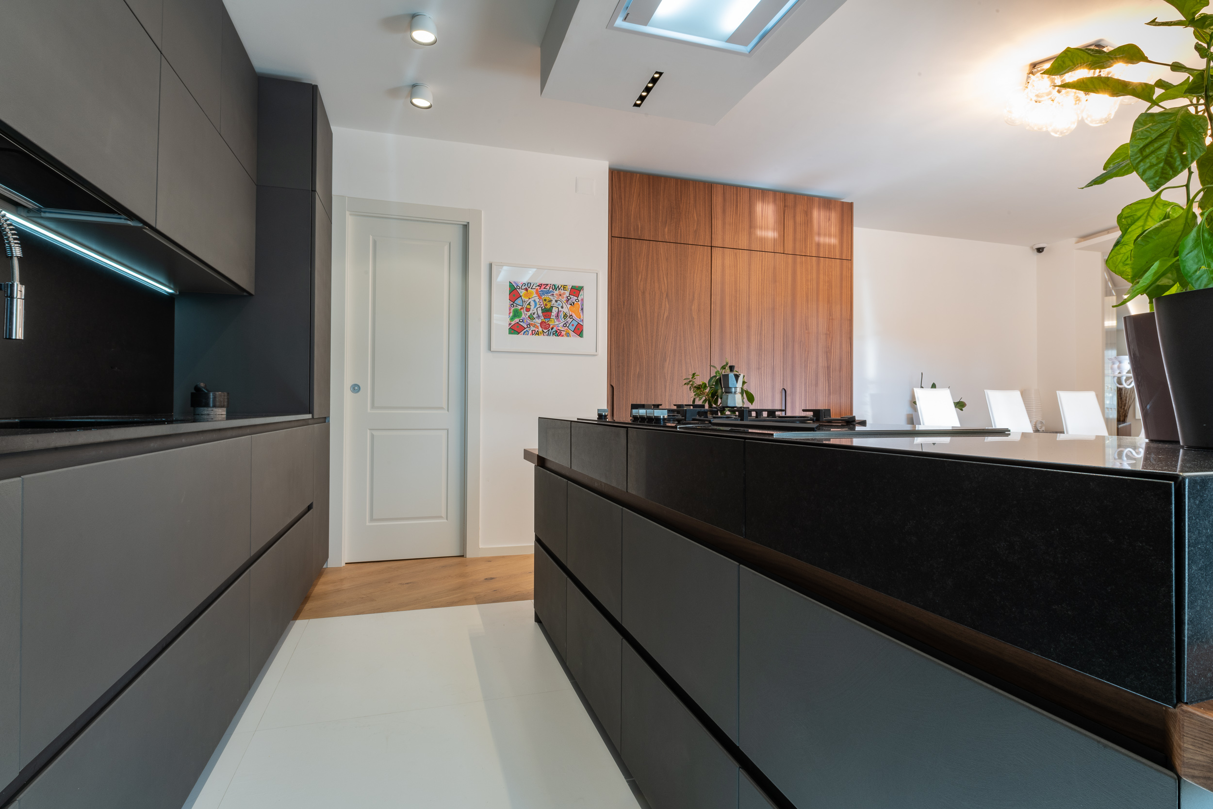 L’abitazione è stata rifinita in stile contemporaneo, con un gusto ne classico ne moderno ma dove suggestioni del passaggio con intuizioni futuristiche si sposano bene per rendere l’ambiente vivibile e piacevole. Per sottolineare la natura di questo stile abbiamo lavorato sull’impianto illumino-tecnico e progettato arredi dallo stile classico con materiali quali noce canaletto e metallo. Lo stile contemporaeno è sottolineato anche dalla scelta dei materiali, com e il parquet in quasi tutti gli ambienti.