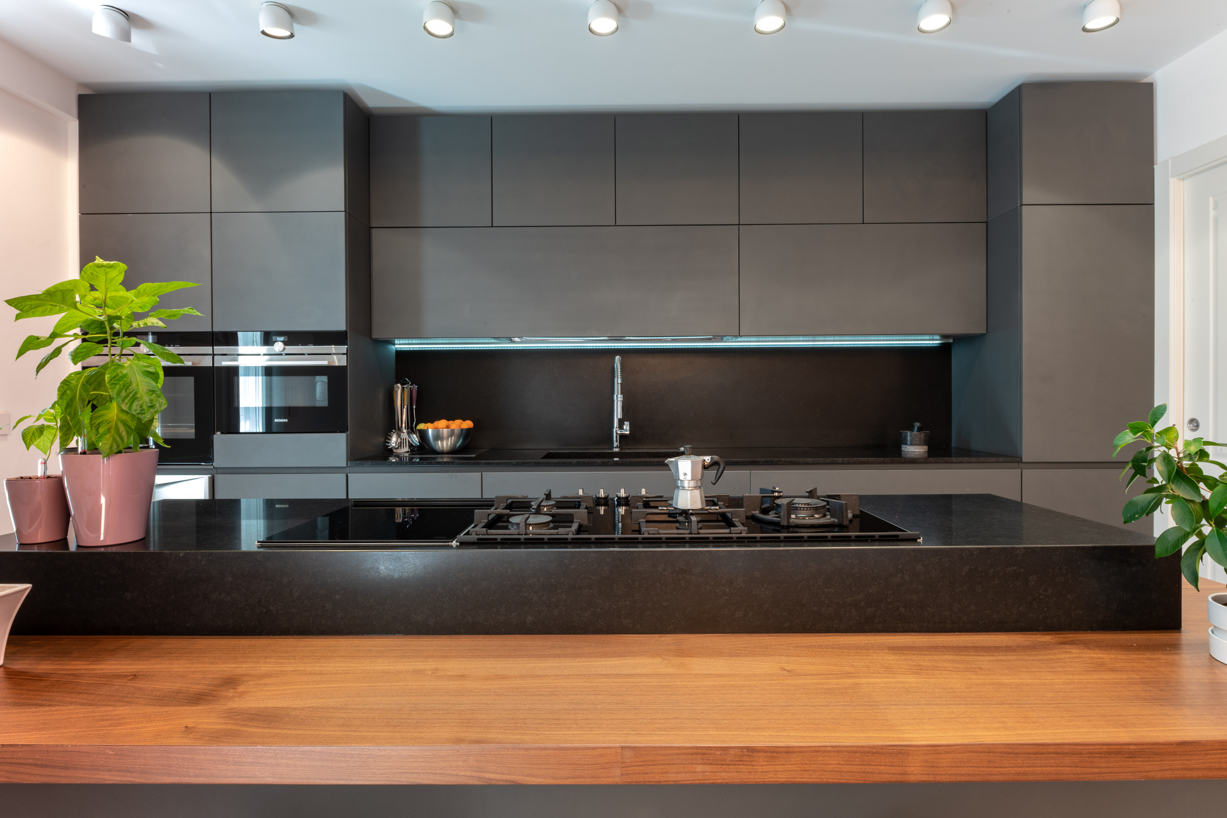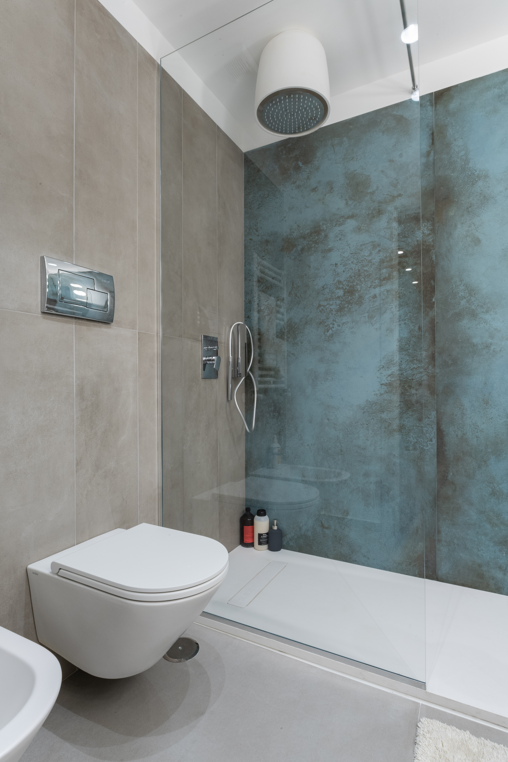 La casa è costituita da 3 bagni, di cui uno patronale. L’arredo bagno è molto moderno e questa scelta si è riversata anche sui materiali. I bagni, infatti, sono in Corian mentre le superfici sono state rivestite da grossi lastroni. Una scelta materica molto forte che non riguarda il bagno è stata fatta in cucina. Al classicismo del legno che predomina la zona living è stata contrapposta la cucina a vista completamente in cemento.