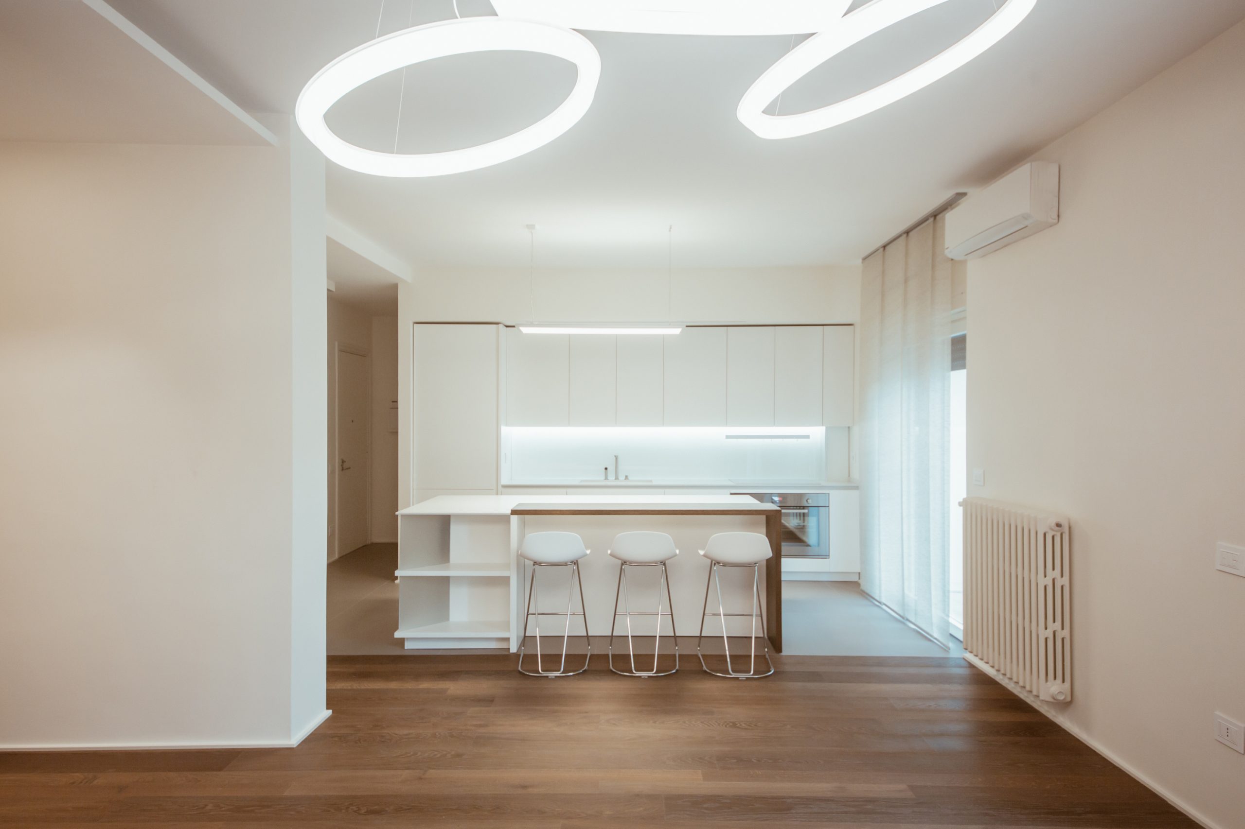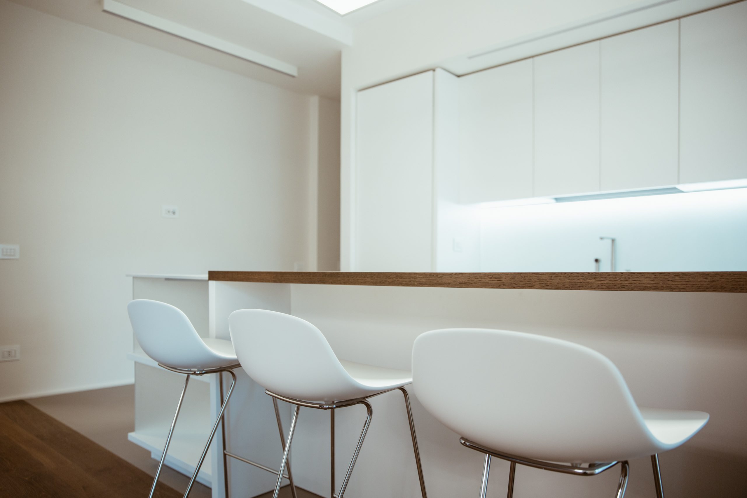 Il legno è l’elegante tappeto nel bianco caldo dell’intero spazio domestico.
