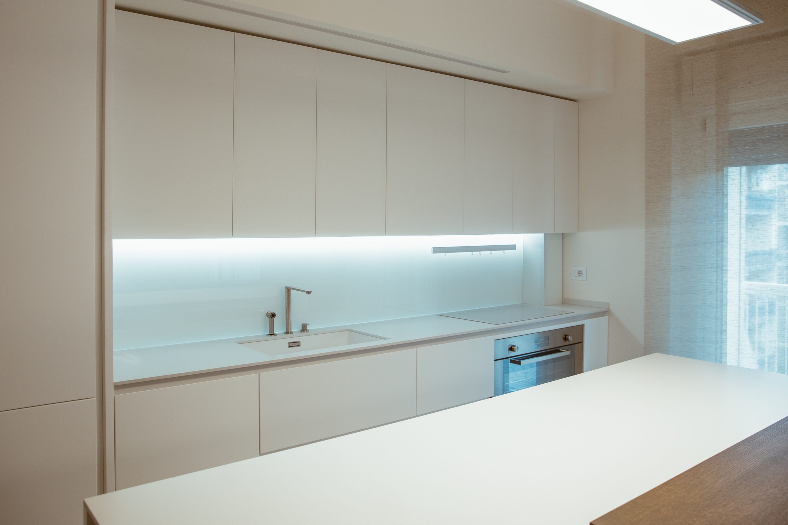 L’ingombro minimo dello spazio progettato. L’unità abitativa è molto ampia. La vita da accogliere è quella di una coppia di professionisti con una figlia piccola. La zona è centrale e residenziale nella città di Caserta. Lo studio è stato affrontato condividendo con il cliente la necessità di non escludere gli spazi nel corso della vita quotidiana. Nessun ostacolo, nessuna preclusione spaziale, ma una lettura organica delle diverse funzioni abitative nell’armonia quotidiana. Le forme al centro della rappresentazione, la linearità elementare come essenza del progetto. Nulla di superfluo. L’attenzione è tutta per la vita. L’asse centrale non è il corridoio, ma parte dell’ampio living di relax e di conversazione che al tempo stesso si apre allo spazio del pranzo, solo dal quale è possibile scoprire la cucina, scena e laboratorio del cibo. L’intimità e la notte sono risolte con la creazione di due cellule abitative autonome che si incontrano al centro. Tutto è legato, nulla è separato.