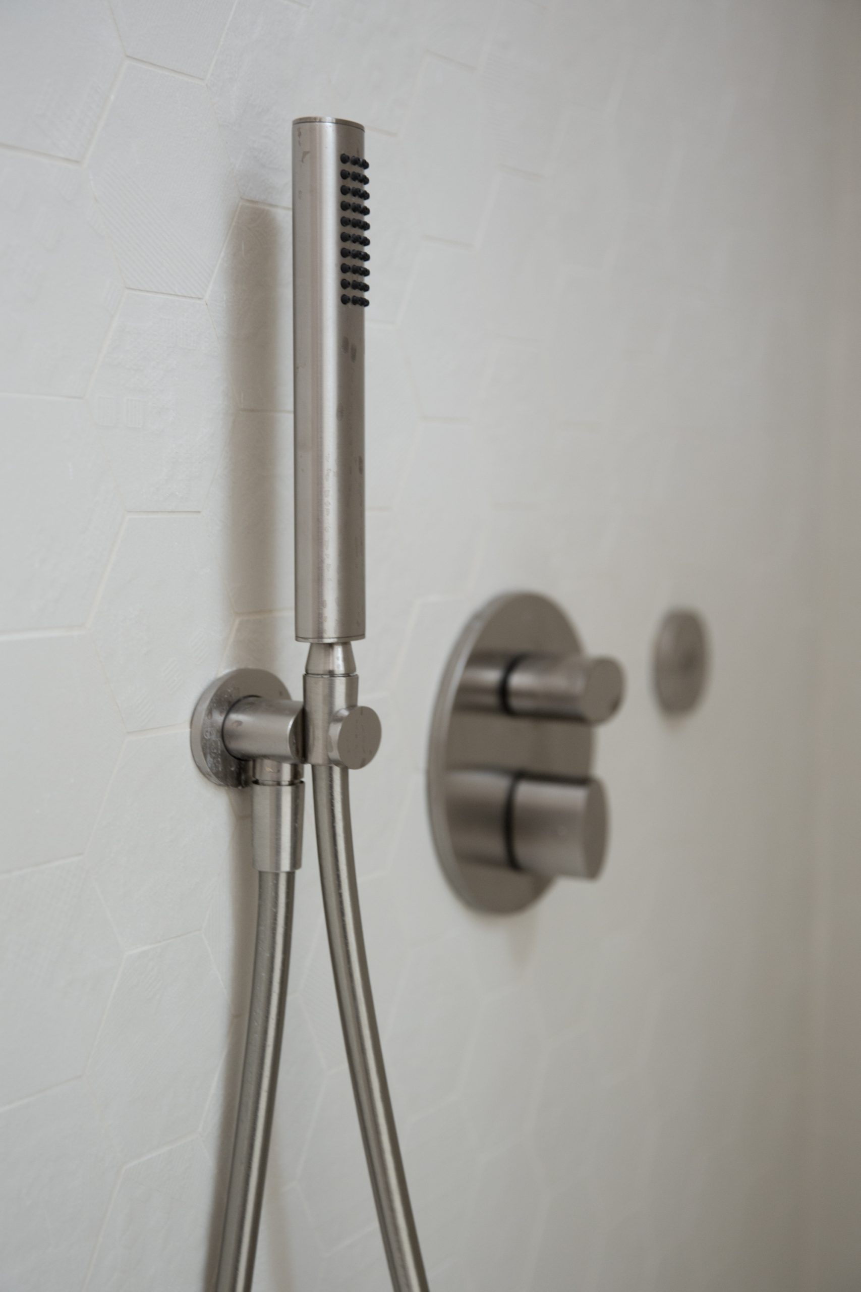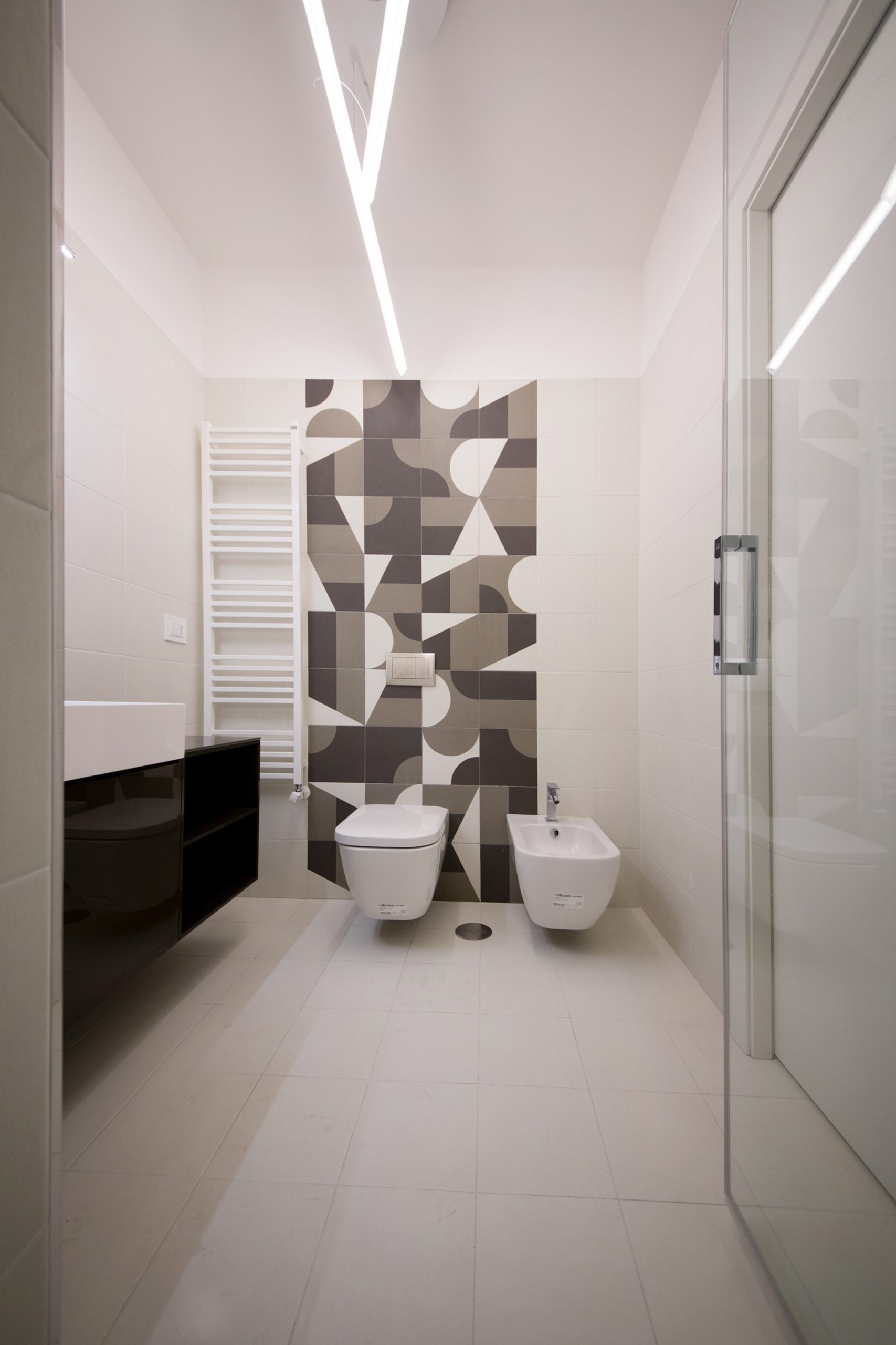 Gli ospiti sono accolti in un elegante bagno, dove tra le linee asimmetriche e sospese di Antonio Lupi, l’unica concessione è il pannello murario realizzato con il design di Puzzle, in un pattern grafico dalle linee vagamente anni 70.