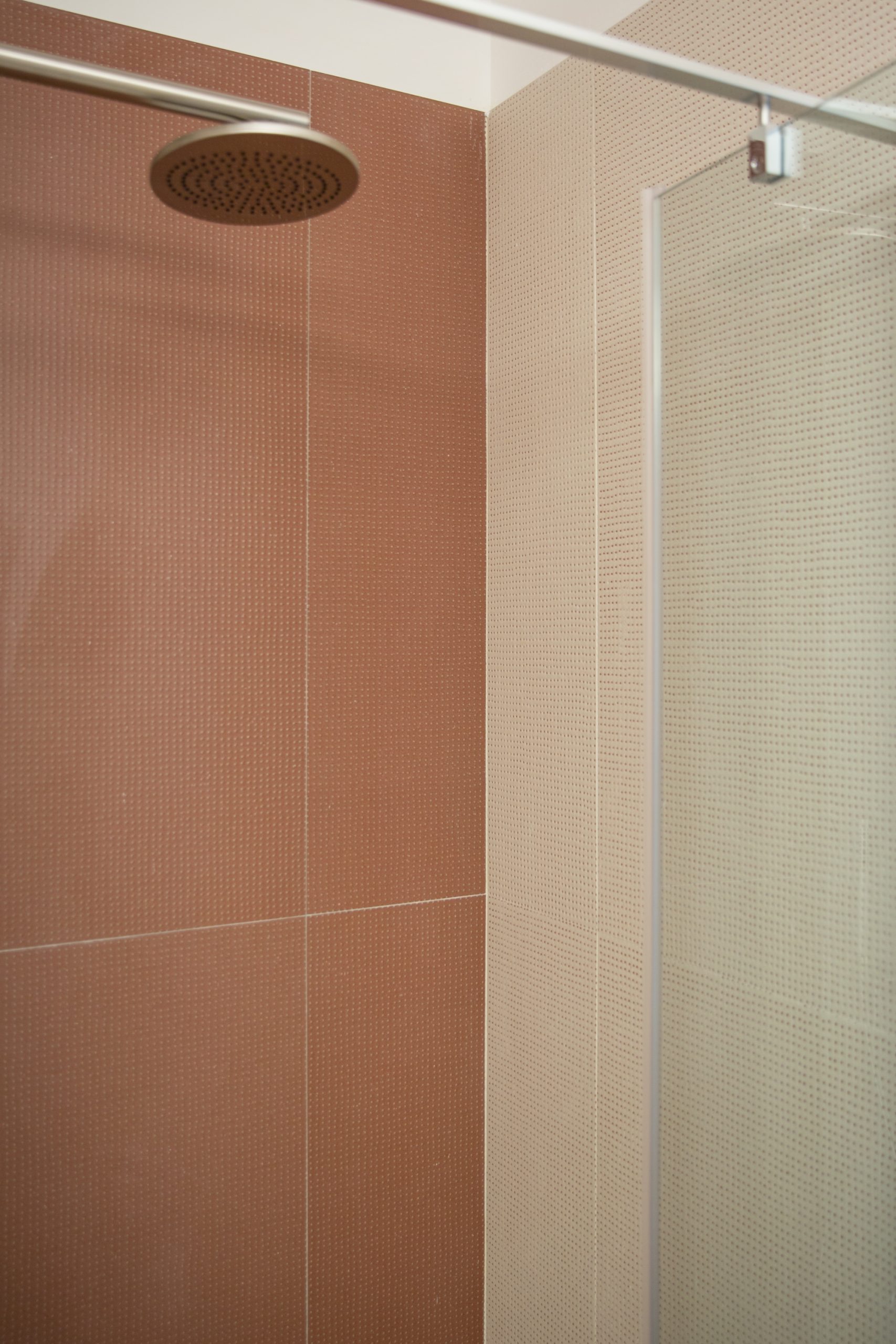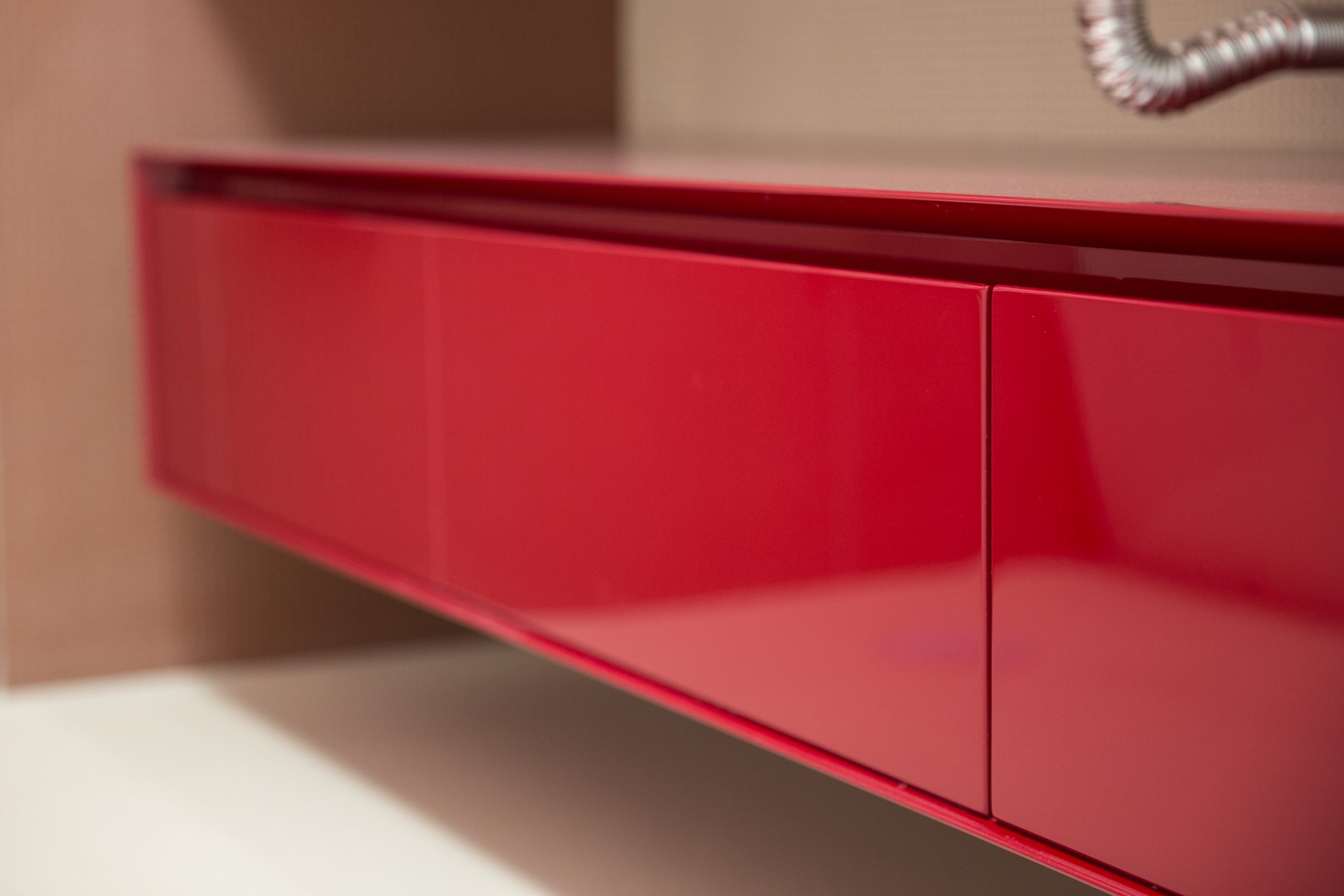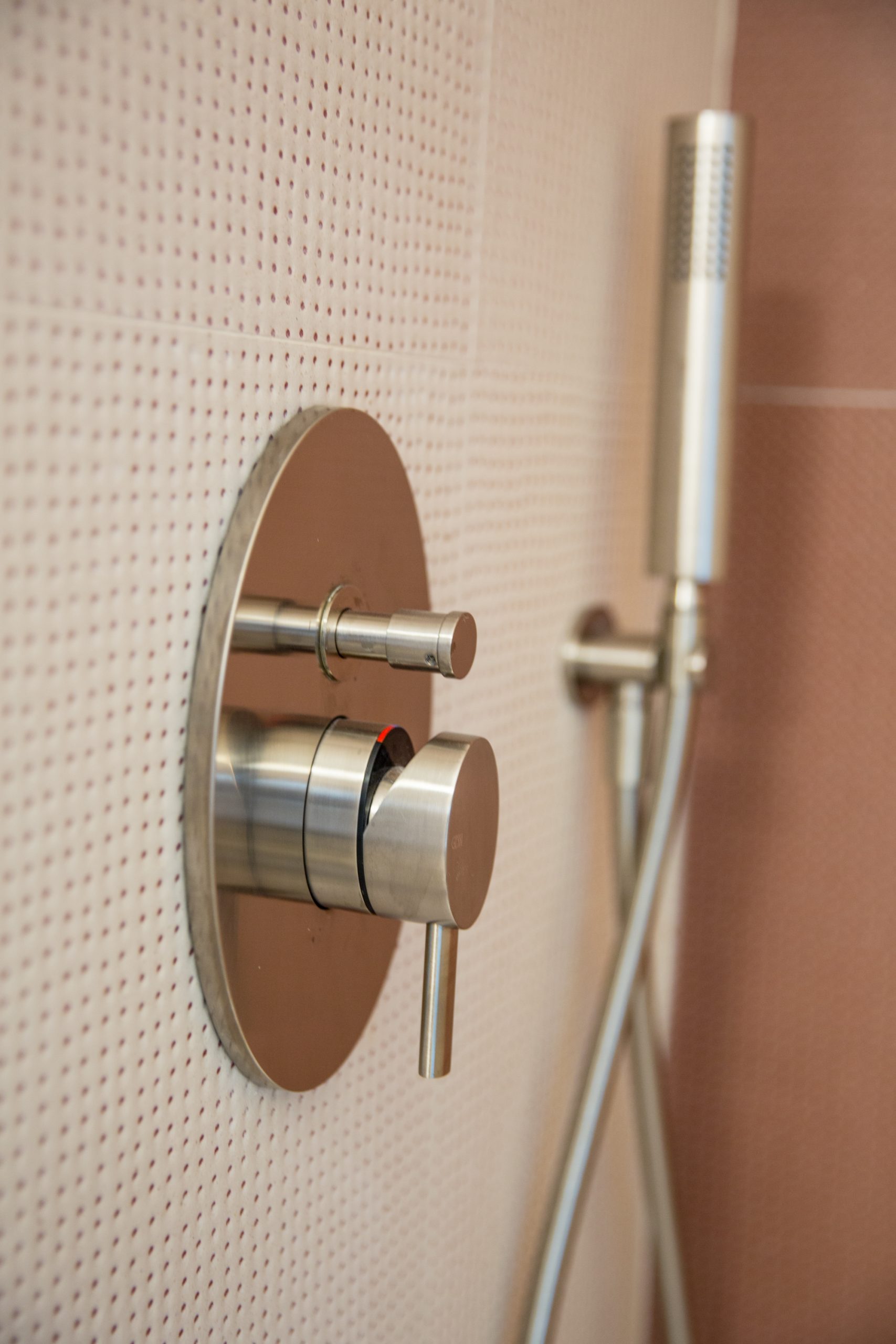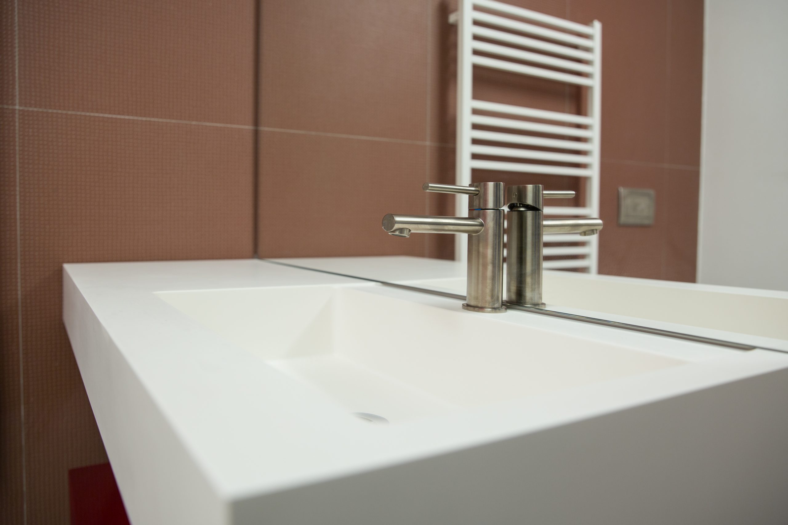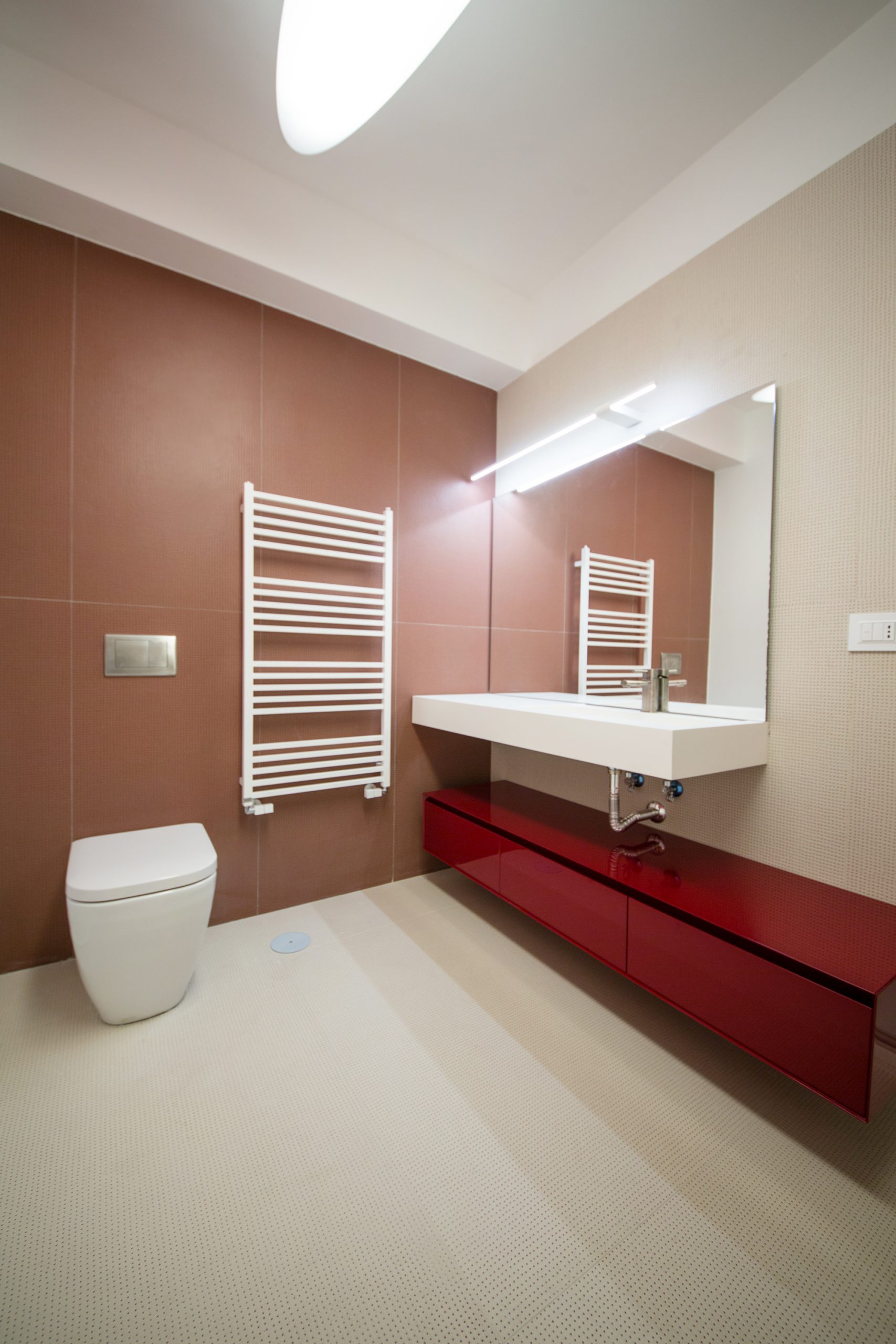 Il bagno della coppia, ampio e luminoso, si offre con il calore di Dechirer, a tratti impreziosito dalle memorie strappate dei bassorilievi appena percettibili. Il lungo e accogliente top di Lupi Design, galleggiante tra le orizzontali del pavimento e del piano dello specchio, fa da contrappunto alla profonda doccia, tana del benessere di Gessi. Il gioco dei mille Pico bianchi e rossi esplodono di vivacità e profondità nel bagno della piccola figlia, tra pavimento e rivestimenti materici. Il fuoco allegro del top di Lupi esalta e impreziosisce tutto lo spazio.