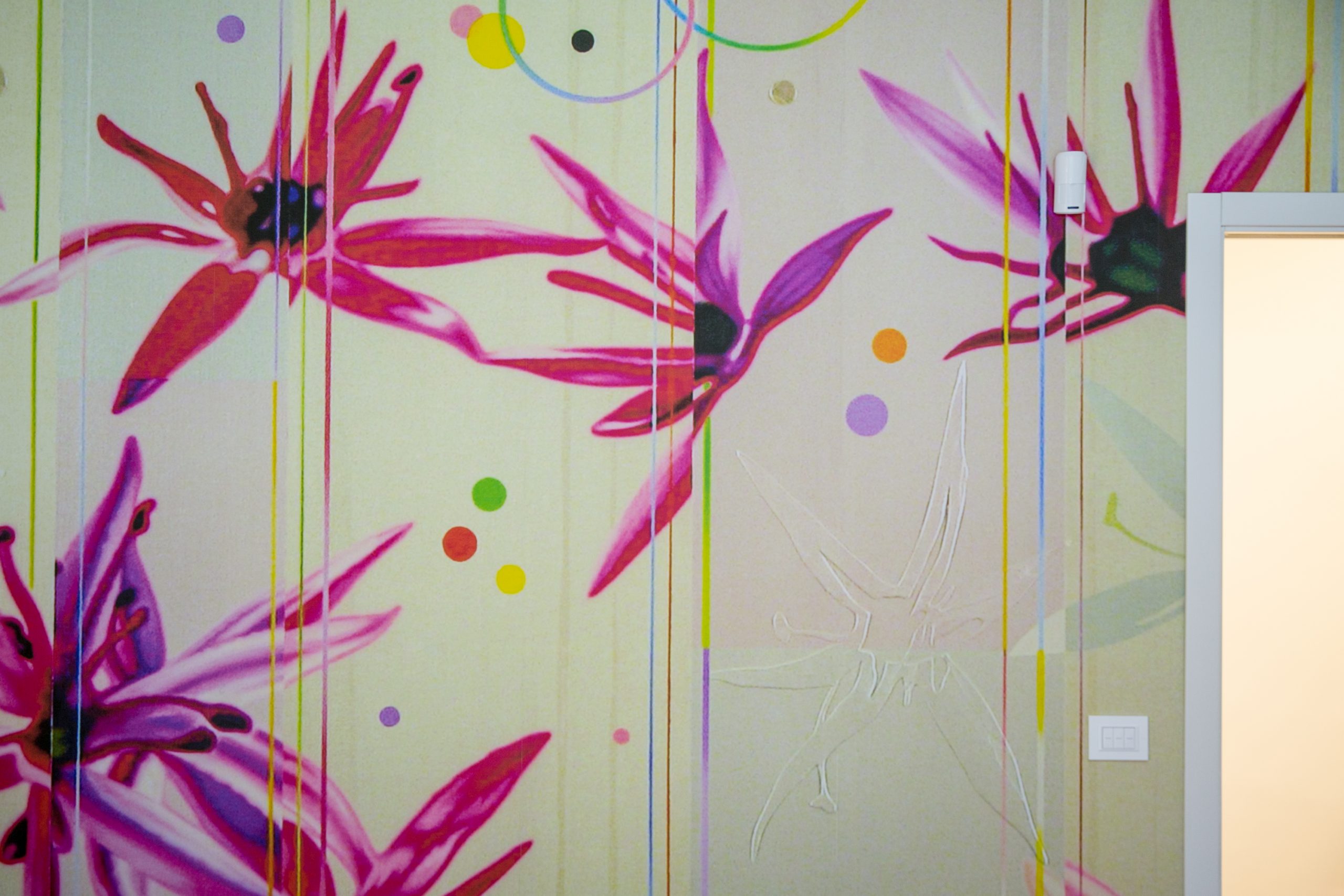 I fiori coloratissimi di Inkiostro Bianco accolgono la piccola nel suo spazio di vita, sospesa tra il gioco, l’effimero e il candore.