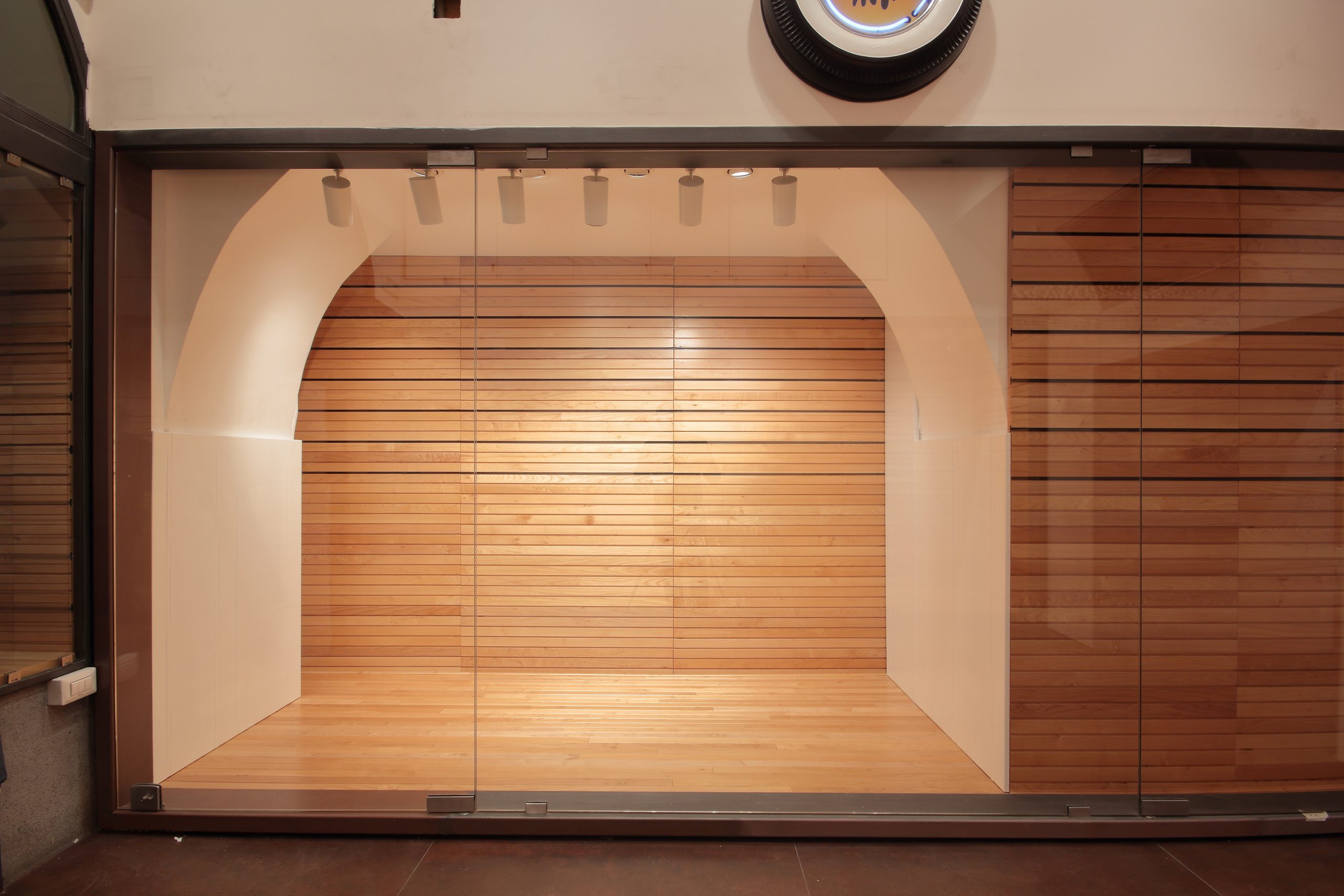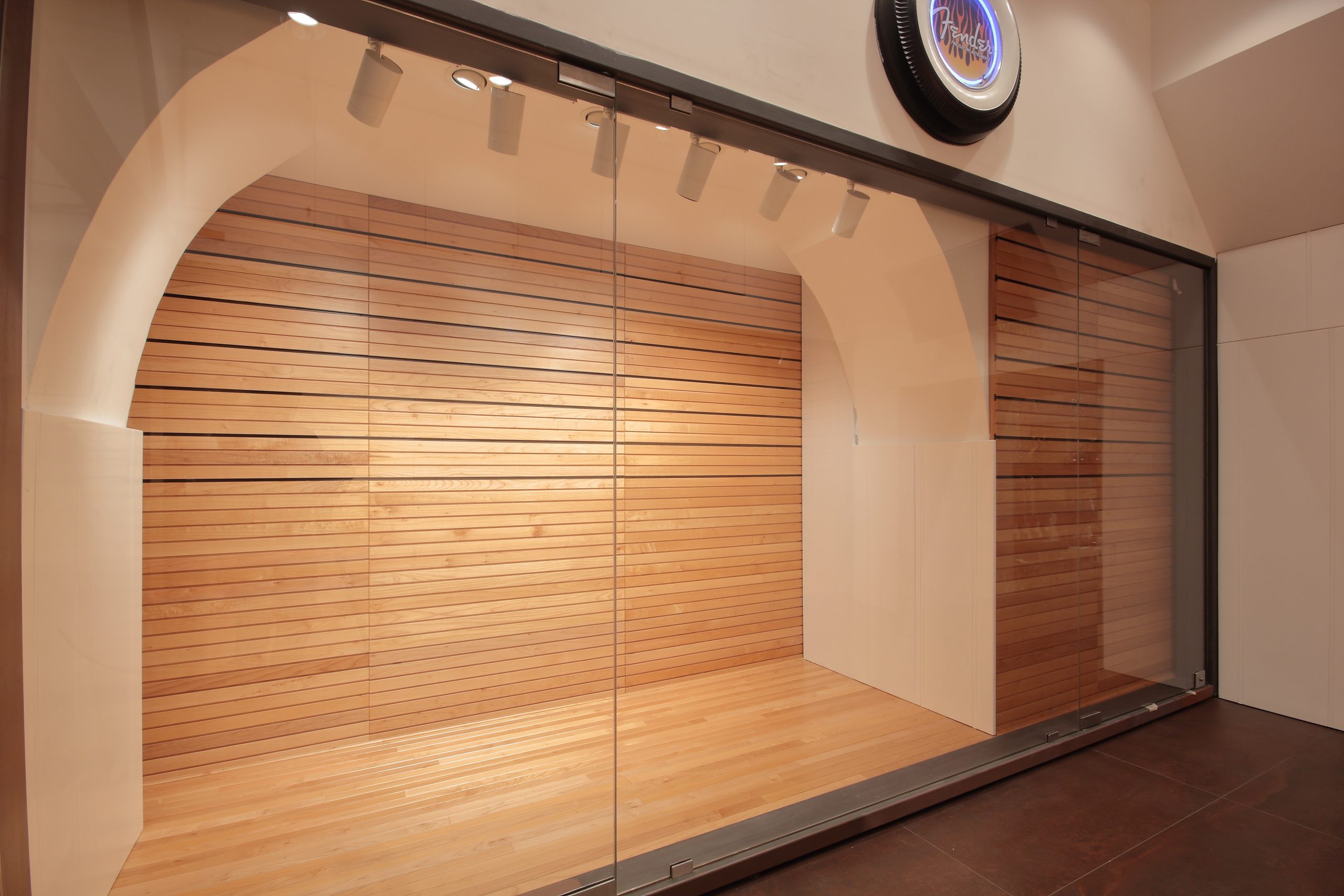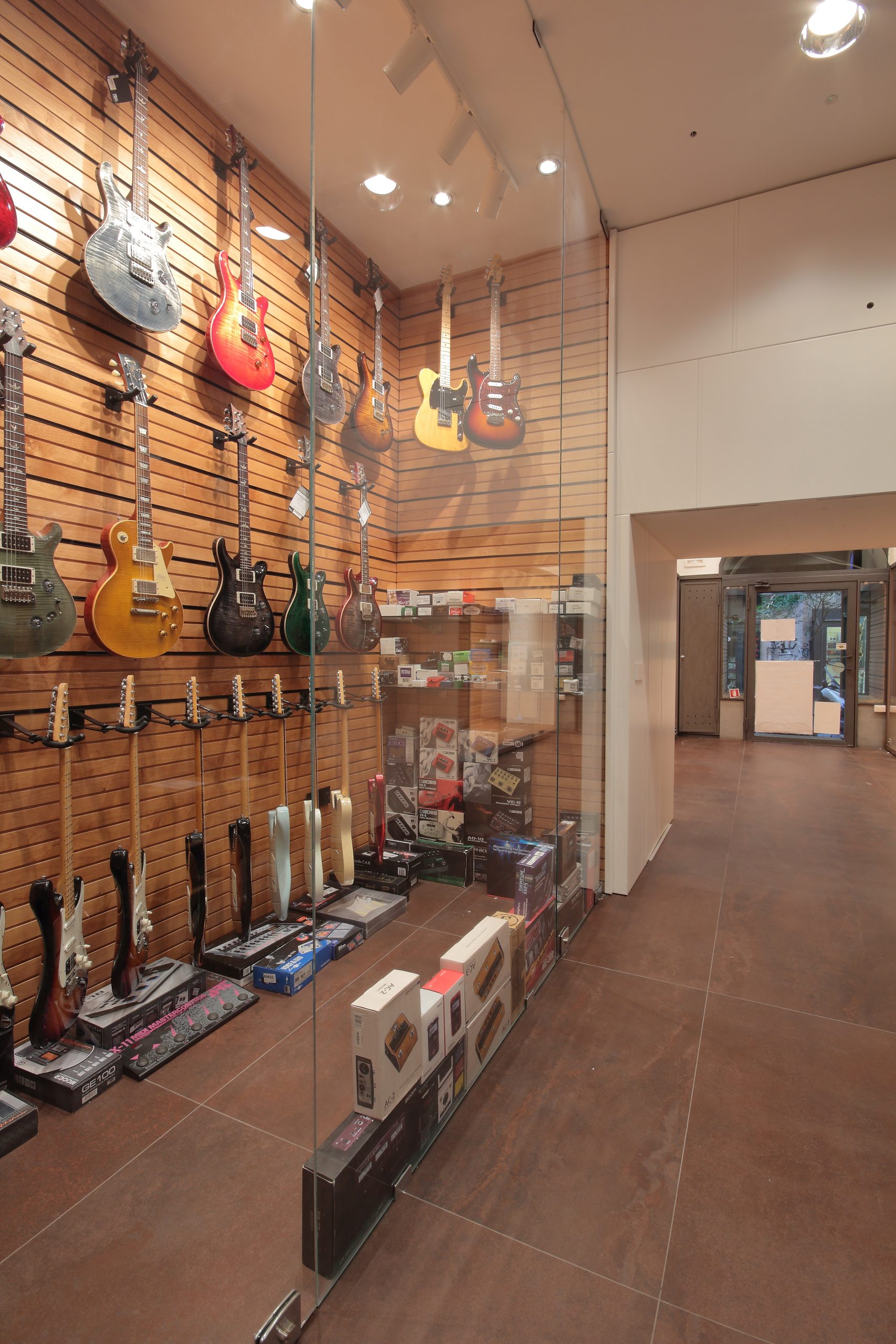 Il concept parte dall’idea di utilizzare una delle essenze più in uso per la costruzione delle sei corde ossia l’acero canadese. In queste aree del negozio l’acero è stato affiancato da una pavimentazione che fornisse oltre all’abbinamento cromatico anche la resa estetica adatta al luogo. La combinazione perfetta è stata trovata nella pavimentazione fornita dal centro Esagono in gres porcellanato effetto acciaio corten di grande formato. Il color ruggine di questo pavimento evoca atmosfere perfette per l’ambientazione.