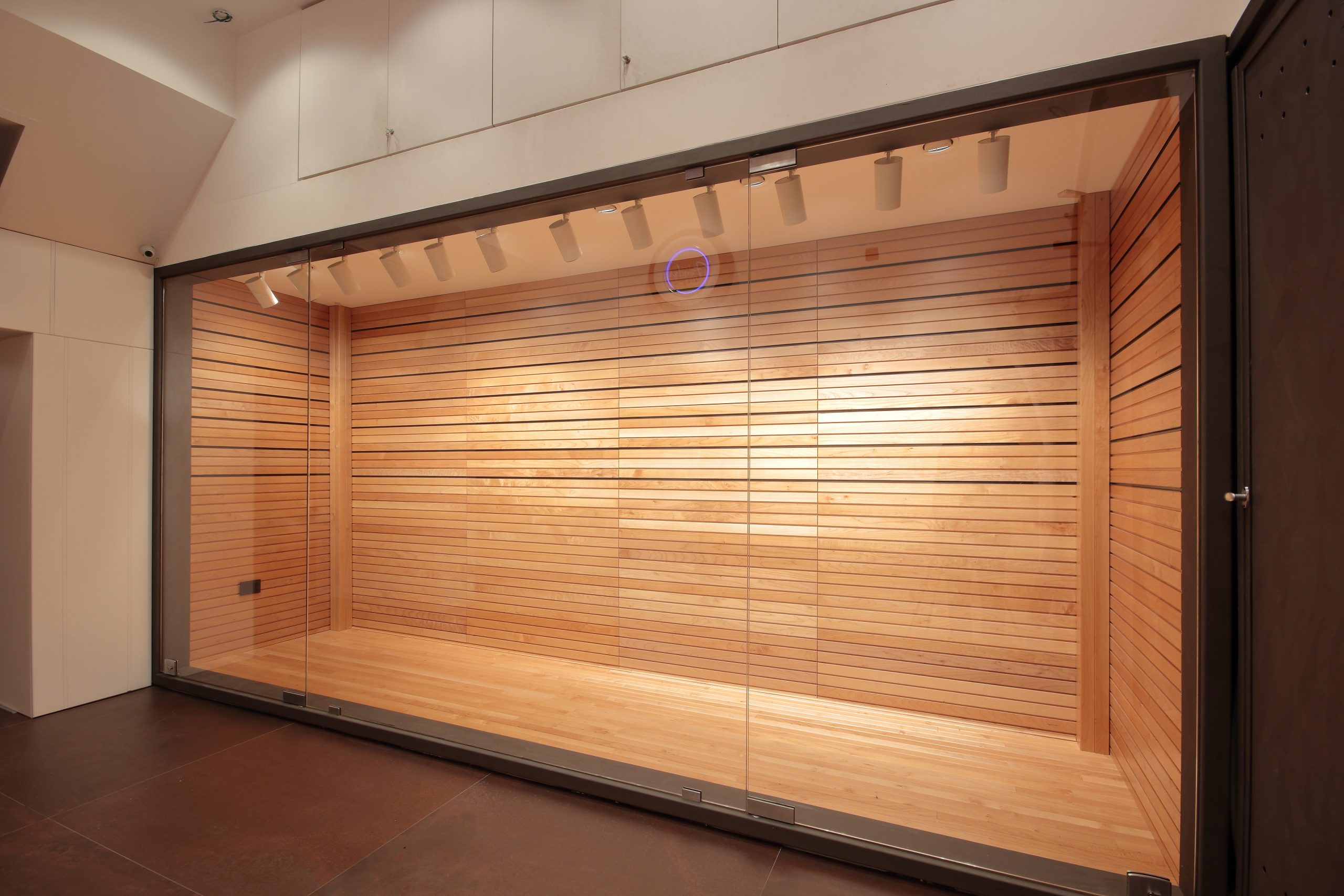 Inoltre il grès è un materiale perfetto per il progetto acustico pensato per il negozio, e infatti garantisce le “prime riflessioni sonore” richieste da una buona percezione dell’acustica dello strumento, poi ammortizzate quando diventano “seconde riflessioni” dai pannelli in legno naturale lavorati a scanalatura.