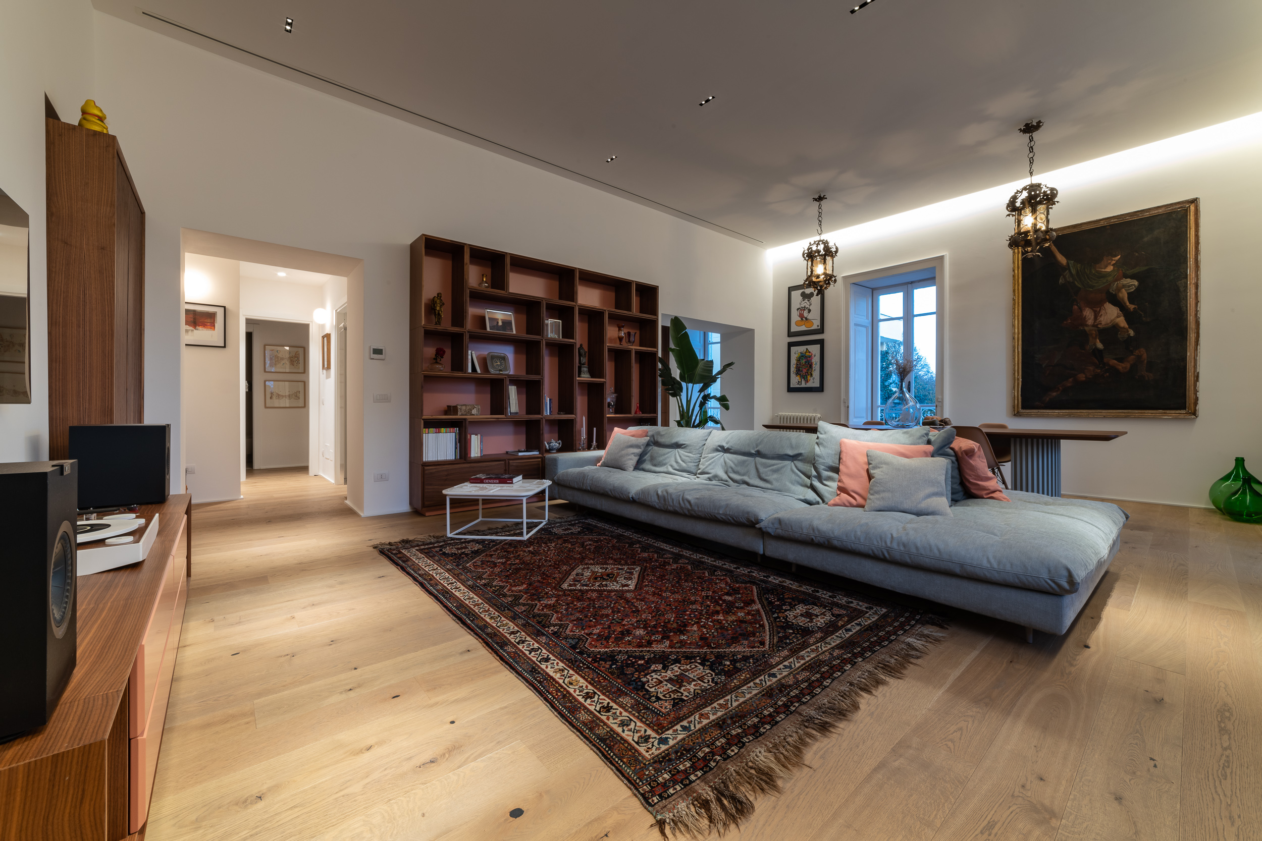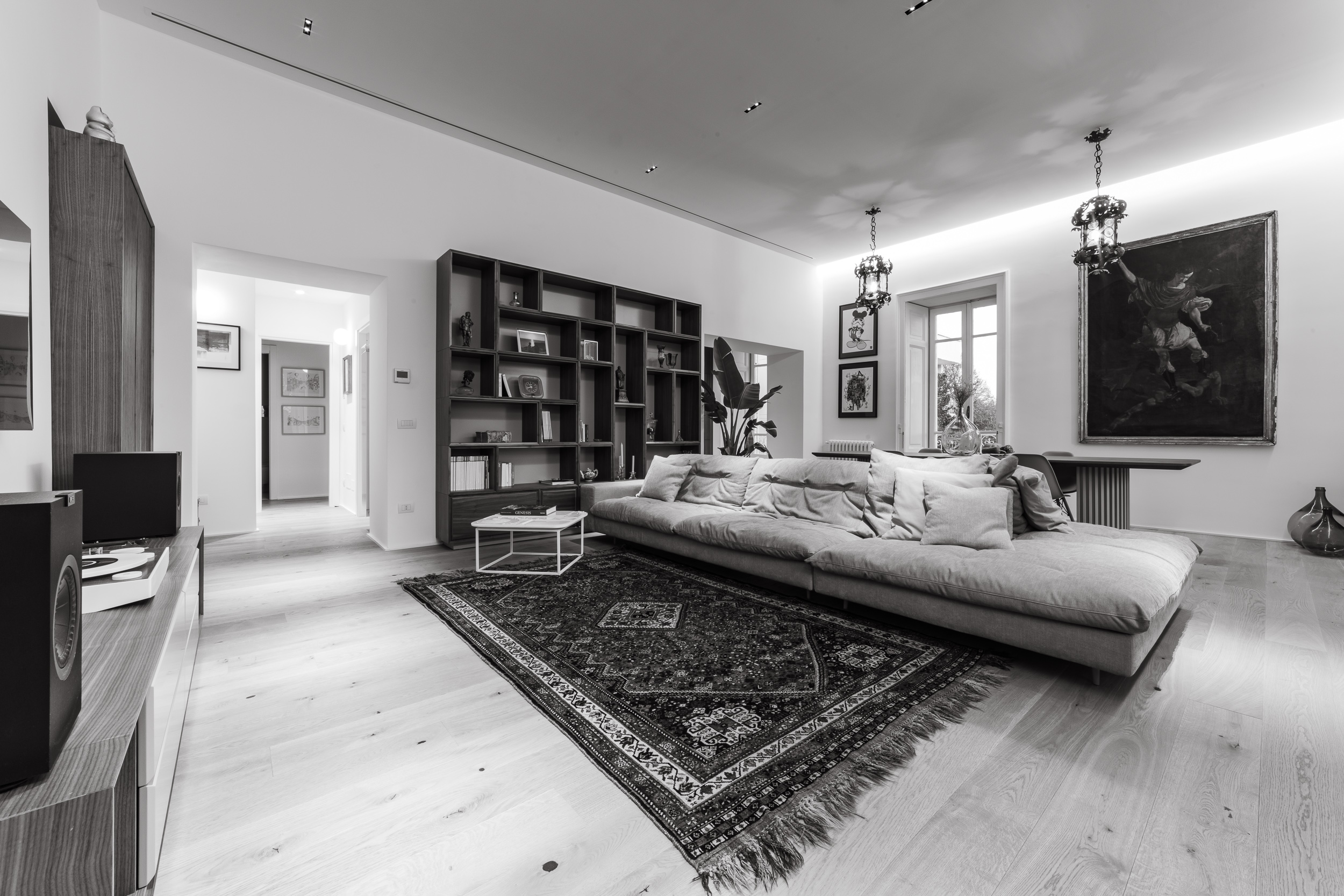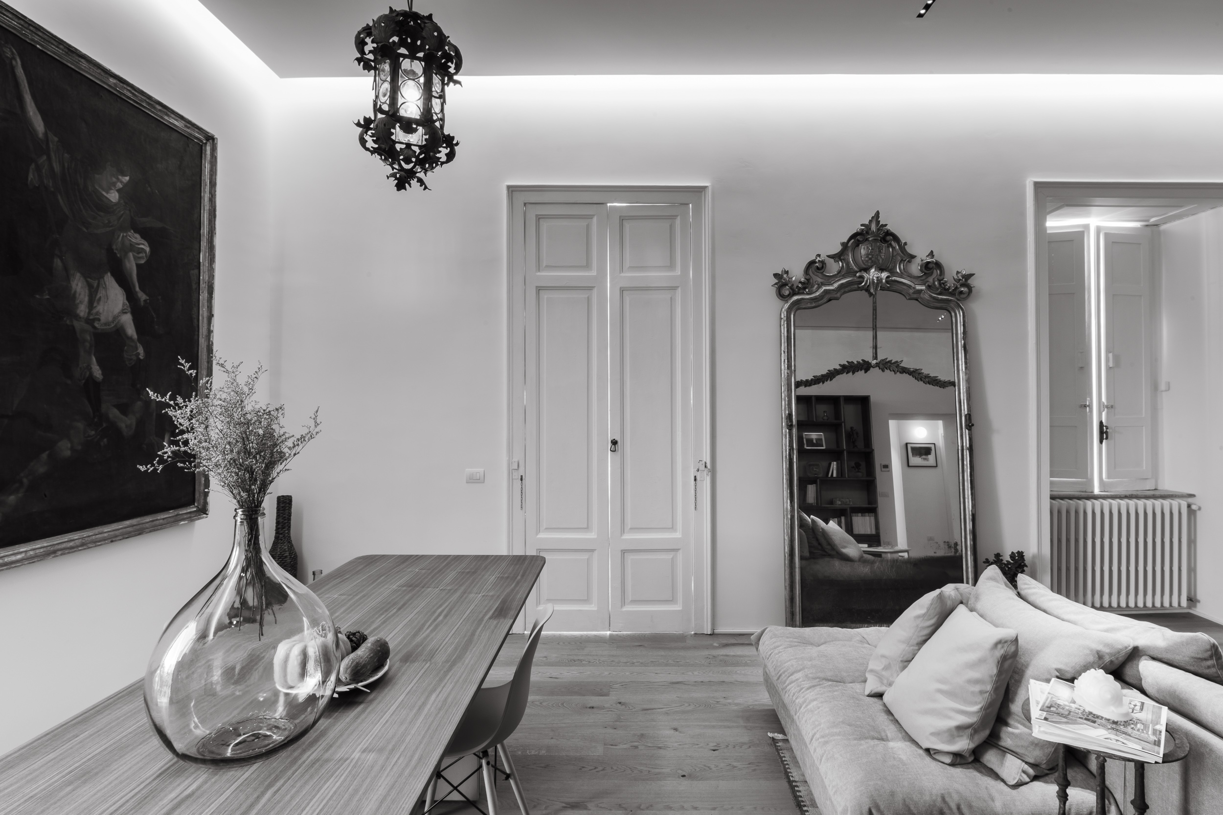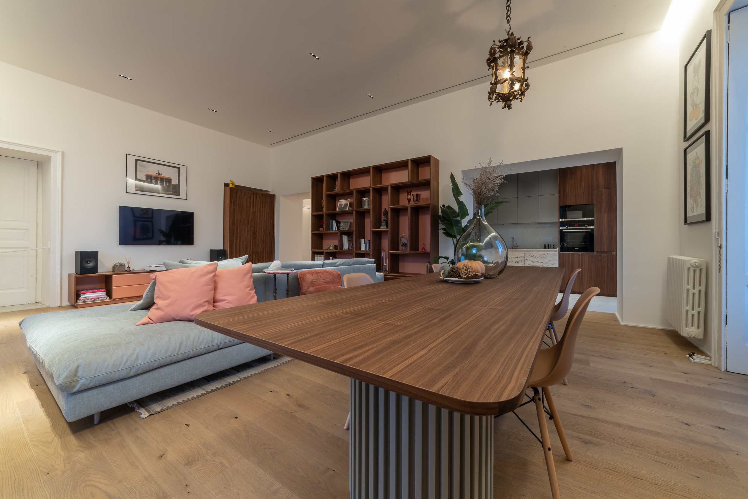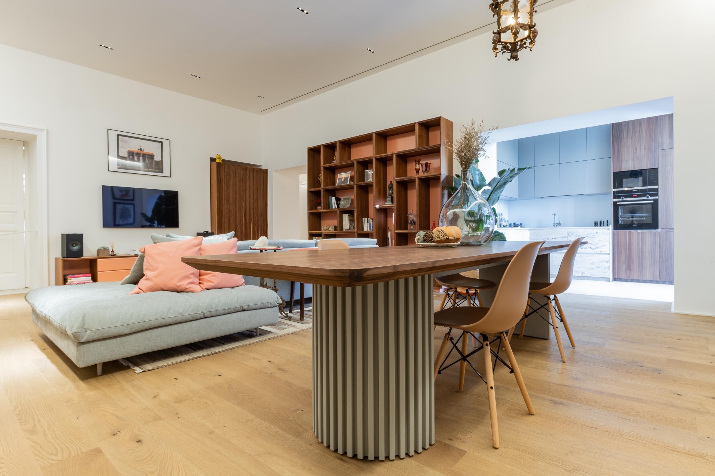 L’appartamento è in stile contemporaneo e abbiamo giocato con le contrapposizione non solo per gli elementi architettonici interni, ma anche con i materiali. Tutta la cucina, ad esempio, è rifinita in marmo massello a contrasto con elementi più classici della zona living. Anche il progetto illumino-tecnico ha tenuto conto delle caratteristiche storiche dell’immobile, visto che abbiamo soffitti alti oltre i 4 metri.